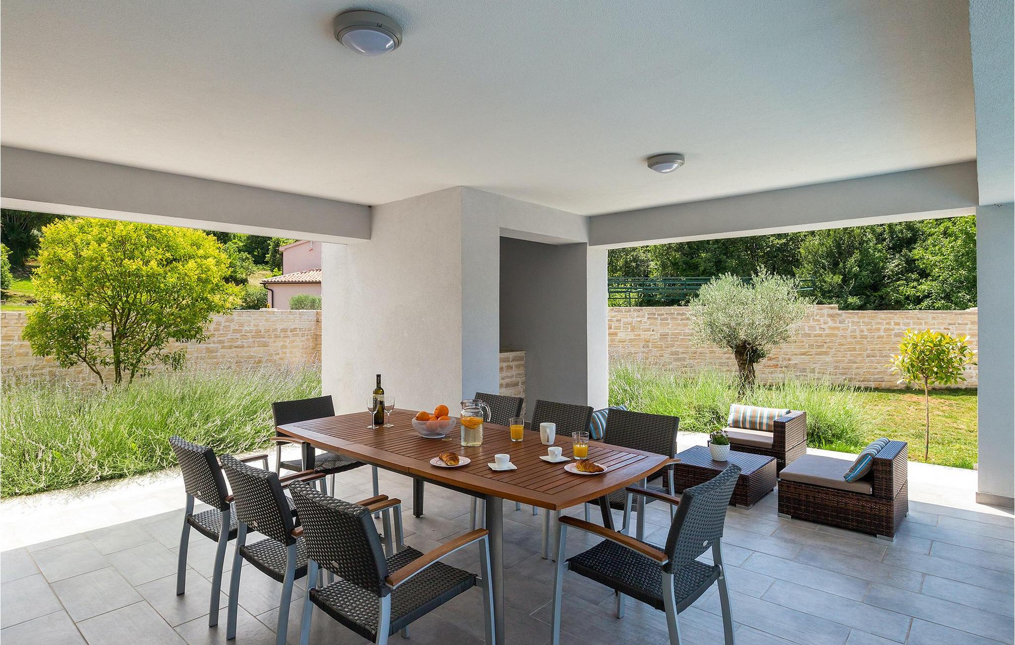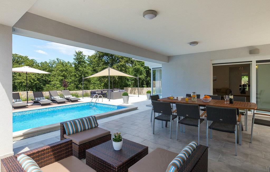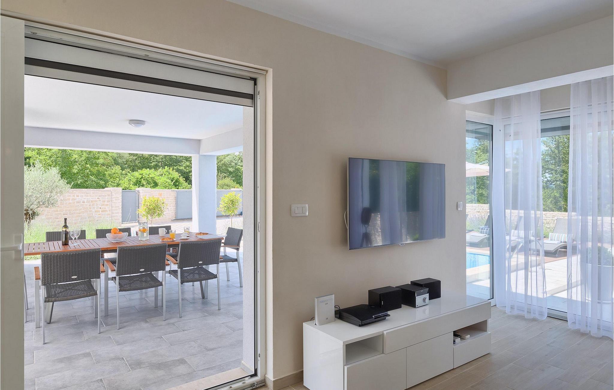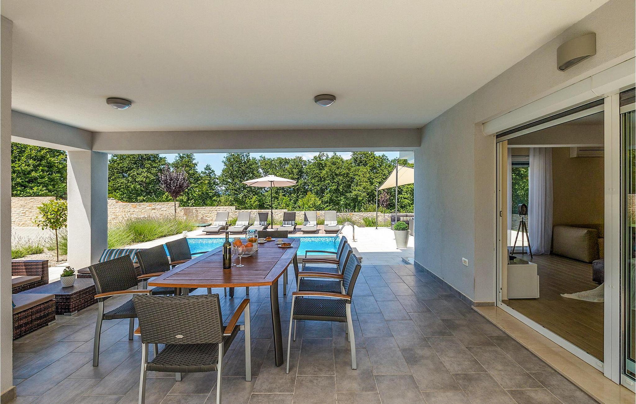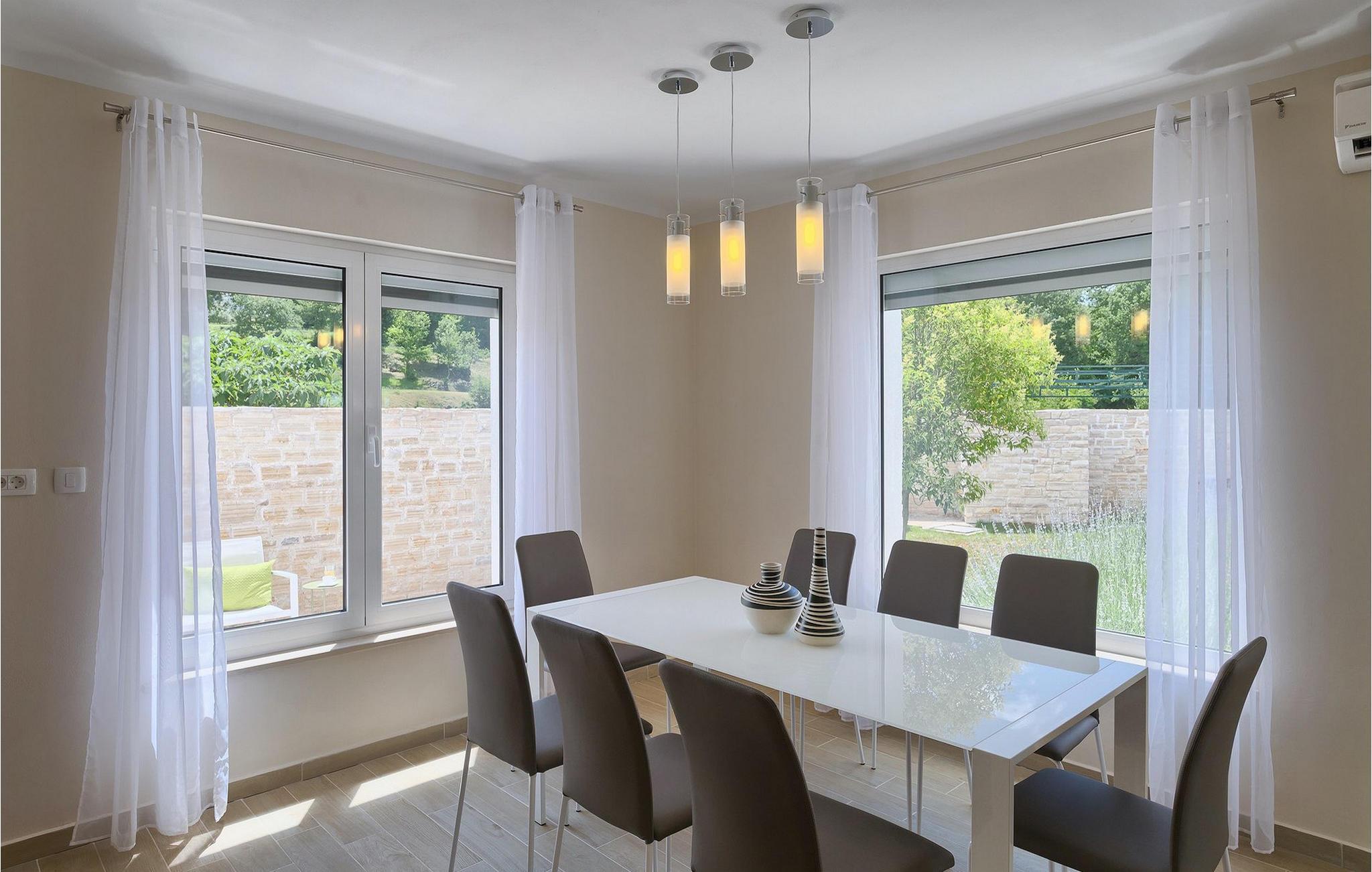 Smukke Villa Tireli er synonymet for luksus! Denne hyggelige og rummelige villa har i alt 4 soveværelser og kan rumme op til 8 gæster. Alle værelser er lyse og luftige, minimalistiske, men udstyret med alt hvad du behøver på din ferie. I stueetagen er der fuldt udstyret køkken med spiseplads samt opholdsstue med direkte udgang til villaens terrasse udenfor. På øverste etage finder du 4 soveværelser, hver udstyret med en dobbeltseng og hver med sit eget private badeværelse. På ydersiden kan du nyde freden og roen i det istriske landskab, mens du slapper af på villaens indbydende pool. For et ekstra strejf af luksus er der bordtennis, bordfodbold og sauna til din rådighed. Denne ejendom er beliggende i en lille landsby i den østlige del af Istrien. Hele denne region er godt forbundet og har et fremragende og uoverfyldt vejsystem. Den istriske halvø 'terra magica' ligger ved det varme Adriaterhav, så du vil blive begejstret for, at den nærmeste strand kun ligger 5 km fra villaen. Den nærmeste lufthavn samt nogle af de større turistcentre såsom Labin og Rabac er også kun en kort køretur væk. Labin ligger på en bakketop lige over den magiske kystlinje og er det historiske og administrative centrum i det østlige Istrien. Området er et paradis for historie- og kunstentusiaster med sin rige kulturelle og arkitektoniske arv. De stejle snoede gader i den gamle bydel kan prale af velbevarede historiske paladser, talrige kunstgallerier og atelierer og vært for forskellige jazz- og klassisk musikfestivaler i sommermånederne. Byen byder på adskillige fremragende fiskerestauranter, med mange lokale råvarer på tilbud, samt mange hyggelige kaffebarer, ideelle til at nyde den afslappede atmosfære. Labins badeby er Rabac, engang en fiskerby og i dag et populært turistmål omgivet af himmelske stenstrande.