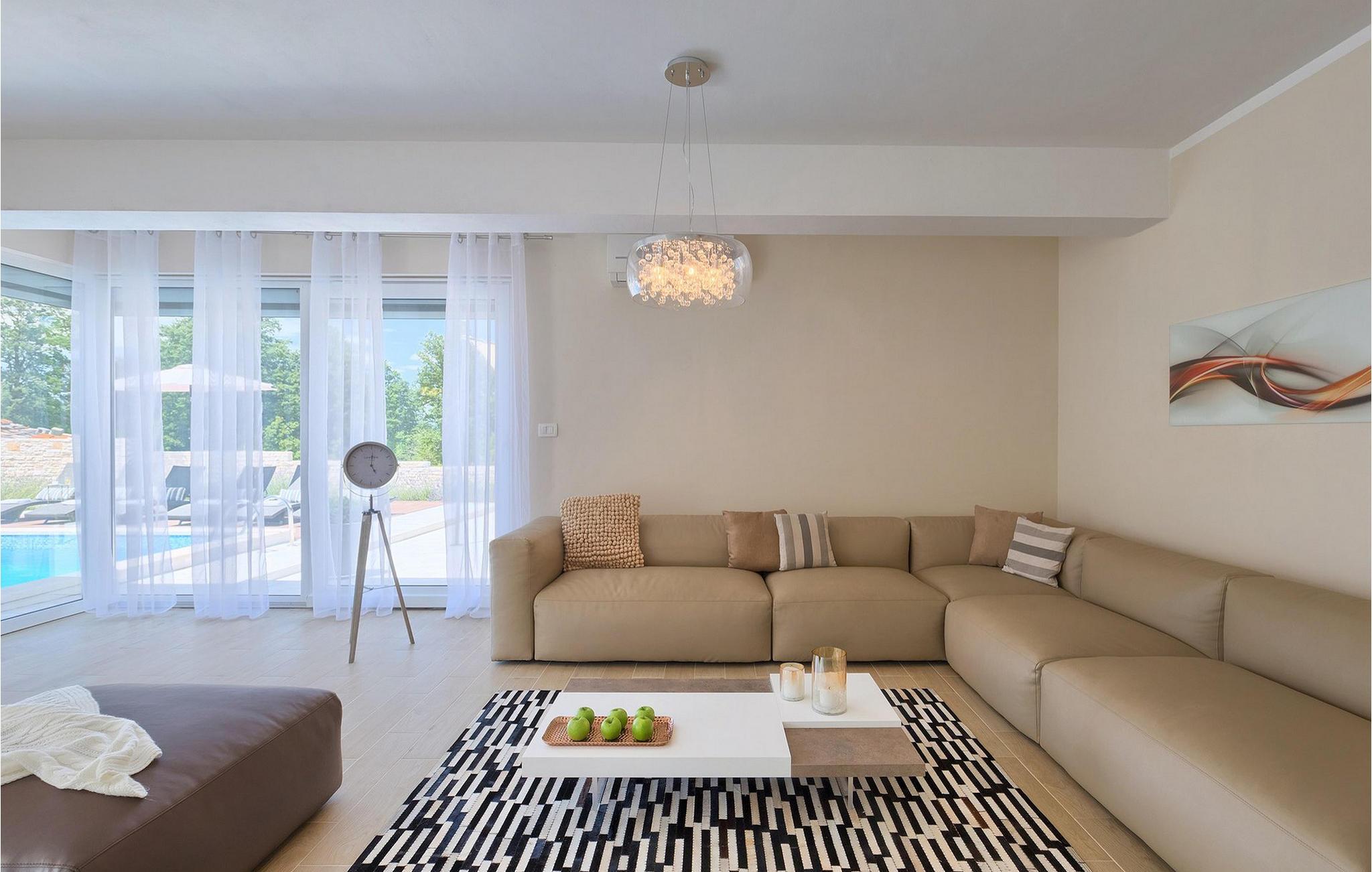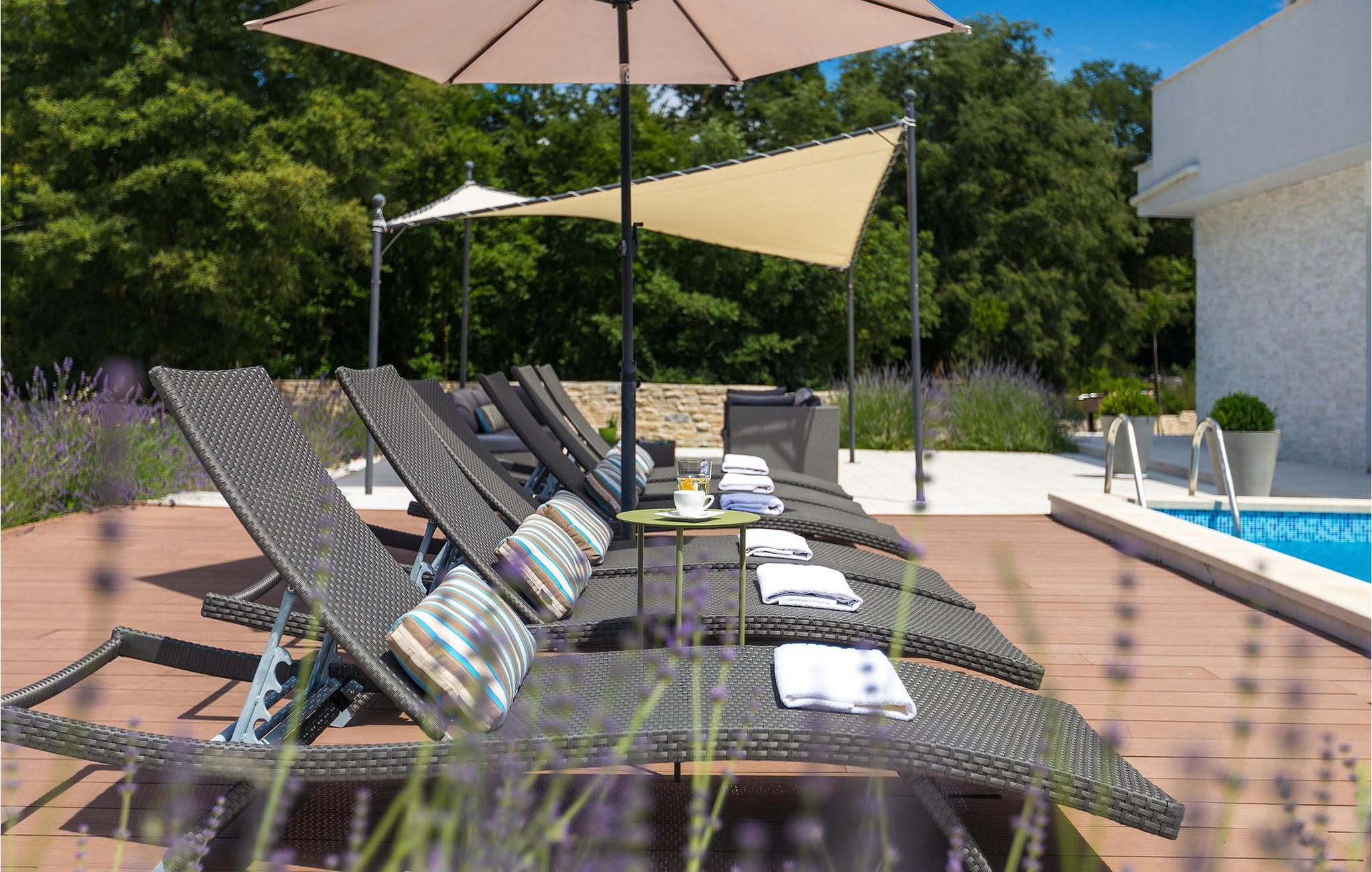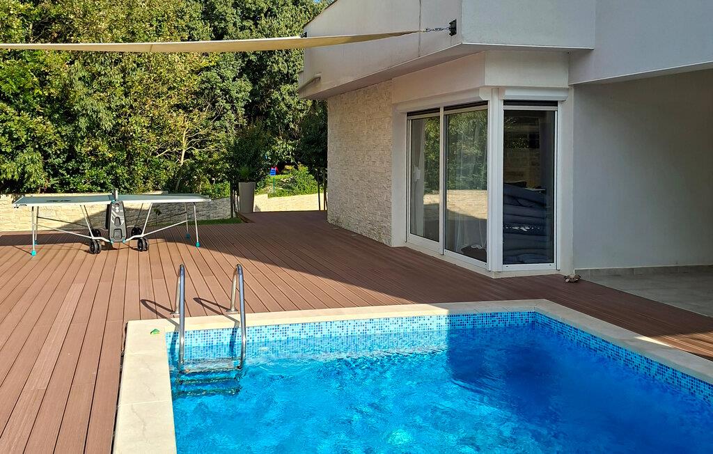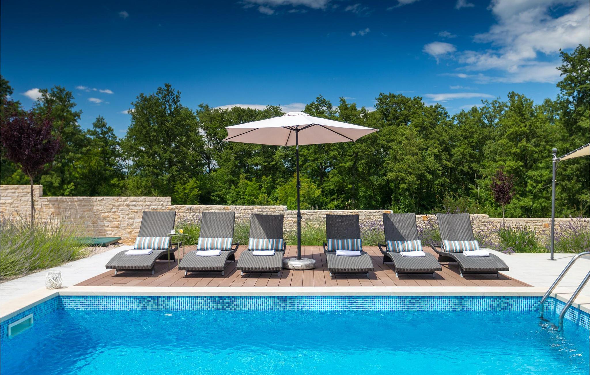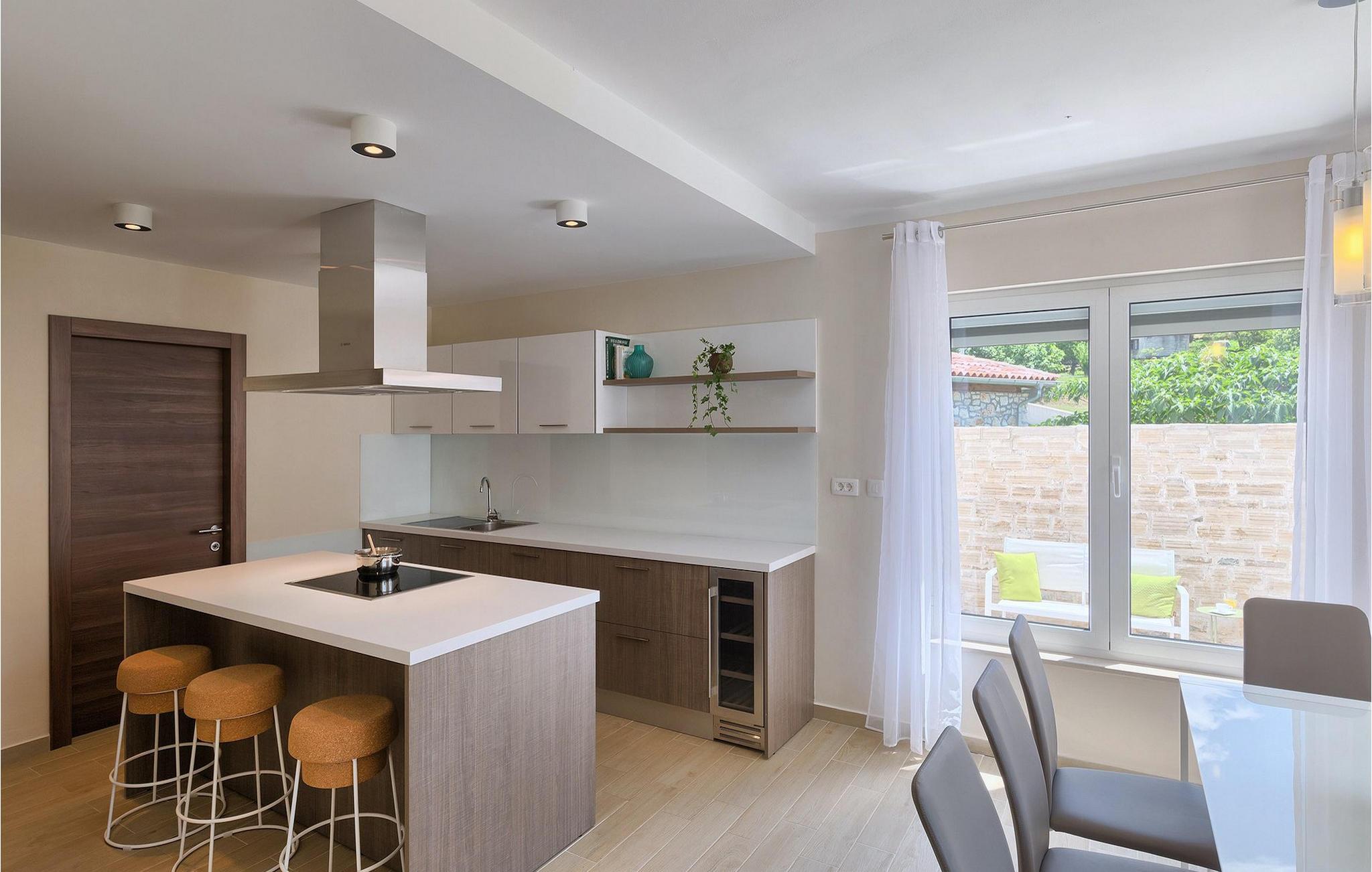 Smukke Villa Tireli er synonymet for luksus! Denne hyggelige og rummelige villa har i alt 4 soveværelser og kan rumme op til 8 gæster. Alle værelser er lyse og luftige, minimalistiske, men udstyret med alt hvad du behøver på din ferie. I stueetagen er der fuldt udstyret køkken med spiseplads samt opholdsstue med direkte udgang til villaens terrasse udenfor. På øverste etage finder du 4 soveværelser, hver udstyret med en dobbeltseng og hver med sit eget private badeværelse. På ydersiden kan du nyde freden og roen i det istriske landskab, mens du slapper af på villaens indbydende pool. For et ekstra strejf af luksus er der bordtennis, bordfodbold og sauna til din rådighed. Denne ejendom er beliggende i en lille landsby i den østlige del af Istrien. Hele denne region er godt forbundet og har et fremragende og uoverfyldt vejsystem. Den istriske halvø 'terra magica' ligger ved det varme Adriaterhav, så du vil blive begejstret for, at den nærmeste strand kun ligger 5 km fra villaen. Den nærmeste lufthavn samt nogle af de større turistcentre såsom Labin og Rabac er også kun en kort køretur væk. Labin ligger på en bakketop lige over den magiske kystlinje og er det historiske og administrative centrum i det østlige Istrien. Området er et paradis for historie- og kunstentusiaster med sin rige kulturelle og arkitektoniske arv. De stejle snoede gader i den gamle bydel kan prale af velbevarede historiske paladser, talrige kunstgallerier og atelierer og vært for forskellige jazz- og klassisk musikfestivaler i sommermånederne. Byen byder på adskillige fremragende fiskerestauranter, med mange lokale råvarer på tilbud, samt mange hyggelige kaffebarer, ideelle til at nyde den afslappede atmosfære. Labins badeby er Rabac, engang en fiskerby og i dag et populært turistmål omgivet af himmelske stenstrande.