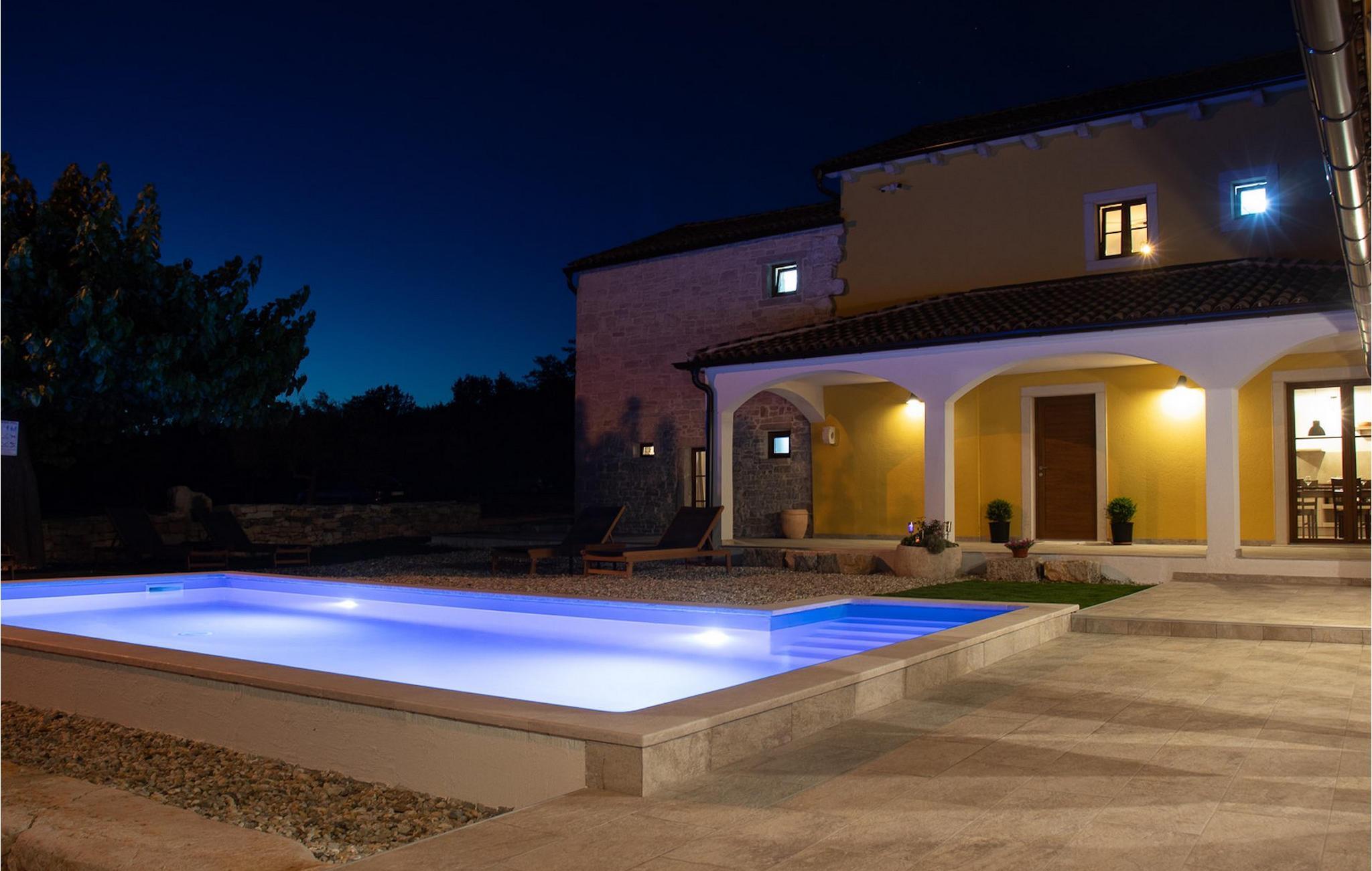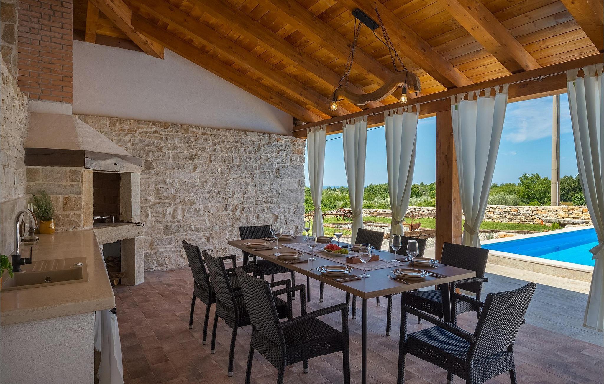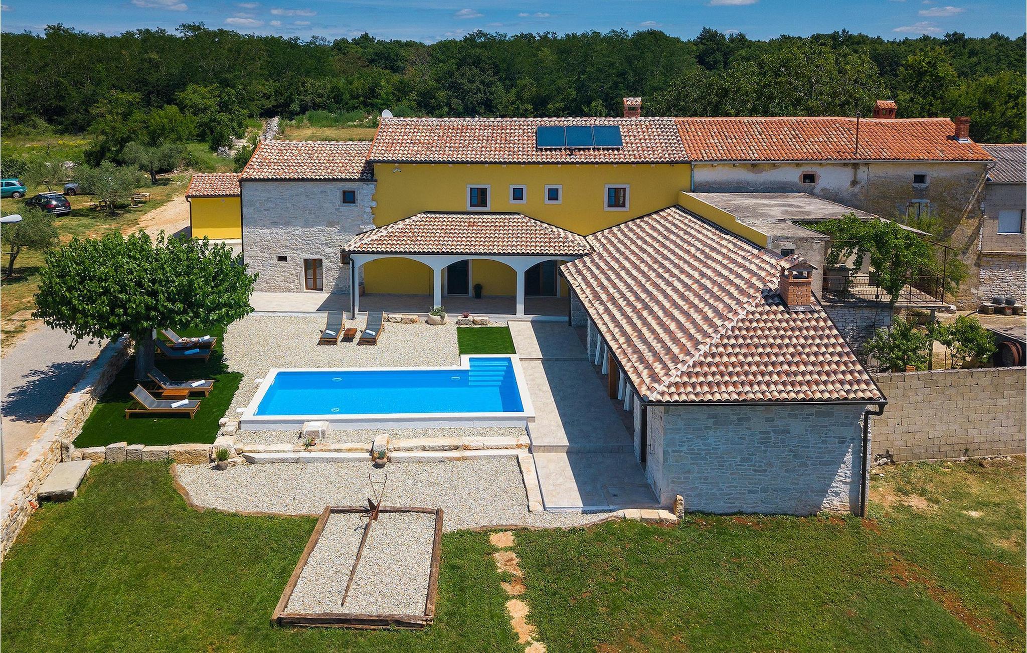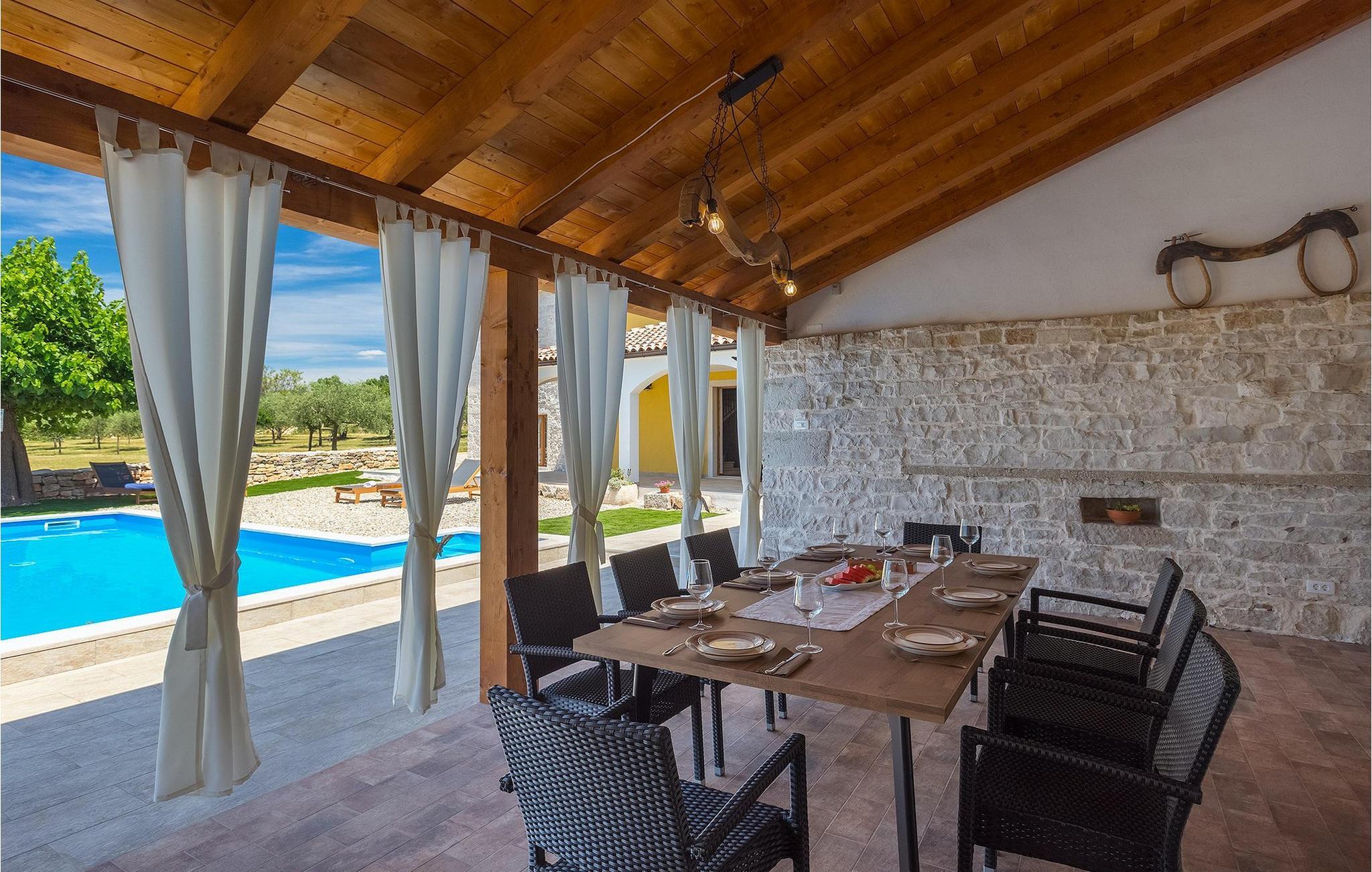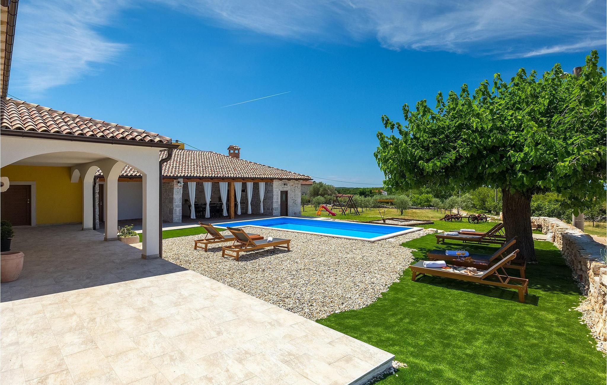 Charmerende Villa Lanca beliggende i Istrien i et smukt naturligt miljø vil give dig en fredelig og afslappende ferie. Villaen tilbyder overnatning til i alt 8 personer i hyggelige omgivelser med istriske detaljer og moderne interiør. Villaen er omgivet af natur og grønt, og i villaens gårdhave er der en lille olivenhave. Stueetagen af villaen er en åben type med en stue, udstyret køkken og spisestue, et-værelses og badeværelse. På første sal er der tre værelser med tre badeværelser med en suite soveværelser. Villaens have er 4282 m2 og har en olivenhave ved siden af, hvor der er en legeplads for de yngste gæster, en privat pool og en udendørs terrasse med grill, bord og stole til at nyde middagen. Stenvæggene i visse dele af villaen giver villaen et charmerende udtryk i middelhavsstil. Forfrisk dig selv i den private pool og nyd en drink på liggestolene i de smukke istriske omgivelser. For yderligere underholdning er der dart og bordtennis. Book Villa Lanca for den perfekte ferie med familie og venner.Villa Lanca ligger i den lille kommune Sveti Lovrec, også kendt som San Lorenzo del Pasenatico. I en smuk beliggenhed giver villaen sine gæster mulighed for at udforske omgivelserne i de mindre byer og deres restauranter, der serverer berømte istriske specialiteter. Det omkringliggende område byder på adskillige rekreative muligheder: Cykling, ridning, jogging, vandreture og meget mere. Den nærmeste strand med krystalklart vand ligger i Vrsar, 10 km fra villaen. I nærheden ligger de kendte kystbyer Porec og Rovinj. Gå en tur gennem de romantiske gader i Rovinj og stød på den barokke kirke St. Euphemia og bypaladset. Kulinariske elskere bør ikke gå glip af restauranten Monte, som har fået en Michelin-stjerne. Vi anbefaler også en sejltur til Rovinj-øgruppen. I Porec kan du besøge Euphrasius-basilikaen (Unescos verdensarvssted). Her finder du et udvalg af caféer, barer og restauranter. De middelalderlige bakketopbyer Motovun og Groznjan er også et besøg værd.