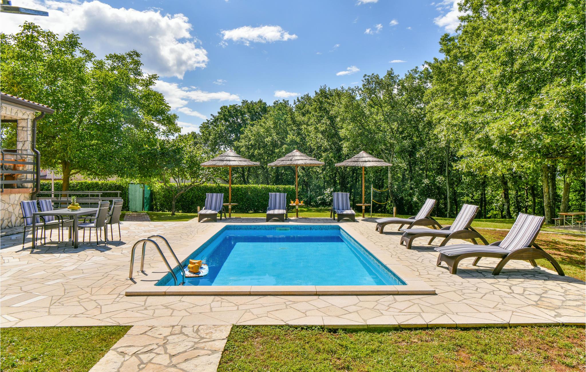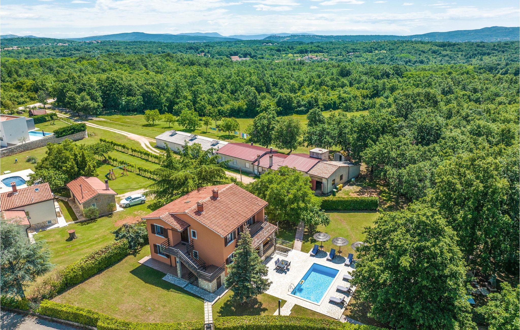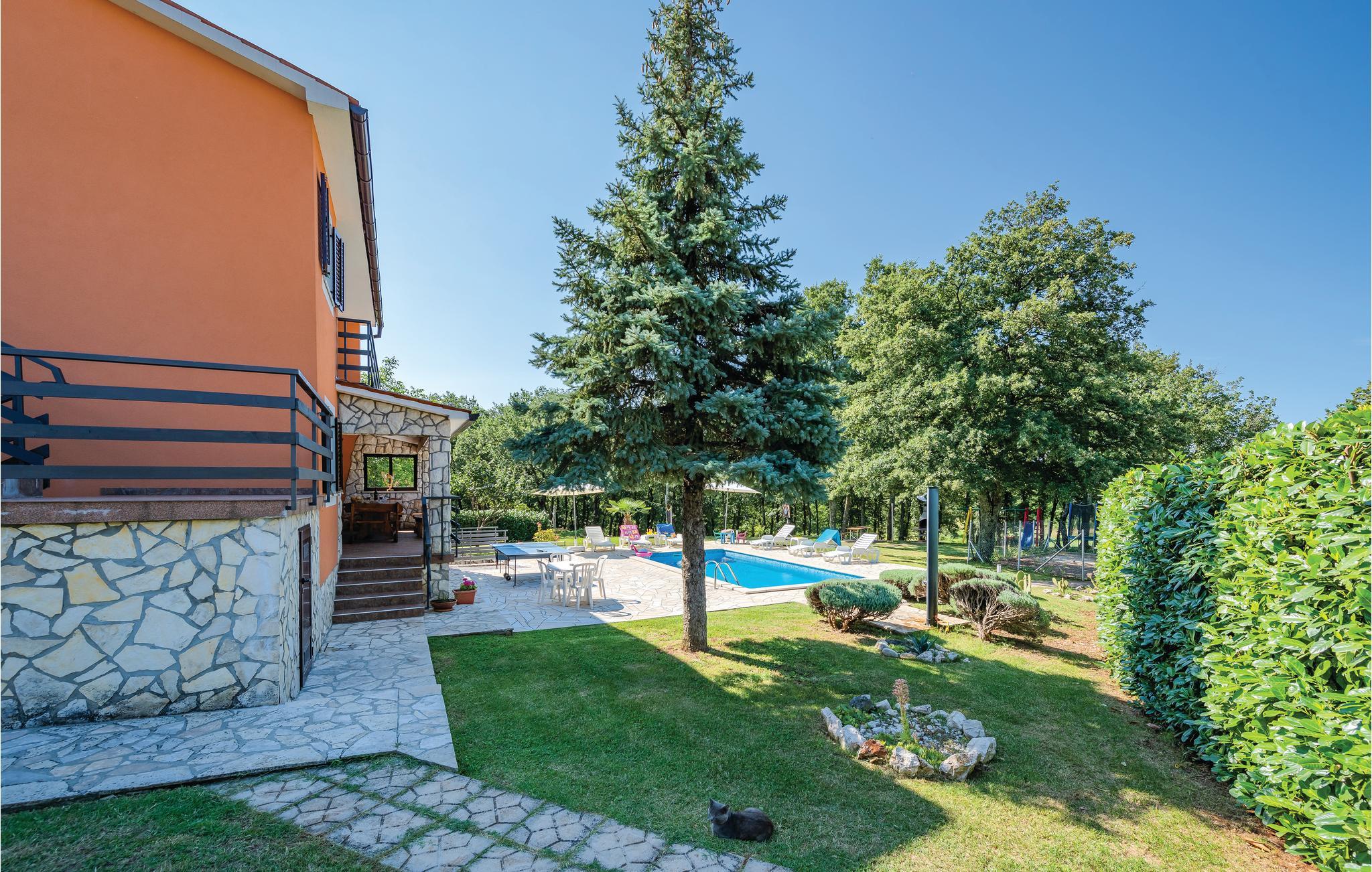 Dette store hus med pool ligger kun få minutter i bil, fra den dejlige ferieby Rabac, hvor nogle af de skønneste strande ved istriens kyst ligger. Det ligger på en stor grund ved siden af en lille lokal landevej. Huset rummer to komfortable lejligheder med altaner og er forbundet med en udendørs trappe. Den historiske lille by Labin, med sine kulturelle og historiske seværdigheder, ligger ganske tæt på. I byens smukke venetianske kirke afholdes der mange klassiske koncerter om sommeren, de mange gallerier og det spændende bjergværksmuseum gør også byen attraktiv at besøge. Flere dejlige strande findes ved Prtlog, Sv. Marina og Ravni. Besøg også byen Pula med mange seværdigheder, f.eks. det smukke amfiteater og oplev nationalparken Brijunis skønne verden af flora og fauna.