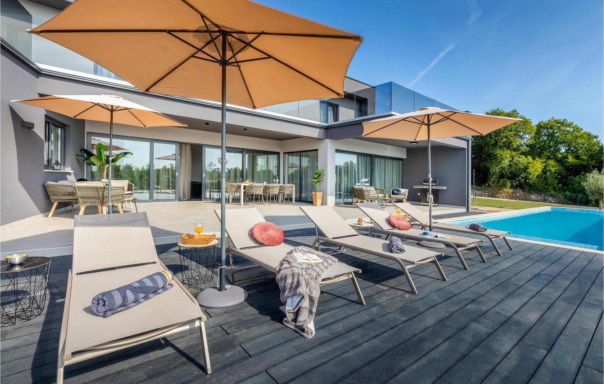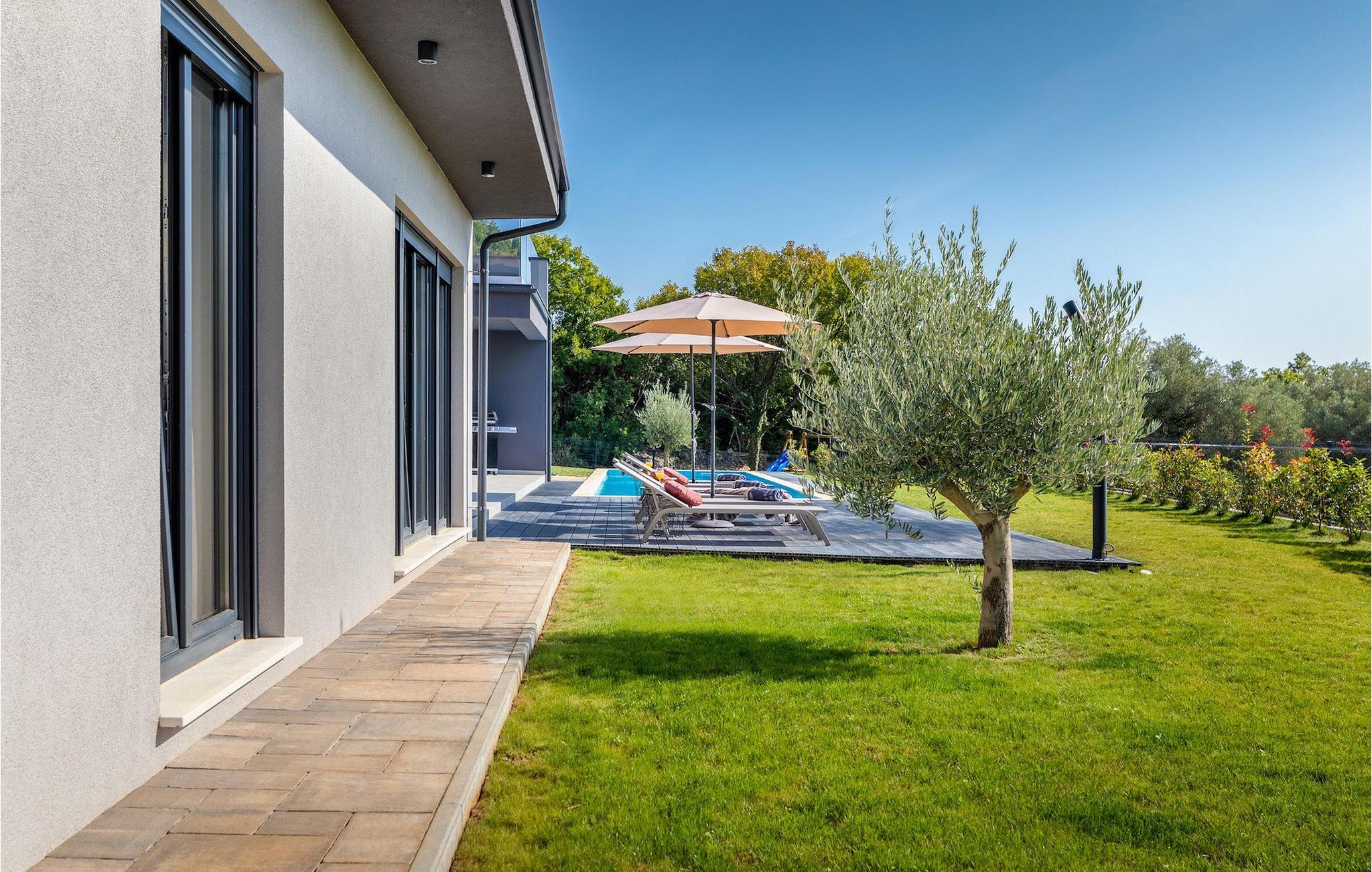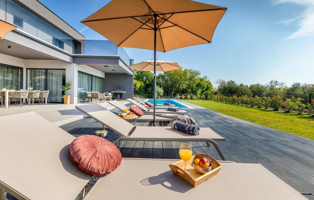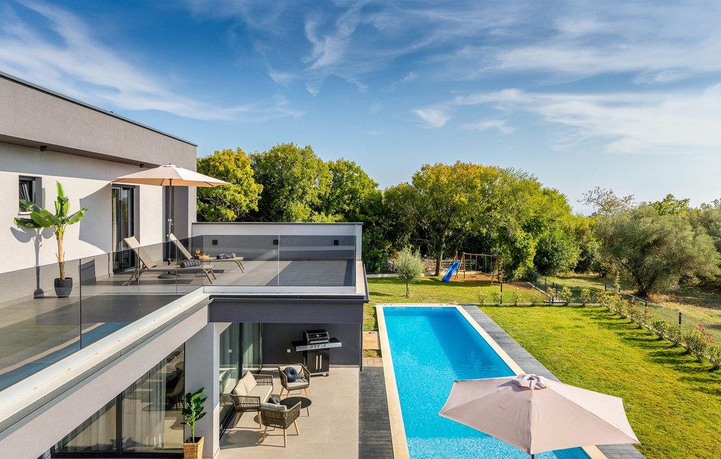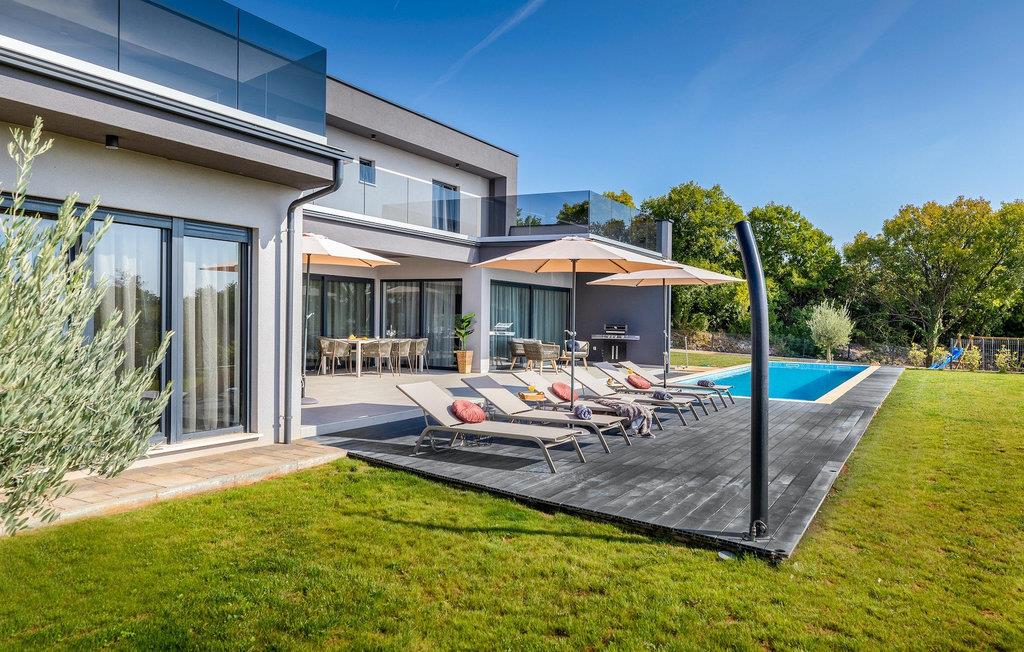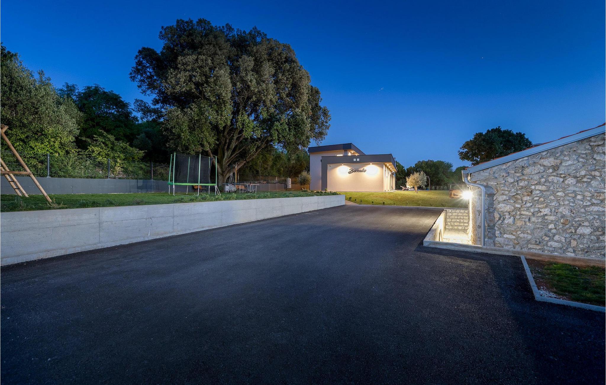 Villa Borealis ligger i en lille landsby i Istrien tæt på havet og tilbyder en afslappende ferie for hele familien. I den velholdte, helt indhegnede ejendom er der en stor privat udendørs pool. Slap af på liggestolene og nyd den vidunderlige udsigt over naturen. En volleyballbane, en legeplads, en trampolin og badminton er til rådighed. Den yderligere 35 m2 store ejendom, som også ligger på ejendommen, byder på en kulgrill og en spiseplads. Den 317 m2 store villa kan rumme op til 12 personer. Interiøret er indrettet med stil og smukke detaljer. I stueetagen er der et opholdsområde med åbent koncept med spise- og kogeplads. Fra stuen er der udgang til terrassen, som er udstyret med havemøbler. Dette er det perfekte sted at nyde din morgenkaffe. I stueetagen er der 3 komfortable soveværelser. På første sal er der yderligere 3 soveværelser og en stor terrasse. Alle værelser har aircondition og har dobbeltseng, tv og eget badeværelse. Der er heller ingen grund til at bekymre sig om yderligere indhold, for for sportsentusiaster er der to stationære cykler, samt bordtennis til gruppeaktiviteter.