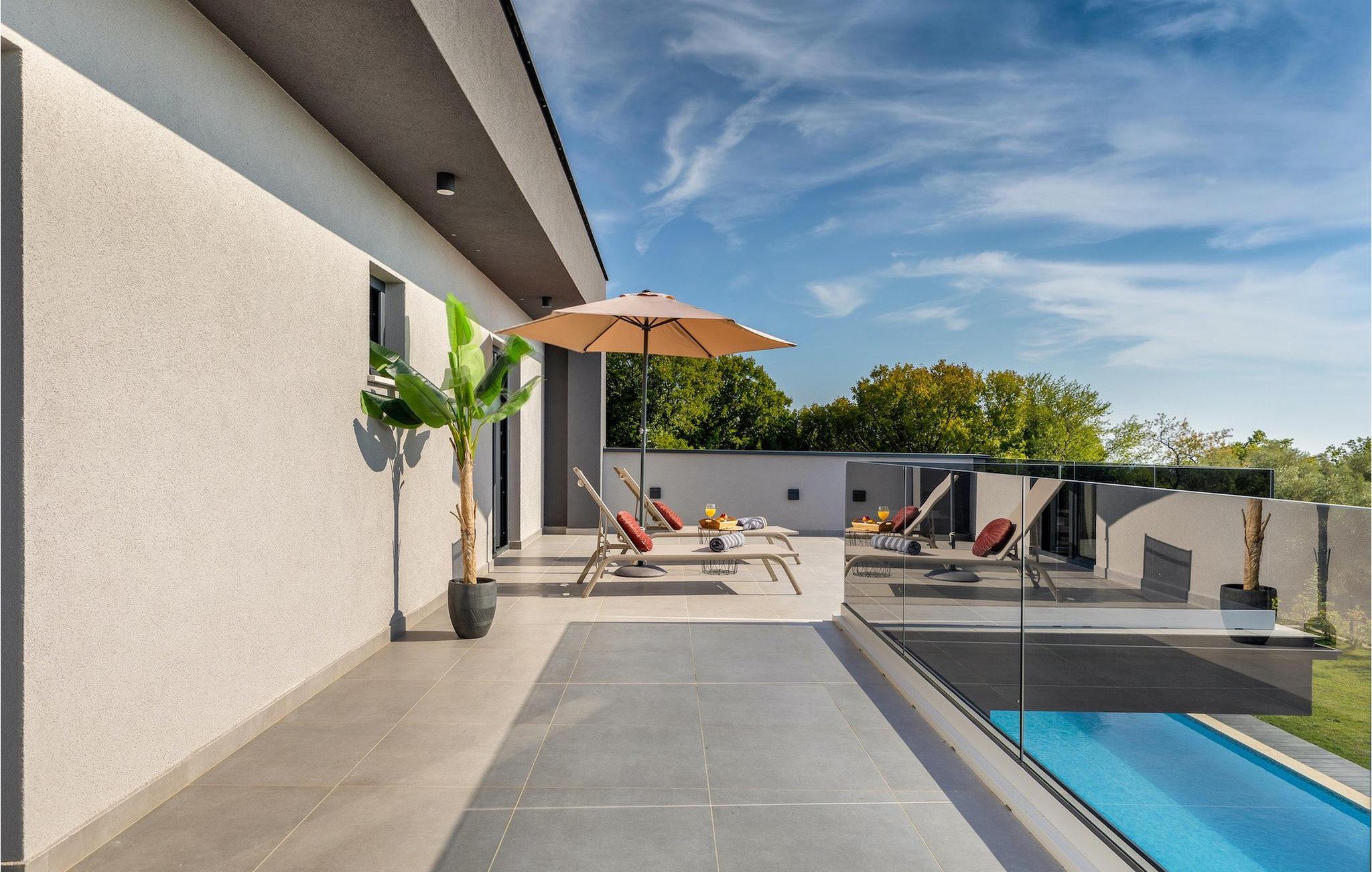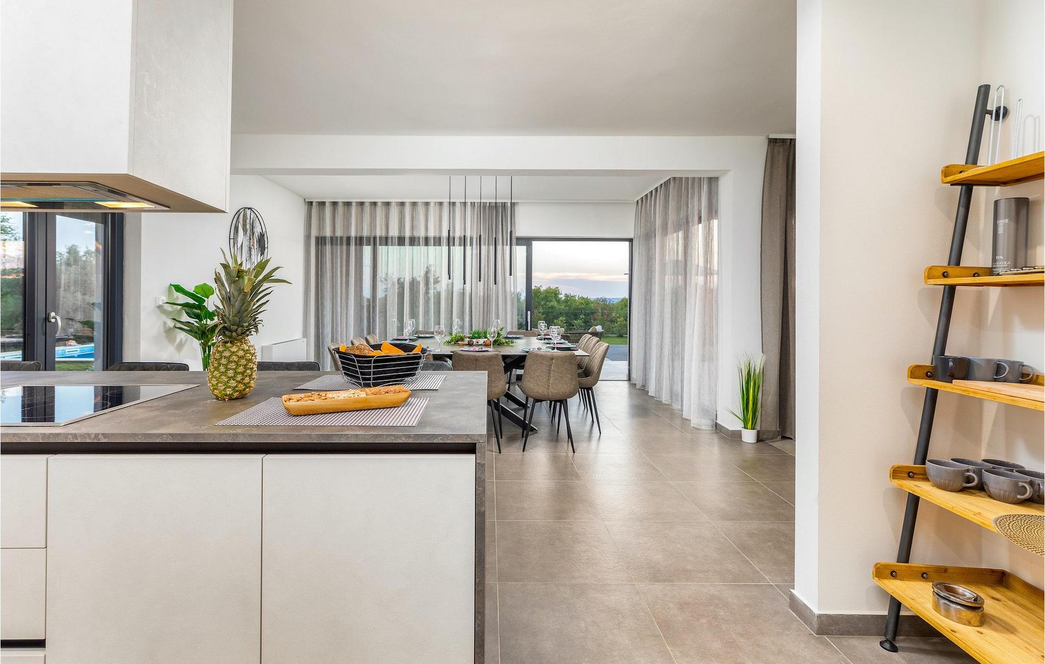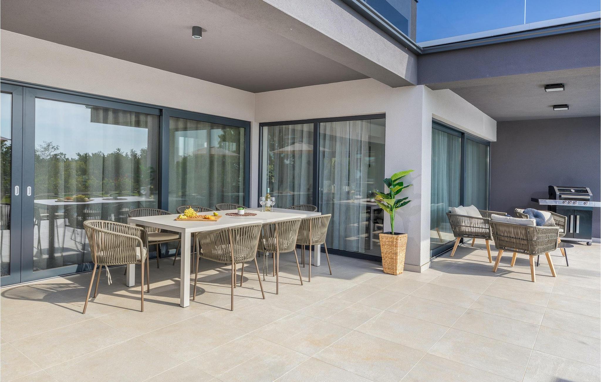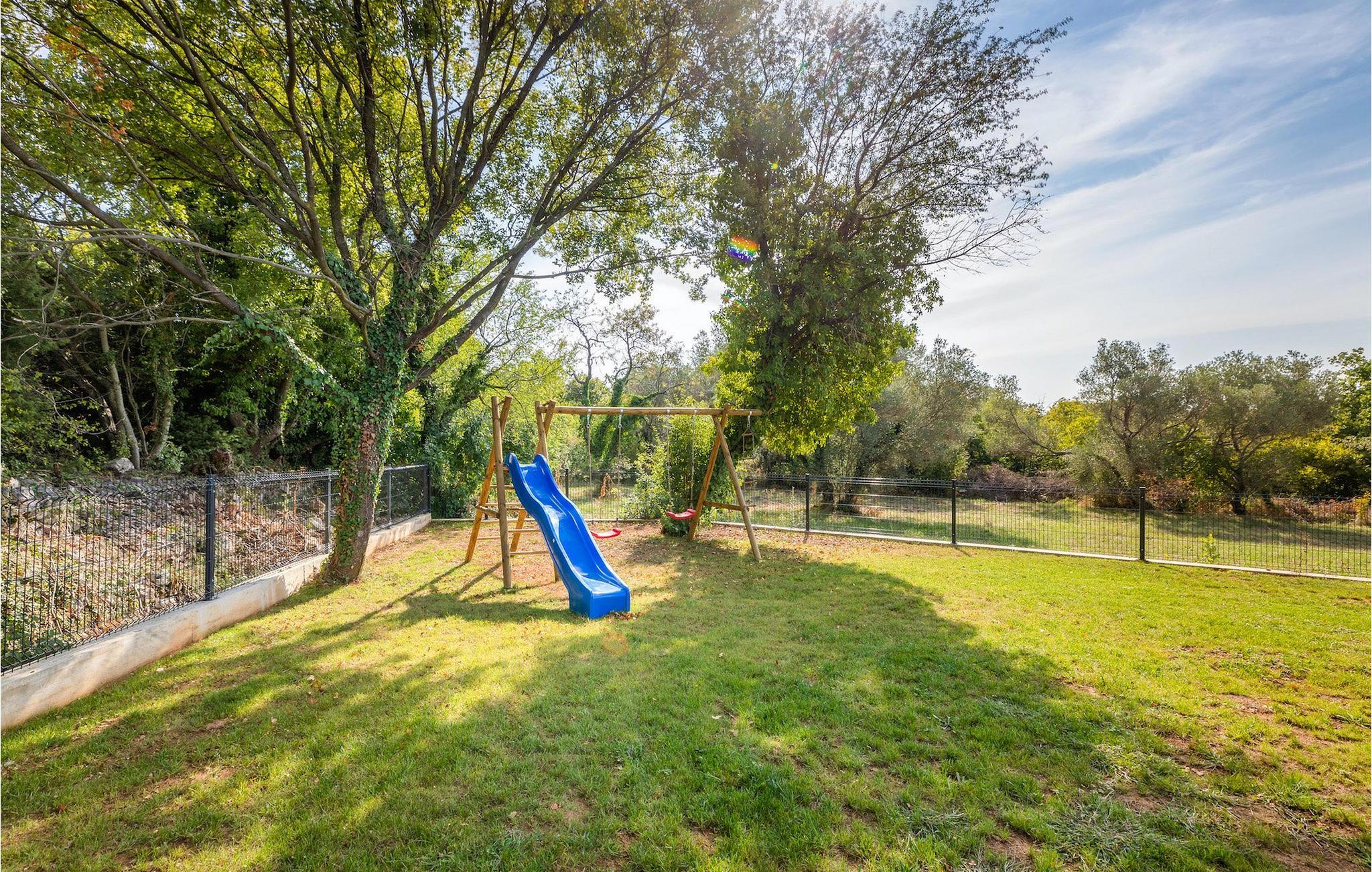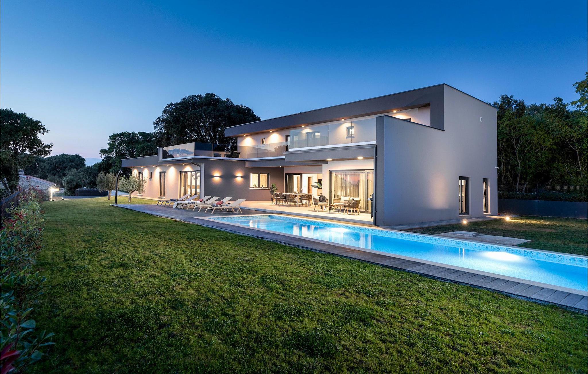 Villa Borealis ligger i en lille landsby i Istrien tæt på havet og tilbyder en afslappende ferie for hele familien. I den velholdte, helt indhegnede ejendom er der en stor privat udendørs pool. Slap af på liggestolene og nyd den vidunderlige udsigt over naturen. En volleyballbane, en legeplads, en trampolin og badminton er til rådighed. Den yderligere 35 m2 store ejendom, som også ligger på ejendommen, byder på en kulgrill og en spiseplads. Den 317 m2 store villa kan rumme op til 12 personer. Interiøret er indrettet med stil og smukke detaljer. I stueetagen er der et opholdsområde med åbent koncept med spise- og kogeplads. Fra stuen er der udgang til terrassen, som er udstyret med havemøbler. Dette er det perfekte sted at nyde din morgenkaffe. I stueetagen er der 3 komfortable soveværelser. På første sal er der yderligere 3 soveværelser og en stor terrasse. Alle værelser har aircondition og har dobbeltseng, tv og eget badeværelse. Der er heller ingen grund til at bekymre sig om yderligere indhold, for for sportsentusiaster er der to stationære cykler, samt bordtennis til gruppeaktiviteter.