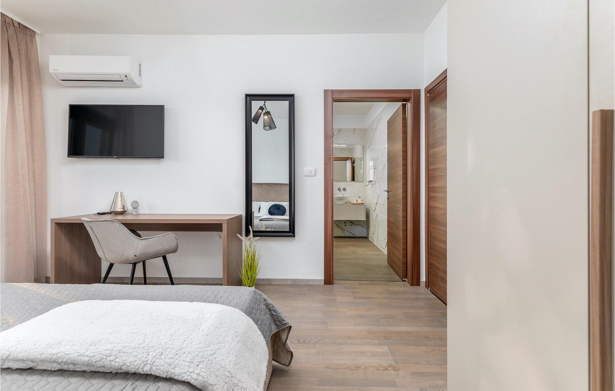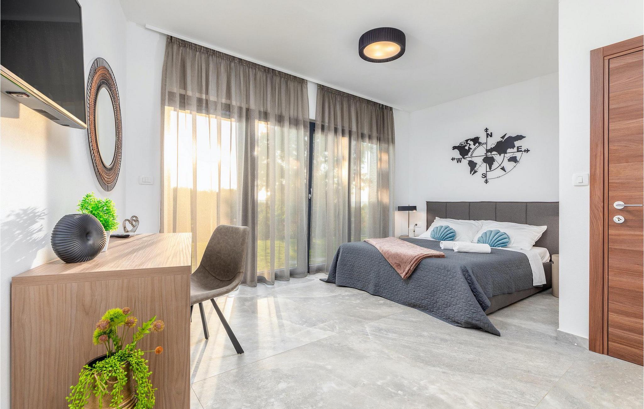 Og som det største højdepunkt i denne villa og en uundværlig genstand for en perfekt afslappende ferie, hele wellness-området står til din rådighed. Føl som om du er på et hotel, mens du nyder saunaen eller spabadet til 6 personer, mens du slapper af på liggestolene ind imellem. Wellness-området er udstyret med alt hvad du kan ønske dig, der er også 2 fitnesscykler til din rådighed og Villa Borealis er på alle måder det perfekte valg til en flugt fra hverdagen.Villa Borealis ligger i den lille landsby Stanisevi kun 3 km fra stranden. Det omkringliggende område byder på en række smukke stenstrande og skjulte bugter med krystalklart vand. En kort køretur væk ligger kystbyen Rabac. Der kan du finde en bred vifte af vandsportsaktiviteter. Vi anbefaler at tage en romantisk gåtur langs promenaden. Villa Borealis er et glimrende udgangspunkt for udflugter. Besøg den historiske by Pula, hvor det fortryllende romerske amfiteater ligger. Her arrangeres mange filmbegivenheder, men også kulturelle arrangementer og koncerter. Vi anbefaler også at besøge den maleriske by Rovinj. Det særlige ved byen er, at den gamle bydel ligger på en lille halvø. Udforsk de smalle gader i byen og nyd din første kop kaffe i en af de mange caféer. Restauranterne tilbyder et fremragende udvalg af typiske lokale specialiteter, som du bestemt bør prøve. Kom til Istrien og udforsk skønheden i denne region.