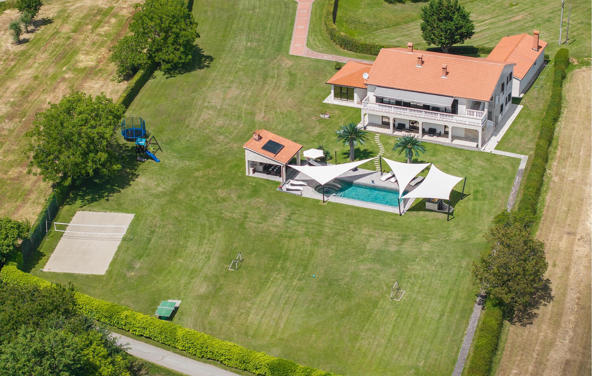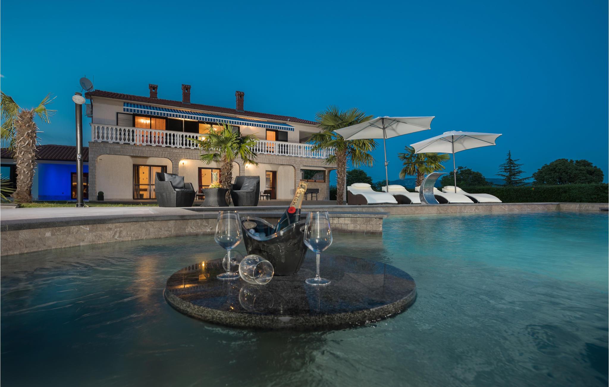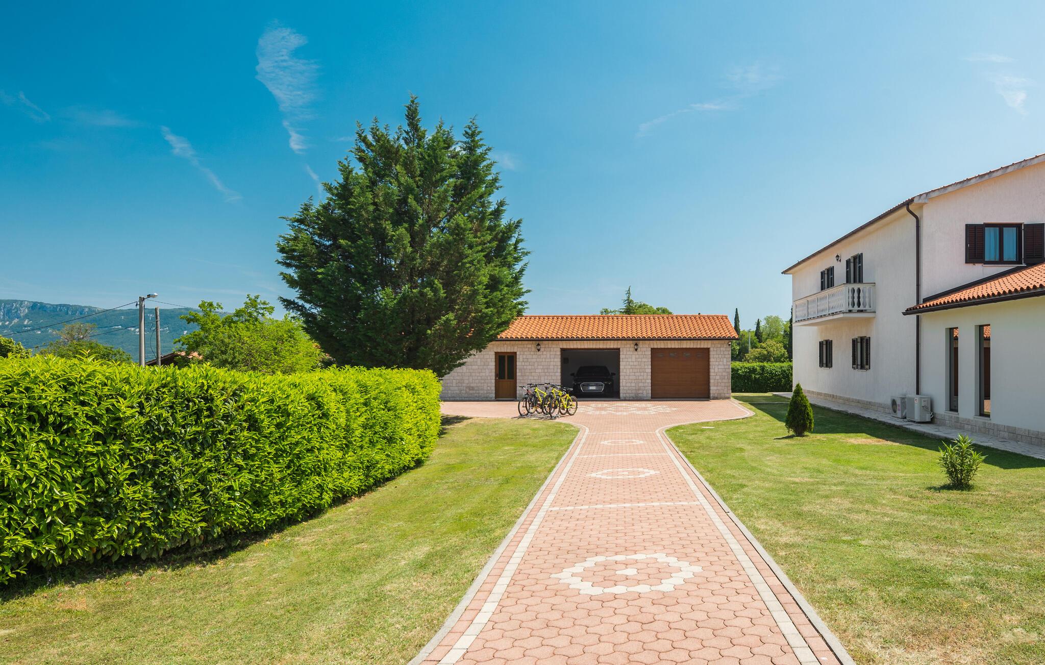 Mediterran atmosfære, stor wellnessafdeling og en opvarmet pool er noget af det I kan se frem til i ferien. Dette feriehus er delt op i to komfortable ferielejligheder, der er forbundet via ydre trapper. Slap af med en svømmetur i den udendørs opvarmede pool. Der er god plads både ude og inde til at være aktive og slappe af, lige som I har lyst til det. Husets grund er meget stor. Her kan I forkæle jer selv med mange former for wellness: stjerneklar himmel over whirlpoolen, lyseffekter, dampbad, finsk og infrarød sauna samt en pragtfuld koldtvandsdouche. Hold en skøn ferie i omgivelser der er en charmerende blanding af moderne og rustikt – og med god plads til at to familier kan holde ferie sammen. I nærheden af huset ligger den berømte ferieby Rabac med mange cafeer og souvenirbutikker og en skøn promenade til romantiske aftenture. I kan lave mad i sommerkøkkenet ved siden af poolen og more jer med at spille billard, bordtennis og dart. Der er også et legeværelse til de små. I nabolaget er der mange vandrestier og en lille skov, der tilhører husets ejer. Noget andet særligt ved dette feriedomicil er golfbanen (Driving Range) på 10.000 m², samt forskellige former for golfudstyr, så formen kan holdes, også i ferien. Et feriehus til ferien der skal være noget helt særligt for hele familien. Til huset hører der fire cykler, som er oplagte at benytte til at udforske den nærmeste egn. Husejeren giver jer gerne nogle tips til steder hvor I kan købe lokale produkter som vin, likør og honning.