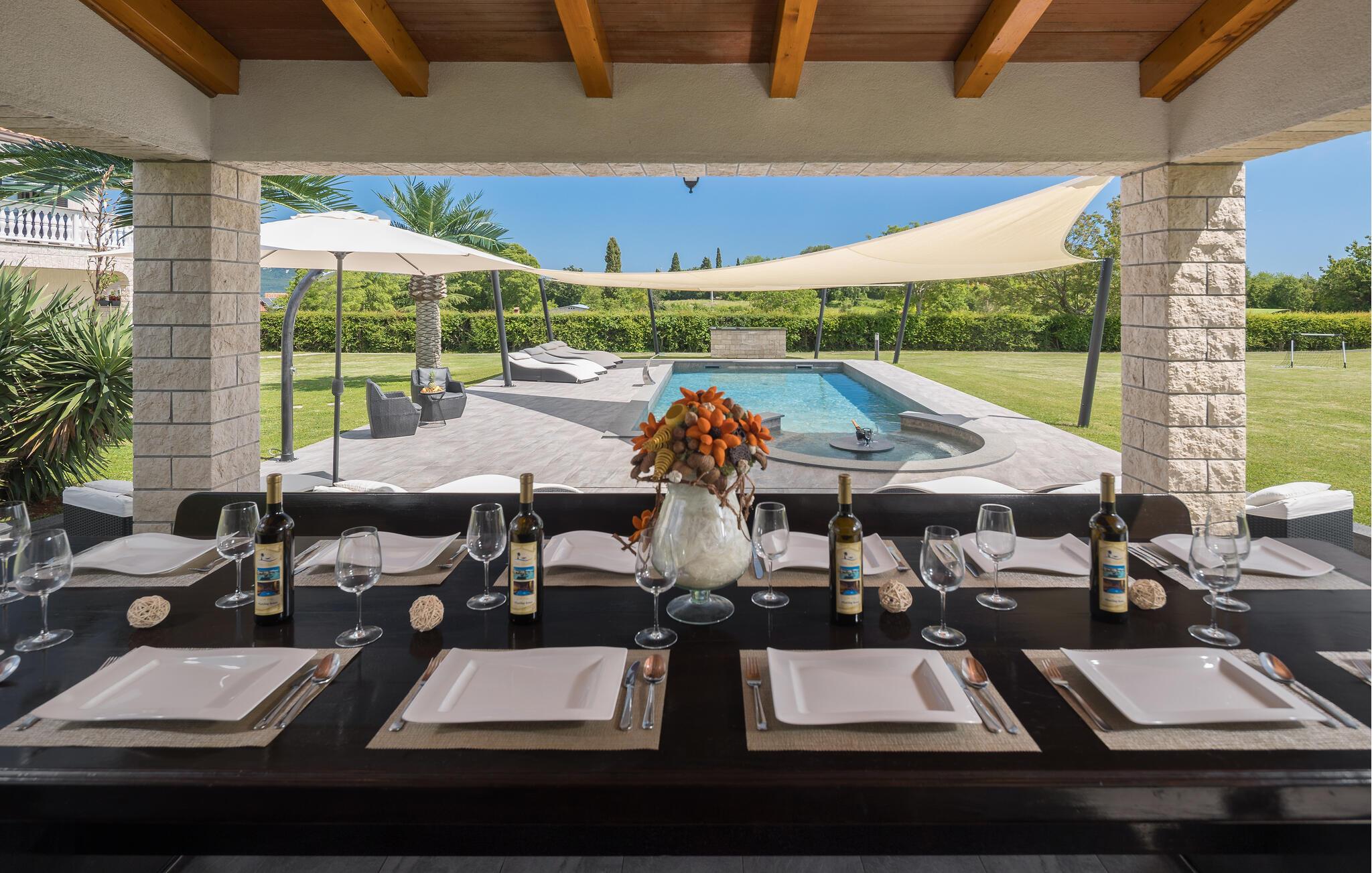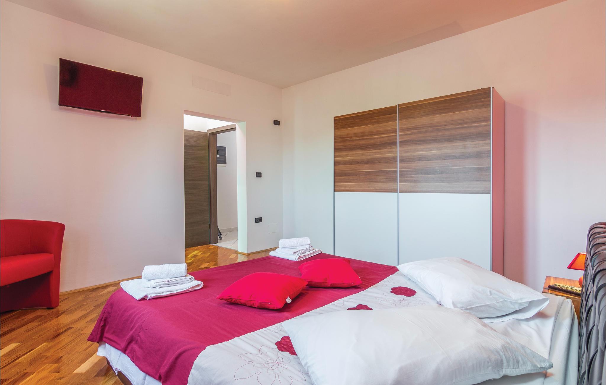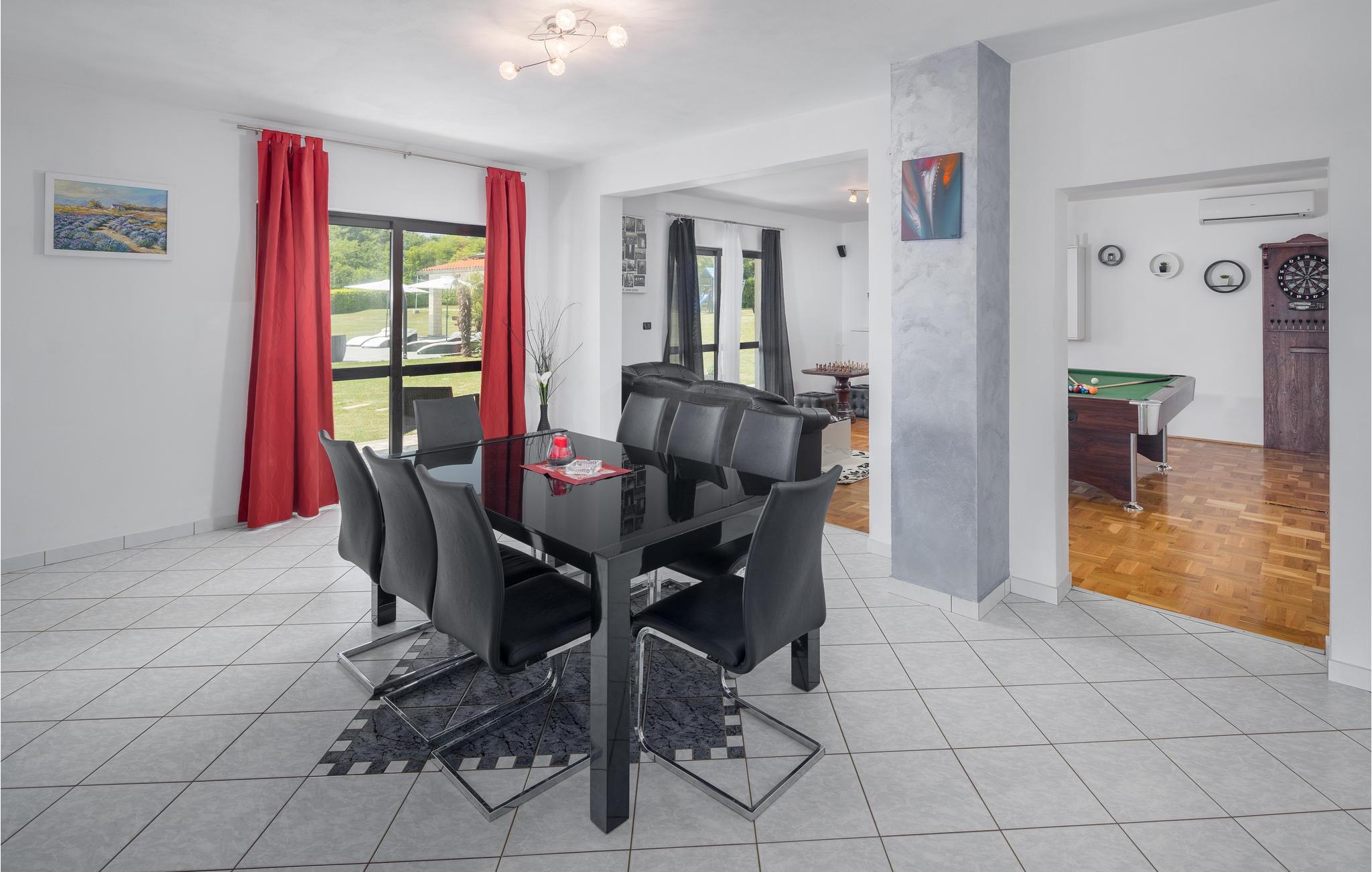 Mediterran atmosfære, stor wellnessafdeling og en opvarmet pool er noget af det I kan se frem til i ferien. Dette feriehus er delt op i to komfortable ferielejligheder, der er forbundet via ydre trapper. Slap af med en svømmetur i den udendørs opvarmede pool. Der er god plads både ude og inde til at være aktive og slappe af, lige som I har lyst til det. Husets grund er meget stor. Her kan I forkæle jer selv med mange former for wellness: stjerneklar himmel over whirlpoolen, lyseffekter, dampbad, finsk og infrarød sauna samt en pragtfuld koldtvandsdouche. Hold en skøn ferie i omgivelser der er en charmerende blanding af moderne og rustikt – og med god plads til at to familier kan holde ferie sammen. I nærheden af huset ligger den berømte ferieby Rabac med mange cafeer og souvenirbutikker og en skøn promenade til romantiske aftenture. I kan lave mad i sommerkøkkenet ved siden af poolen og more jer med at spille billard, bordtennis og dart. Der er også et legeværelse til de små. I nabolaget er der mange vandrestier og en lille skov, der tilhører husets ejer. Noget andet særligt ved dette feriedomicil er golfbanen (Driving Range) på 10.000 m², samt forskellige former for golfudstyr, så formen kan holdes, også i ferien. Et feriehus til ferien der skal være noget helt særligt for hele familien. Til huset hører der fire cykler, som er oplagte at benytte til at udforske den nærmeste egn. Husejeren giver jer gerne nogle tips til steder hvor I kan købe lokale produkter som vin, likør og honning.