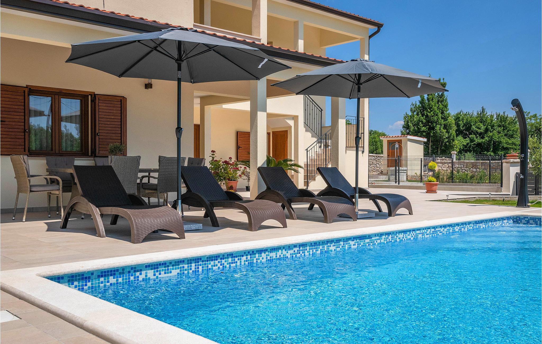Det udvendige er domineret af en smuk udendørs pool, som du kan bruge til at køle ned på varme sommerdage. Nyd at slappe af med familie eller venner på terrassen med en forfriskende drink.