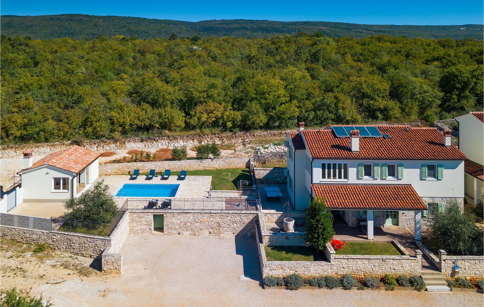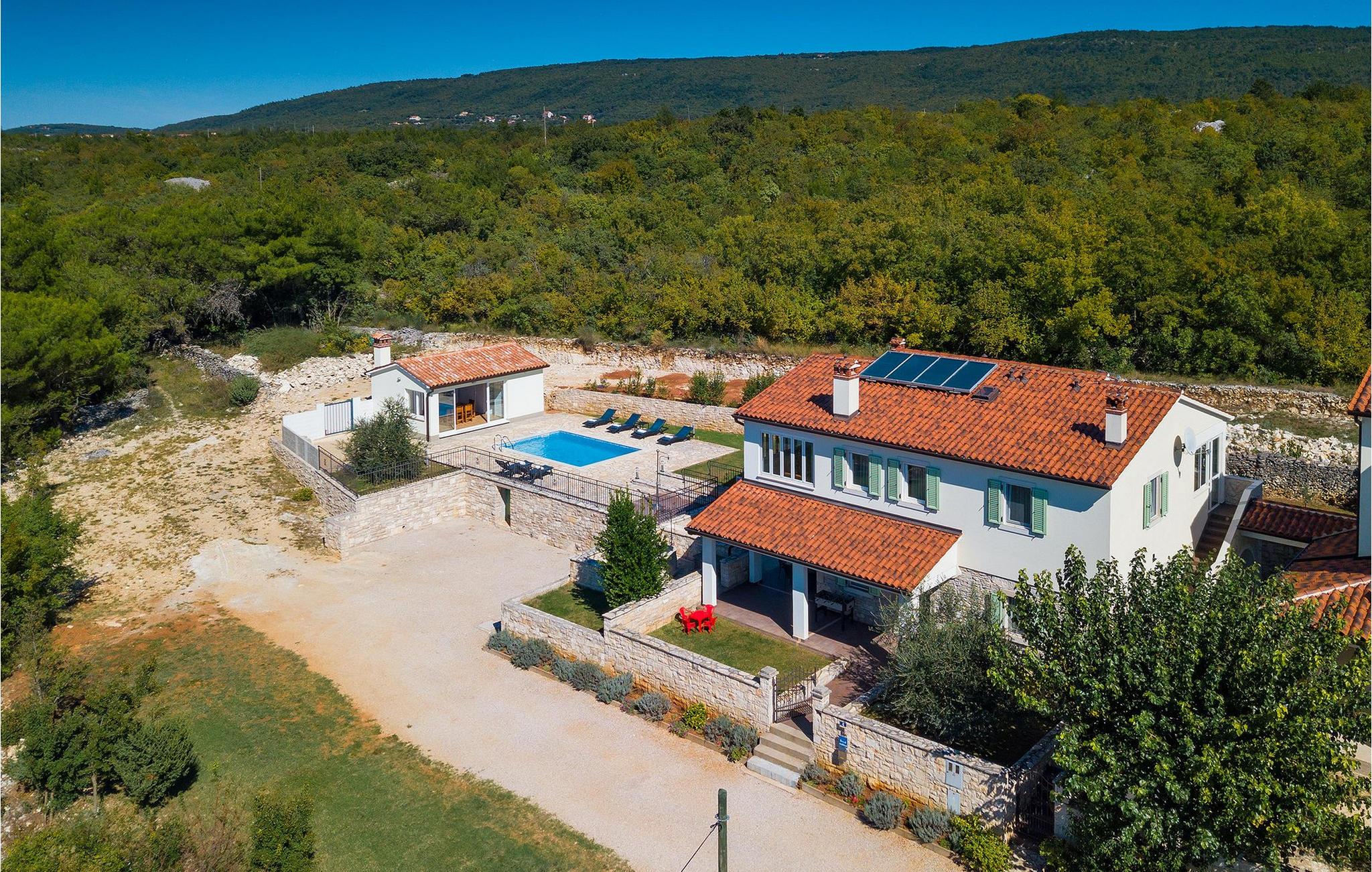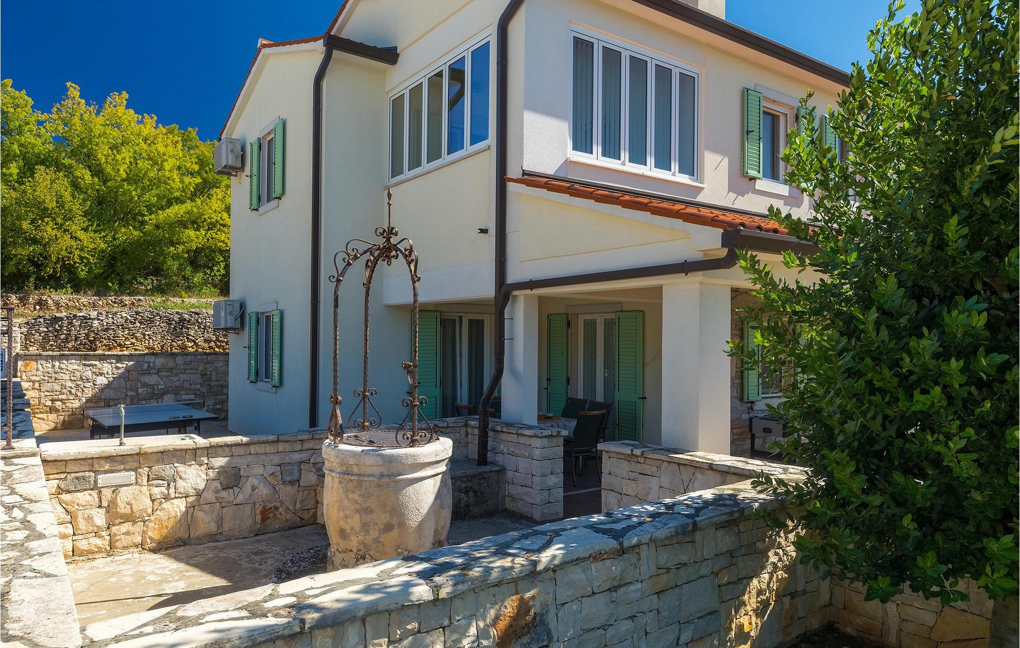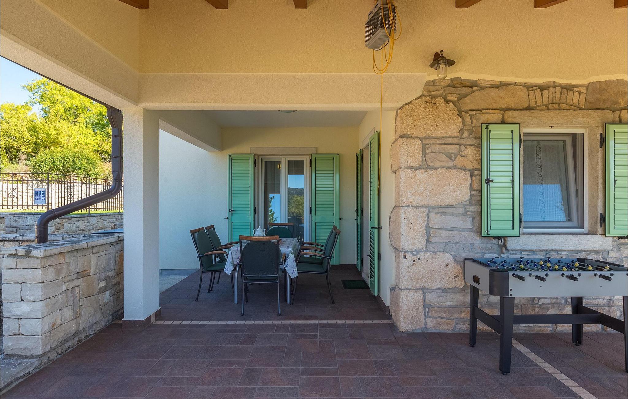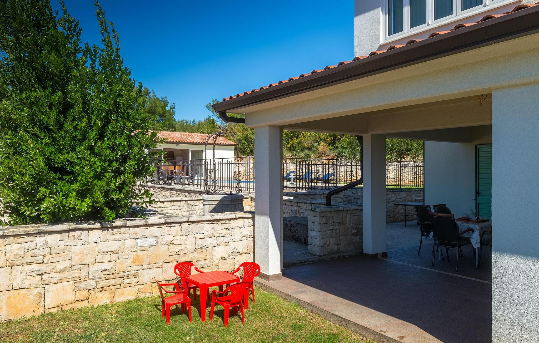 Villaen kan rumme op til 8 gæster og har to soveværelser og et badeværelse på hver etage. Der er i alt to fuldt udstyrede køkkener, hver med spiseplads til 6 og to stuer. Den øverste etage har en hyggelig lukket terrasse med en smuk se udsigt. Brug din ferie til at opdage denne del af Istrien, men også til at nyde et måltid tilberedt på grillen foran villaen, til at slappe af under parasollerne ved siden af poolen eller have det sjovt med bordtennis og bordfodbold.Trget er en lille fiskerlandsby, beliggende nær Labin og Rabac. Det er ikke overfyldt som større kystturistiske hotspots, men har stadig alt, hvad du måske har brug for - en restaurant, en bar og et supermarked er tæt nok på. Du har en række forskellige strande at vælge imellem i det omkringliggende område. De nærmeste er sten- og stenstrande, og kun en kort køretur væk ligger den berømte strand Rabac. Det fantastiske landskab giver dig mulighed for at nyde en mere aktiv form for ferie - sejlads, cykelture eller vandreture. Pula, den største by i Istrien, ligger 35 km væk og er også en fantastisk mulighed for en dagstur.