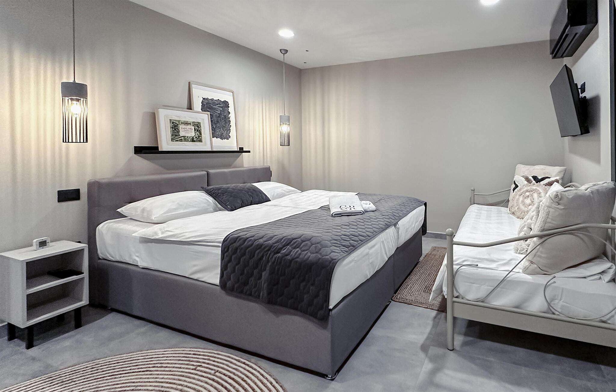 Der er en ekstra seng i kælderen. Værelset på første sal har direkte adgang til den udendørs terrasse, hvorfra I kan nyde det udendørs spabad til fem personer.