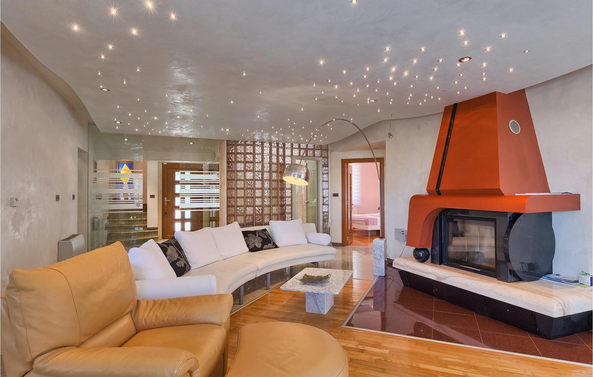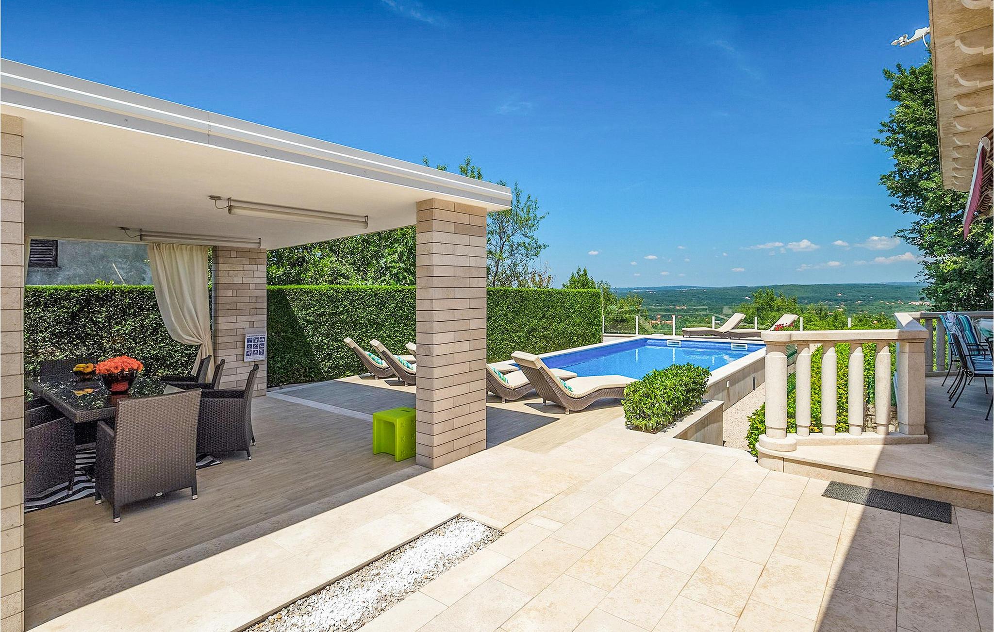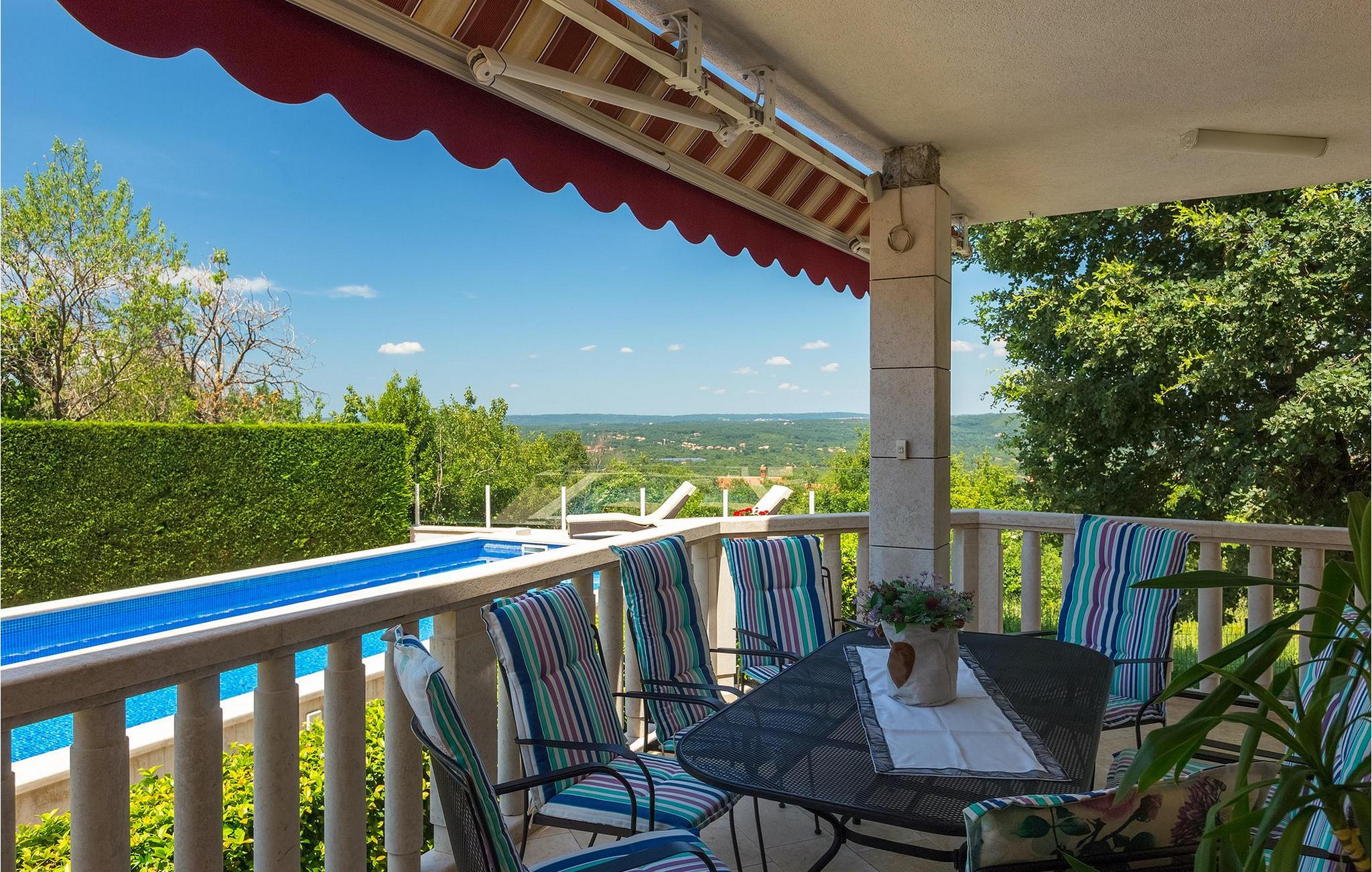 Das Erdgeschoss besteht aus 3 Schlafzimmern (2 Doppelzimmer und ein Einzelzimmer), einem großen stilvollen Wohnzimmer mit offenem Kamin und direktem Zugang zur Terrasse mit Blick auf den Pool, sowie einem Essbereich und einer weiteren voll ausgestatteten Küche und 2 Badezimmern. Die innere Treppe führt Sie in den 1. Stock, wo sich das fünfte Schlafzimmer (Doppel)zimmer) befindet, inklusive eines zusätzlichen Sofa, und einem ensuite Badezimmer. Dieses Zimmer verfügt über einen Balkon von wo Sie einen Blick auf den Pool und die Umgebung genießen können. Der einladende Pool mit wunderschöner Aussicht auf die Umgebung lädt zum Sonnenbaden oder Schwimmen ein. Der Essbereich im Freien auf der überdachten Terrasse außerhalb des Wohnzimmers, ermöglicht Ihnen eine schöne Aussicht während Ihrer Familienmahlzeiten, die auf einem Gasgrill zubereitet werden. Es gibt ein zusätzliches voll ausgestattetes Außenbadezimmer, als Erweiterung der überdachten Terrasse.