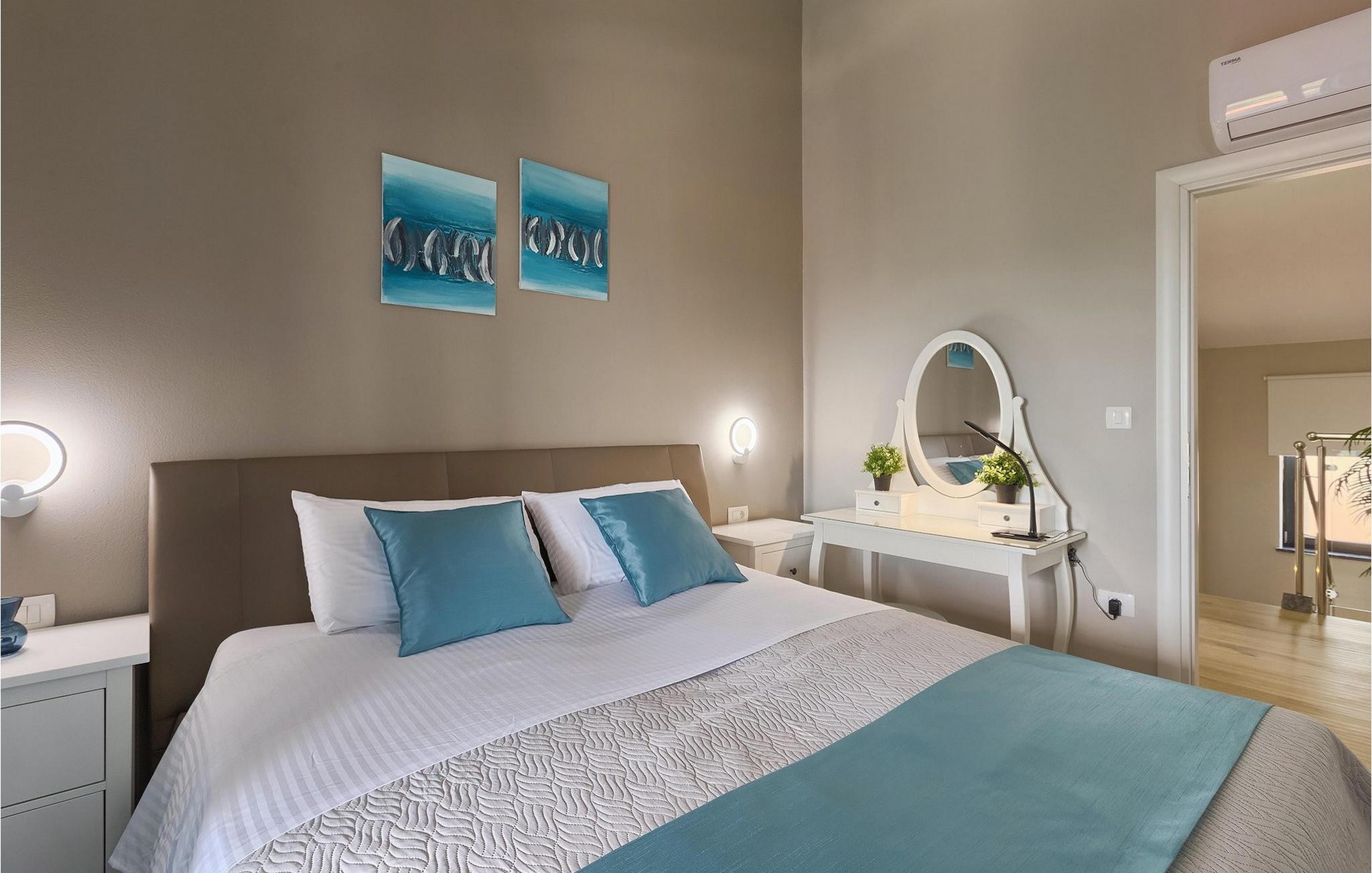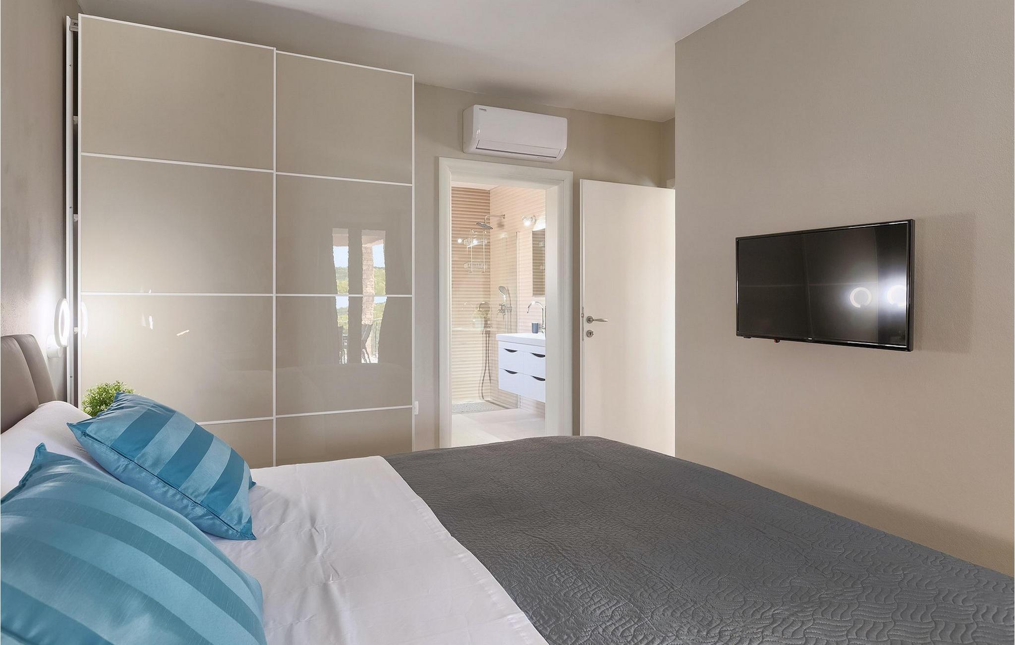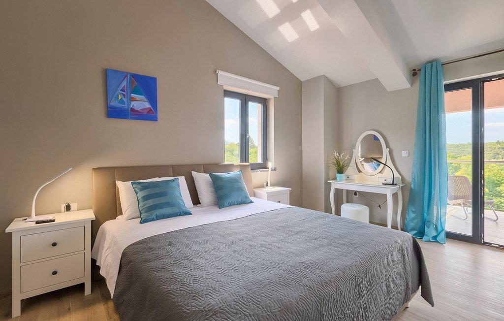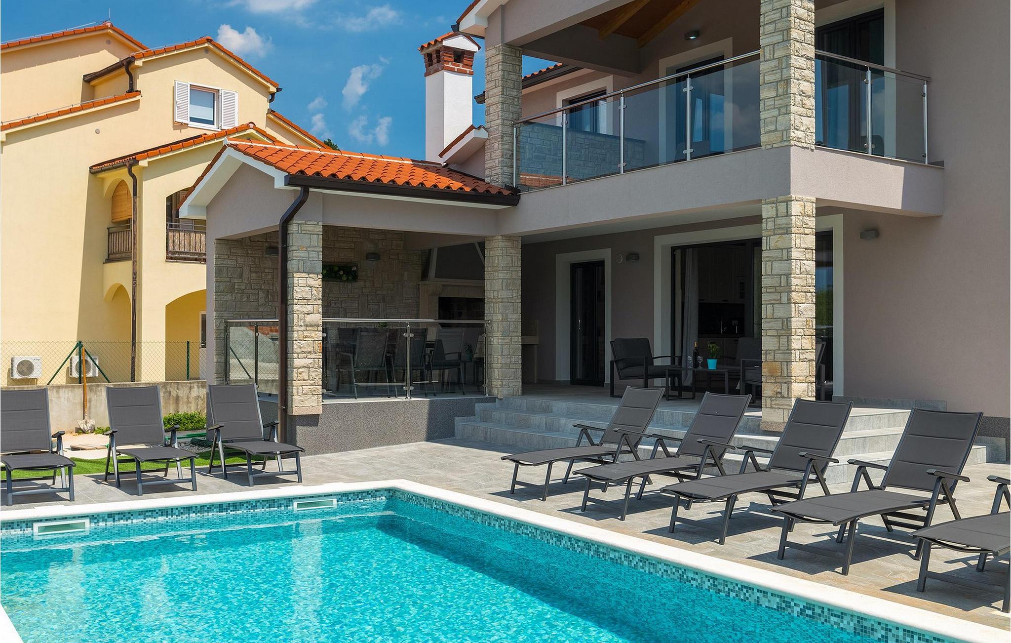 Den moderne villa Fiolla med privat pool ligger i den lille istriske by Labin og er et ideelt valg til en ferie væk fra byens stress og jag. Villaen ligger på en grund på 600 kvadratmeter og har i alt plads til 8 gæster. Når du træder ind i villaen, vil du straks føle dig godt tilpas takket være de lyse toner, som villaen er indrettet i. Stueetagen af villaen består af et åbent rum med stue, spisestue og fuldt udstyret køkken, toilet, soveværelse og et badeværelse. Fra spisestuen kan I gå gennem skydedøren ud på terrassen og nyde udsigten over villaens omgivelser. På første sal er de resterende 3 soveværelser og to badeværelser. Alle soveværelser er dobbeltværelser, har tv og aircondition, og det ene har en sovesofa.