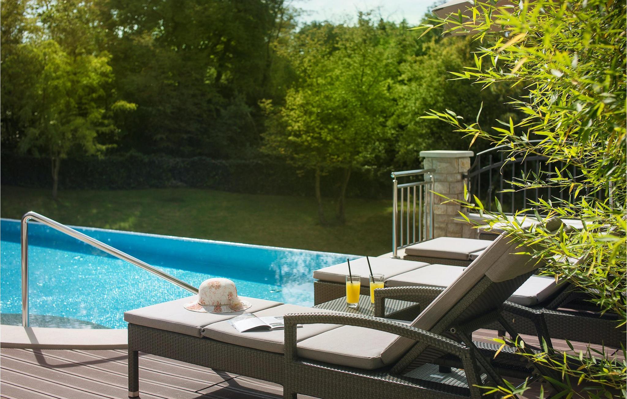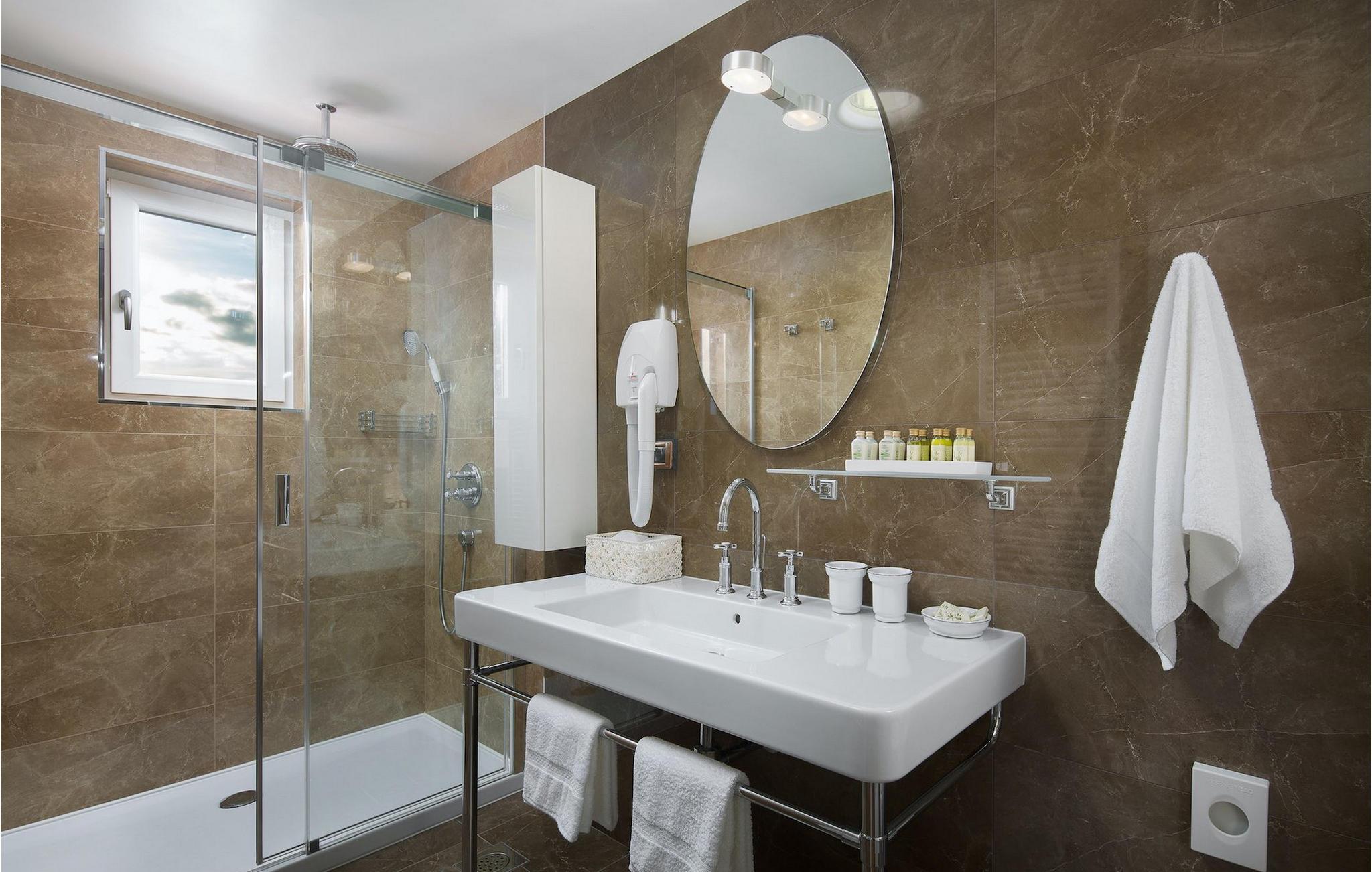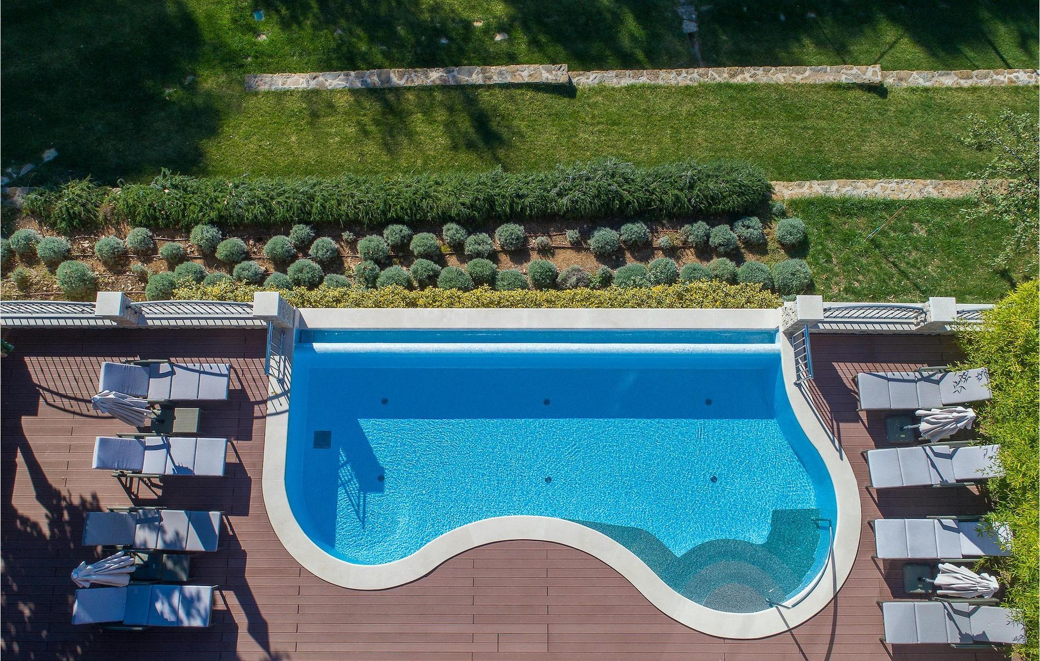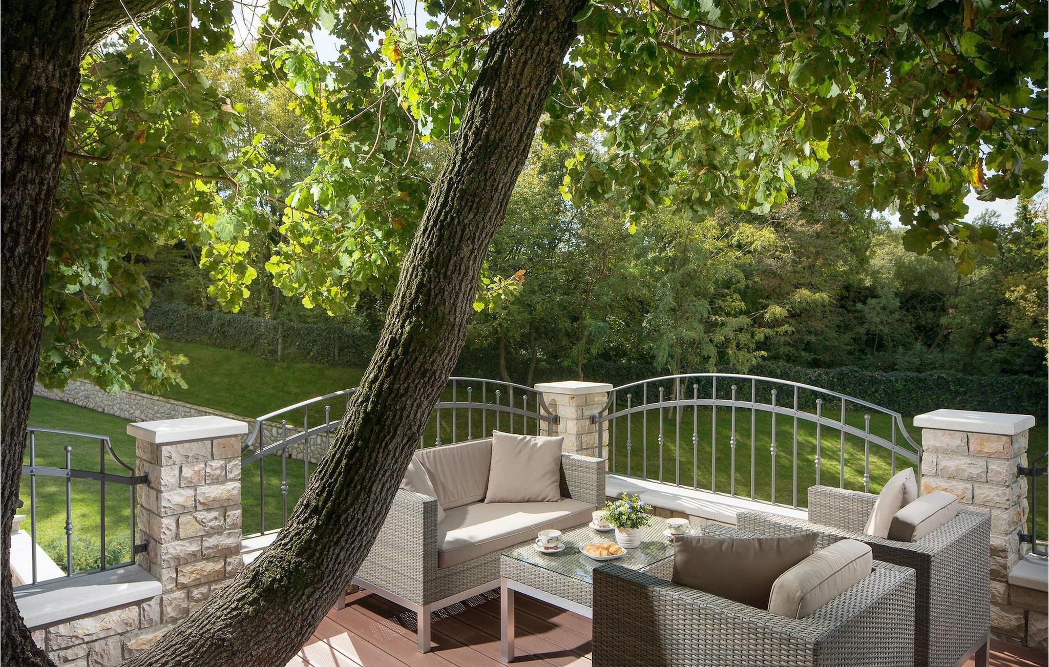 På første sal er der 3 rummelige soveværelser med dobbeltsenge, AC, centralvarme, TV og eget badeværelse med gulvvarme. 2 værelser byder på en 13m2 terrasse med siddeensemble og en smuk udsigt til haven og de grønne, bjergrige omgivelser.