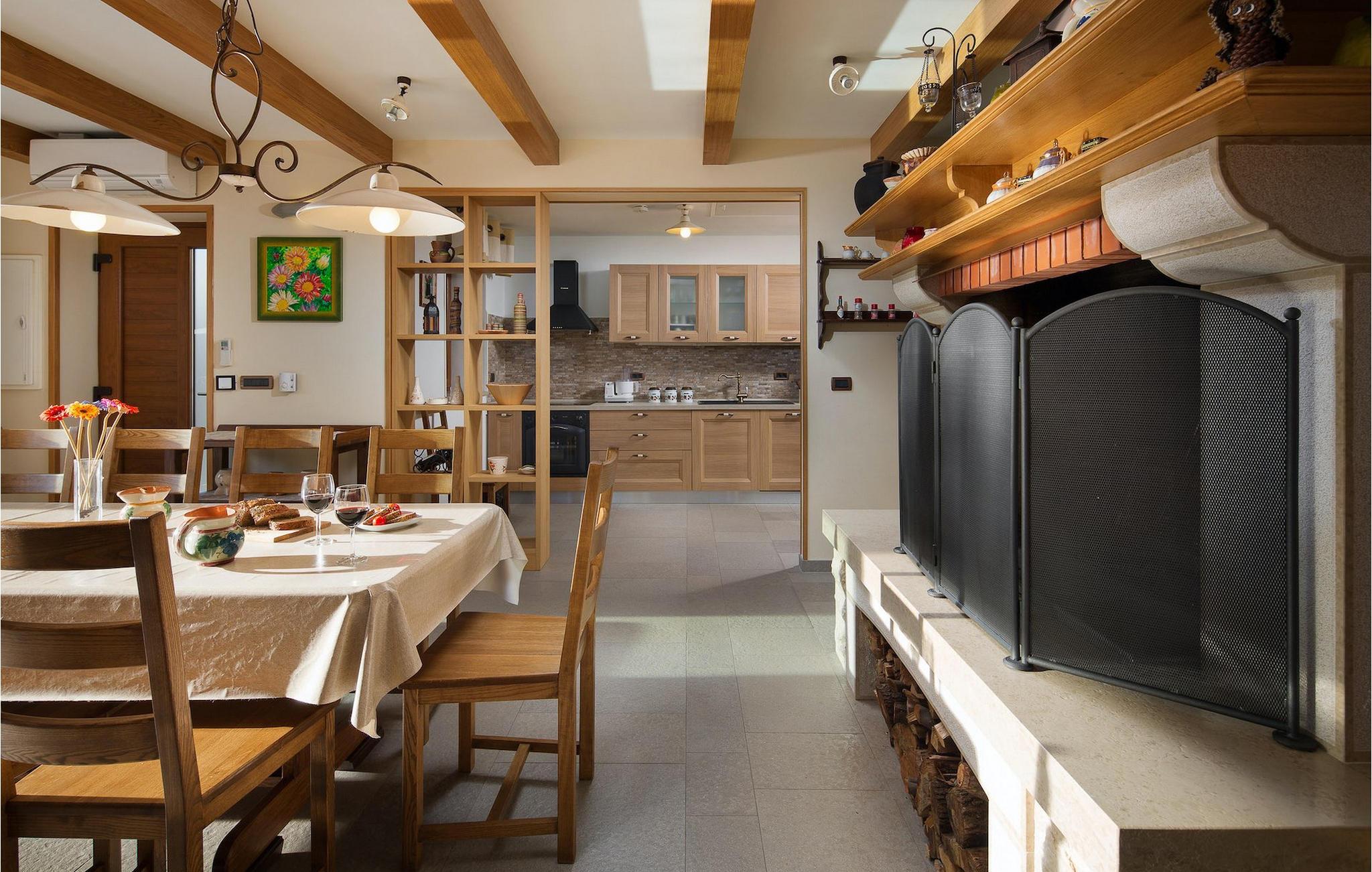 I stueetagen er der et smukt åbent koncept rum med en hyggelig stue og fuldt udstyret køkken. Stuen byder på et hyggeligt familiehjørne med pejs til kolde dage, AC til varme dage og en playstation-konsol, så børnene kan have det sjovt. Et værelse ligger i stueetagen med dobbeltseng og eget badeværelse. Hvis du kan lide at lave mad og afprøve nye specialiteter, vil du helt sikkert nyde den rummelige, smukke taverna med et fuldt udstyret køkken tilknyttet. Dette sted er ideelt til en lang nat med din familie, hvor du kan nyde friske måltider fra ovnen/pejsen og nyde udsigten til den indbydende pool.