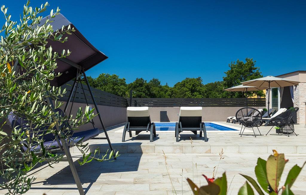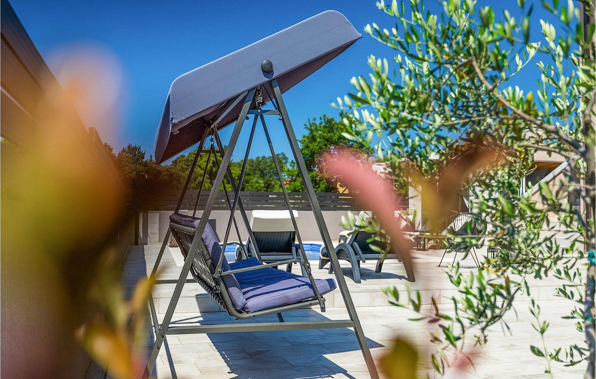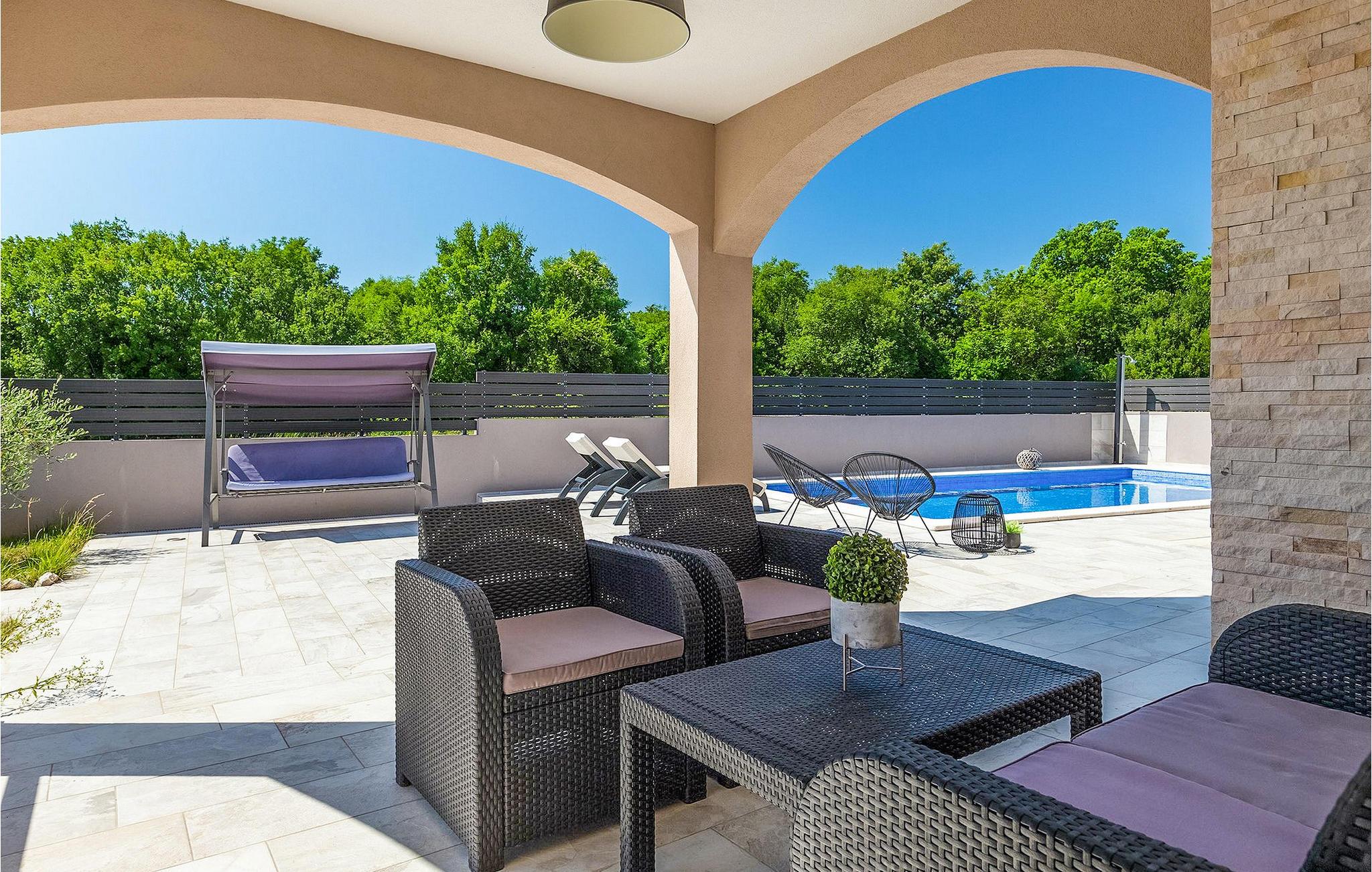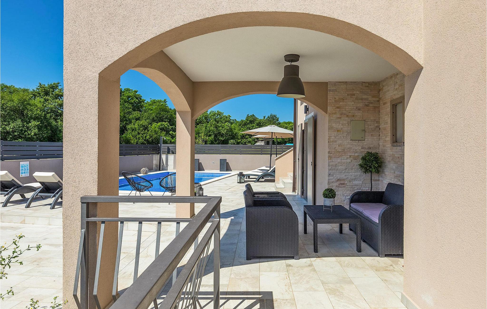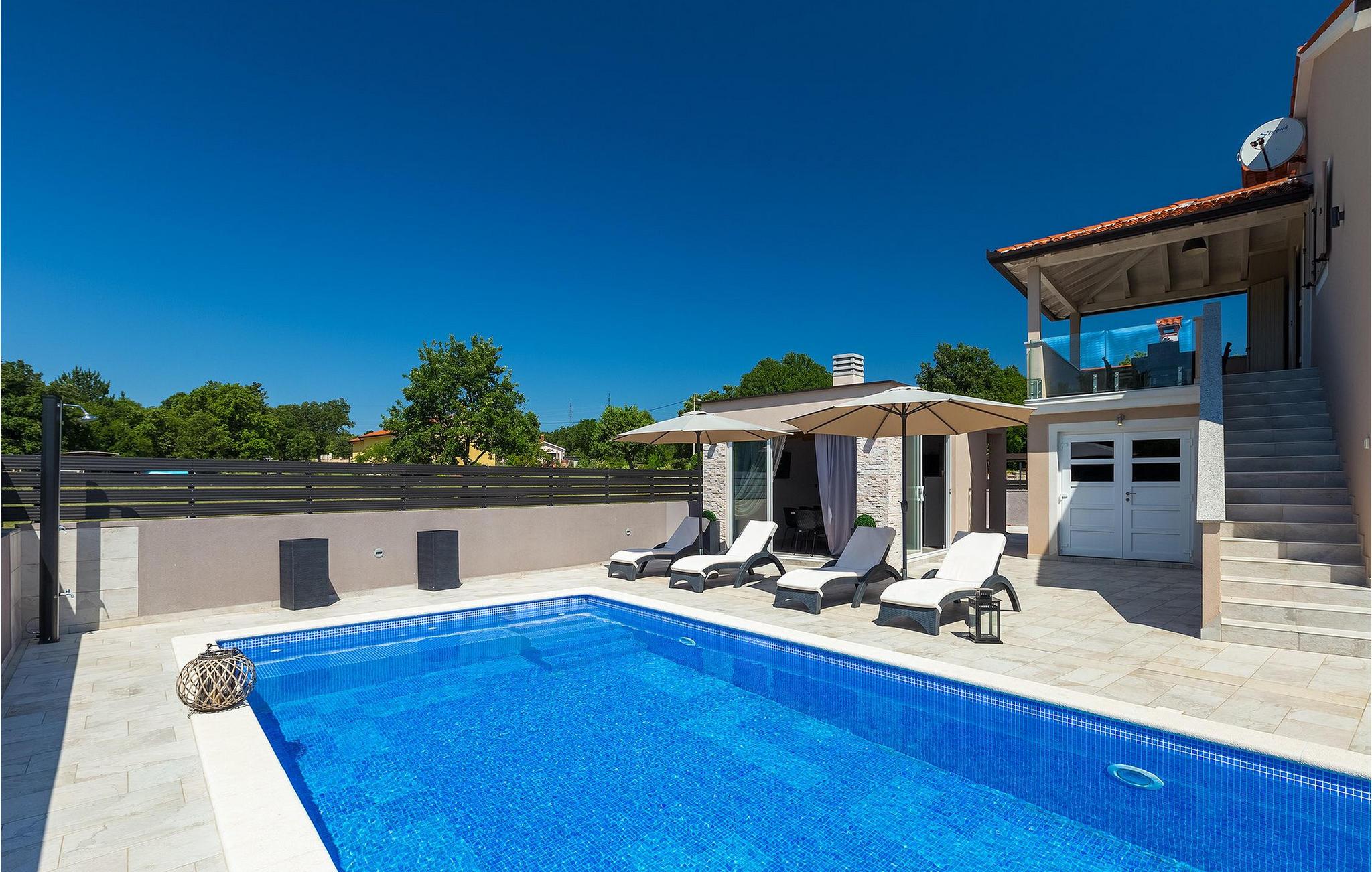 I det udendørs område er der swimmingpool, omgivet af seks liggestole og to parasoller, hvor du kan solbad og nyd udsigten til de grønne trætoppe omkring villaen.