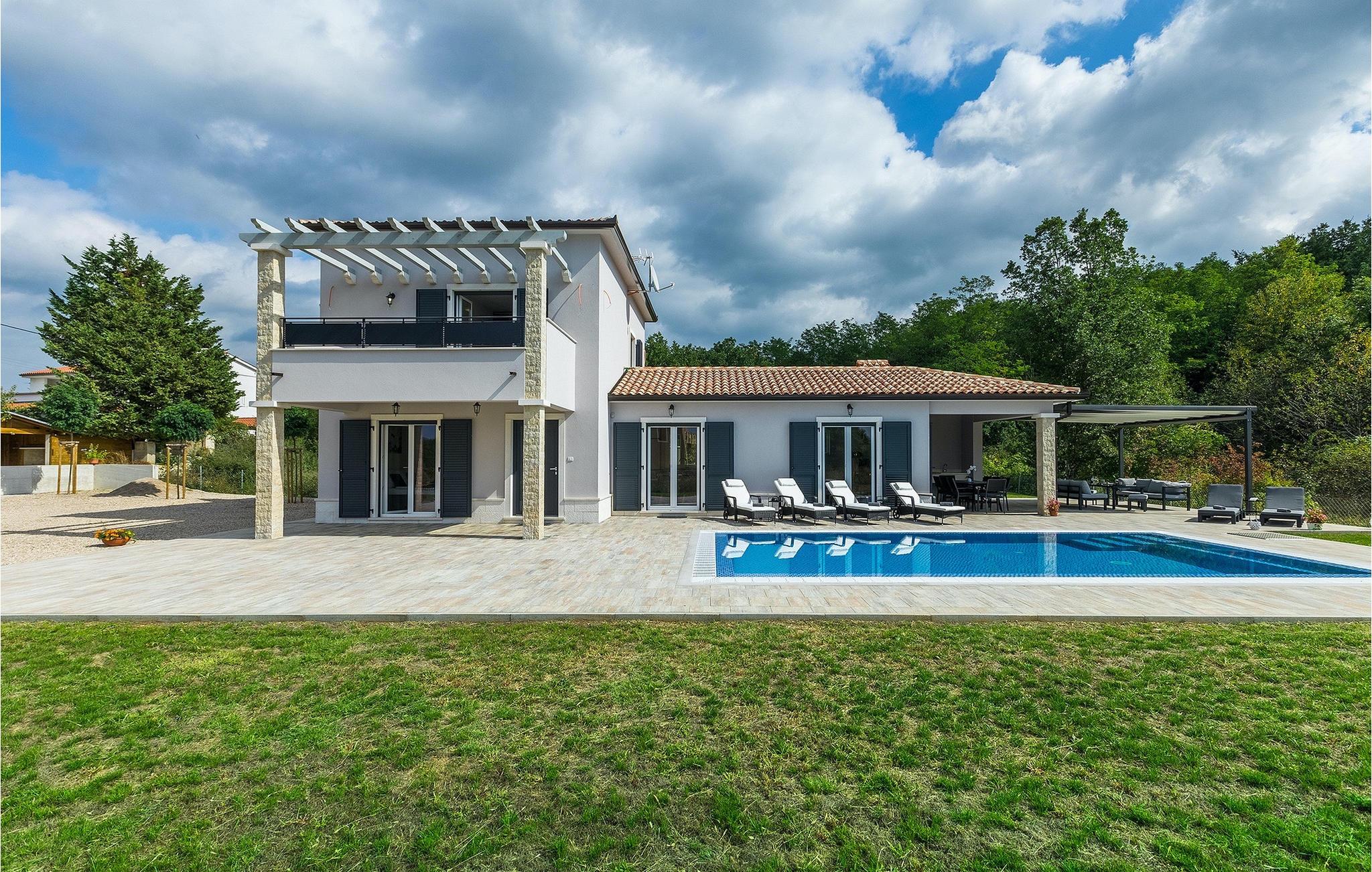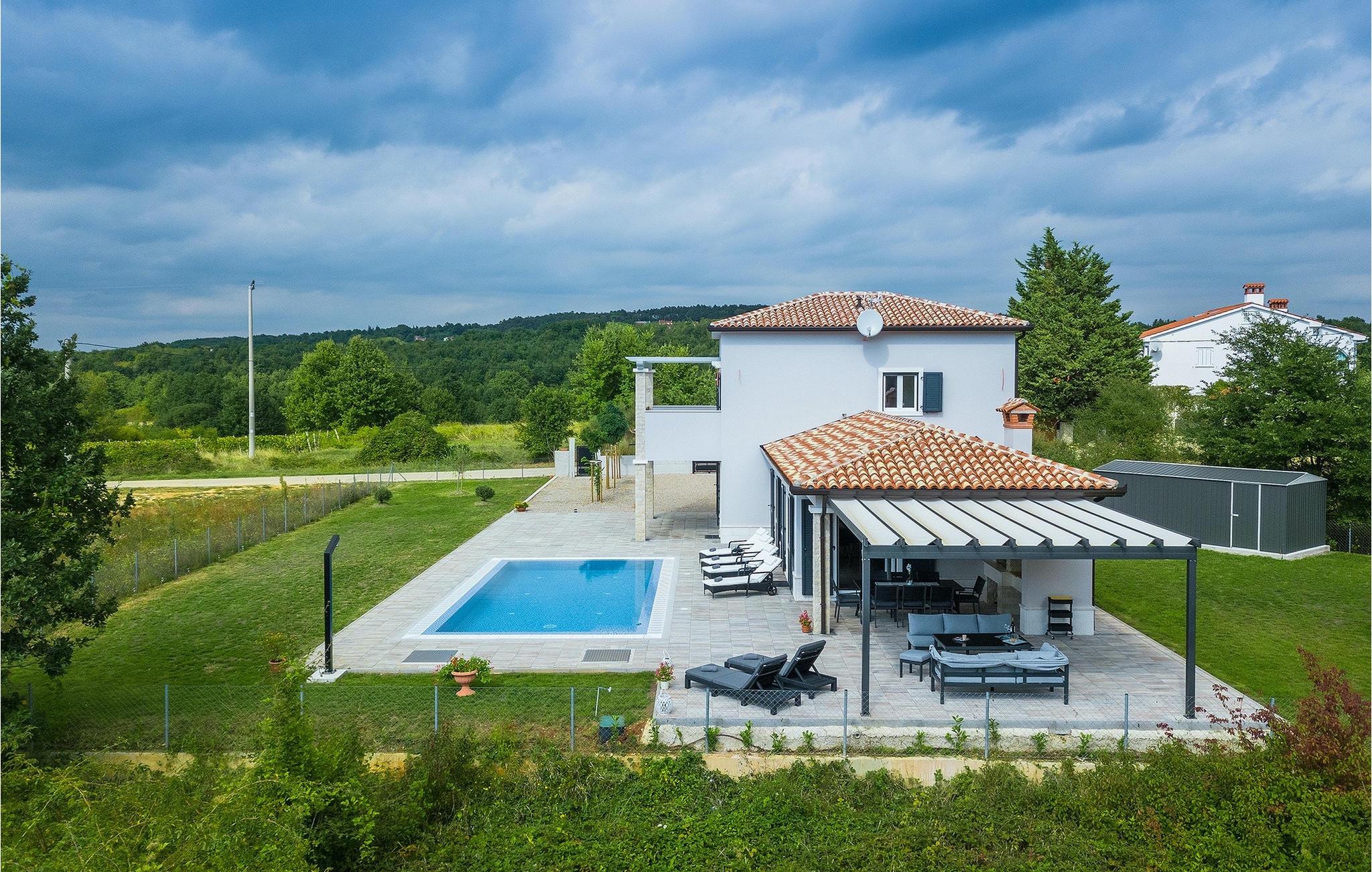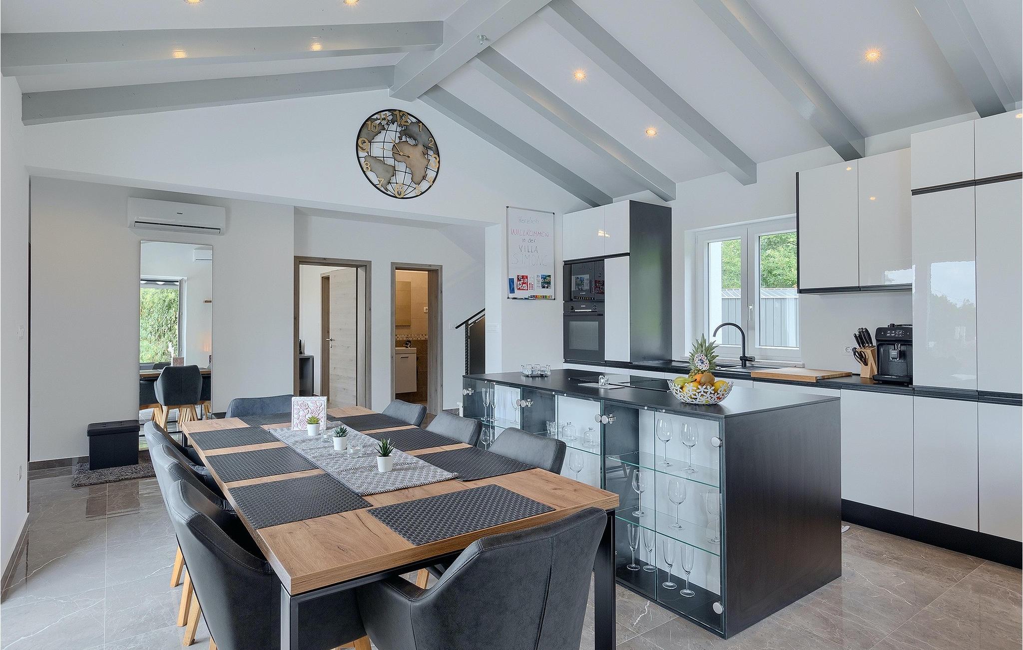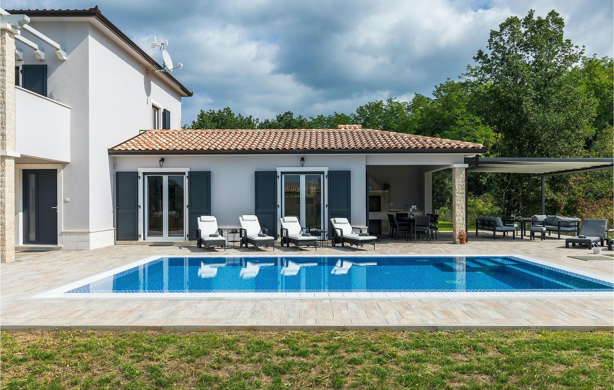 Villa Simone Paradiso har en fremragende beliggenhed nær kystbyen Rabac. Villaens udendørsområde har en privat nulkantspool og en udendørs bruser. Udnyt liggestolene placeret rundt om poolen til at slappe af En overdækket grill område er til rådighed til at tilberede lækre måltider. Der er også en udendørs spiseplads på ejendommen. Villaen har plads til i alt 8 personer. som er forbundet med stuen Dette er det perfekte sted at nyde din morgenkaffe endnu et soveværelse med eget badeværelse og et gæstetoilet. På første sal er der to mere komfortable soveværelser, hver med deres eget badeværelse. Det ene soveværelse giver udgang til altan. Villaen har aircondition, tilbyder internetadgang og privat parkering for op til 6 biler. Villa Simone Paradiso tilbyder alt, hvad du kan ønske dig til en afslappende og afslappende ferie. Villa Simone Paradiso ligger kun 9 km fra stranden i Rabac. Området byder på en række smukke stenstrande og skjulte bugter med krystalklart vand. En kort køretur væk ligger kystbyen Rabac. Der tilbydes en bred vifte af vandsportsaktiviteter her. Vi anbefaler at tage en romantisk gåtur langs promenaden. Beliggenhedsmæssigt er Villa Simone Paradiso et glimrende udgangspunkt for udflugter. Besøg den historiske by Pula, hvor det fortryllende romerske amfiteater ligger. Her arrangeres mange filmbegivenheder samt kulturelle begivenheder og koncerter. Vi anbefaler også, at du besøger den maleriske by Rovinj. Det særlige ved byen er, at den gamle bydel ligger på en lille halvø. Udforsk de smalle gader i byen og nyd din første kop kaffe i en af ??de mange caféer. Restauranterne tilbyder et fremragende udvalg af lokale specialiteter, som du bestemt bør prøve. Tag til Istrien og udforsk skønheden i denne region.