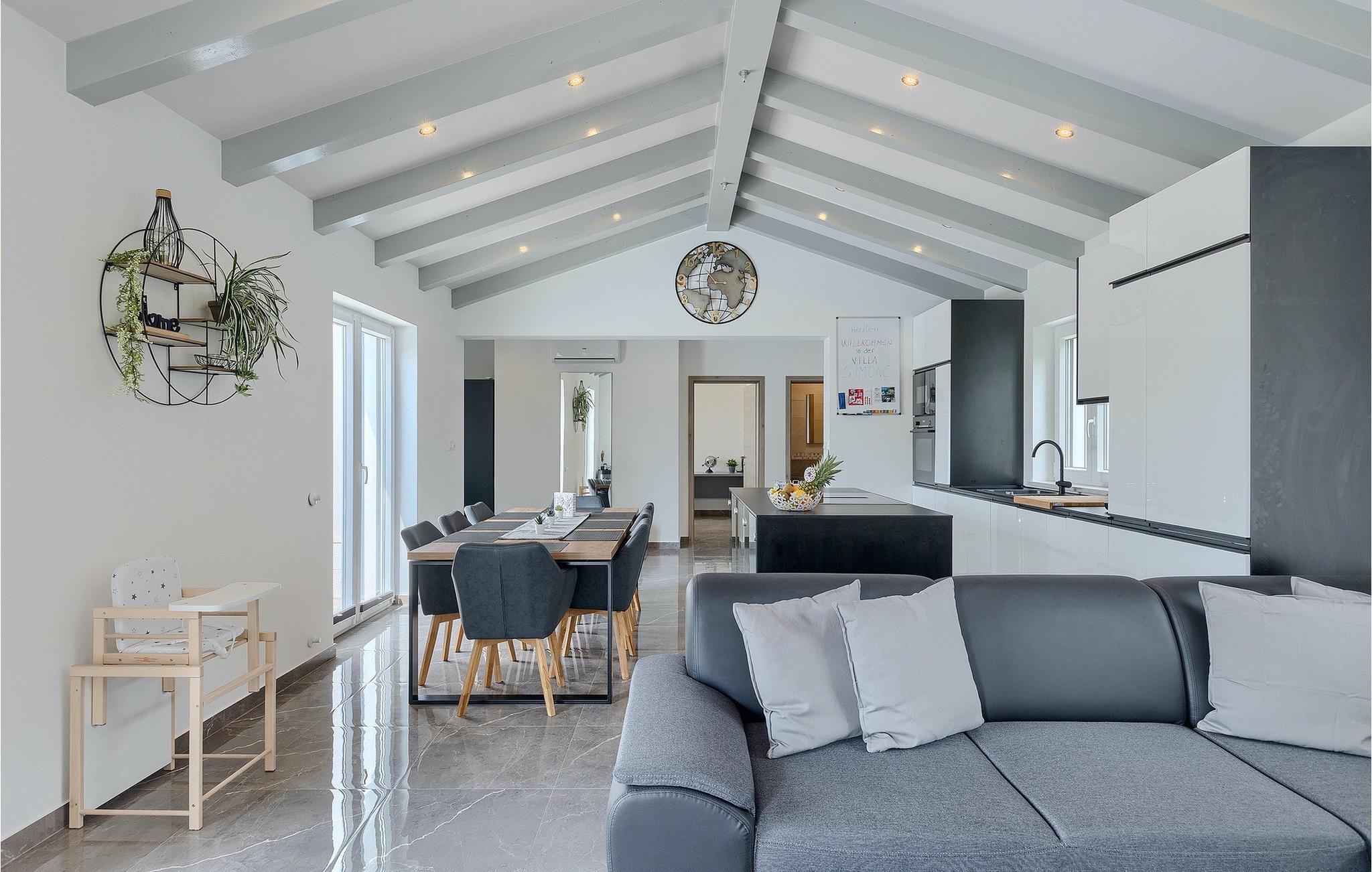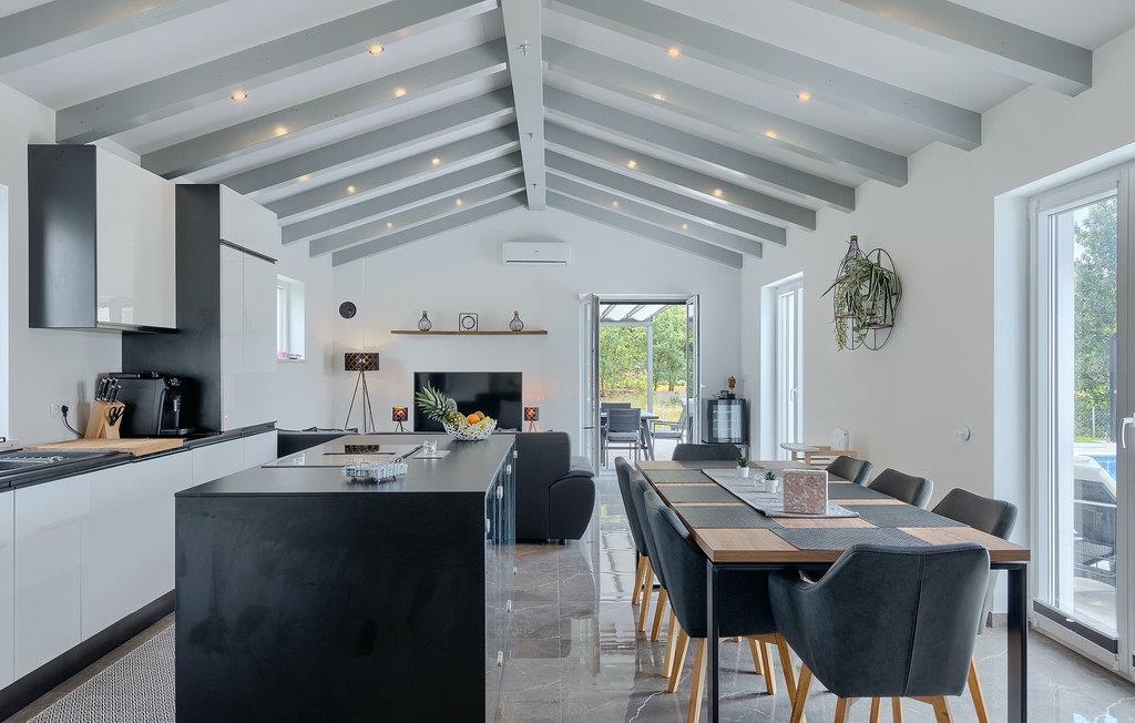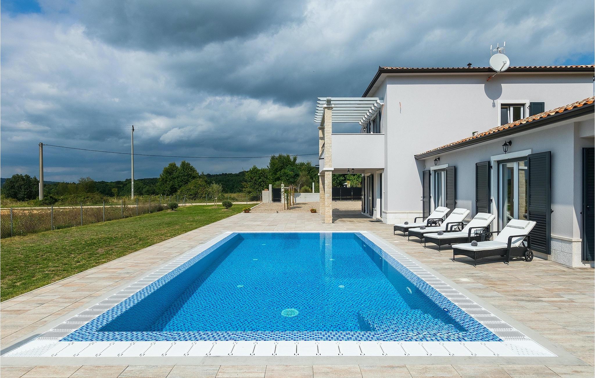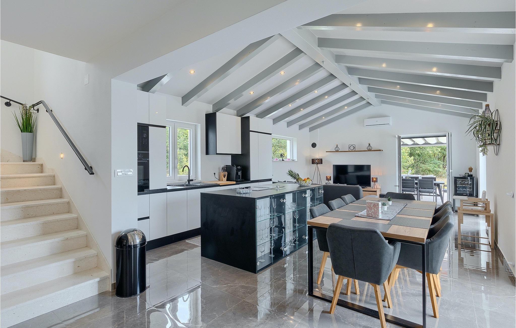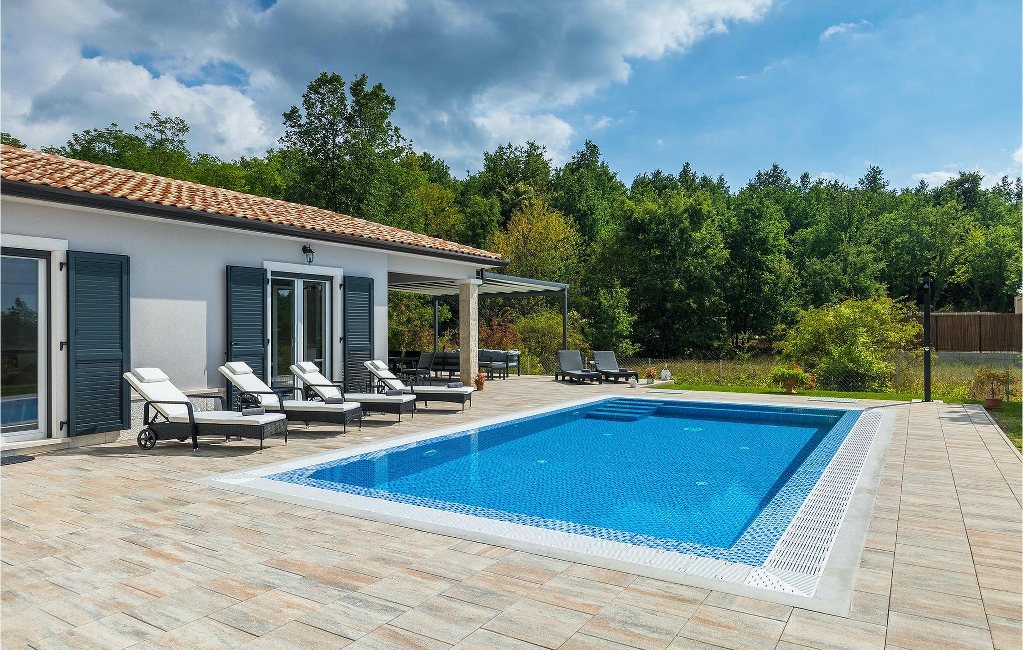 Villa Simone Paradiso har en fremragende beliggenhed nær kystbyen Rabac. Villaens udendørsområde har en privat nulkantspool og en udendørs bruser. Udnyt liggestolene placeret rundt om poolen til at slappe af En overdækket grill område er til rådighed til at tilberede lækre måltider. Der er også en udendørs spiseplads på ejendommen. Villaen har plads til i alt 8 personer. som er forbundet med stuen Dette er det perfekte sted at nyde din morgenkaffe endnu et soveværelse med eget badeværelse og et gæstetoilet. På første sal er der to mere komfortable soveværelser, hver med deres eget badeværelse. Det ene soveværelse giver udgang til altan. Villaen har aircondition, tilbyder internetadgang og privat parkering for op til 6 biler. Villa Simone Paradiso tilbyder alt, hvad du kan ønske dig til en afslappende og afslappende ferie. Villa Simone Paradiso ligger kun 9 km fra stranden i Rabac. Området byder på en række smukke stenstrande og skjulte bugter med krystalklart vand. En kort køretur væk ligger kystbyen Rabac. Der tilbydes en bred vifte af vandsportsaktiviteter her. Vi anbefaler at tage en romantisk gåtur langs promenaden. Beliggenhedsmæssigt er Villa Simone Paradiso et glimrende udgangspunkt for udflugter. Besøg den historiske by Pula, hvor det fortryllende romerske amfiteater ligger. Her arrangeres mange filmbegivenheder samt kulturelle begivenheder og koncerter. Vi anbefaler også, at du besøger den maleriske by Rovinj. Det særlige ved byen er, at den gamle bydel ligger på en lille halvø. Udforsk de smalle gader i byen og nyd din første kop kaffe i en af ??de mange caféer. Restauranterne tilbyder et fremragende udvalg af lokale specialiteter, som du bestemt bør prøve. Tag til Istrien og udforsk skønheden i denne region.