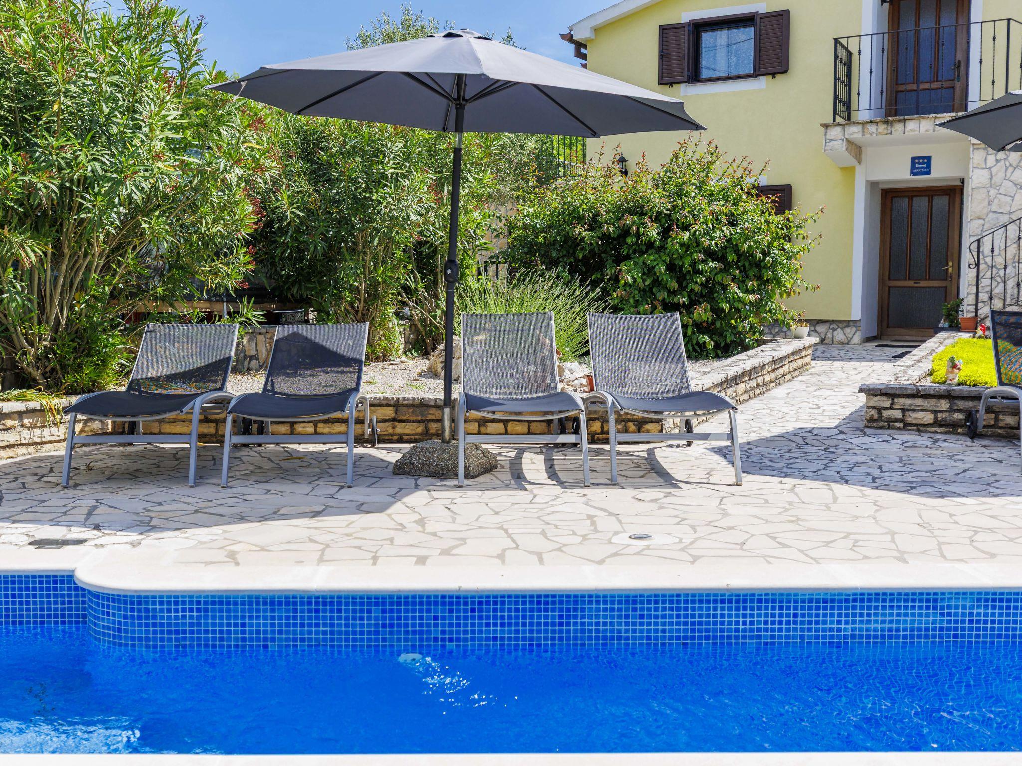 Semi-detached house "Ve-Ma", 2 storeys. In the hamlet Kapelica 2.5 km from the centre of Labin, in a quiet, sunny position, 6 km from the sea. Private: property 1'700 m2, garden, swimming pool (60 m2, depth 70 - 150 cm, seasonal availability: 18.May. - 29.Sep.) with internal staircase. Unconventional pool shape. Outdoor shower, barbecue. In the house: internet access, washing machine. Parking at the house on the premises. Shop 2.5 km, restaurant 2 km, bus stop 3.4 km, pebble beach 6 km, rocky beach 6 km. Cycle lane 100 m. The owner does not accept any youth groups. The house consists of 2 apartments, rented as one unit.