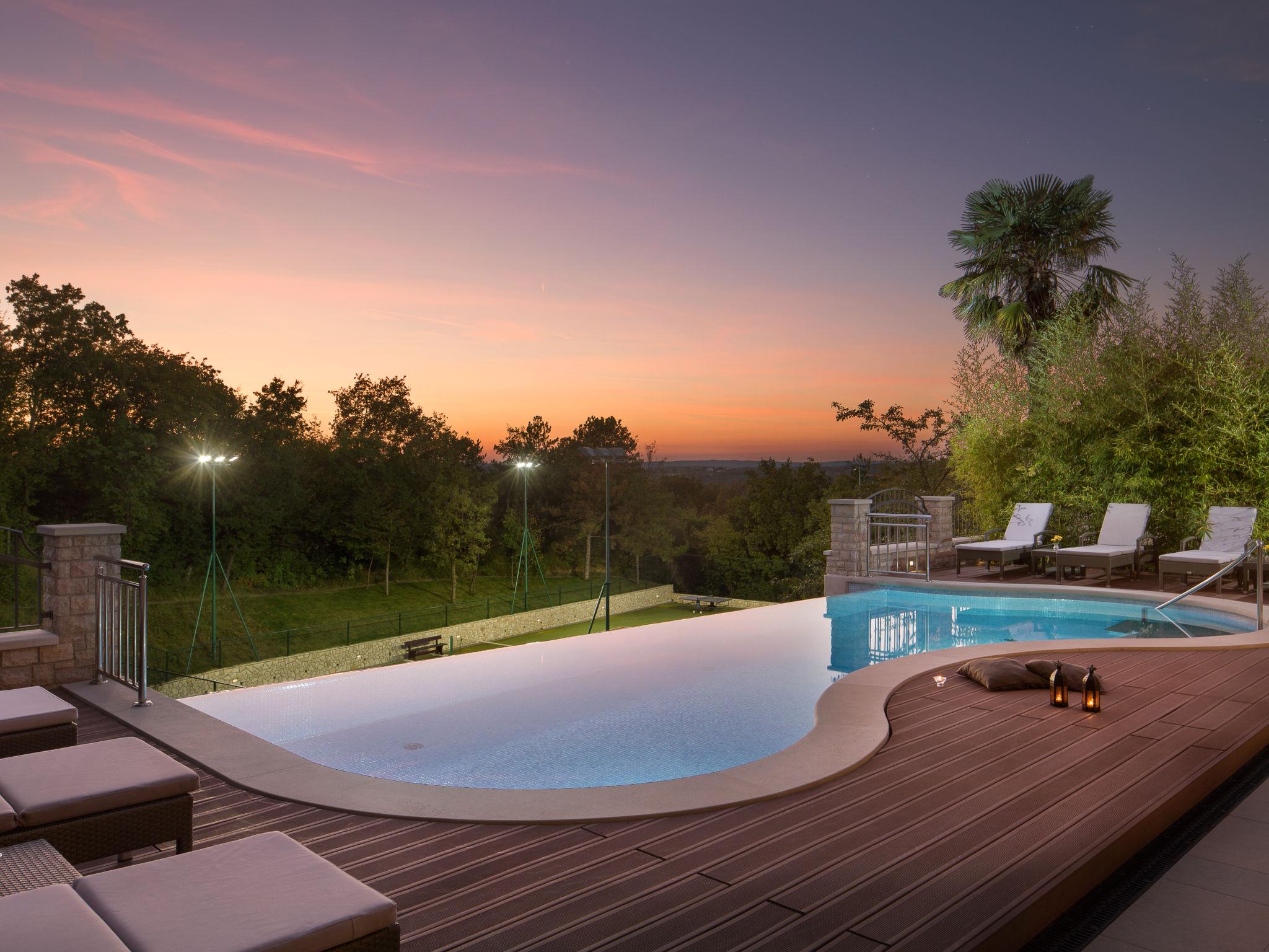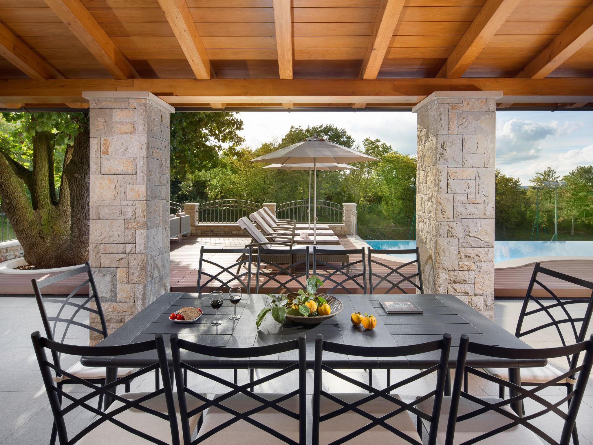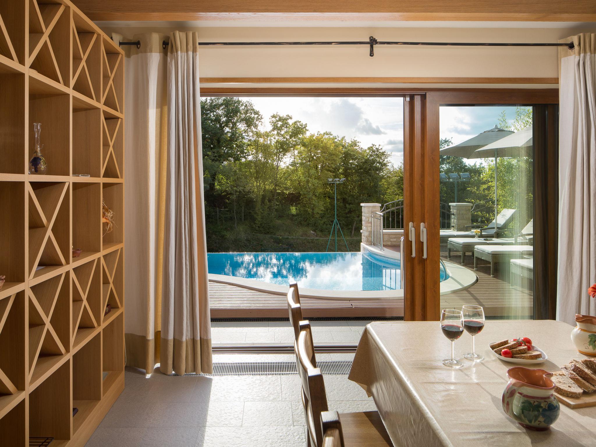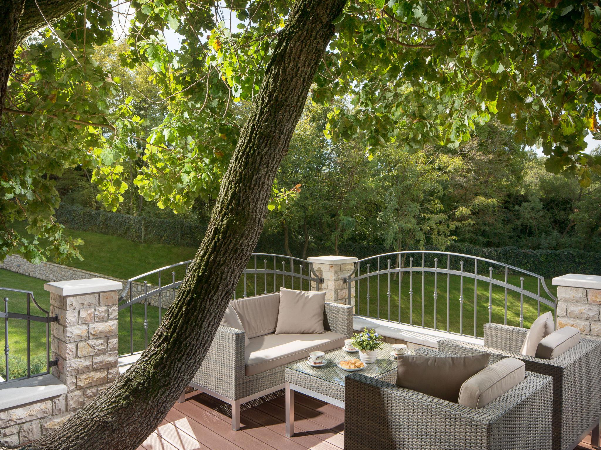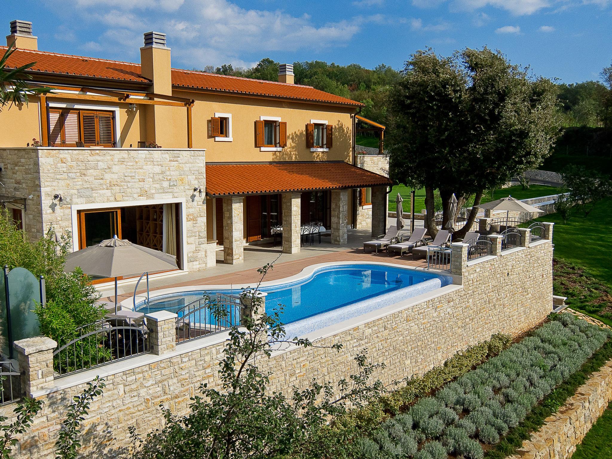 Beautiful villa "Vlastelini", 2 storeys, built in 1921, renovated in 2011. 1 km from the centre of Labin, in a quiet, sunny position on a slope, 3.5 km from the sea, 3.5 km from the beach. Private: property 7'000 m2 (fenced), beautiful garden with lawn and wildlife garden, swimming pool heated (35 m2, depth 140 cm, seasonal availability: 06.Apr. - 12.Oct.) with internal staircase. Unconventional pool shape. Outdoor shower, tennis, floodlit, table tennis, barbecue. In the house: internet access, central heating system, washing machine, tumble dryer. Towel change daily. Roofed, parking (for 4 cars) at the house on the premises. E-charging station. Shop 900 m, restaurant 600 m, bus stop 2.7 km, pebble beach 3.5 km, rocky beach 3.5 km. Walking paths from the house 100 m, cycle lane 150 m. Please note: suitable for families. Groups of teenagers on request only. Animals in the neighbourhood. Traditional tavern in the ground floor with open-hearth fireplace, kitchen (4 induction hot plates, oven, dishwasher, freezer), satellite TV (flatscreen), hi-fi system, DVD player, air conditioning, exit to the pool. Separate WC. Putting green. By groups of young people double deposit is requested on arrival. Swimming pool heated (extra). It is necessary to announce 7 days in advance if the pool heating is required. Welcome pack and champagne upon arrival.