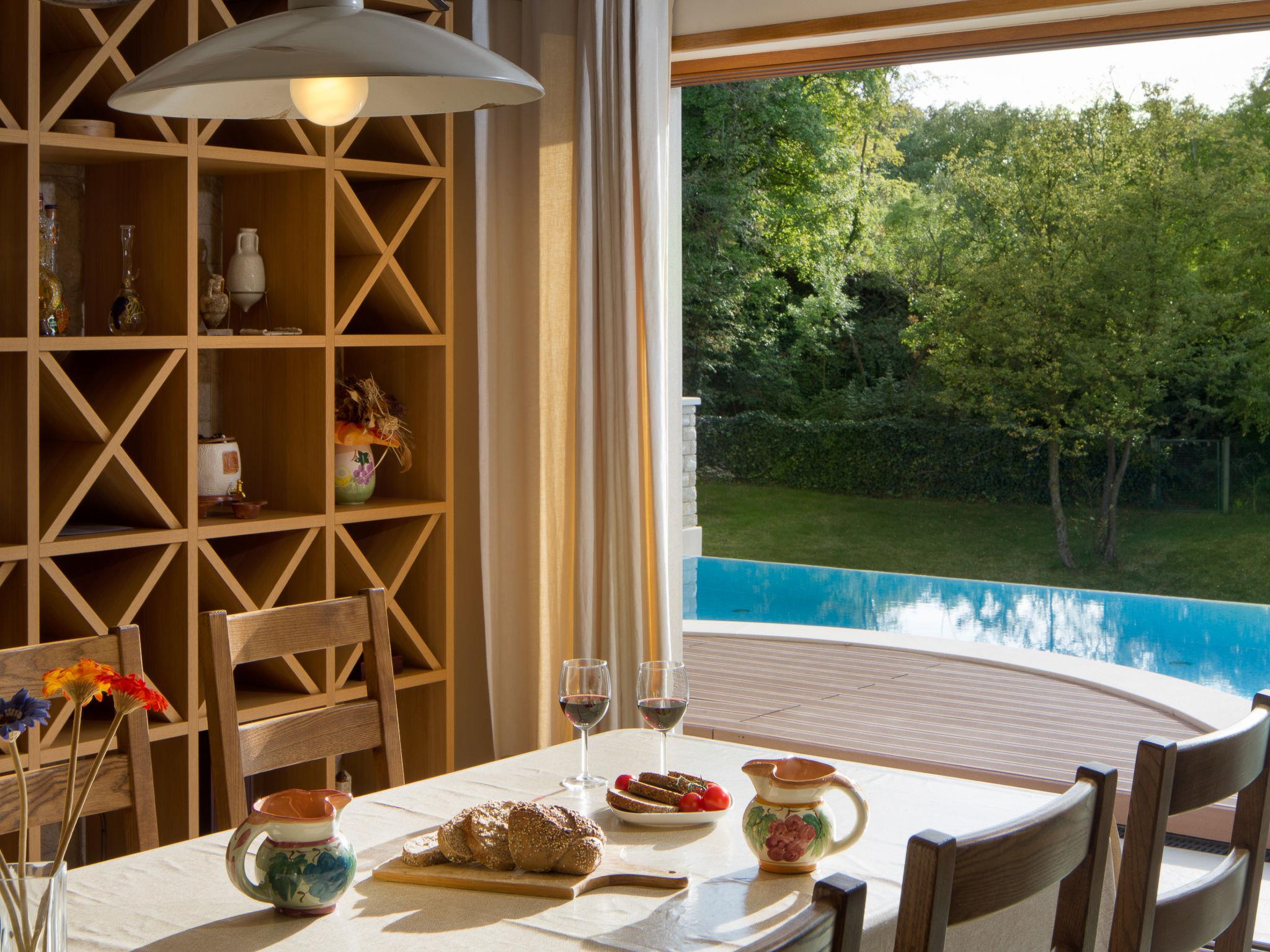 5-room villa 265 m2 on 2 levels. Beautiful and tasteful furnishings: living/dining room with open-hearth fireplace (only for decoration), satellite TV (flat screen), hi-fi system, DVD and air conditioning. Exit to the terrace. 1 room with 1 french bed (160 cm, length 190 cm), shower/WC and satellite TV (flat screen), air conditioning. Open kitchen (oven, dishwasher, 4 ceramic glass hob hotplates, microwave, freezer, electric coffee machine). Sep. WC. Upper floor: 1 room with 1 french bed (180 cm, length 200 cm), shower/WC and satellite TV (flat screen), air conditioning. Exit to the terrace. 1 room with 1 french bed (160 cm, length 200 cm), shower/WC and satellite TV (flat screen), air conditioning. Exit to the terrace. 1 room with 1 french bed (160 cm, length 200 cm), shower/WC and satellite TV (flat screen), air conditioning. Terrace 30 m2, roofed, 2 terraces 18 m2, roofed. Terrace furniture, deck chairs. View of the swimming pool, the garden and the countryside. Facilities: safe, baby cot, hair dryer. Internet (WiFi, free). Please note: non-smoking house. 2163-09-09-12-01/4