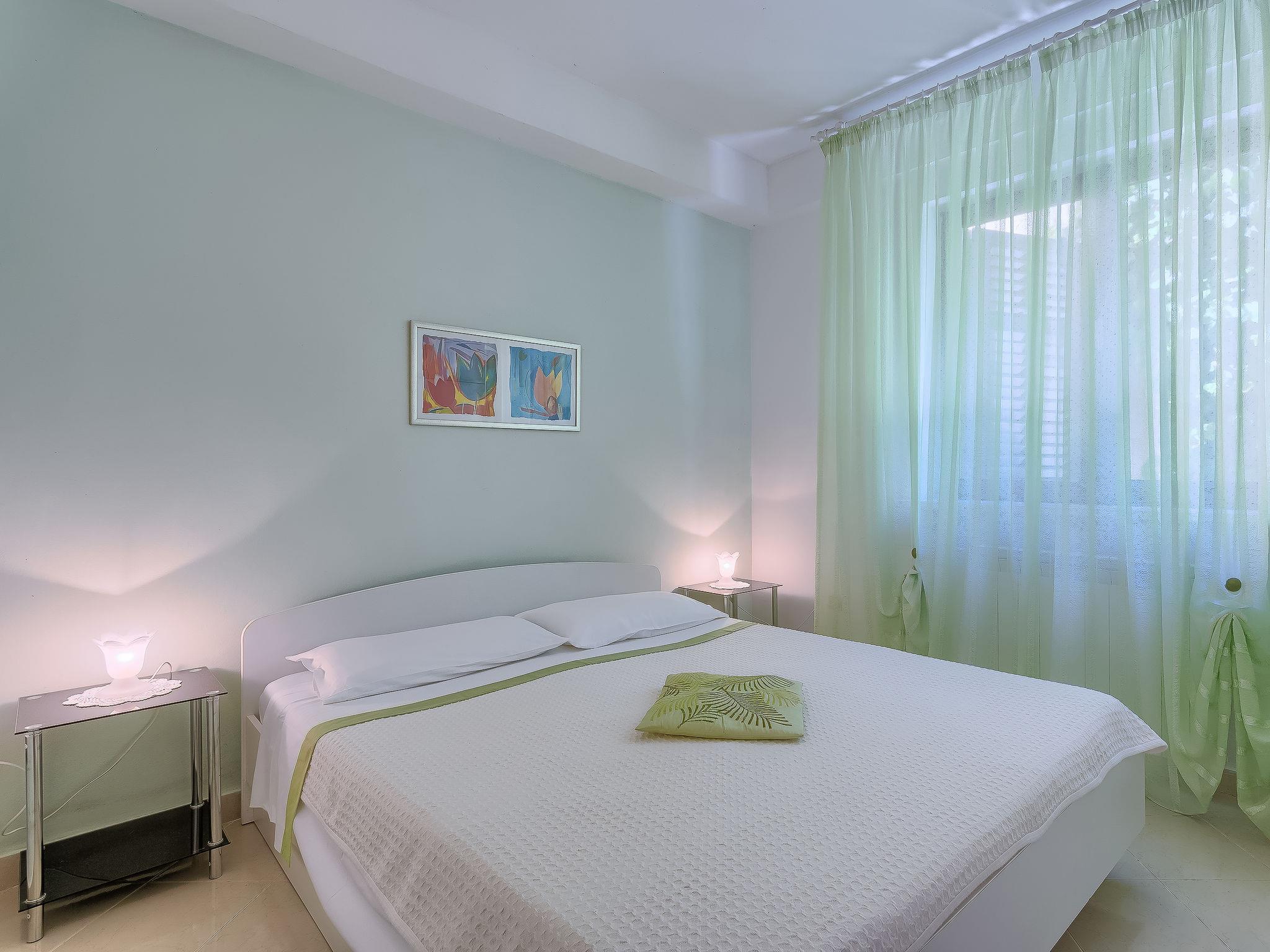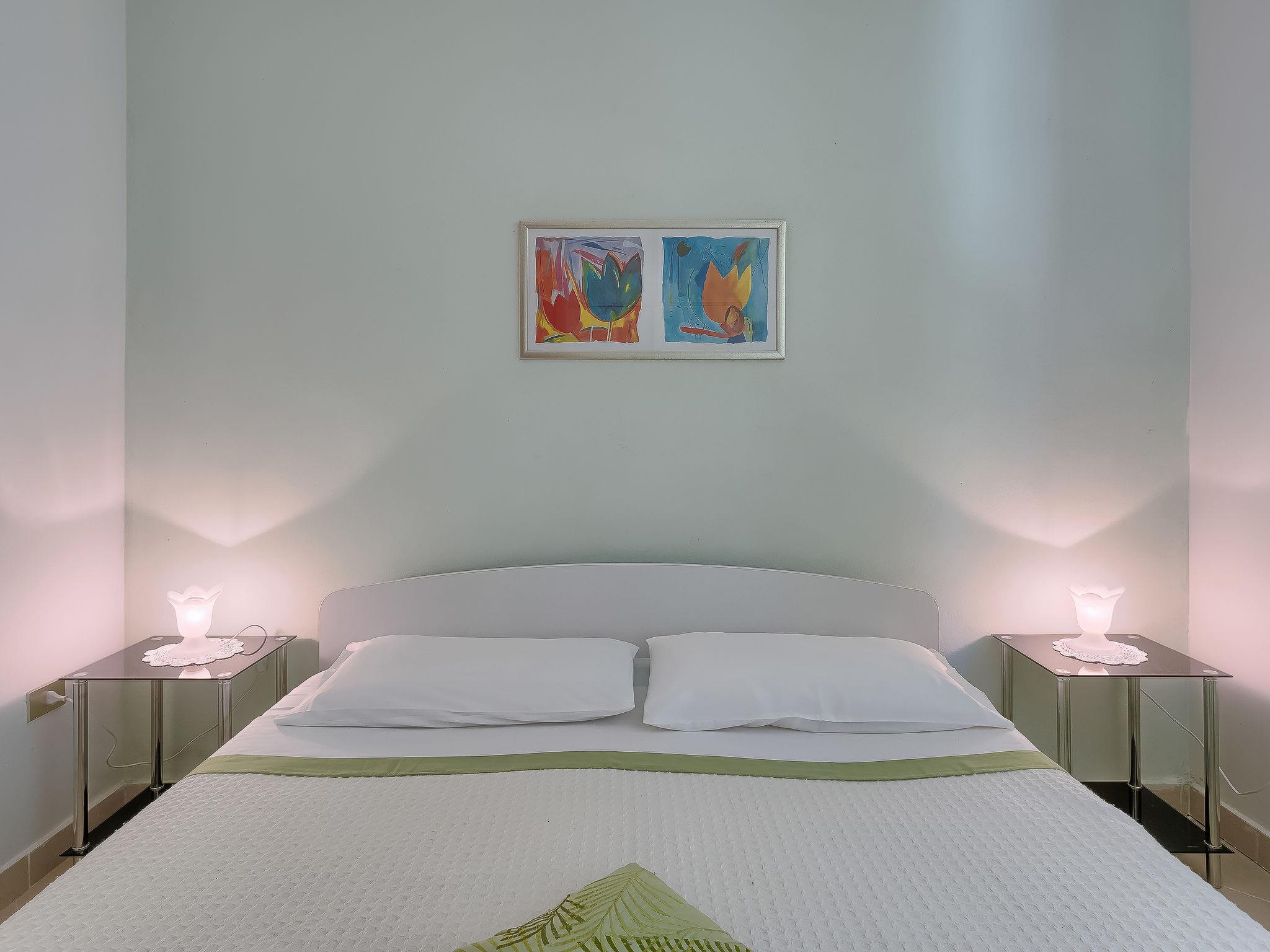 3-room apartment 45 m2, on the ground floor. Living/dining room with satellite TV and air conditioning. Exit to the terrace. 1 room with 1 double bed (2 x 80 cm, length 200 cm). 1 room with 1 bed (80 cm, length 200 cm). Open kitchen (2 hot plates, dishwasher). Shower/WC. Air-conditioning (extra). Large terrace 40 m2. Terrace furniture, barbecue. Facilities: Internet (WiFi, free). 1 small pet/ dog allowed. KLASA:UP/I-335-03/15-01/122