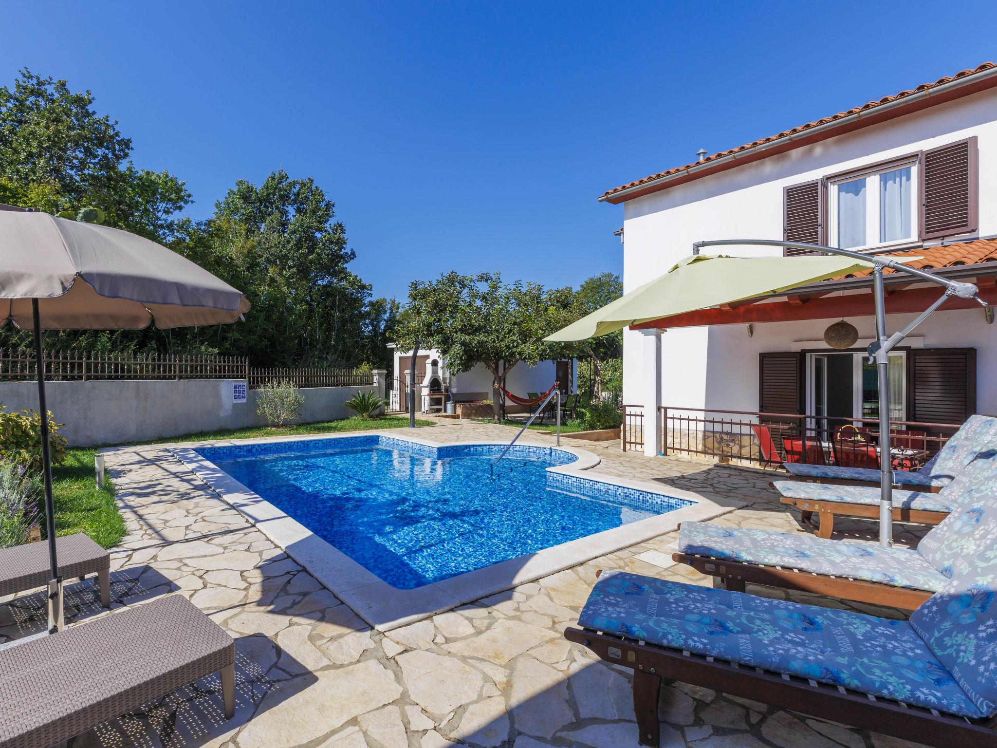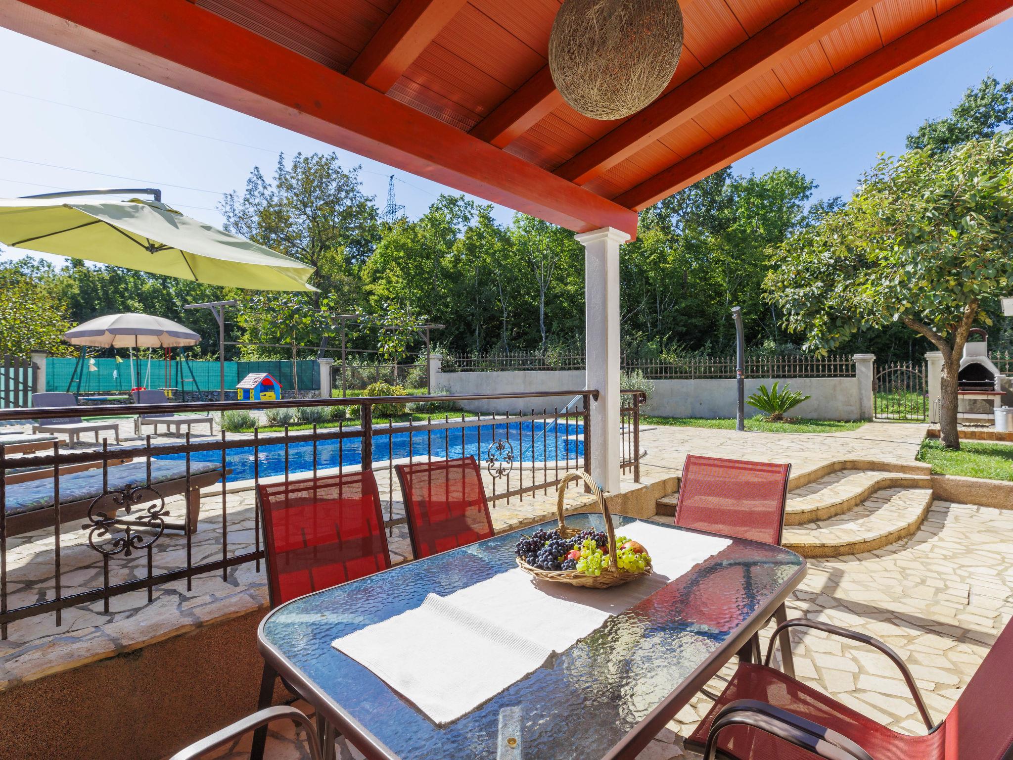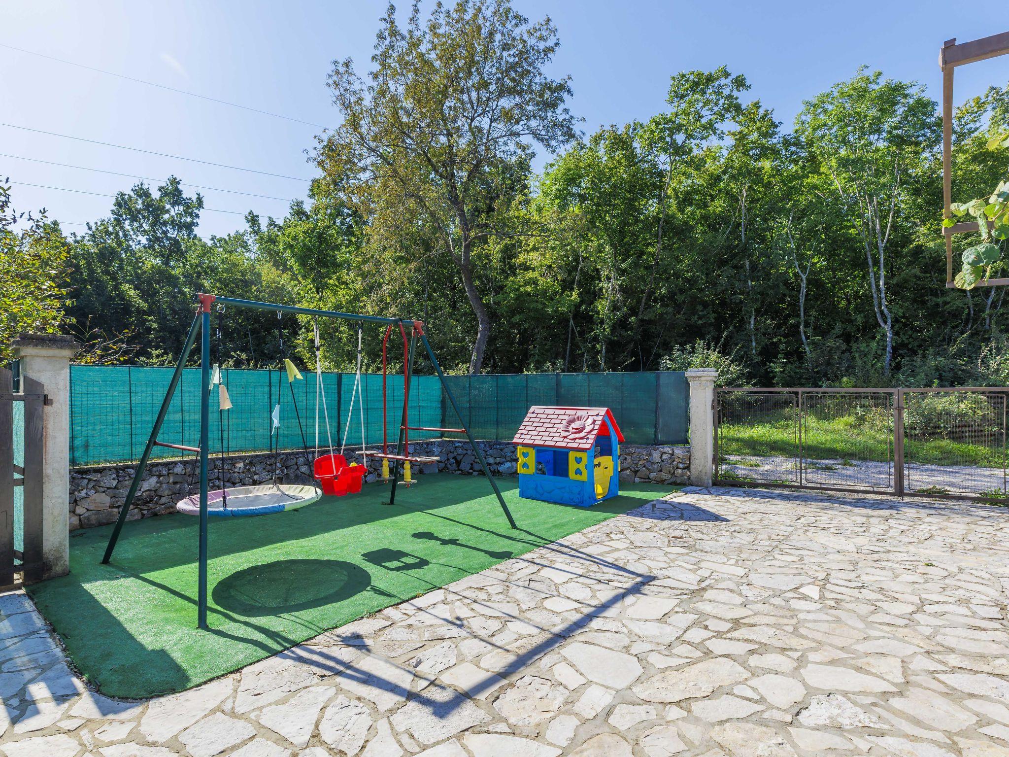 Semi-detached house "Marija", 2 storeys, surrounded by trees. In the hamlet Tomovi 7.5 km from the centre of Labin, in a quiet, sunny position, 13 km from the sea. Private: property 600 m2 (fenced), small garden with lawn, swimming pool angular (7 x 4 m, depth 140 cm, seasonal availability: 18.May. - 12.Oct.) with internal staircase. Outdoor shower, pergola (15 m2), barbecue, children's playground (slide, swing). In the house: internet access, washing machine. Parking at the house on the premises. Shop 1 km, supermarket 7.5 km, restaurant 8 km, bus stop 7.1 km, pebble beach 13 km. Walking paths from the house 200 m, cycle lane 250 m.