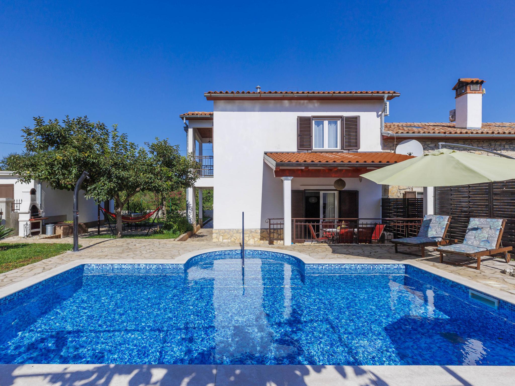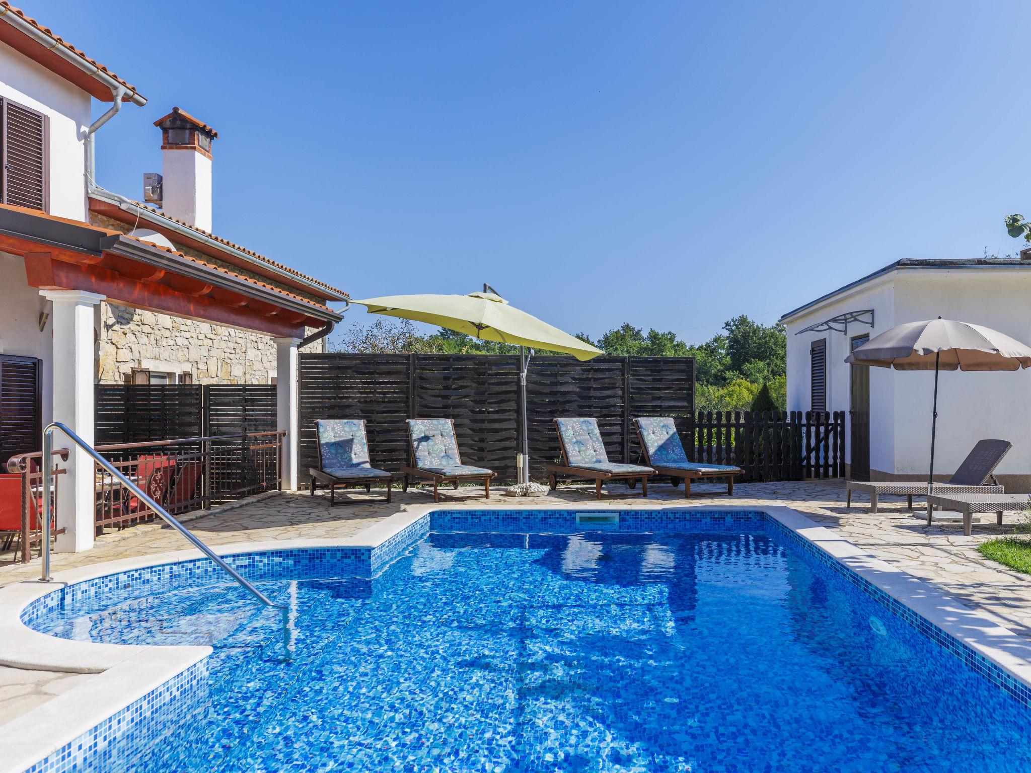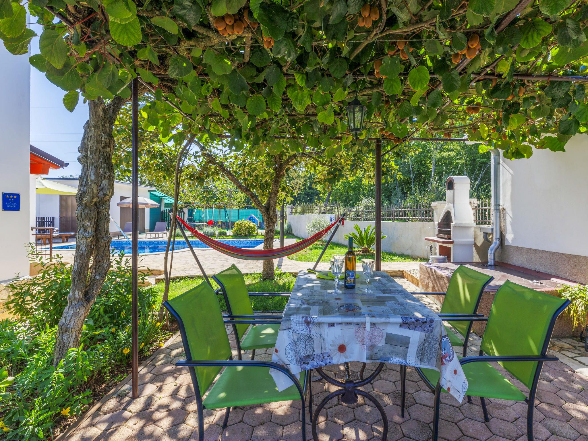 Semi-detached house "Marija", 2 storeys, surrounded by trees. In the hamlet Tomovi 7.5 km from the centre of Labin, in a quiet, sunny position, 13 km from the sea. Private: property 600 m2 (fenced), small garden with lawn, swimming pool angular (7 x 4 m, depth 140 cm, seasonal availability: 18.May. - 12.Oct.) with internal staircase. Outdoor shower, pergola (15 m2), barbecue, children's playground (slide, swing). In the house: internet access, washing machine. Parking at the house on the premises. Shop 1 km, supermarket 7.5 km, restaurant 8 km, bus stop 7.1 km, pebble beach 13 km. Walking paths from the house 200 m, cycle lane 250 m.