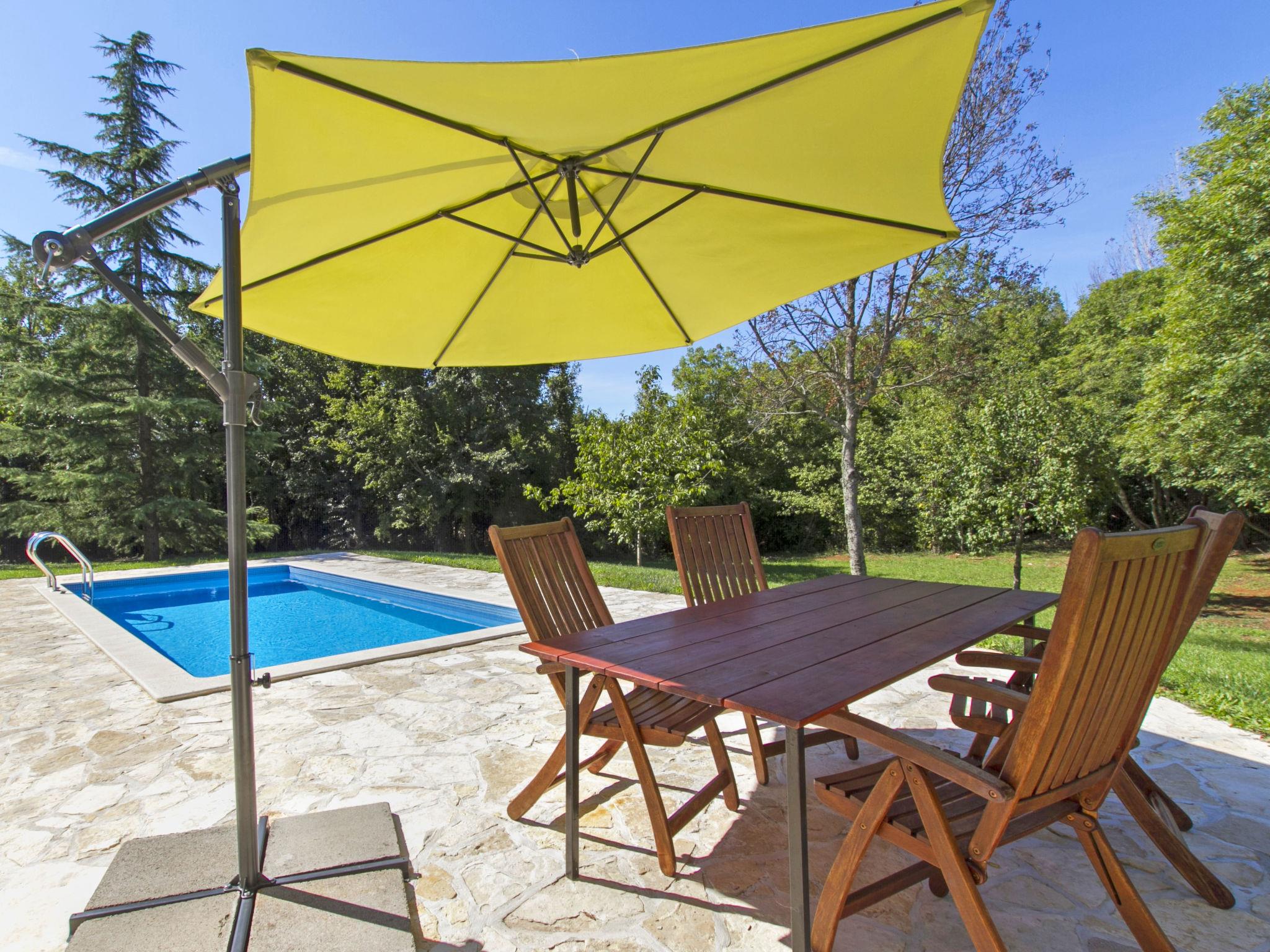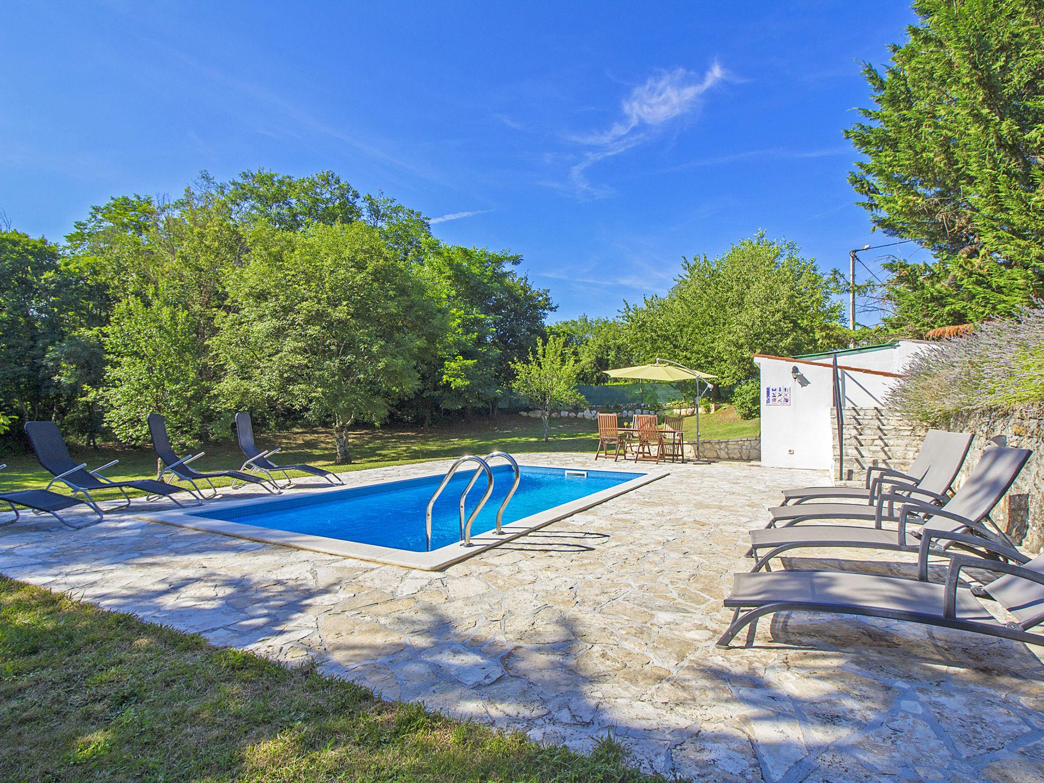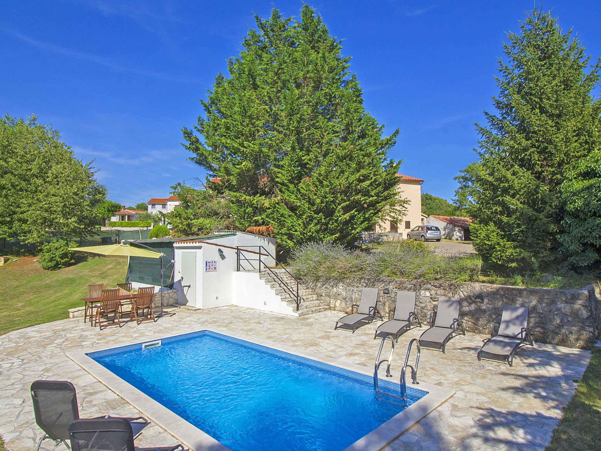 Semi-detached house "Green". In the hamlet Topid 5 km from the centre of Labin, in a quiet, sunny position, 11 km from the sea, in a cul-de-sac, in the countryside. Private: property 2'000 m2, garden with lawn and trees, swimming pool angular (6 x 4 m, depth 140 cm, seasonal availability: 01.Jun. - 21.Sep.). Outdoor shower, barbecue, children's playground (slide, swing). In the house: internet access, trampoline, washing machine. Parking at the house on the premises. Shop 3 km, supermarket 5 km, restaurant 5 km, bus stop 6.2 km, pebble beach 11 km. Tennis 13 km, walking paths from the house 100 m, cycle lane 150 m.