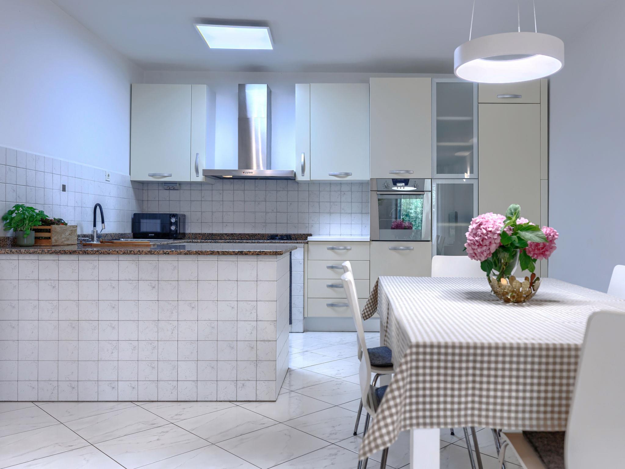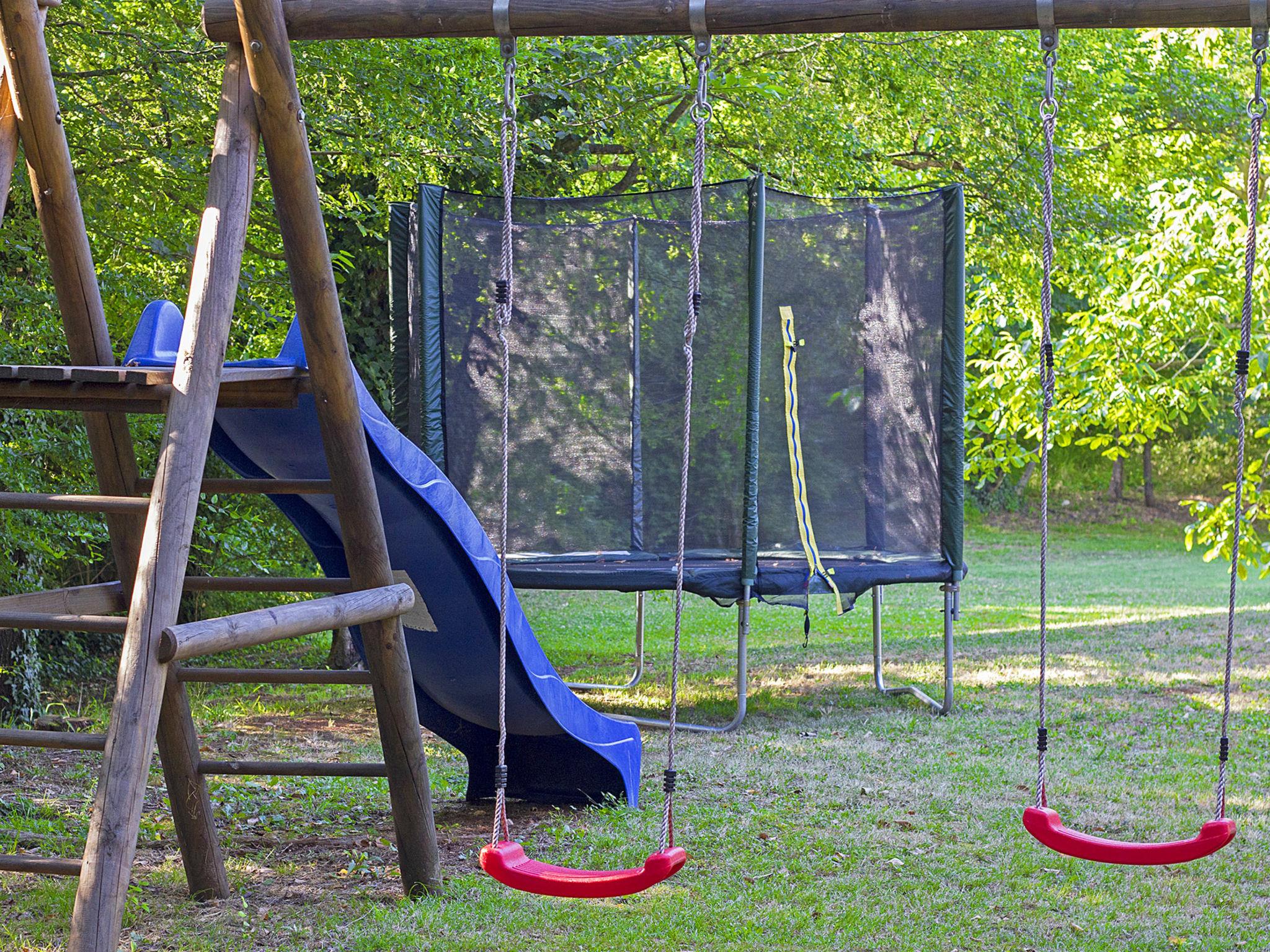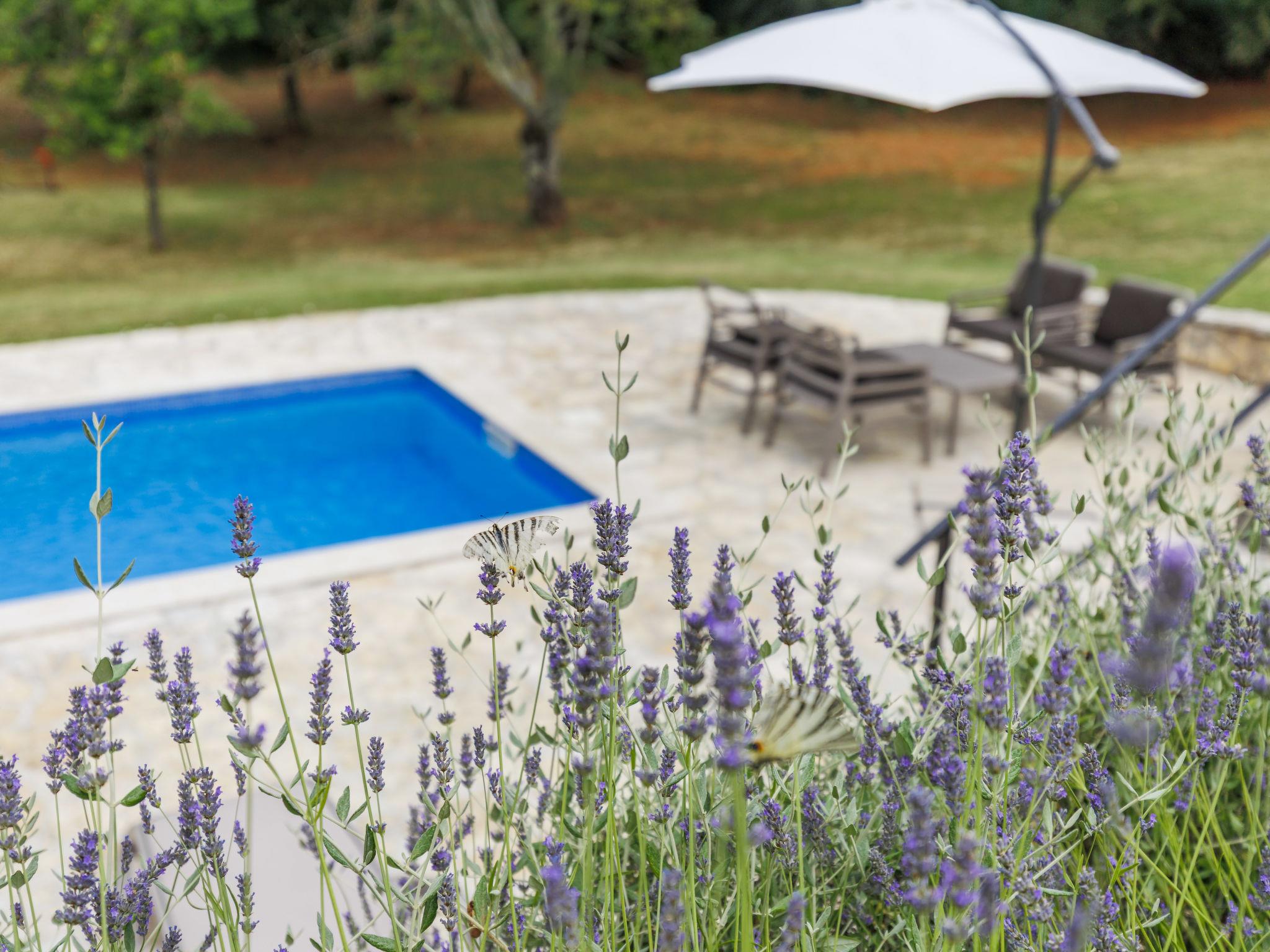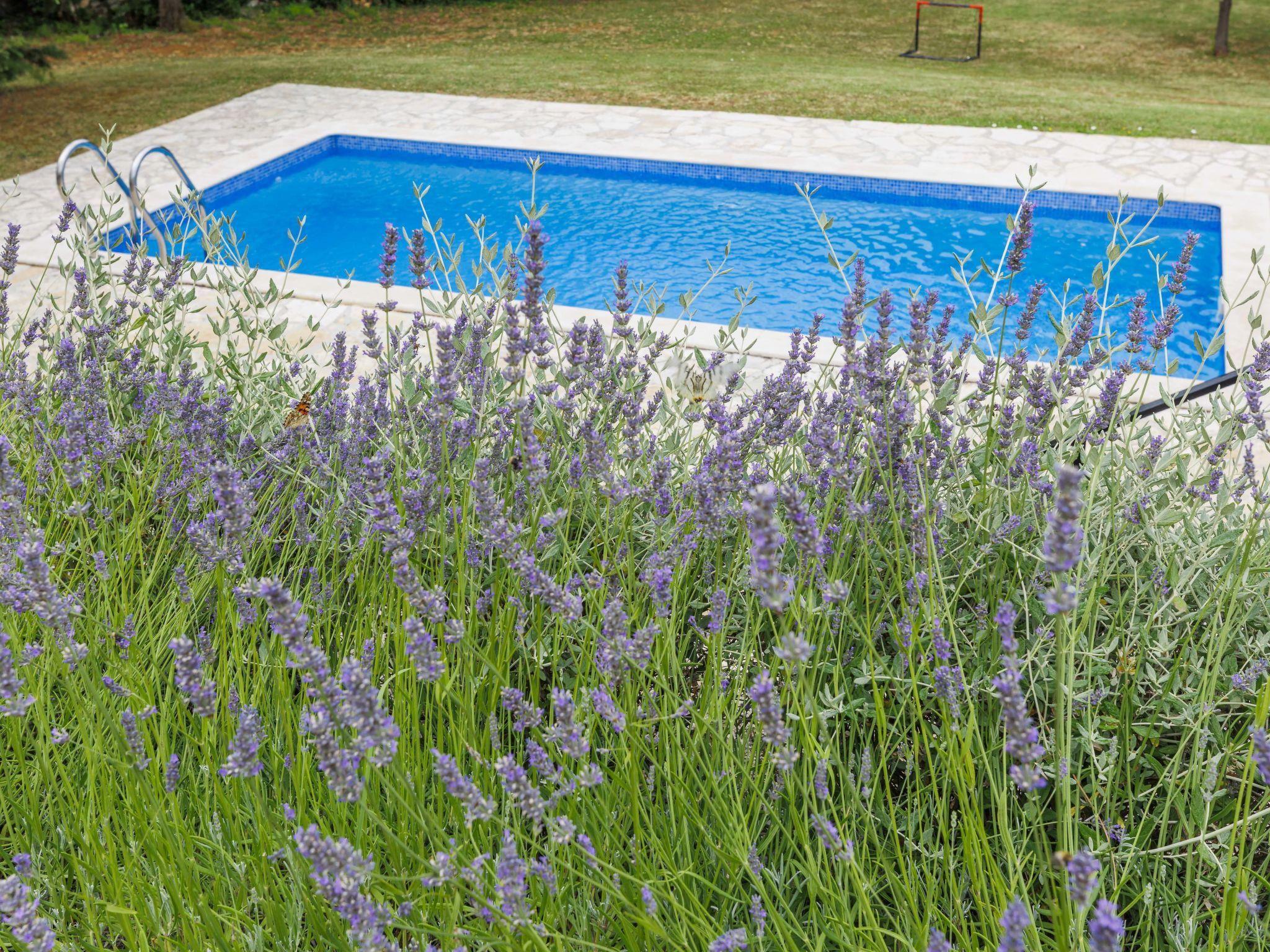 Semi-detached house "Green". In the hamlet Topid 5 km from the centre of Labin, in a quiet, sunny position, 11 km from the sea, in a cul-de-sac, in the countryside. Private: property 2'000 m2, garden with lawn and trees, swimming pool angular (6 x 4 m, depth 140 cm, seasonal availability: 01.Jun. - 21.Sep.). Outdoor shower, barbecue, children's playground (slide, swing). In the house: internet access, trampoline, washing machine. Parking at the house on the premises. Shop 3 km, supermarket 5 km, restaurant 5 km, bus stop 6.2 km, pebble beach 11 km. Tennis 13 km, walking paths from the house 100 m, cycle lane 150 m.