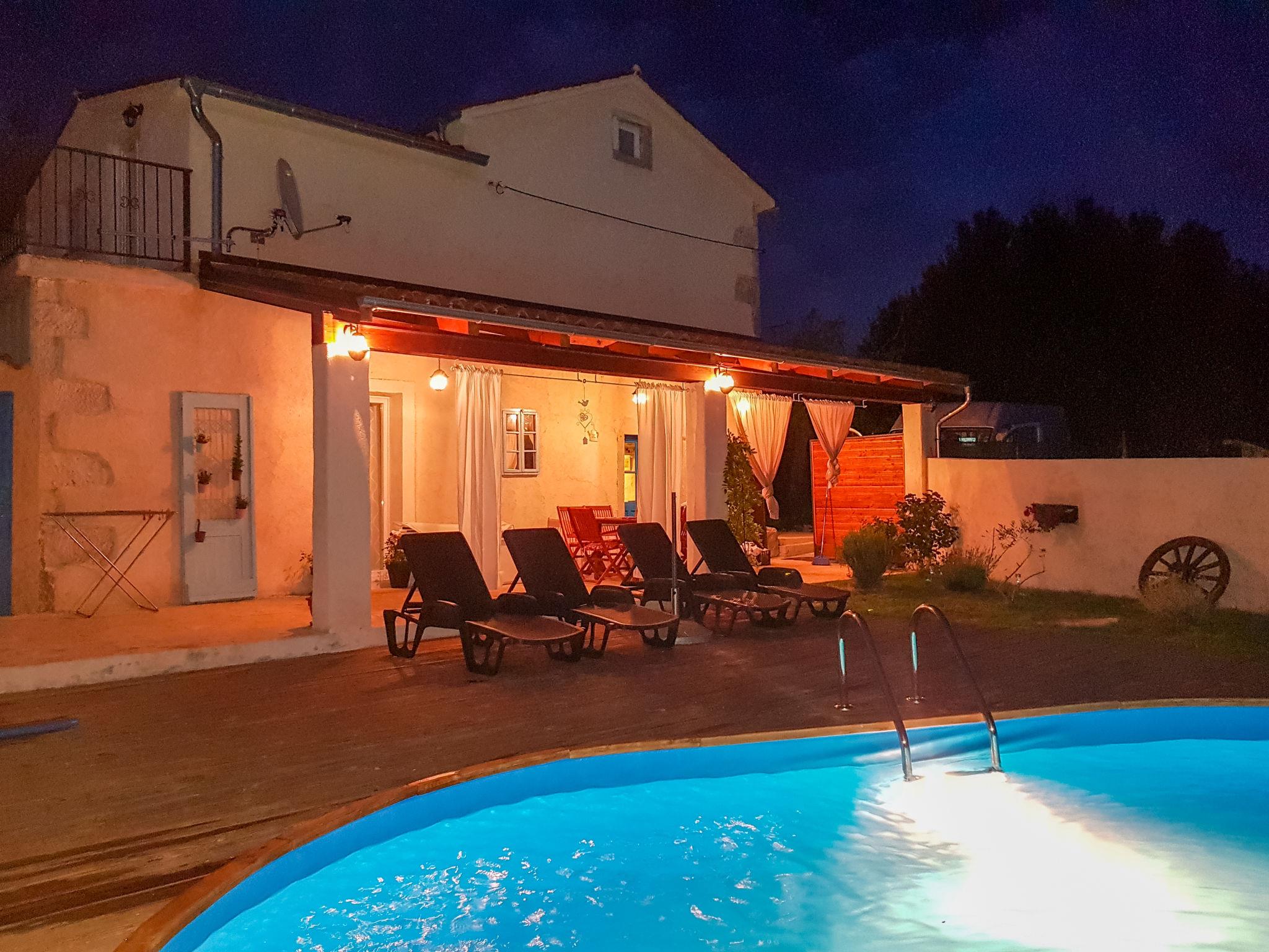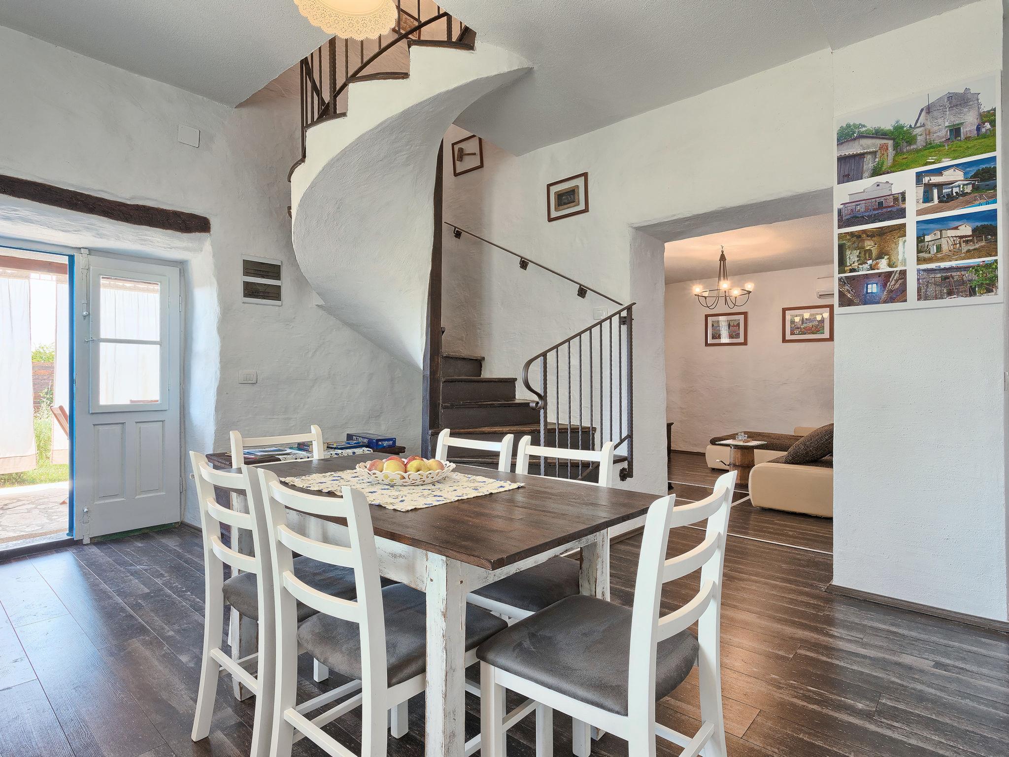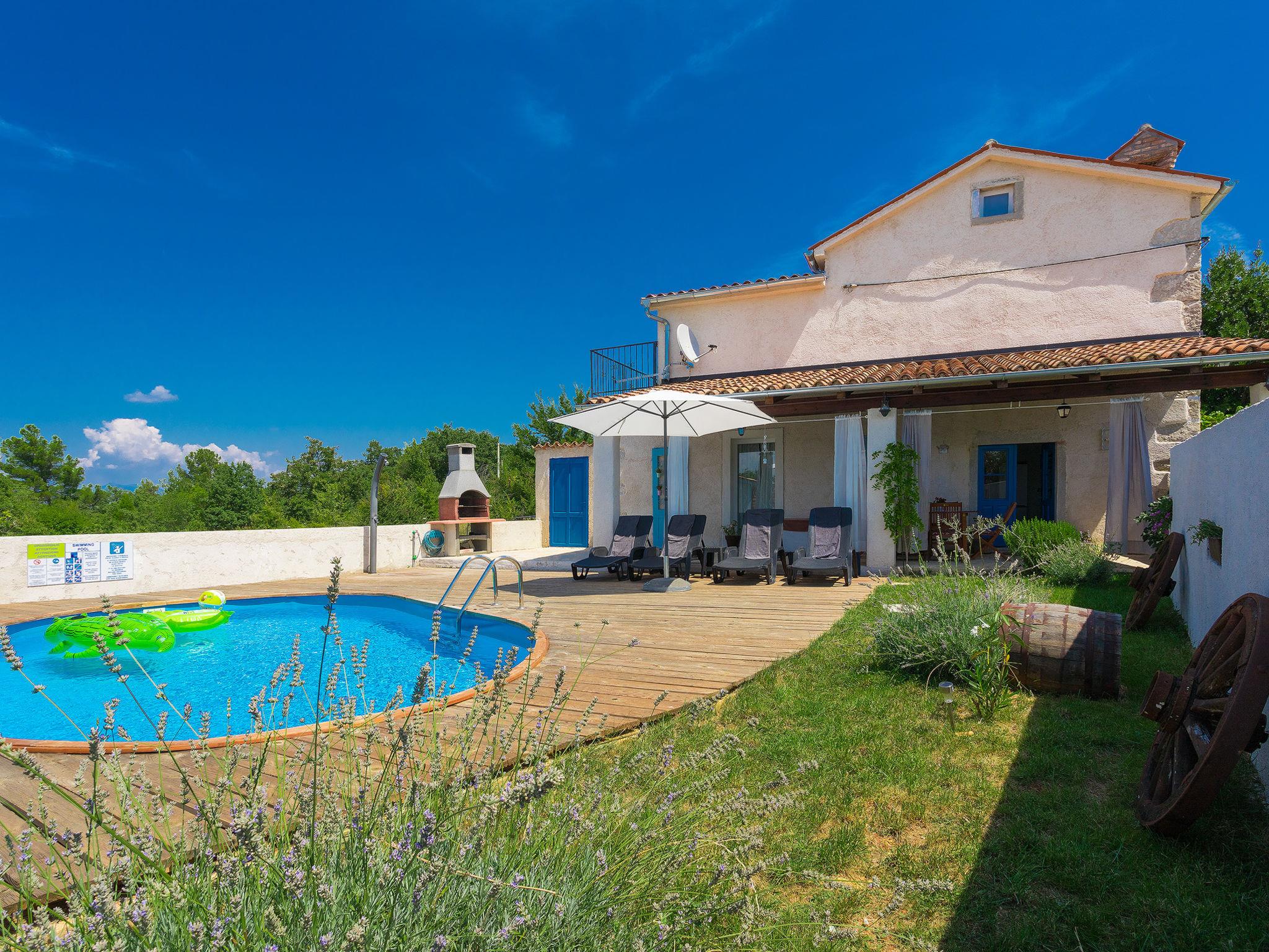 Salakovci 4 km from Labin: Beautiful semi-detached house "Stefanina", 2 storeys, built in 1930, renovated in 2017. In a hamlet with 4 houses, in a quiet, sunny position, 7 km from the sea. Private: property 150 m2 (fenced), small garden with lawn, swimming pool (6 x 4 m, depth 120 cm, seasonal availability: 01.Jun. - 28.Sep.). Outdoor shower, barbecue, children's playground (slide, swing). In the house: internet access, washing machine. Parking (for 2 cars) at the house on the premises. Shop 6 km, restaurant 5 km, bus stop 4.3 km, pebble beach 7 km. Tennis 11 km, walking paths from the house 100 m, cycle lane 150 m.