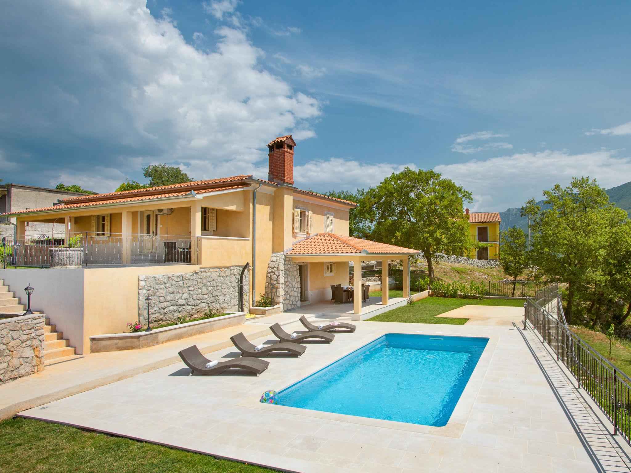 Single-family house "Villa Palachina Antishova", 2 storeys. In the hamlet Stepcici 8 km from the centre of Labin, 12 km from the centre of Rabac, in a sunny, elevated position, 3 km from the sea, 3 km from the beach. Private: property 6'000 m2, garden with lawn and wildlife garden, swimming pool angular (7 x 4 m, depth 140 cm, seasonal availability: 01.May. - 01.Oct.). Outdoor shower, terrace (30 m2), garden furniture, barbecue, children's playground (slide). In the house: internet access, trampoline, washing machine. Parking (for 4 cars) at the house on the premises. Shop 1 km, supermarket 2 km, restaurant 900 m, bus stop 2 km, pebble beach 3 km, rocky beach 3 km. Walking paths from the house 100 m, cycle lane 150 m. Nearby attractions: Nature Park Ucka 30 km. Please note: animals in the neighbourhood. Possibility of trips by house owner's boat (on request, extra).