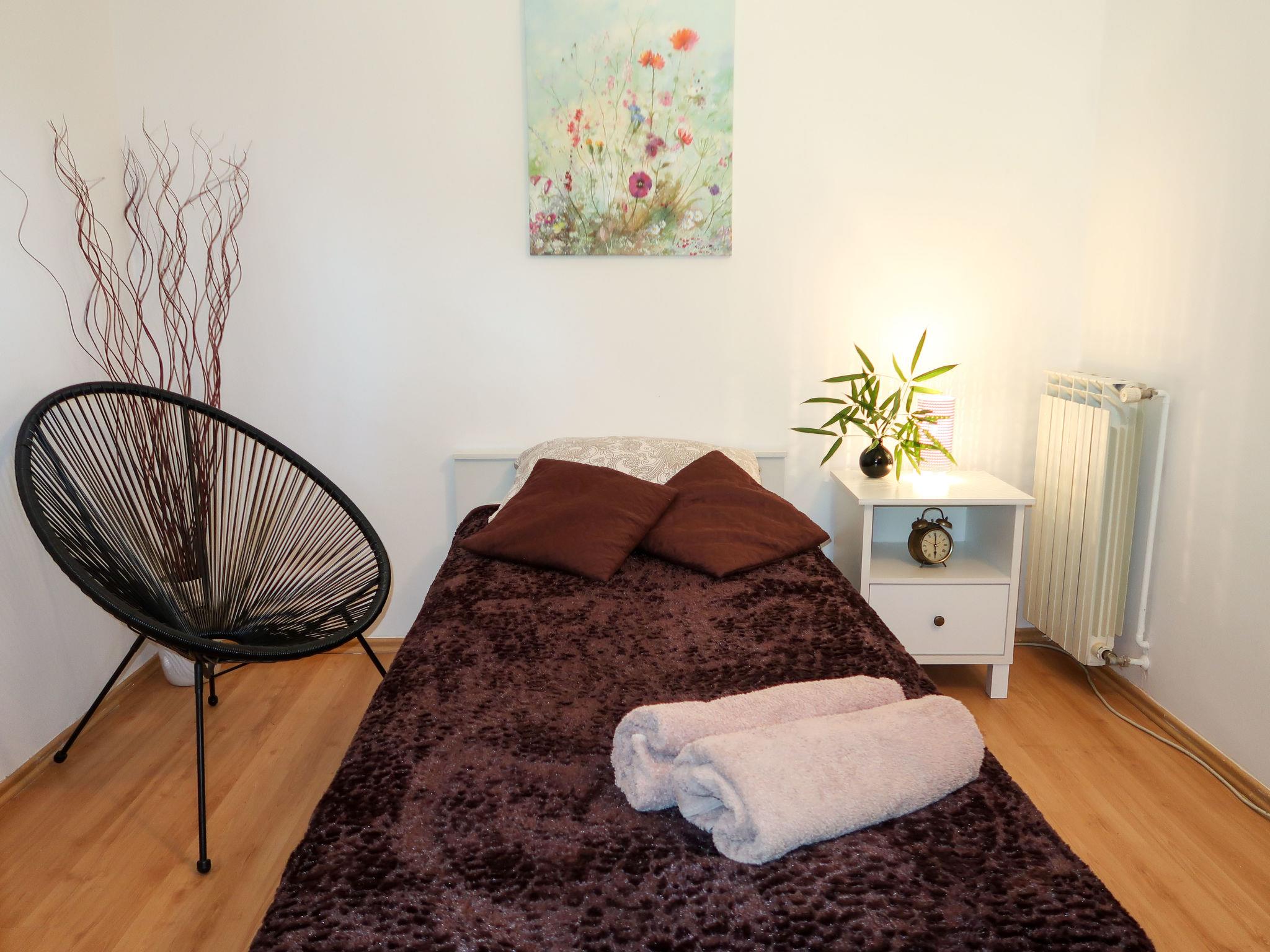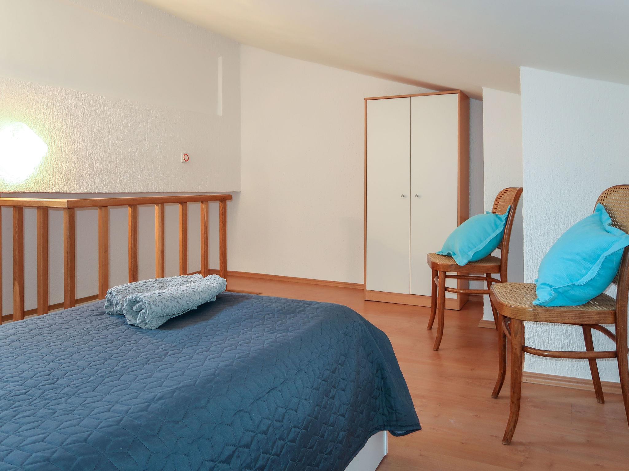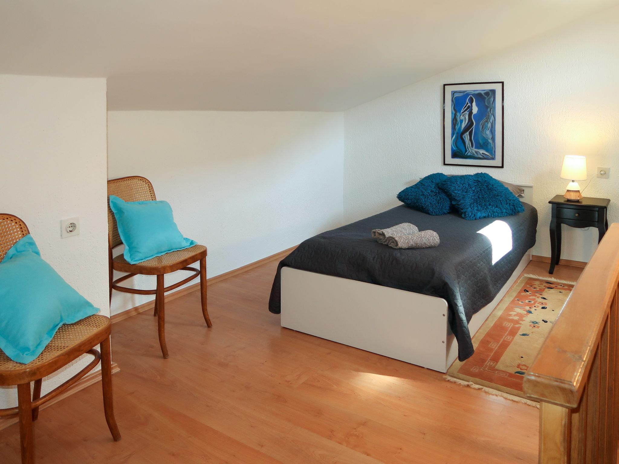 4-room semi-detached house 90 m2 on 2 levels. Living/dining room with satellite TV (flat screen). Exit to the balcony. Entrance hall with air conditioning. 1 room with 1 french bed. Exit to the balcony. 1 room with 1 bed. Open kitchen (2 hot plates, oven, 2 gas rings, toaster, kettle, microwave, freezer, electric coffee machine). Shower/WC, sep. WC. No heating option. Top floor: 1 open room with sloping ceilings with 1 bed. Balcony, terrace roofed. Terrace furniture, barbecue (portable). Facilities: Internet (WiFi, free). Please note: non-smoking house.