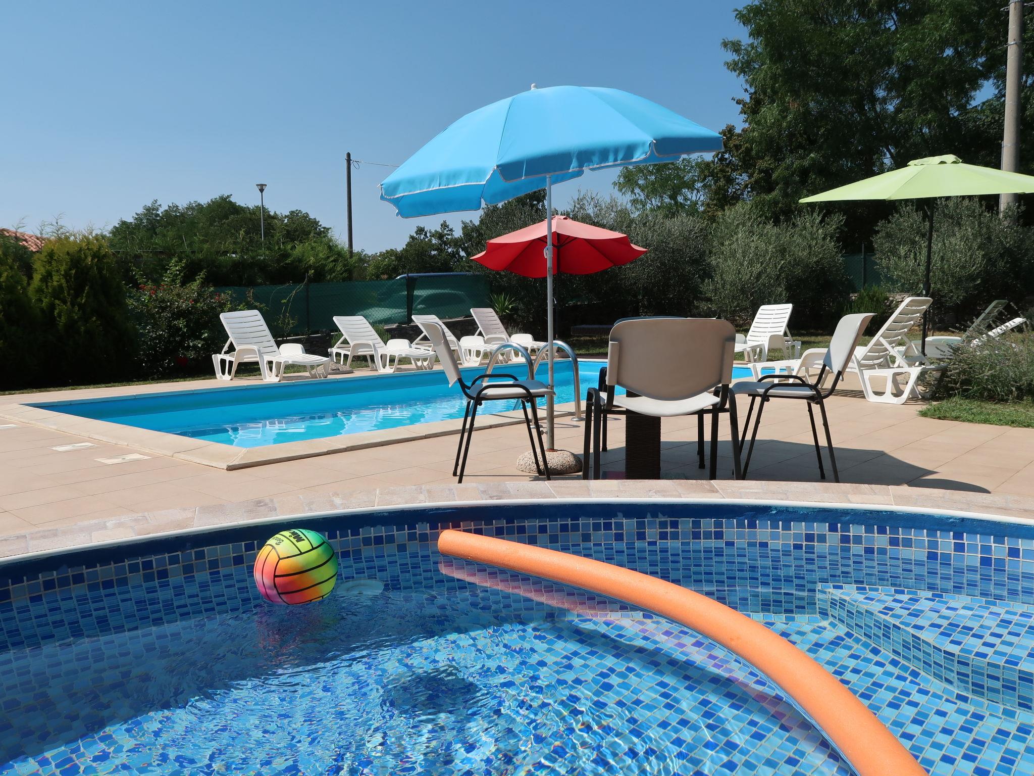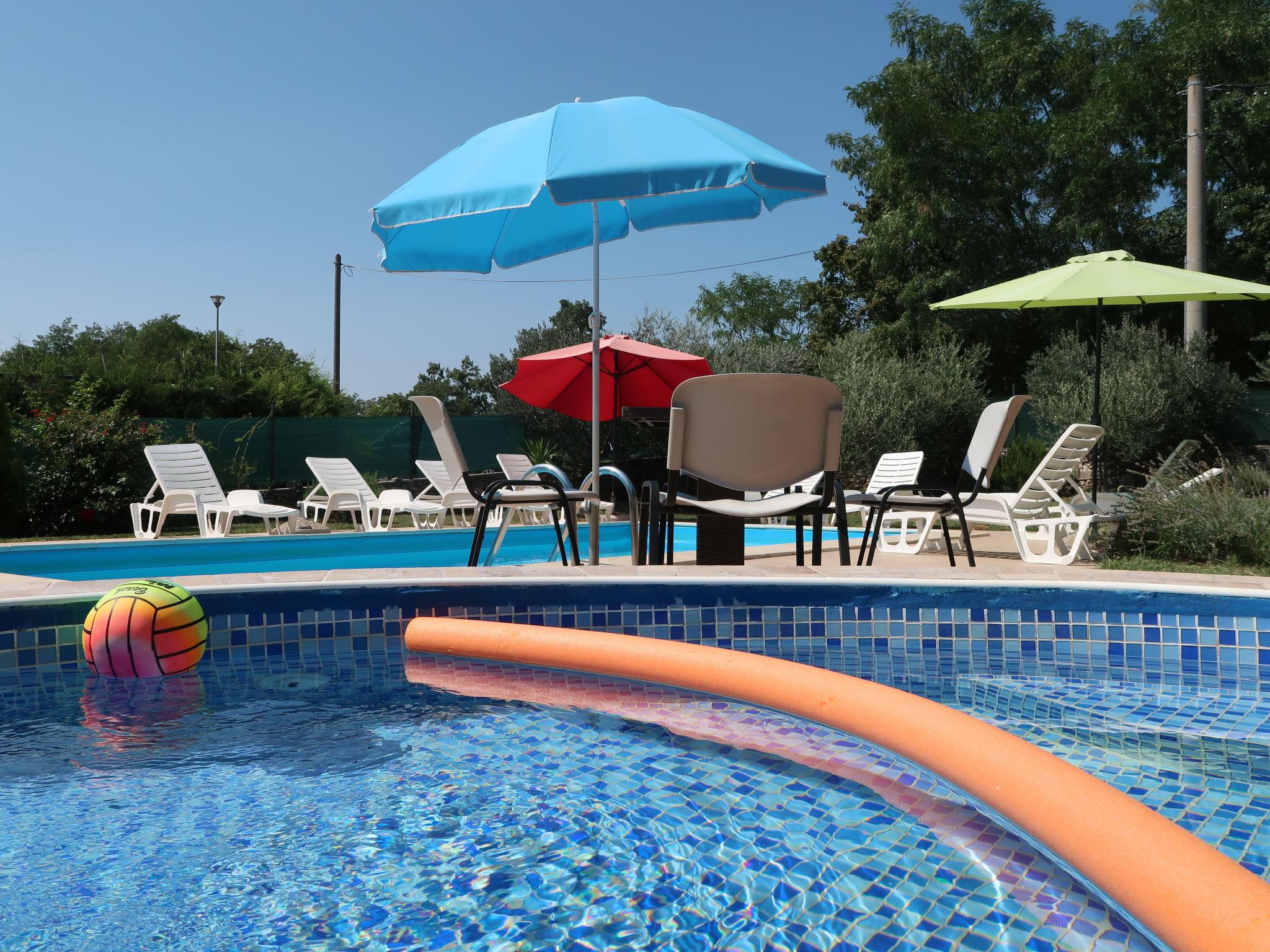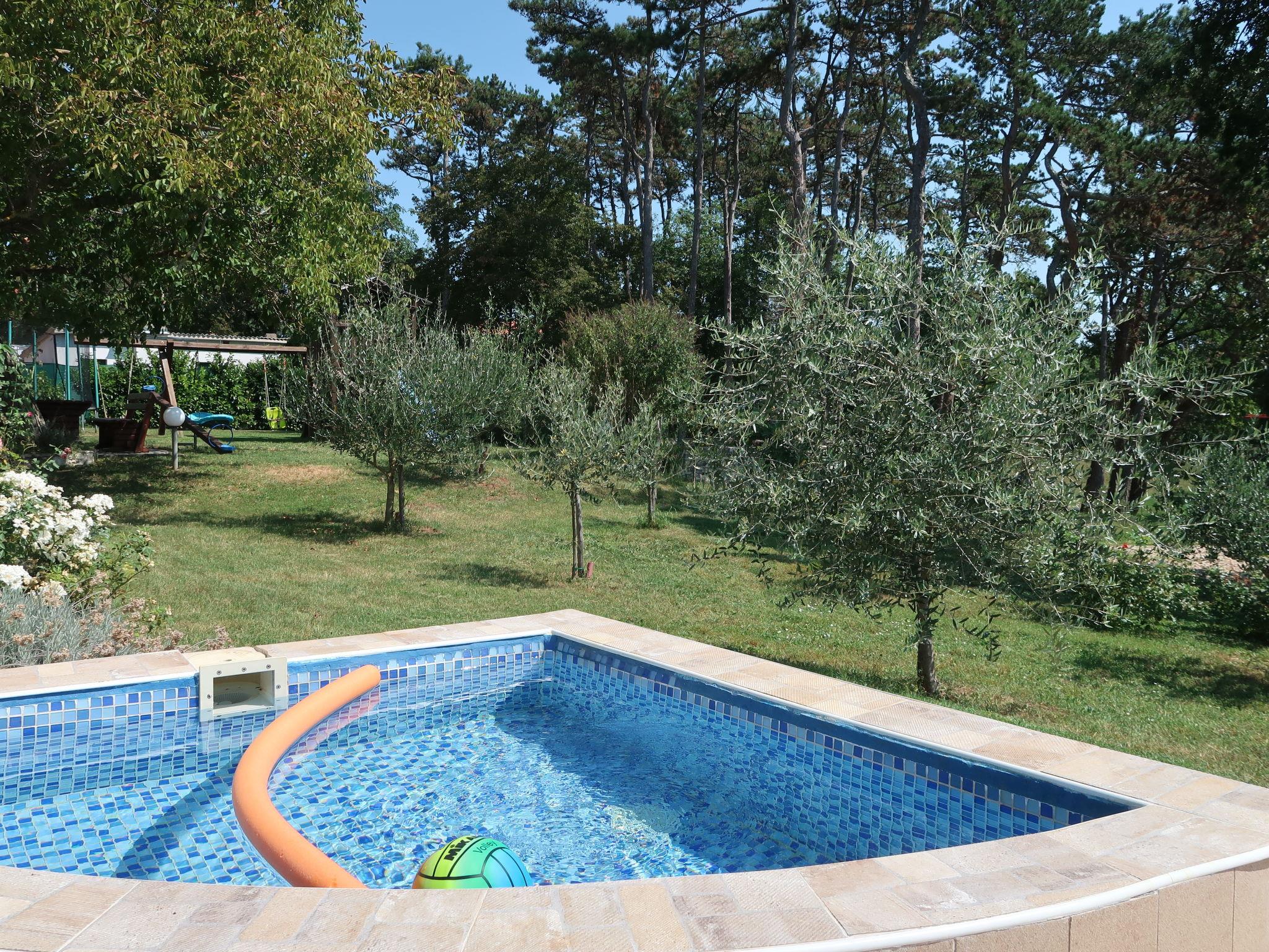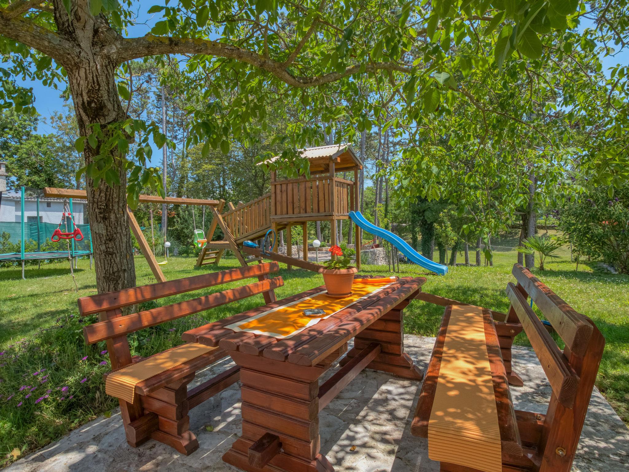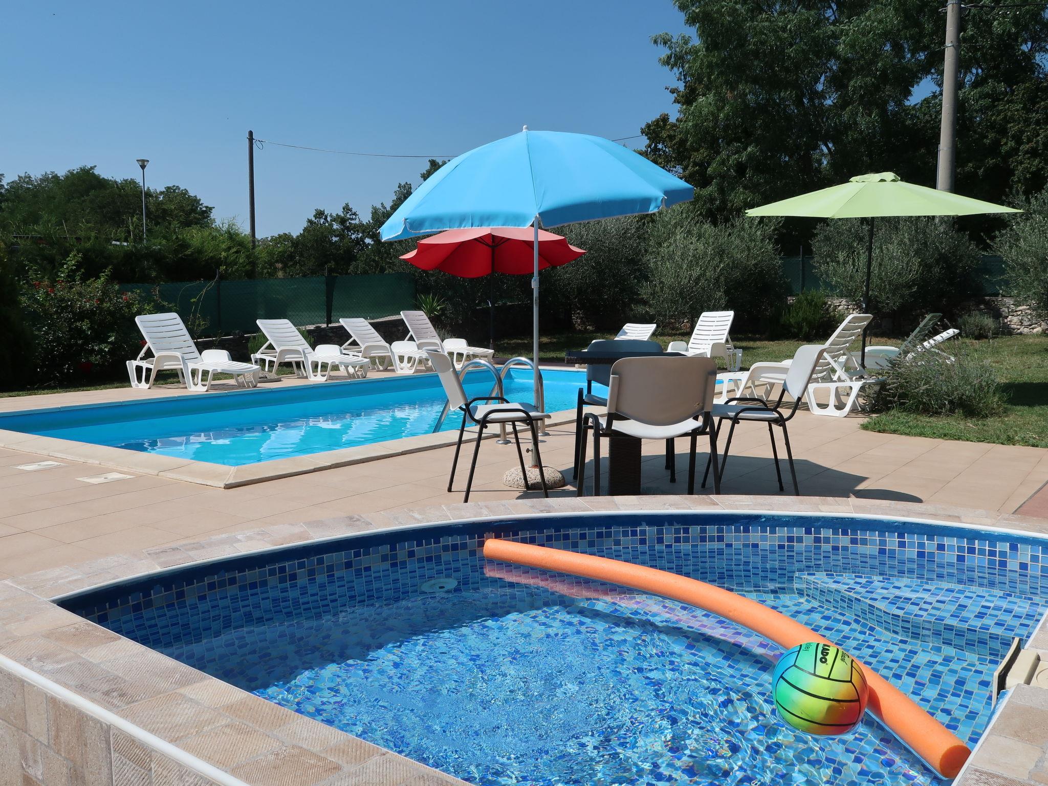 2-family house "Kos", 2 storeys. In the hamlet Šumber 2.5 km from the centre of Nedešcina, 7 km from the centre of Labin, 9 km from the centre of Rabac, 9 km from the sea. Private: property 3'000 m2 with trees, meadow, swimming pool angular (8 x 4 m, depth 135 cm, seasonal availability: 02.May. - 17.Oct.). WC in the pool area, outdoor shower, table tennis, badminton, patio, terrace, garden furniture, barbecue, children's playground (slide, swing). In the house: internet access, table football, trampoline, washing machine (extra). Parking on the premises. Shop 2.5 km, supermarket 7 km, restaurant 2.5 km, bus stop 7.2 km, pebble beach 9 km, rocky beach 9 km. Marina 9 km. Youth groups are not allowed. Private:outdoor kitchen (4 hot plates, dishwasher, oven, freezer).