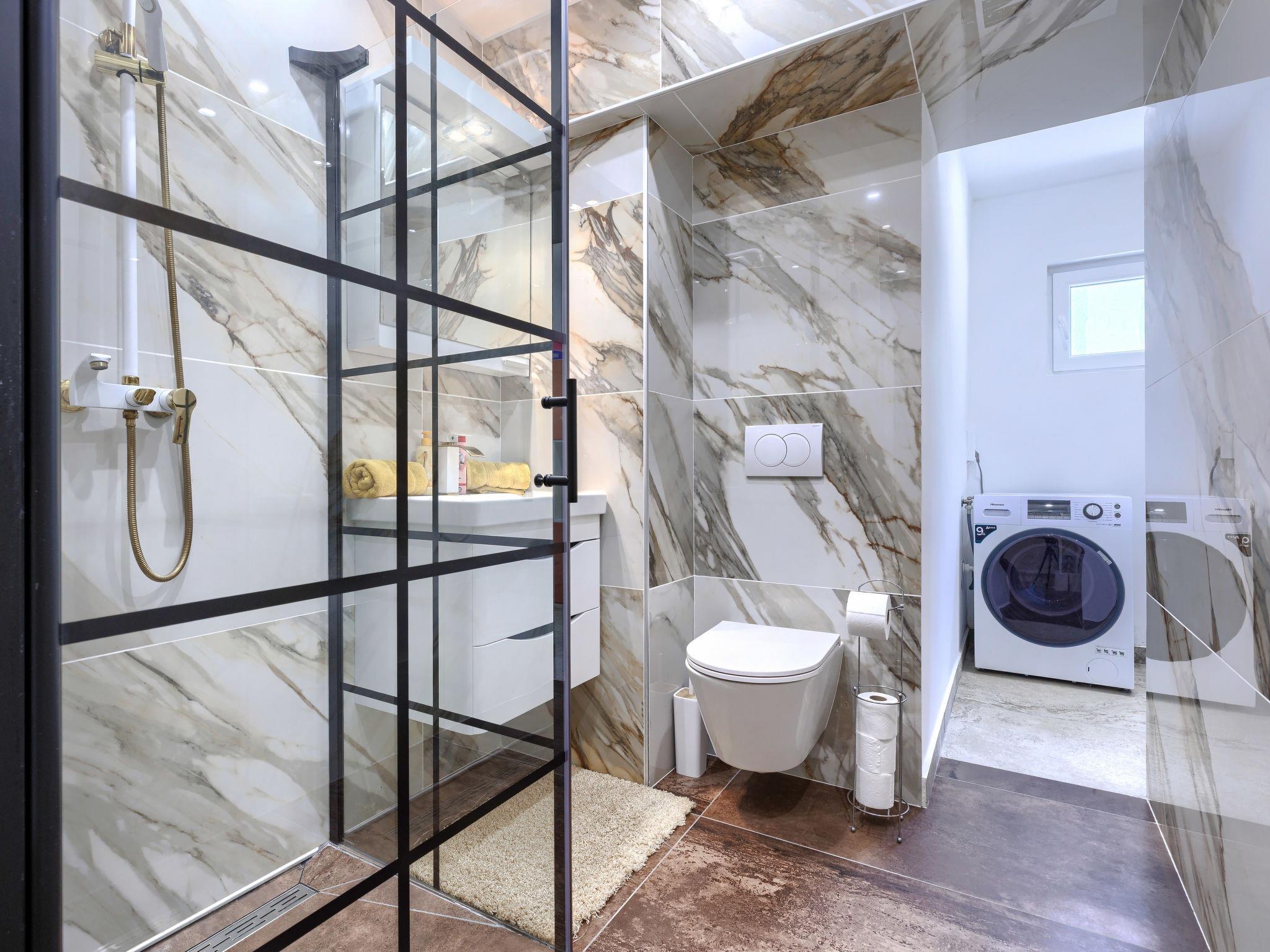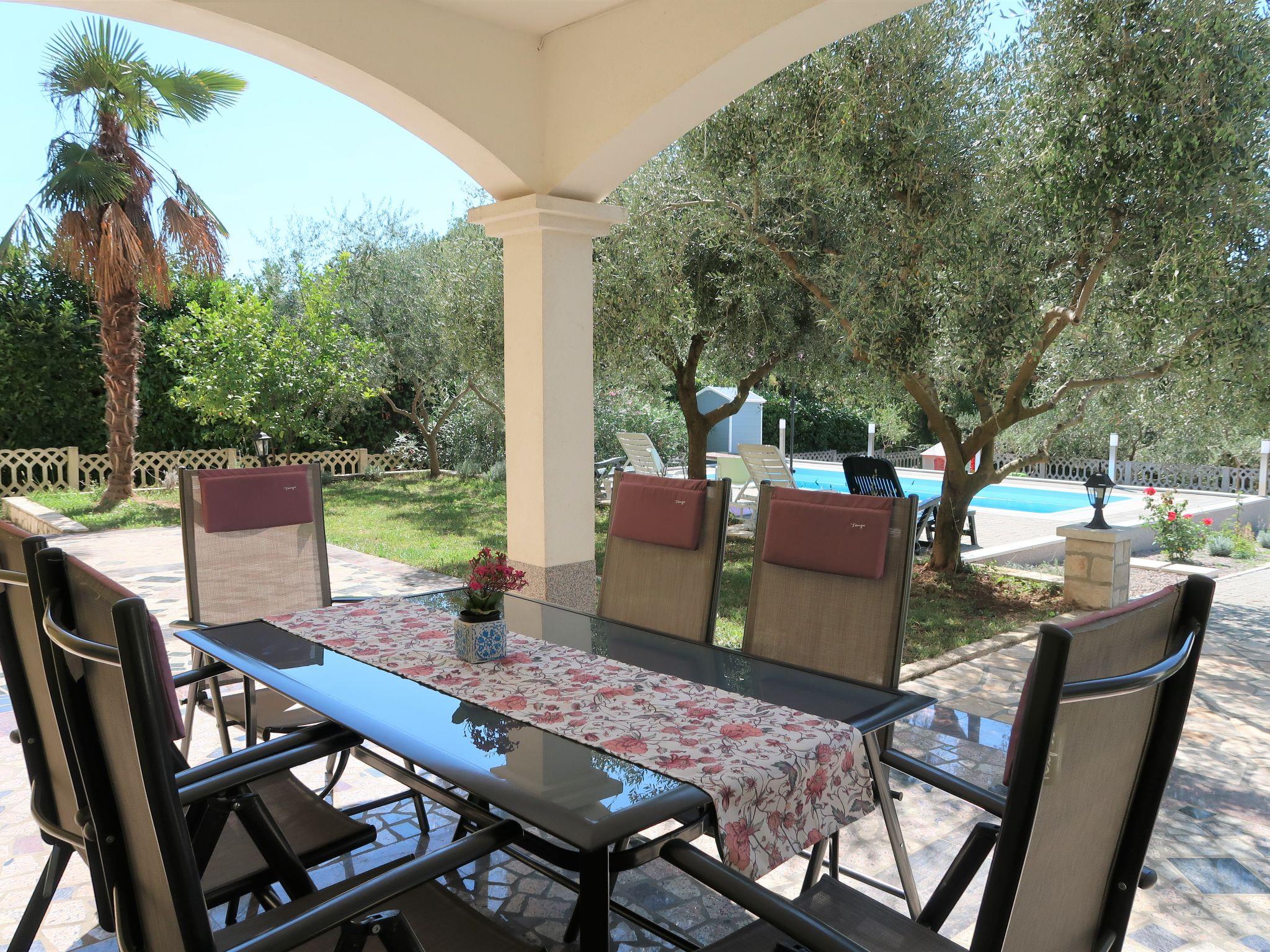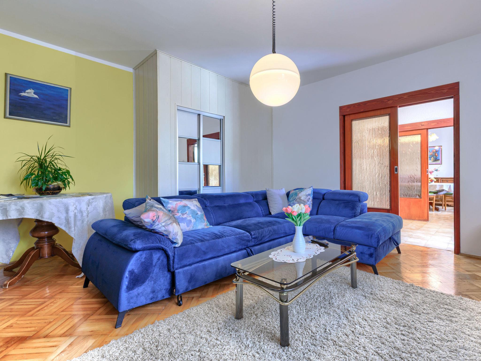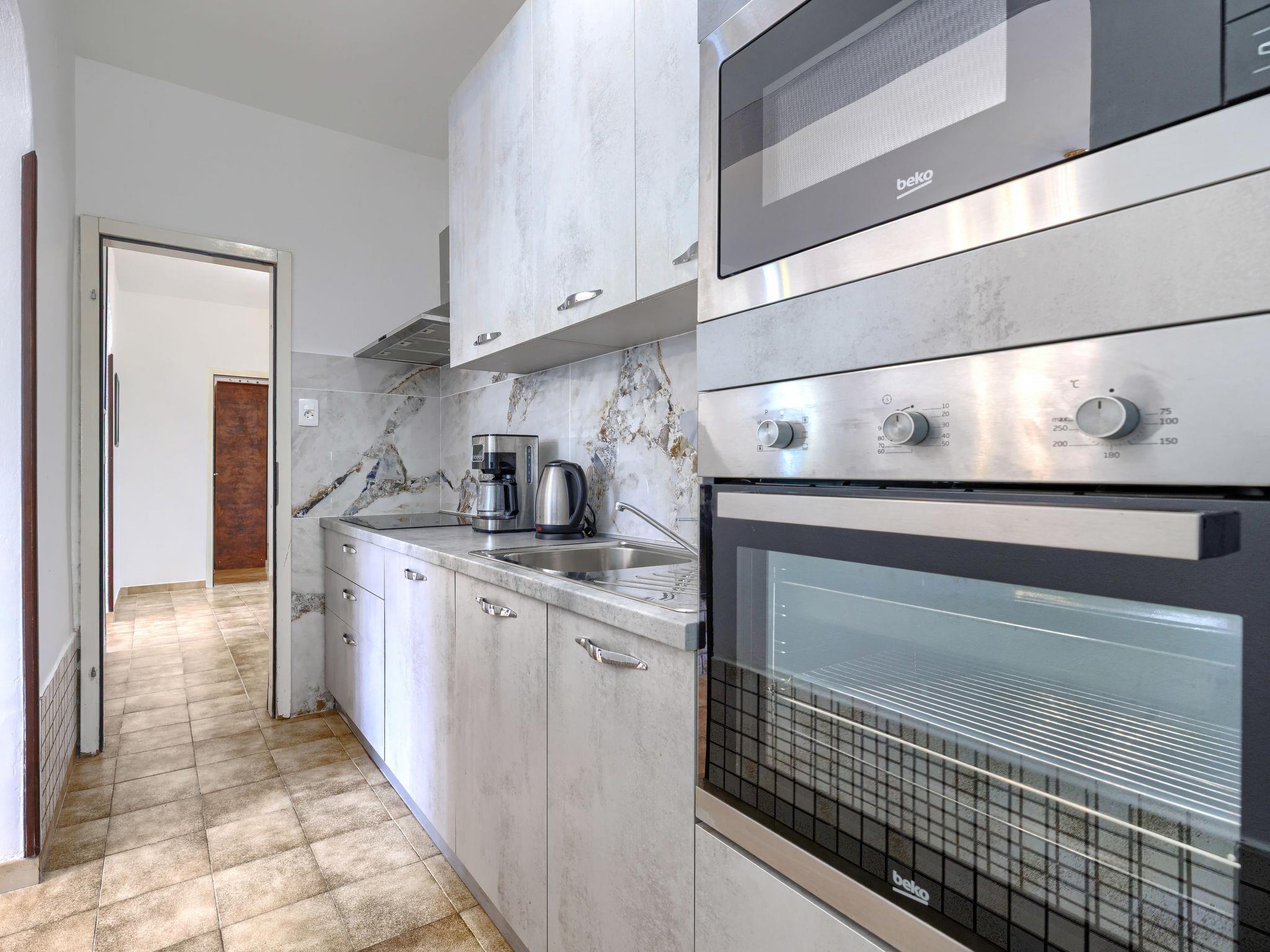 3-room apartment 85 m2, on the ground floor. Living room with open-hearth fireplace (only for decoration), satellite TV, DVD and air conditioning. Exit to the terrace. 1 room with 1 double bed (2 x 90 cm, length 200 cm). 1 room with 1 double bed (2 x 80 cm, length 200 cm). Dining room. Open kitchen (oven, dishwasher, 4 ceramic glass hob hotplates, toaster, kettle, freezer, electric coffee machine). 2 showers/WC. No heating option. Terrace 40 m2 partly roofed. Terrace furniture, deck chairs (2). Facilities: washing machine, iron. Internet (WiFi, free). Please note: non-smoking house.