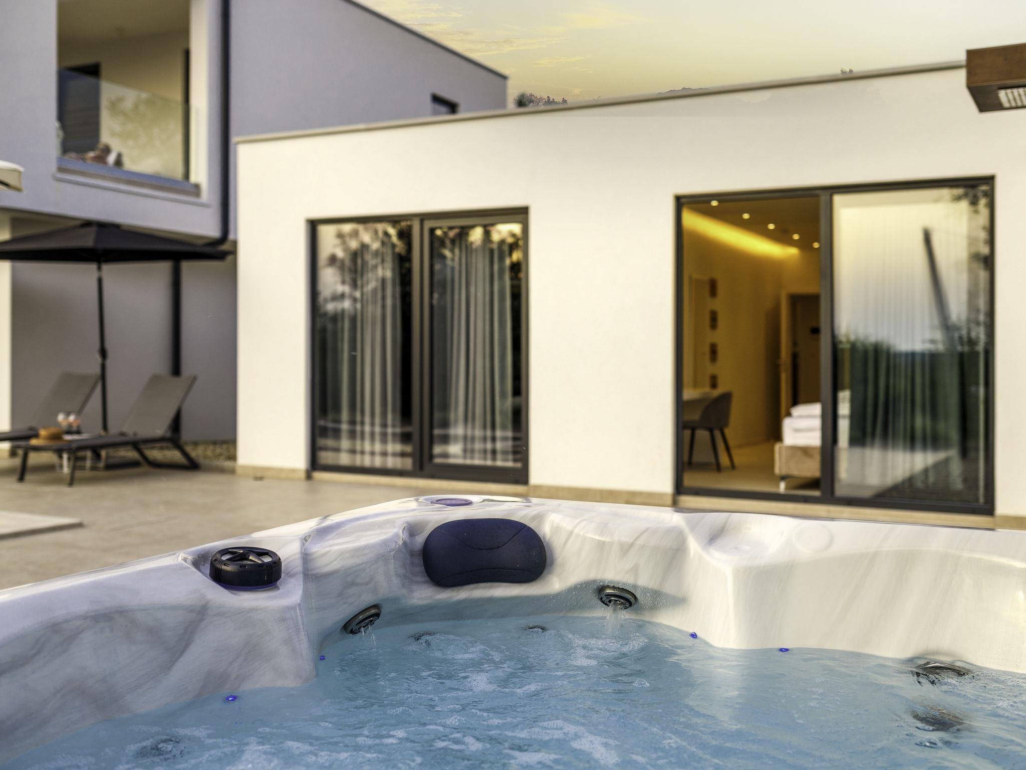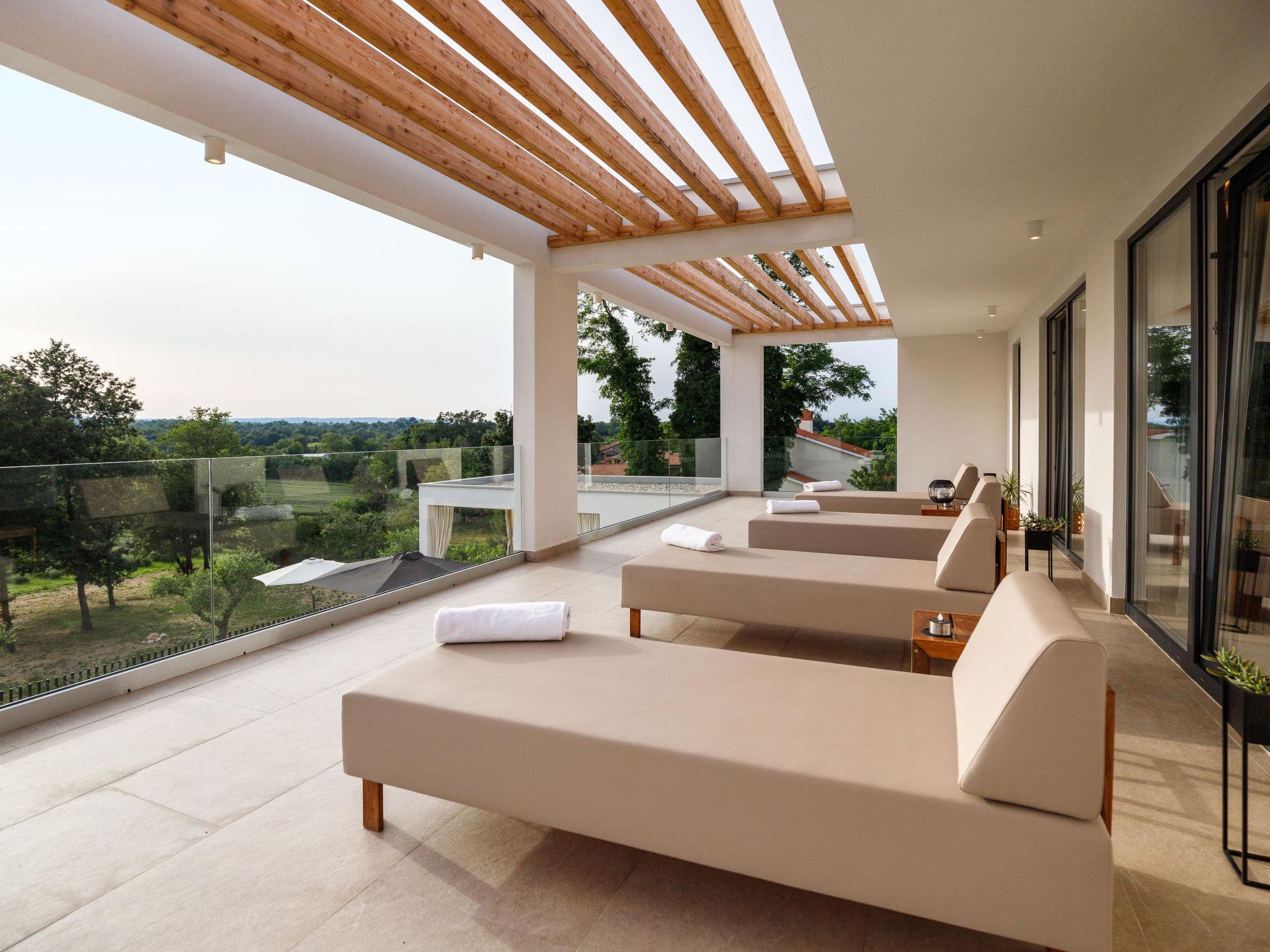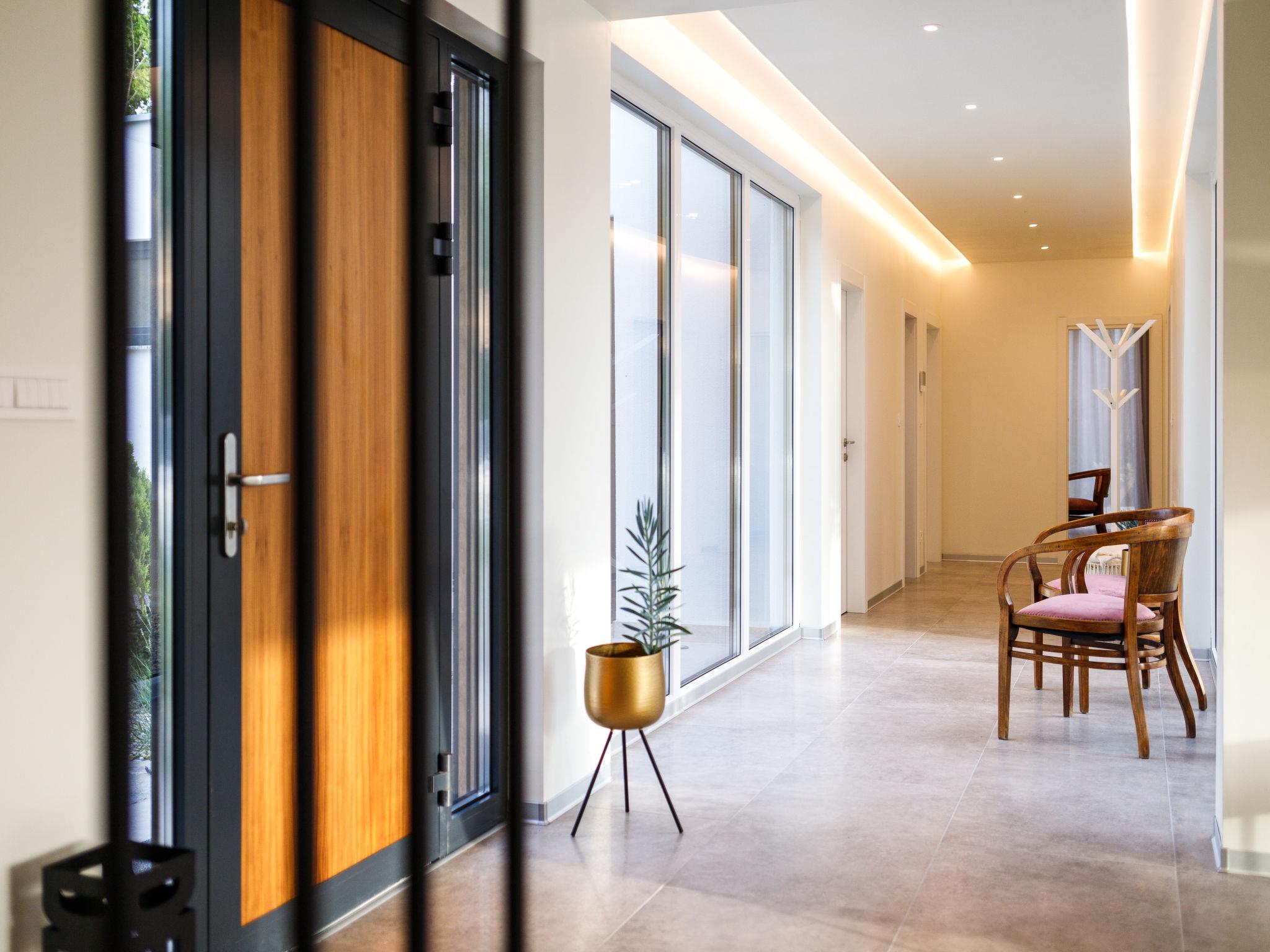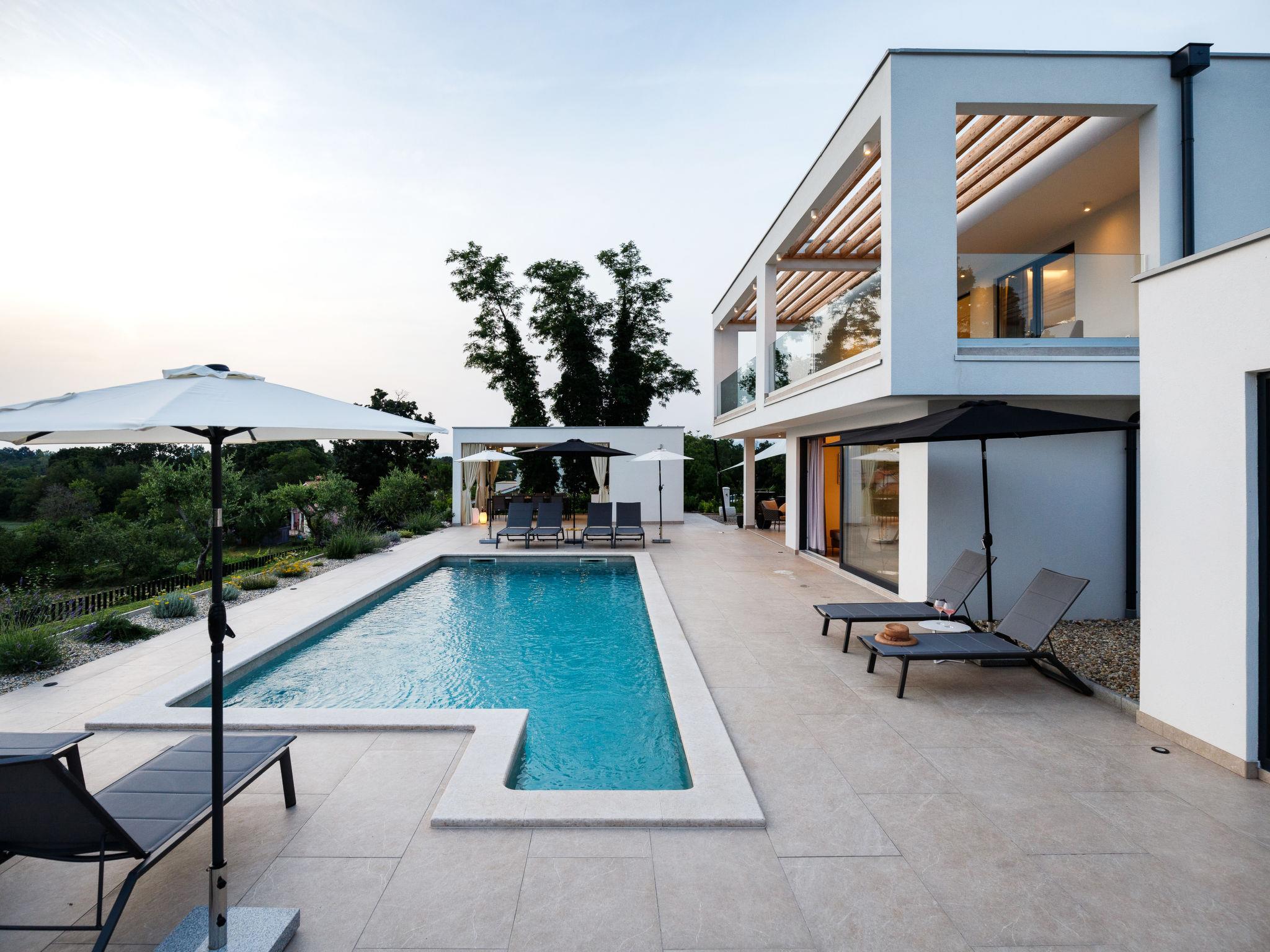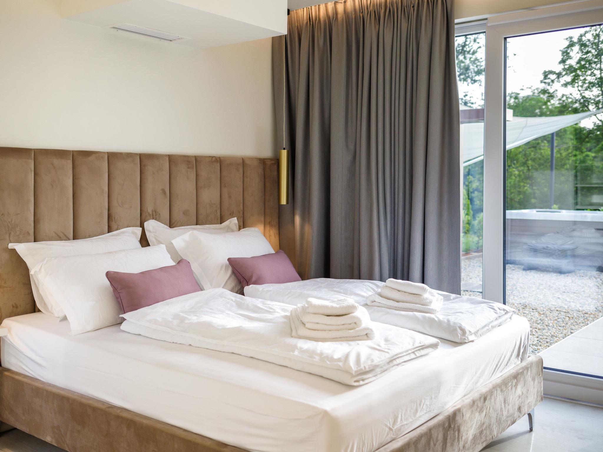 Very beautiful, luxurious house "Villa Sonia", 2 storeys, surrounded by trees and fields. In the hamlet Tomažici 4 km from the centre of Labin, in a quiet, sunny position, 10 km from the sea. Private: property 1'600 m2 (fenced) with wildlife garden and trees, swimming pool angular, heated (4 x 10 m, 45 m2, depth 135 cm, seasonal availability: 01.Apr. - 30.Sep.) with internal staircase and salt-electrolysis pool-cleaning system. WC in the pool area, outdoor shower, hot tub, terrace (40 m2), garden furniture, barbecue, children's playground, pool maintenance by the owner/gardener. In the house: internet access, sauna (all included), central heating system, air conditioning, washing machine, tumble dryer. Parking (for 4 cars) at the house on the premises. Shop 2 km, supermarket 2 km, restaurant 2 km, bus stop 2.2 km, pebble beach 10 km. Please note: airfield 45 km from the property. By groups of young people double deposit is requested on arrival. Swimming pool heated (extra). It is necessary to announce 7 days in advance if the pool heating is required. Video surveillance of the driveway and parking.