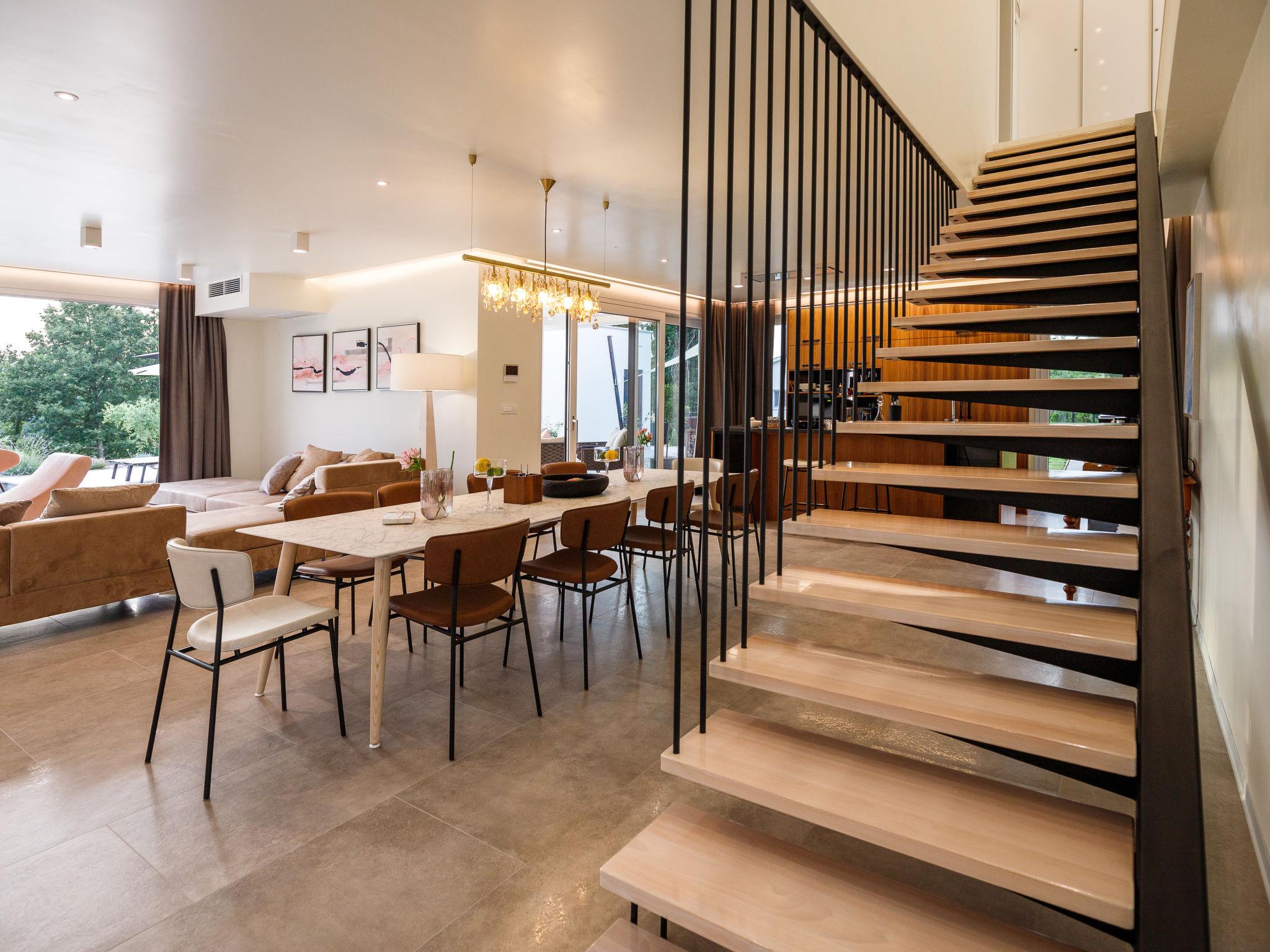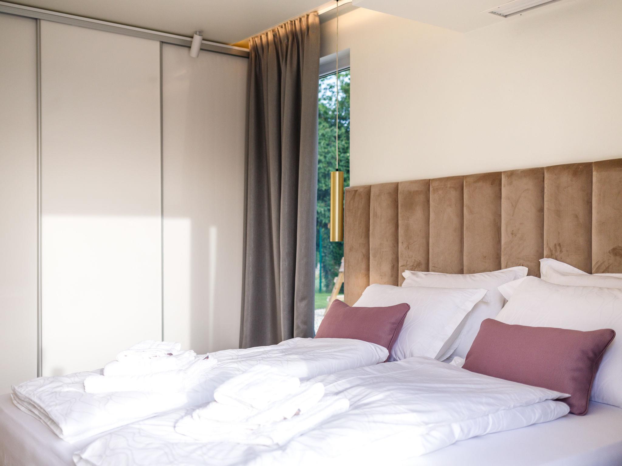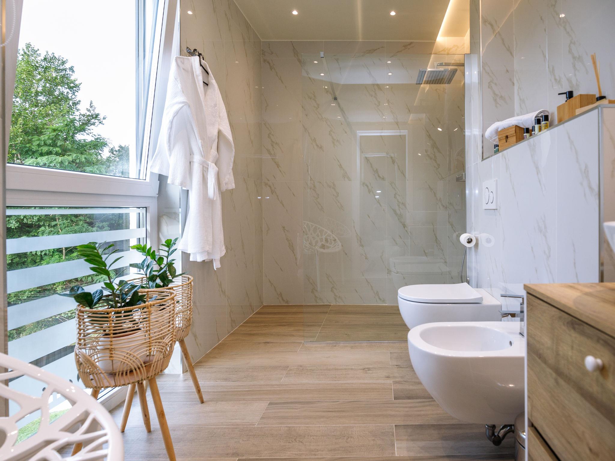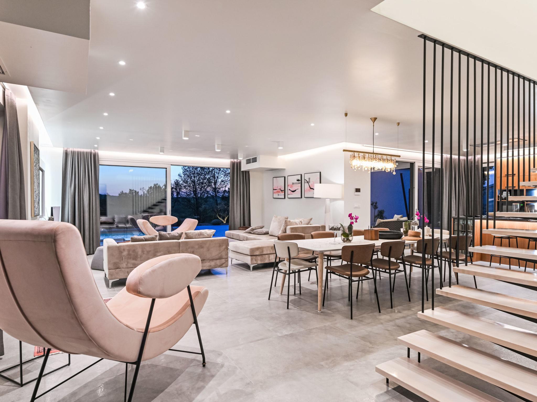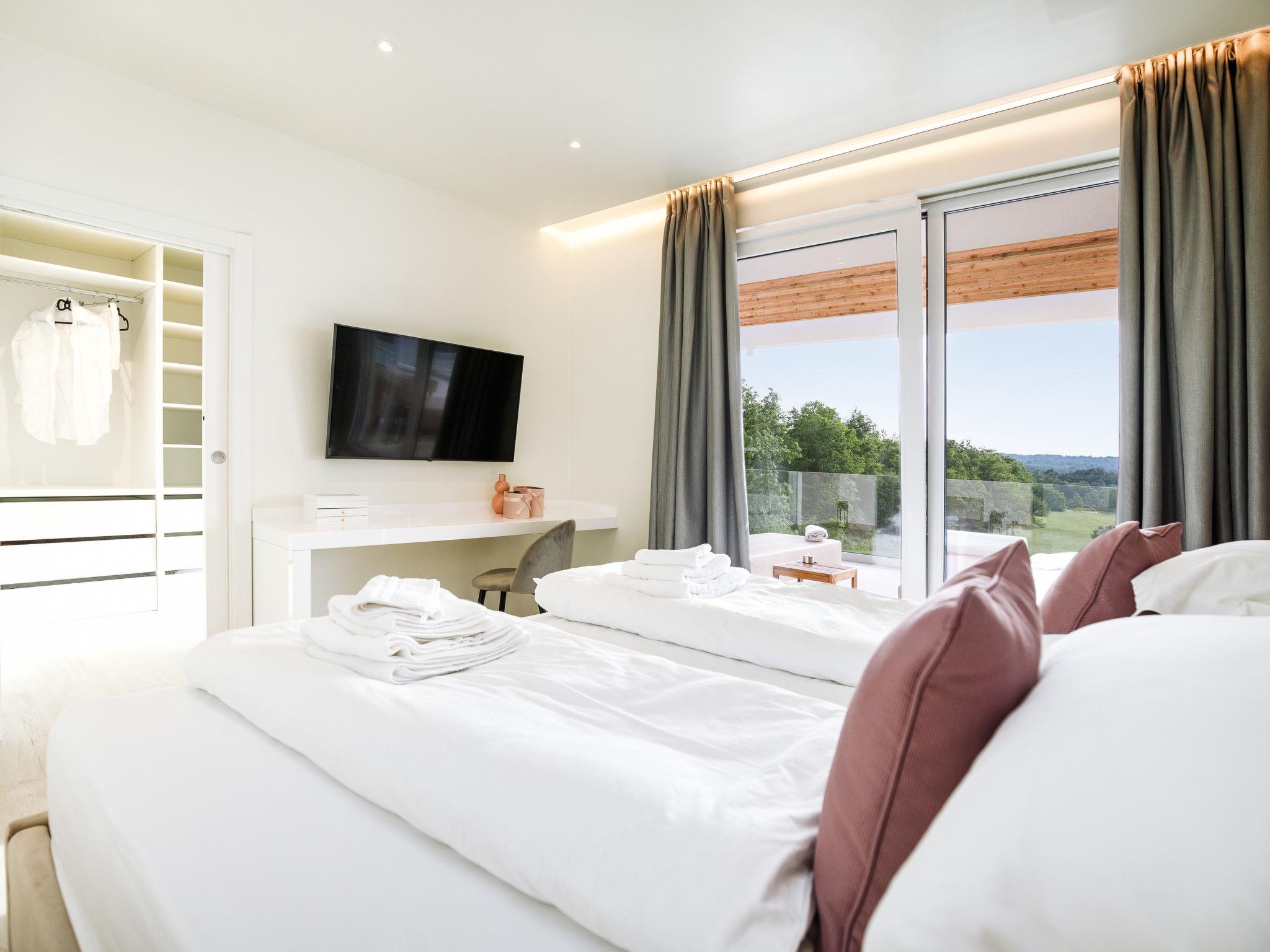 Very beautiful, luxurious house "Villa Sonia", 2 storeys, surrounded by trees and fields. In the hamlet Tomažici 4 km from the centre of Labin, in a quiet, sunny position, 10 km from the sea. Private: property 1'600 m2 (fenced) with wildlife garden and trees, swimming pool angular, heated (4 x 10 m, 45 m2, depth 135 cm, seasonal availability: 01.Apr. - 30.Sep.) with internal staircase and salt-electrolysis pool-cleaning system. WC in the pool area, outdoor shower, hot tub, terrace (40 m2), garden furniture, barbecue, children's playground, pool maintenance by the owner/gardener. In the house: internet access, sauna (all included), central heating system, air conditioning, washing machine, tumble dryer. Parking (for 4 cars) at the house on the premises. Shop 2 km, supermarket 2 km, restaurant 2 km, bus stop 2.2 km, pebble beach 10 km. Please note: airfield 45 km from the property. By groups of young people double deposit is requested on arrival. Swimming pool heated (extra). It is necessary to announce 7 days in advance if the pool heating is required. Video surveillance of the driveway and parking.