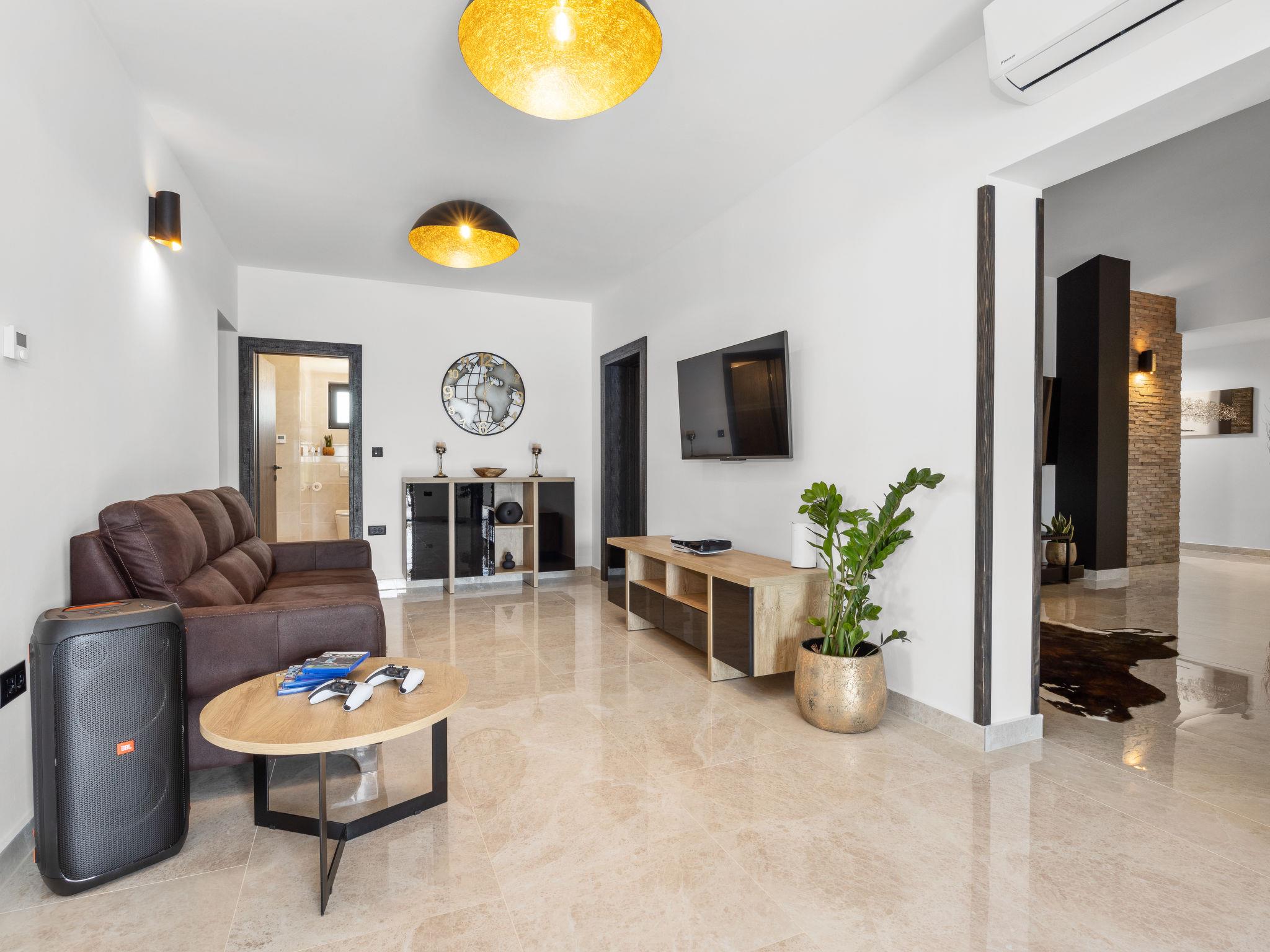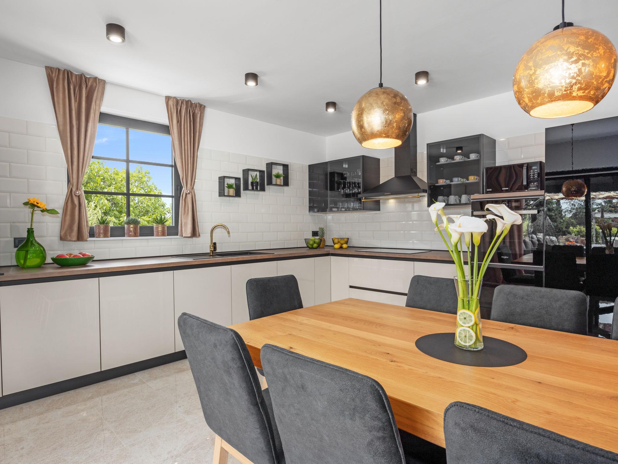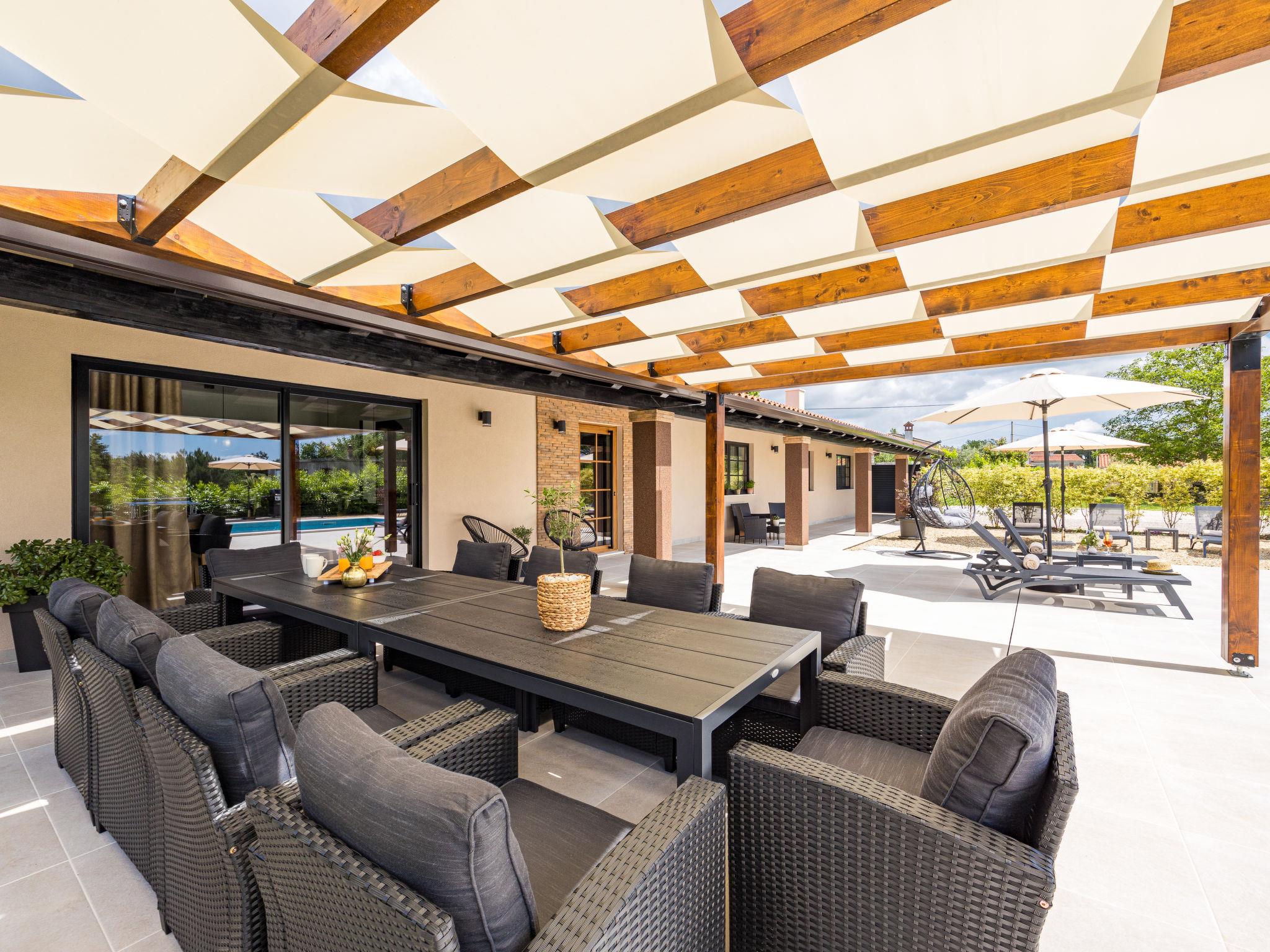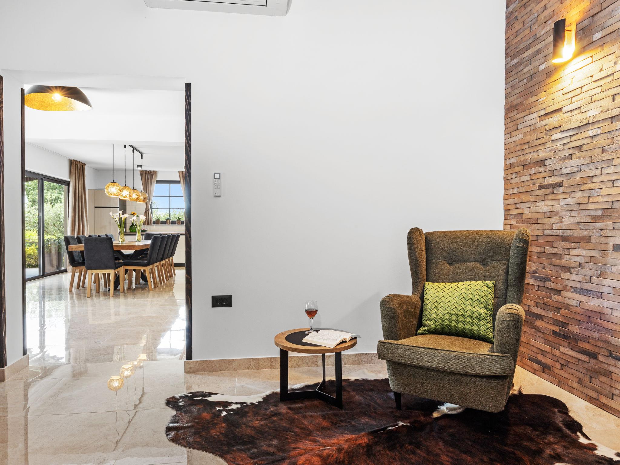5-room villa 300 m2. Very comfortable and tasteful furnishings: large living/dining room with satellite TV and air conditioning. Exit to the terrace, to the swimming pool. 1 room with 1 french bed (180 cm, length 200 cm), satellite TV and air conditioning. 1 room with 1 sofabed (90 cm, length 200 cm), 1 french bed (180 cm, length 200 cm), satellite TV and air conditioning. 1 room with 1 bed (140 cm, length 200 cm), 1 french bed (180 cm, length 200 cm), shower/WC, double hand-basin, satellite TV and air conditioning. 1 room with 1 sofabed (90 cm, length 200 cm), 1 french bed (180 cm, length 200 cm), shower/WC, satellite TV and air conditioning. Billiard room with open-hearth fireplace, dining table, kitchen corner, shower/WC and satellite TV. Exit to the terrace. Open kitchen (oven, dishwasher, 4 induction hot plates, toaster, kettle, microwave, freezer, electric coffee machine) with air conditioning. Exit to the terrace, to the swimming pool. Shower/WC, sep. WC. Electric heating, air-conditioning. Terrace 100 m2 partly roofed. Terrace furniture, barbecue (portable), deck chairs. Facilities: washing machine, iron, hair dryer. Internet (WiFi, free). Please note: non-smoking house. Fire extinguisher. Available: playstation 5 (included).