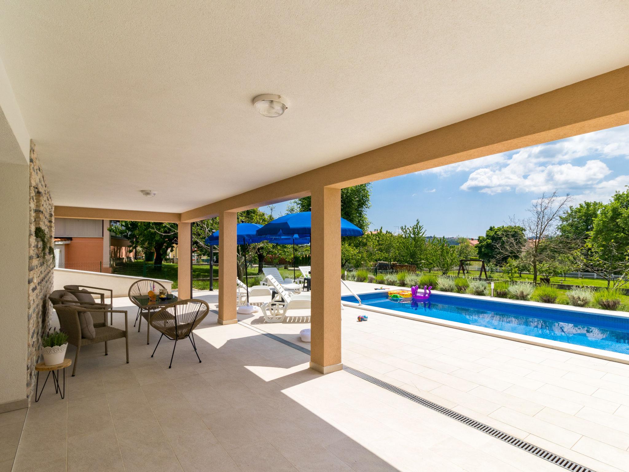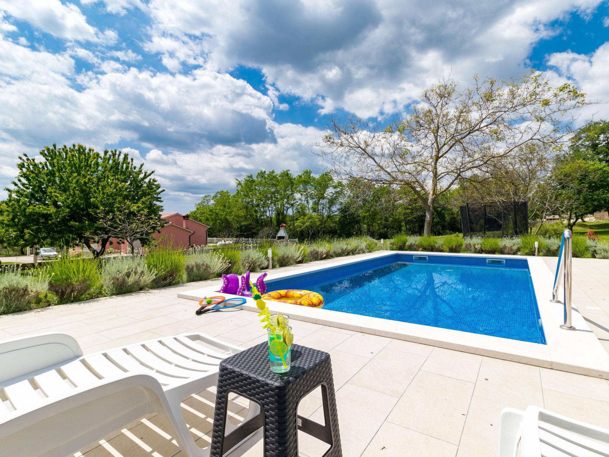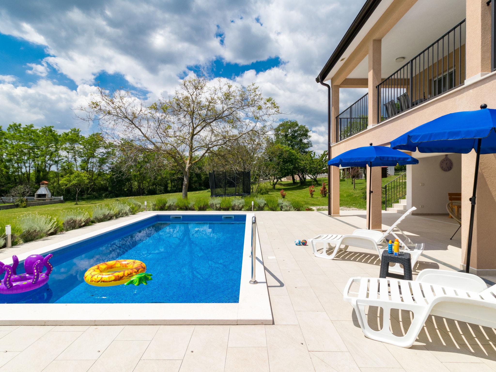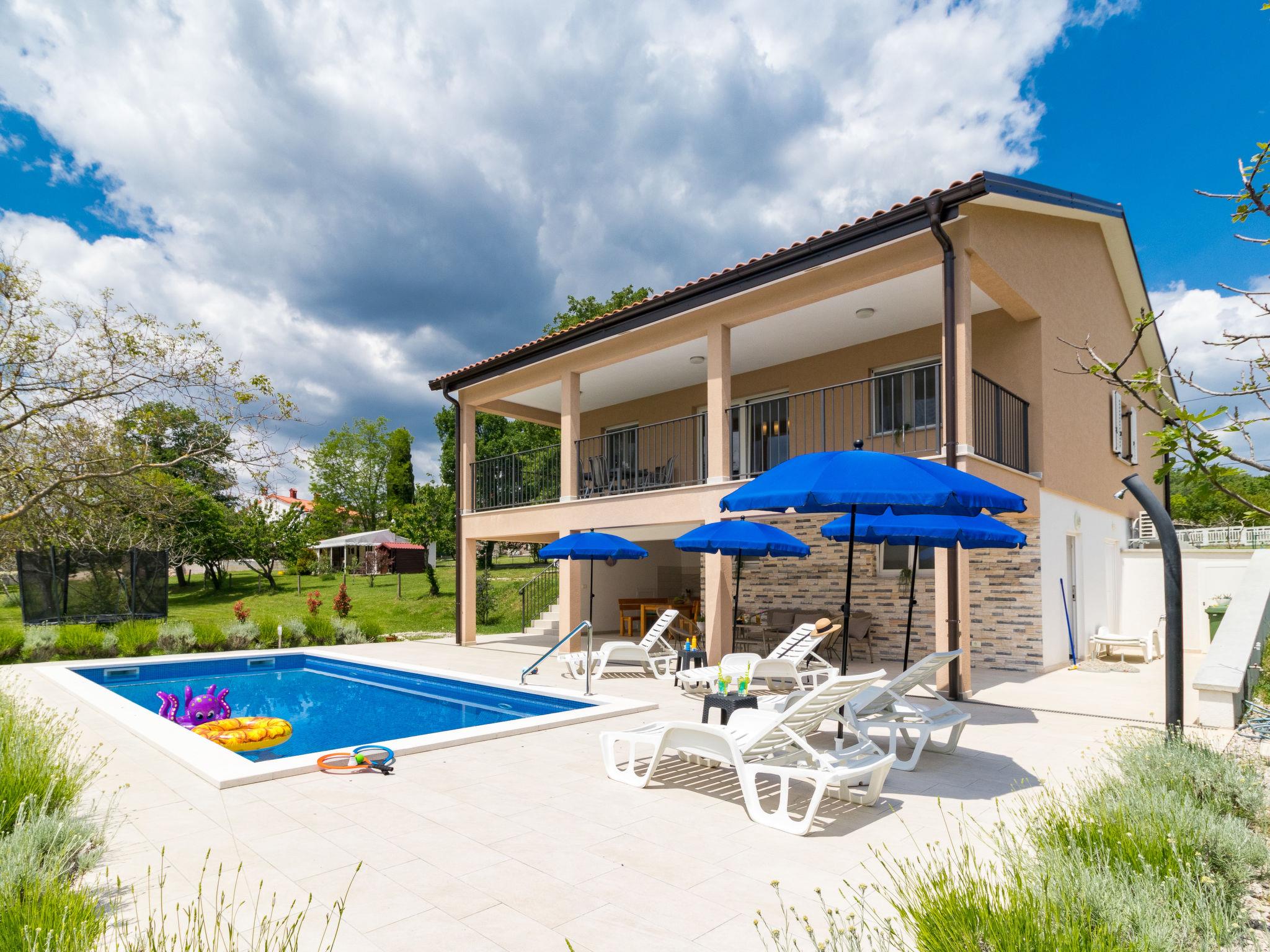 Single-family house "Marina", 2 storeys, built in 2018. In the district of Vinež 1 km from the centre of Labin, 6 km from the centre of Rabac, in the residential district, 6 km from the sea. Private: property 3'000 m2 with lawn and trees, swimming pool (8 x 4 m, depth 135 cm, seasonal availability: 01.May. - 01.Oct.) with internal staircase. Outdoor shower, terrace, garden furniture, barbecue, pool maintenance by the owner/gardener. In the house: internet access, trampoline, washing machine. Motor access to the house (30 m via unmade road). Parking (for 3 cars) on the premises. Shop 200 m, supermarket 1 km, bus stop 2.4 km, pebble beach 6 km. Groups of teenagers on request only.