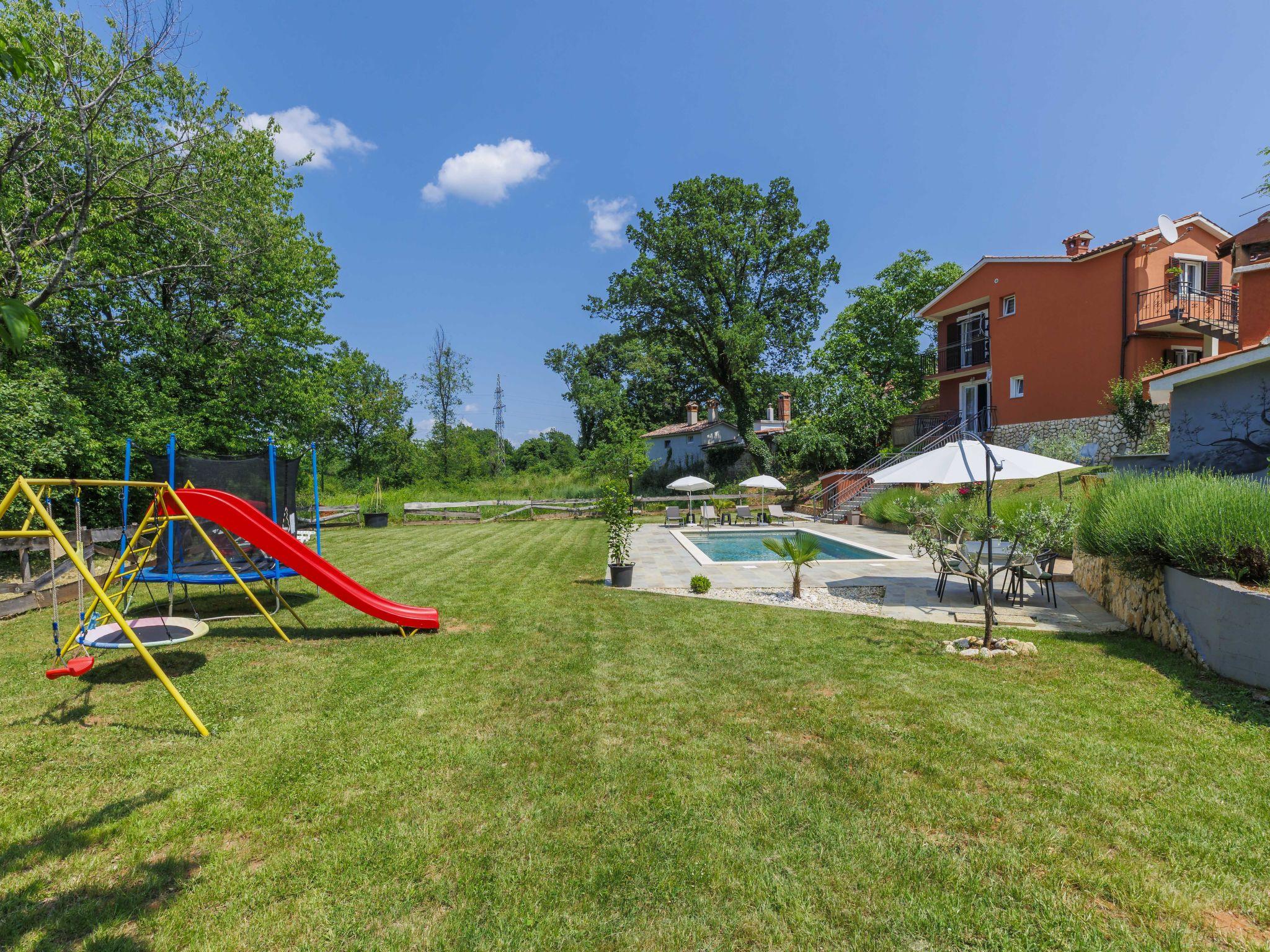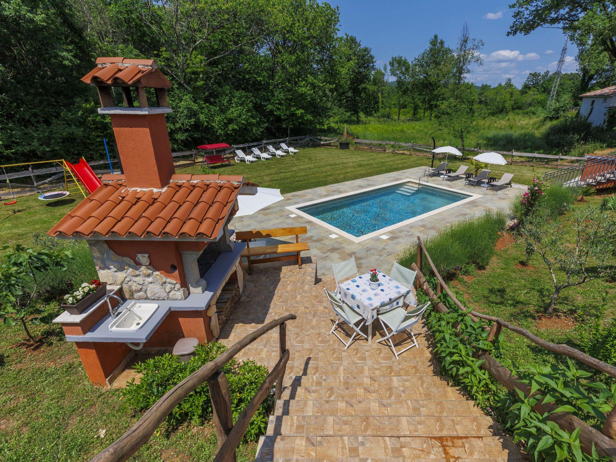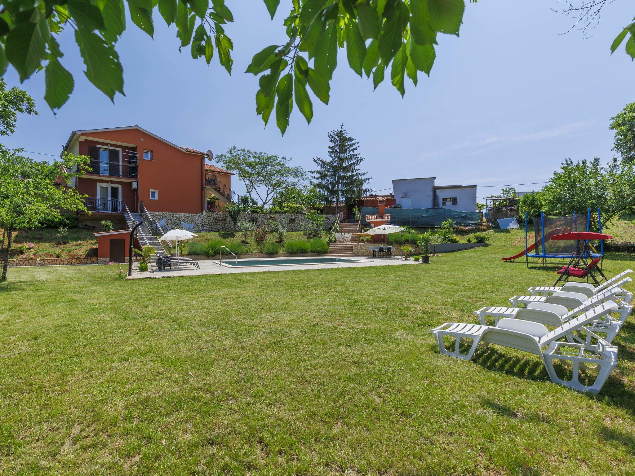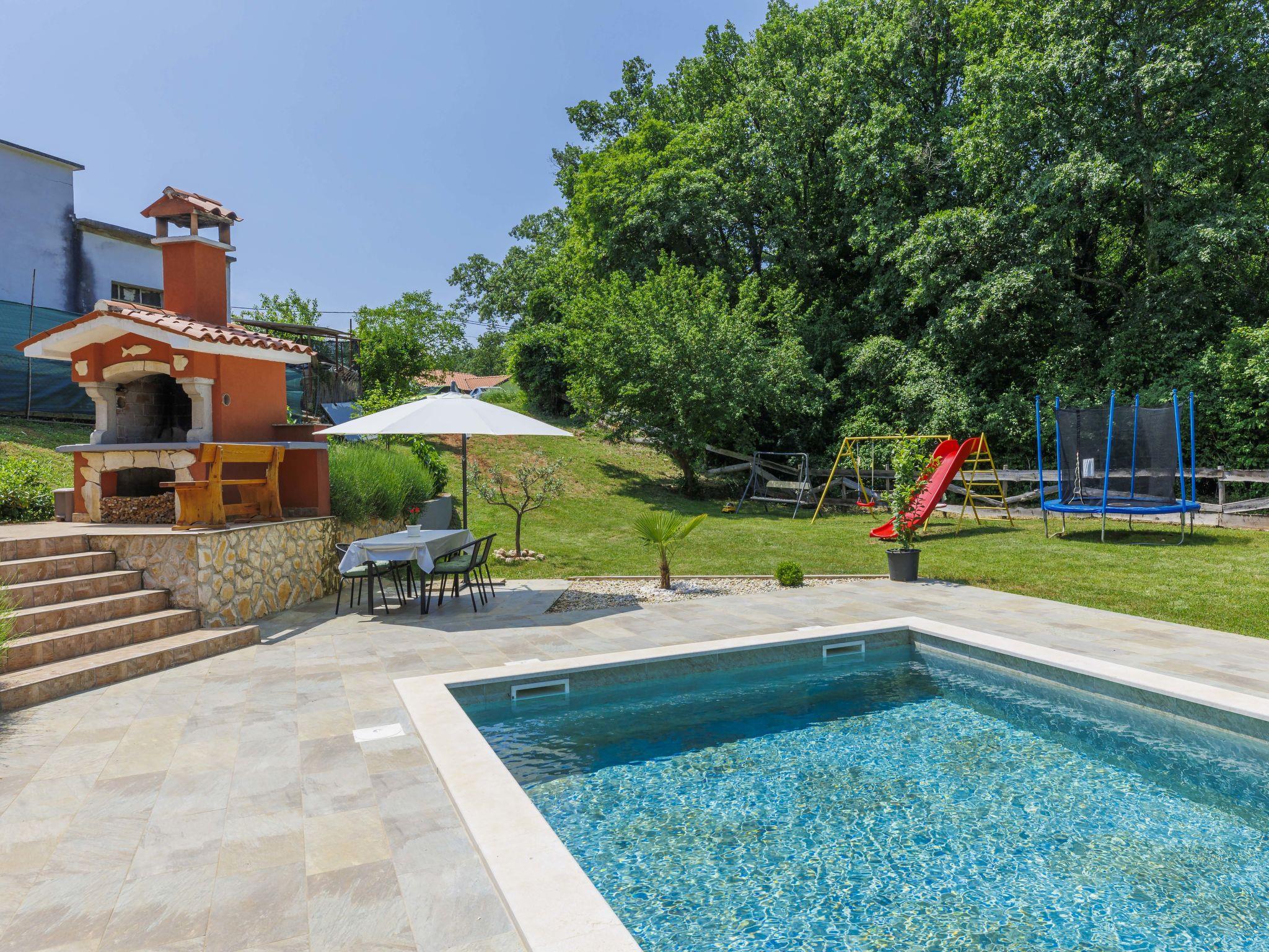 3-family house "Korina". In the hamlet Sveti Bartul 4 km from the centre of Labin, 9 km from the sea. Private: property 800 m2 with wildlife garden and trees, swimming pool angular (4 x 8 m, depth 135 cm, seasonal availability: 04.Jun. - 08.Oct.) with internal staircase. Outdoor shower, terrace, garden furniture, barbecue (slide, swing), pool maintenance by the owner/gardener. In the house: internet access, trampoline. Parking at the house on the premises. Shop 2.5 km, supermarket 4 km, restaurant 4 km, bus stop 4 km, pebble beach 9 km. Please note: airfield 45 km from the property.