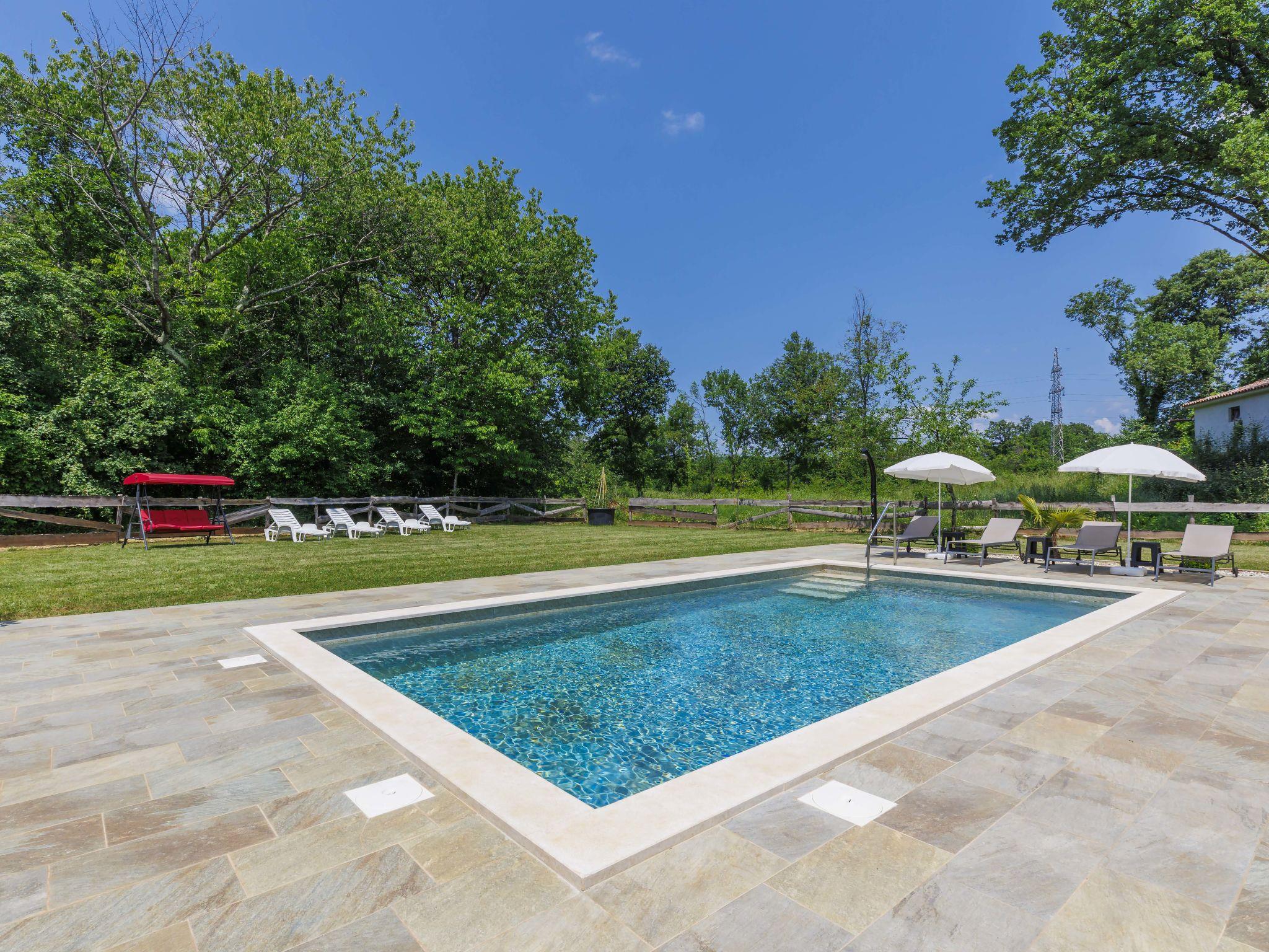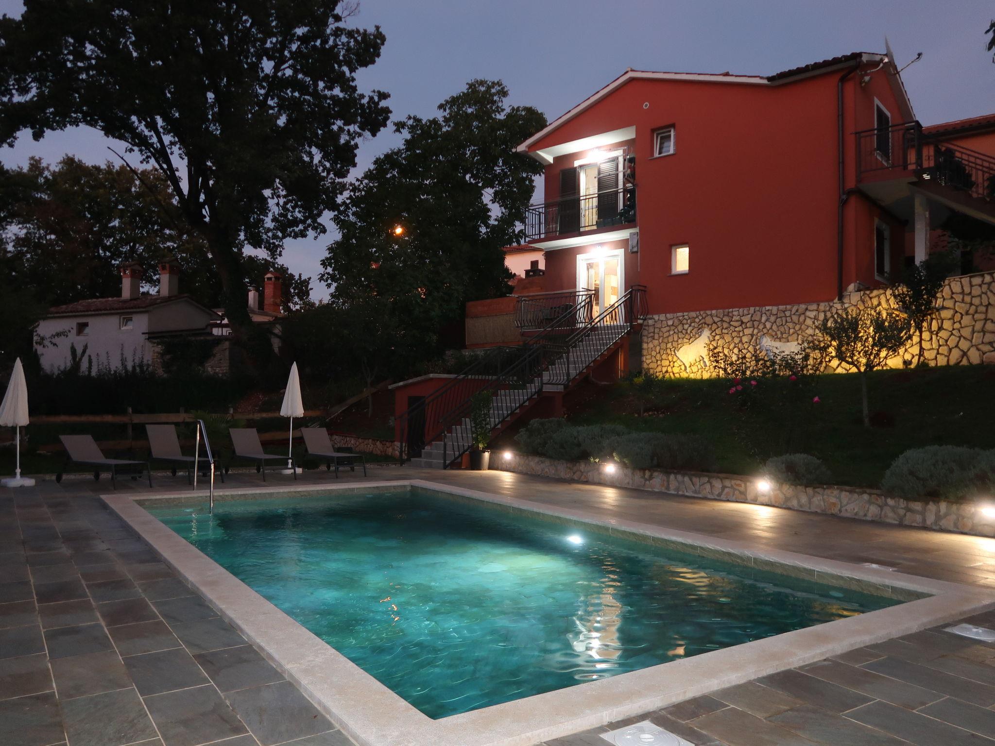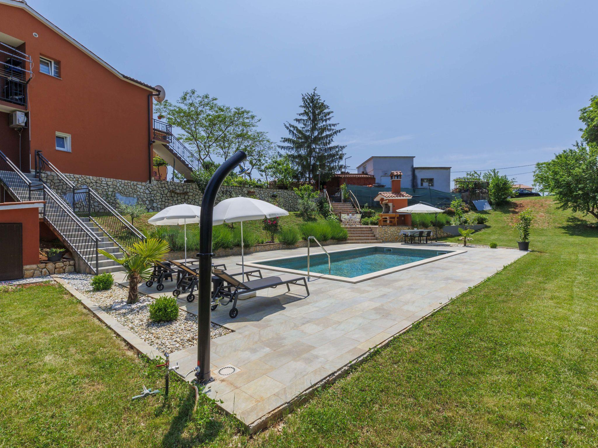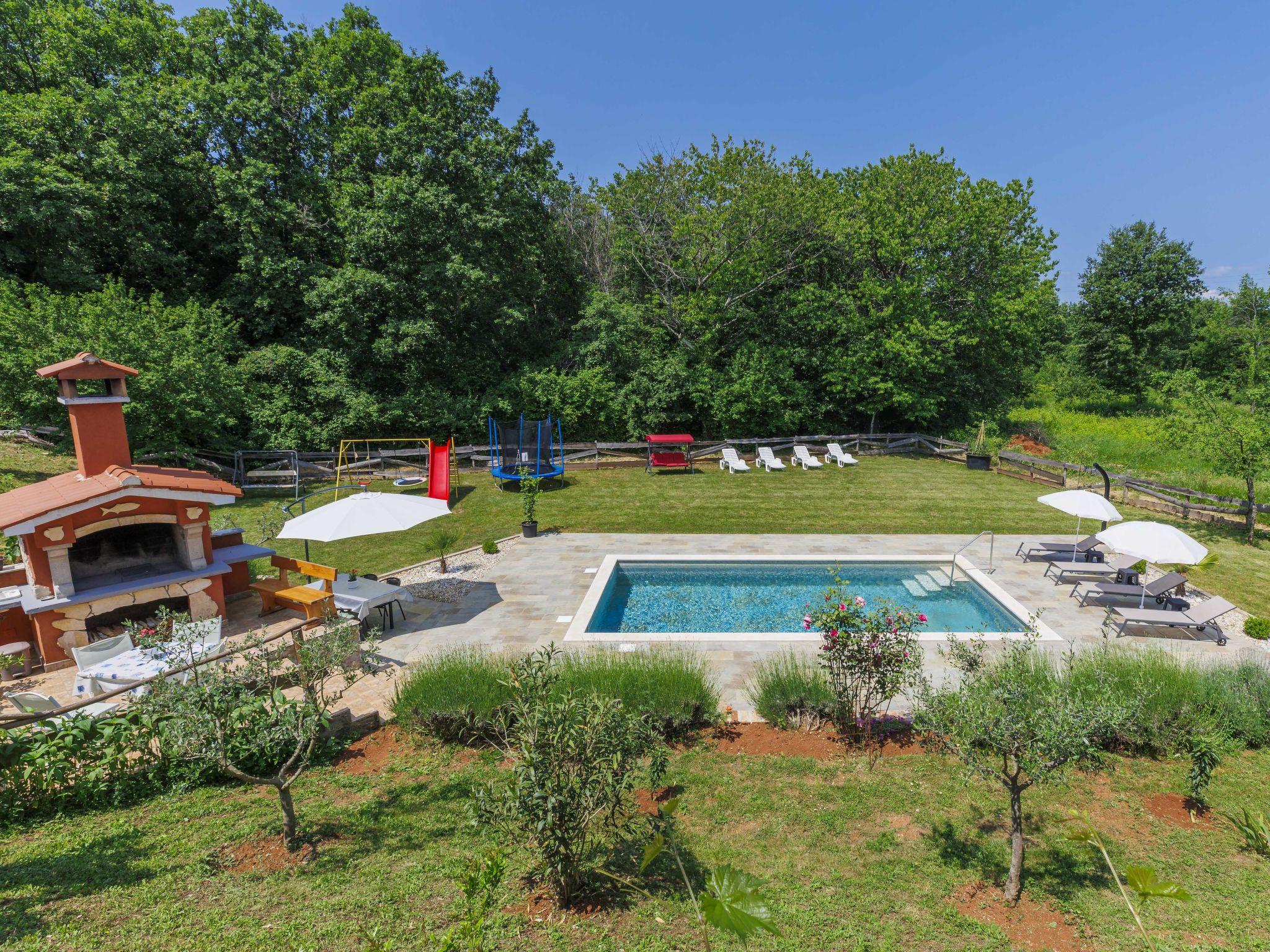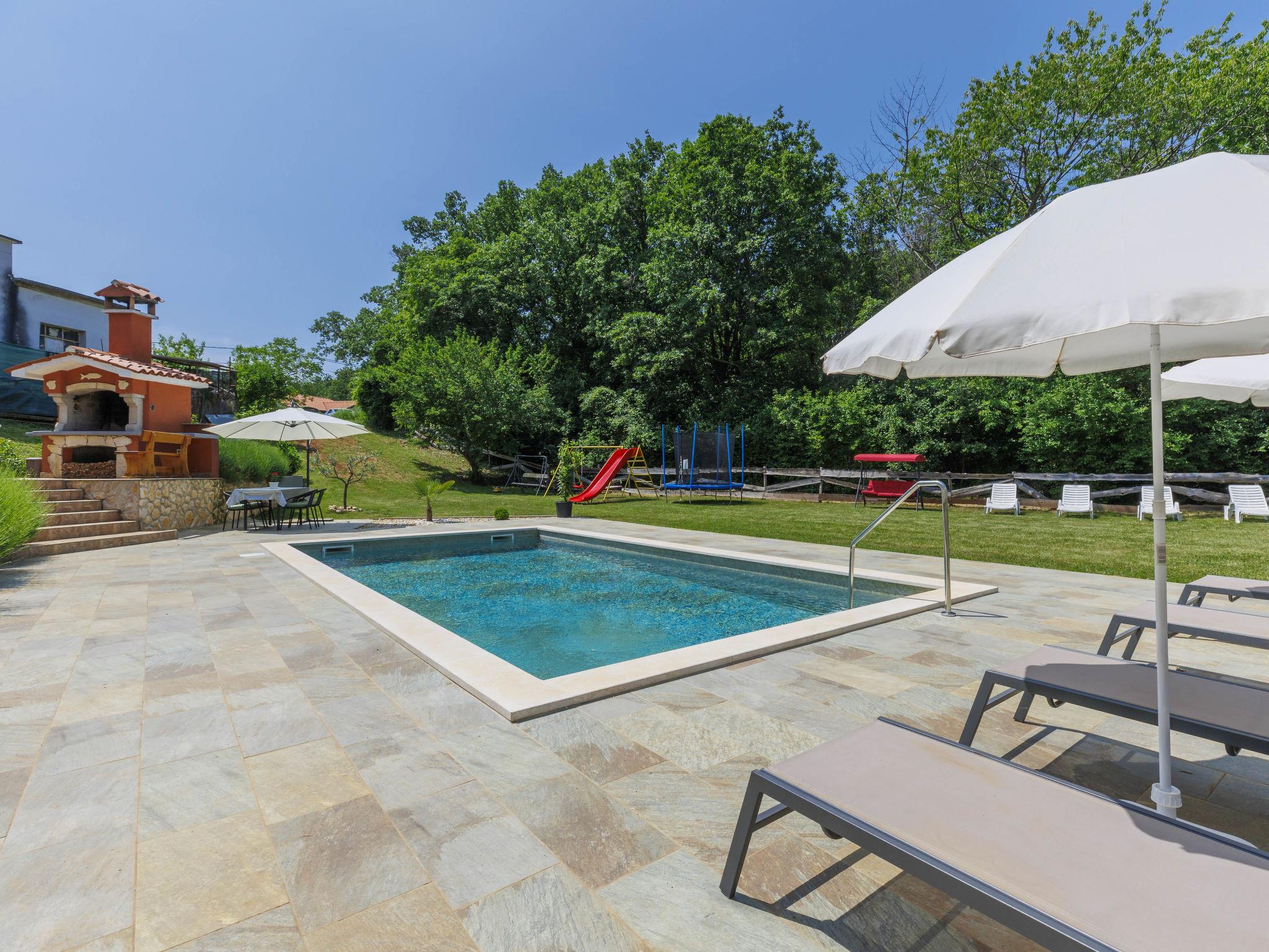 3-family house "Korina". In the hamlet Sveti Bartul 4 km from the centre of Labin, 9 km from the sea. Private: property 800 m2 with wildlife garden and trees, swimming pool angular (4 x 8 m, depth 135 cm, seasonal availability: 04.Jun. - 08.Oct.) with internal staircase. Outdoor shower, terrace, garden furniture, barbecue (slide, swing), pool maintenance by the owner/gardener. In the house: internet access, trampoline. Parking at the house on the premises. Shop 2.5 km, supermarket 4 km, restaurant 4 km, bus stop 4 km, pebble beach 9 km. Please note: airfield 45 km from the property.