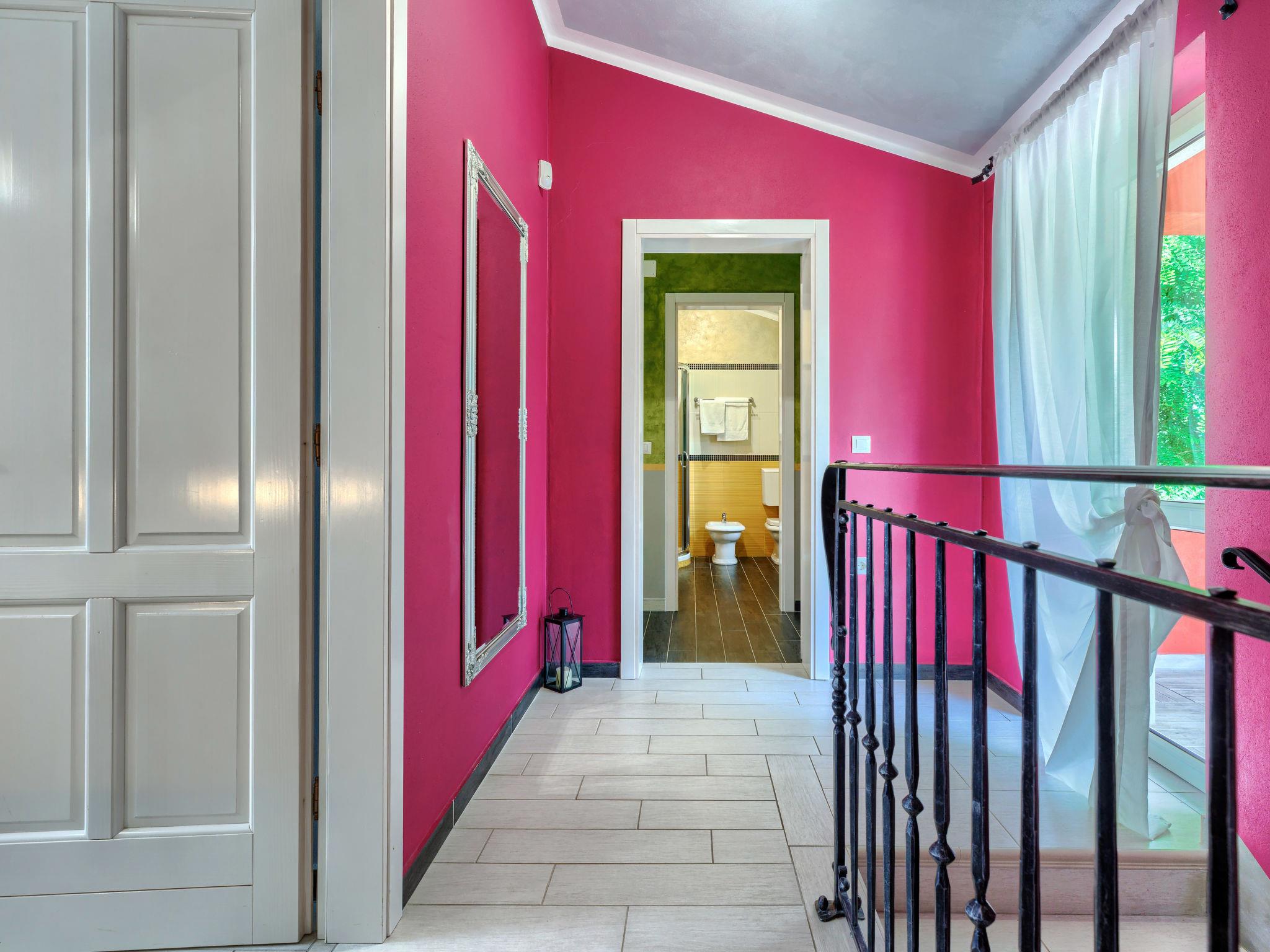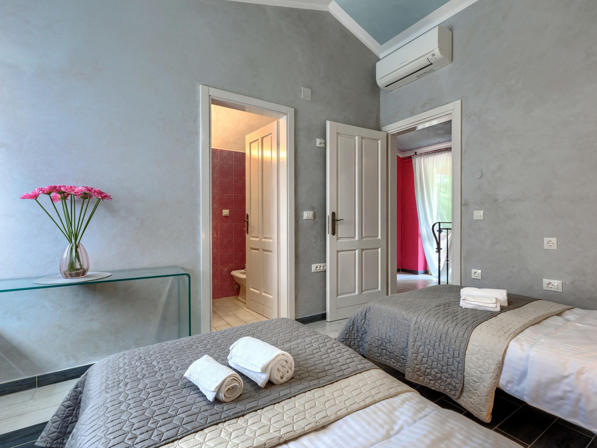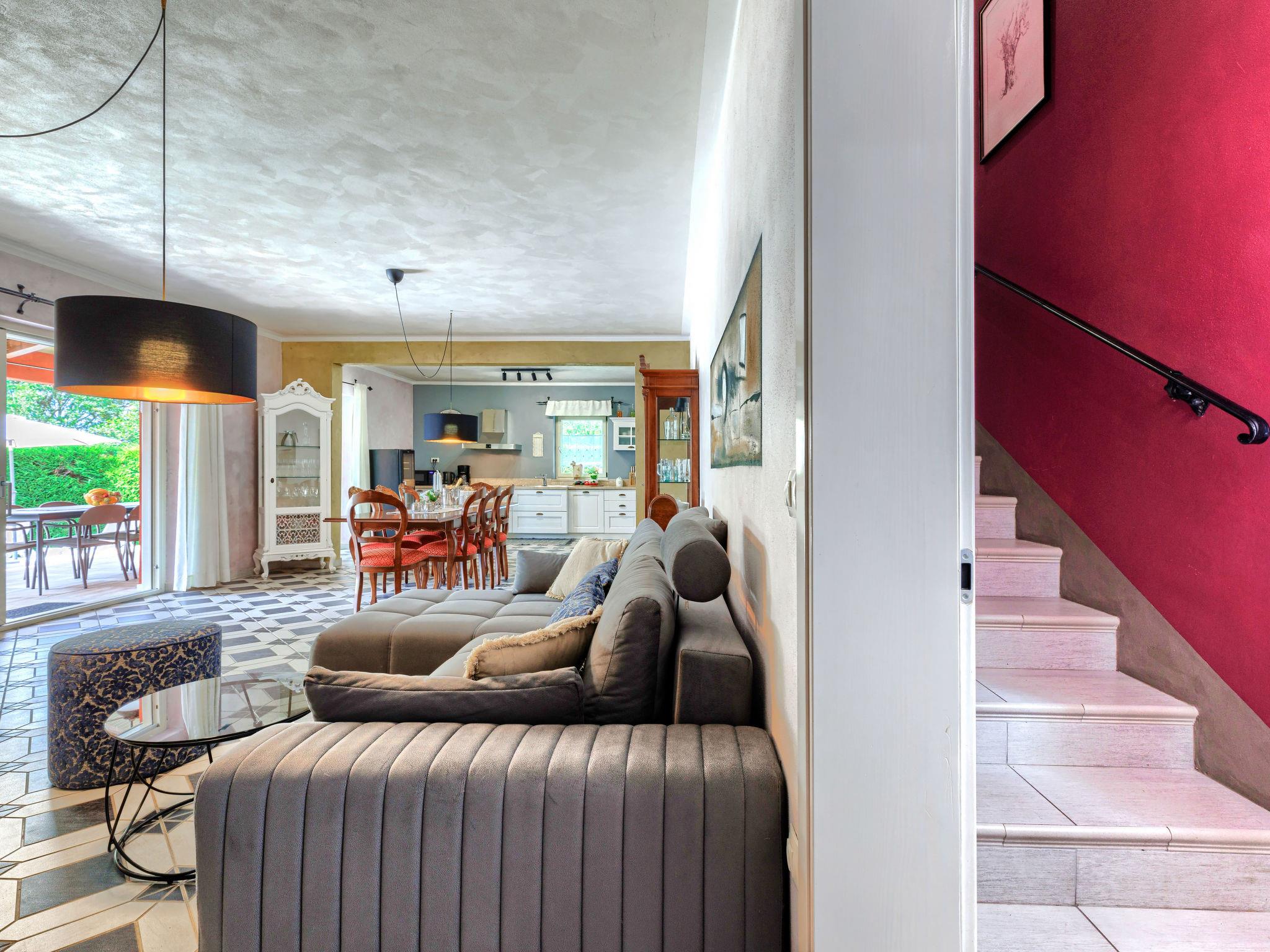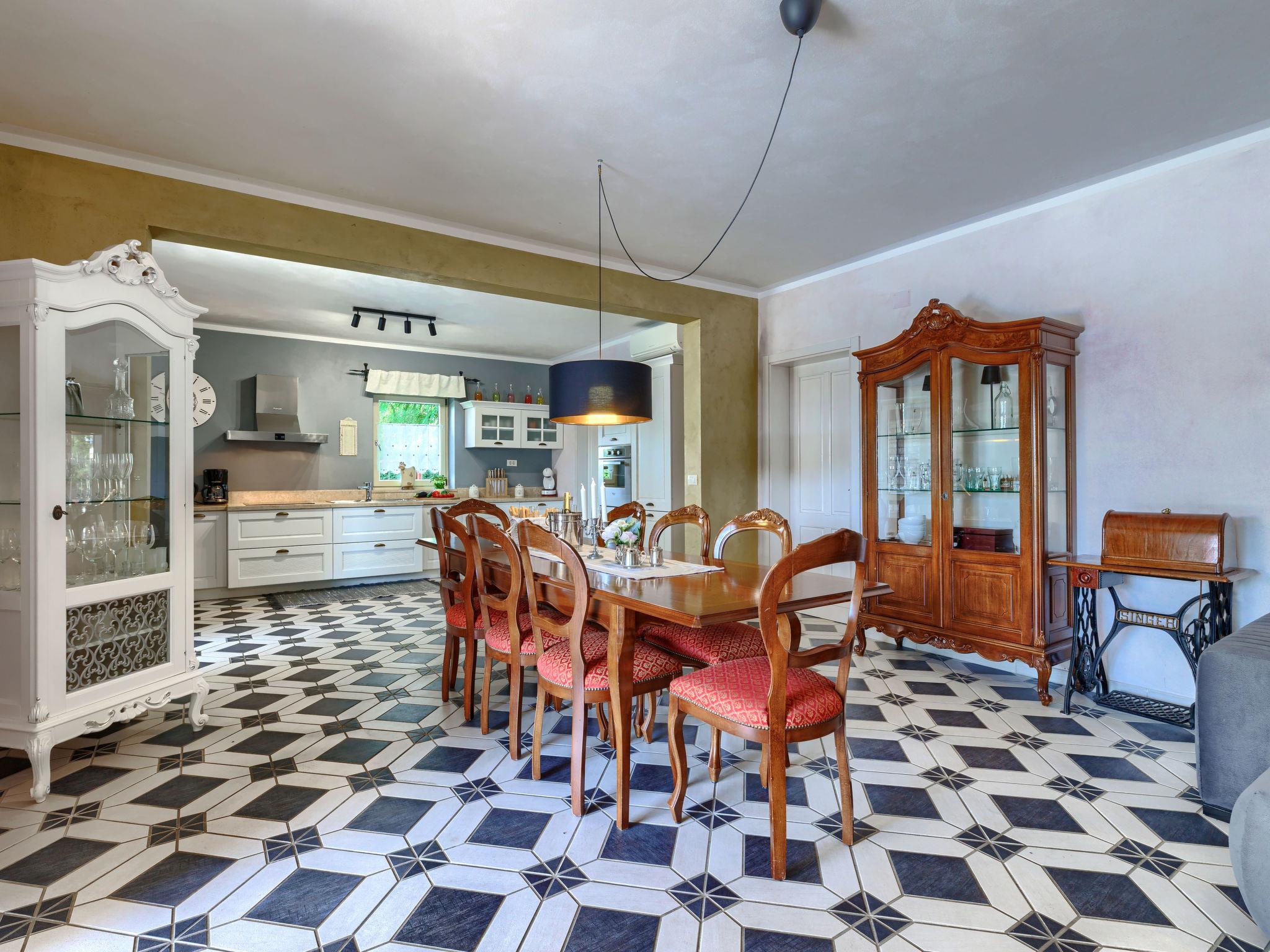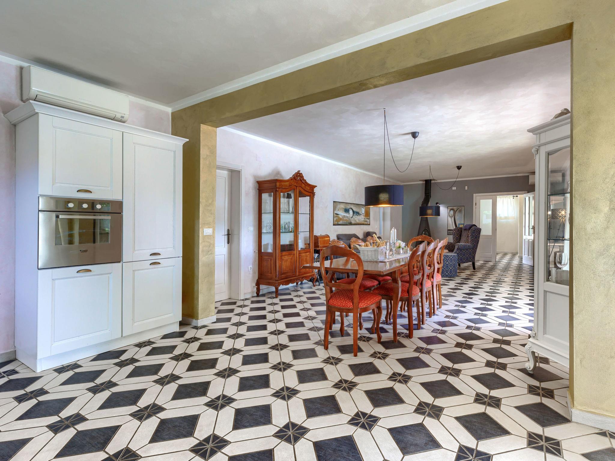 5-room villa 180 m2 on 2 levels. Very beautiful and cosy furnishings: large living/dining room with 1 double sofabed (170 cm, length 240 cm), satellite TV and air conditioning. Exit to the terrace, to the swimming pool. 1 room with 2 beds (90 cm, length 200 cm), shower/bidet/WC and air conditioning. Open kitchen (oven, dishwasher, 4 ceramic glass hob hotplates, toaster, kettle, microwave, freezer, electric coffee machine) with air conditioning. Exit to the terrace, to the swimming pool. Sep. WC. Upper floor: 1 room with 1 french bed (180 cm, length 200 cm), shower/bidet/WC and air conditioning. 1 room with 1 french bed (170 cm, length 200 cm), shower/bidet/WC and air conditioning. 1 room with 2 beds (90 cm, length 200 cm), shower/bidet/WC and air conditioning. Heating, air-conditioning. Balcony 12 m2, terrace 32 m2, roofed. Terrace furniture, balcony furniture, barbecue, deck chairs. Facilities: iron, hair dryer. Internet (WiFi, free). Please note: non-smoking house. Maximum 2 pets/ dogs allowed. Fire extinguisher. Available: wine - cooler.