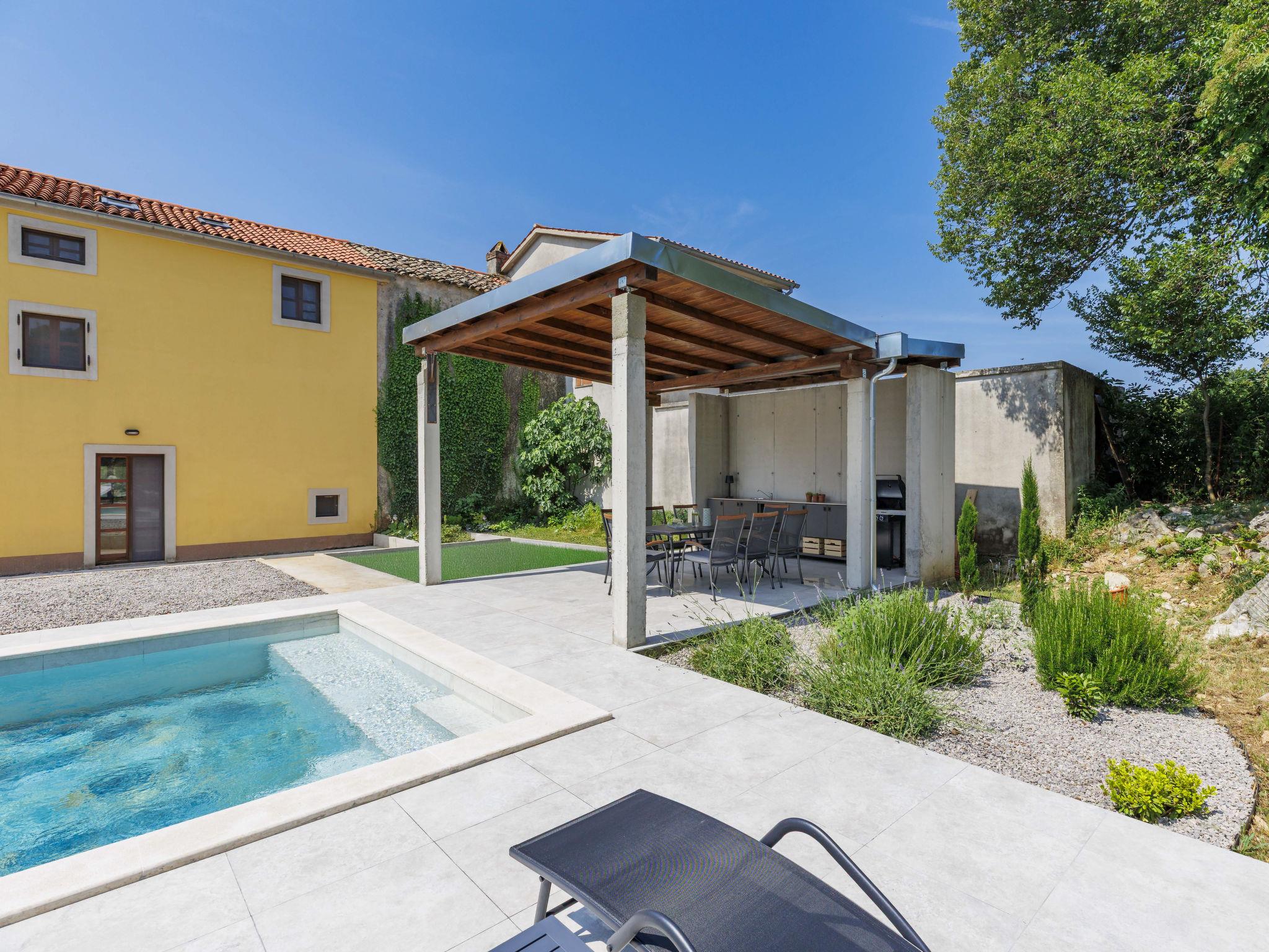 Terraced house "Perun", 3 storeys. 2 km from the centre of Labin, 7 km from the centre of Rabac, 7 km from the sea, in the countryside. Private: property 500 m2, swimming pool angular (8 x 4 m, depth 140 cm, seasonal availability: 01.May. - 30.Oct.) with internal staircase. Outdoor shower, terrace (70 m2), garden furniture, pool maintenance by the owner/gardener. In the house: internet access, washing machine. Parking (for 3 cars) at the house on the premises. Shop 2 km, supermarket 2500 km, restaurant 4 km, bus stop "Labin" 2.5 km, pebble beach 7 km. Please note: airfield 45 km from the property.