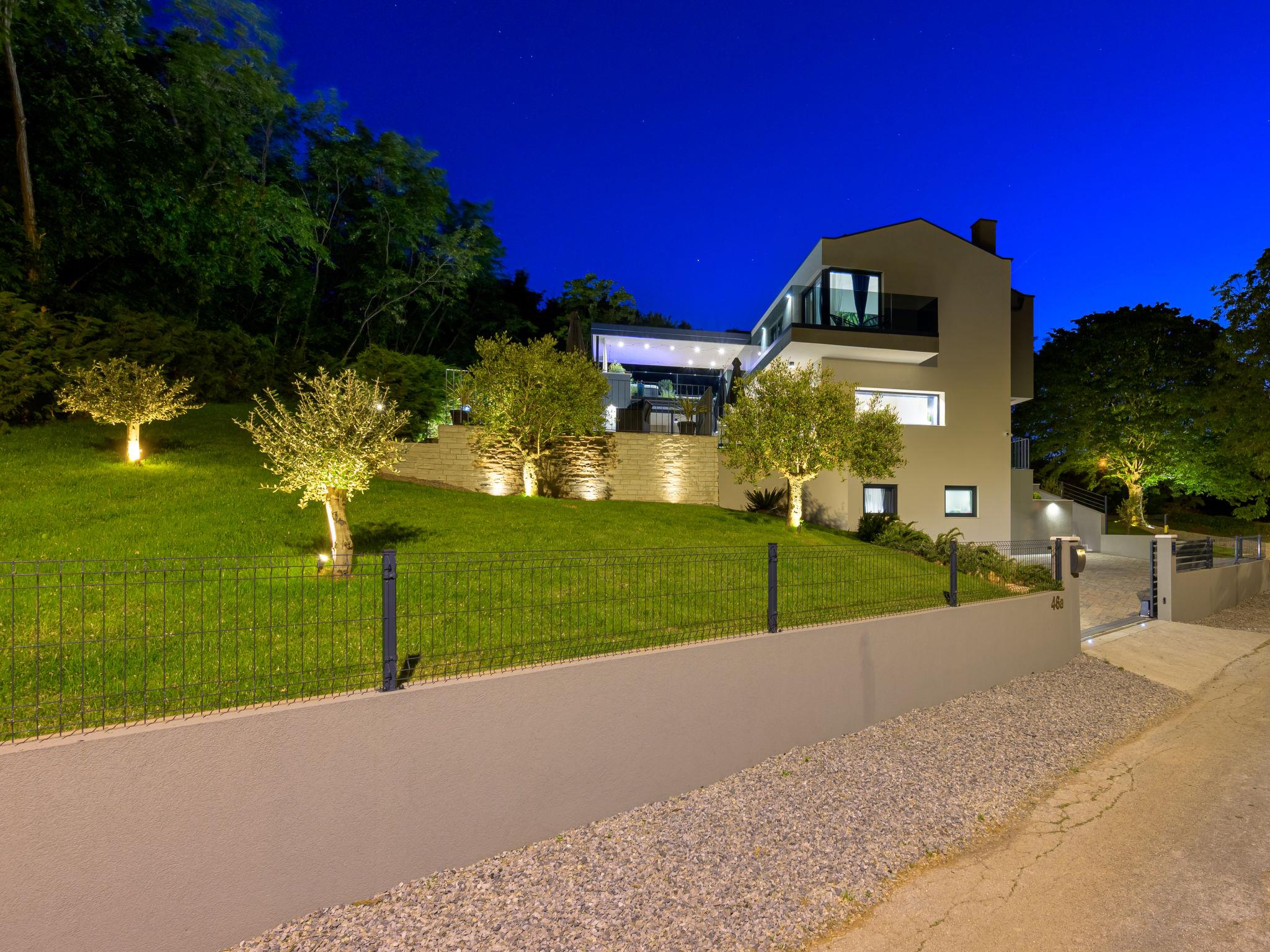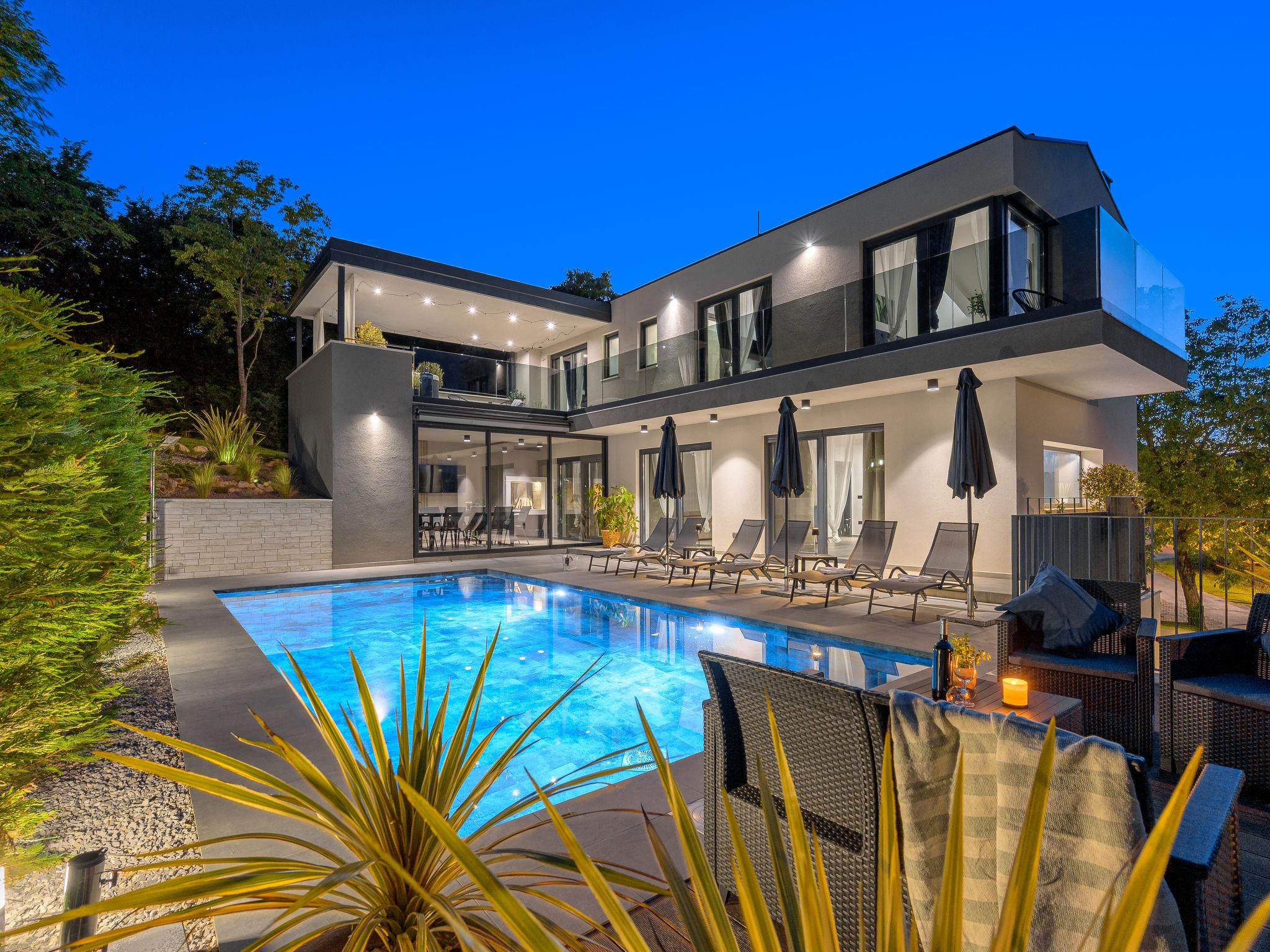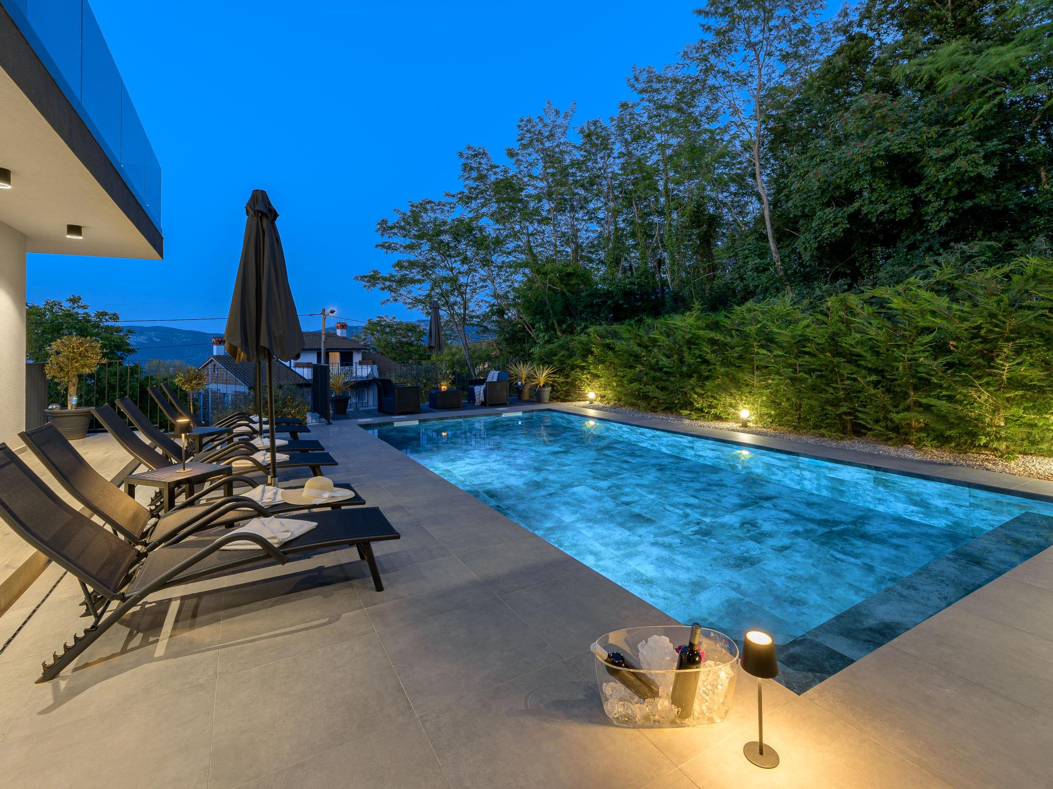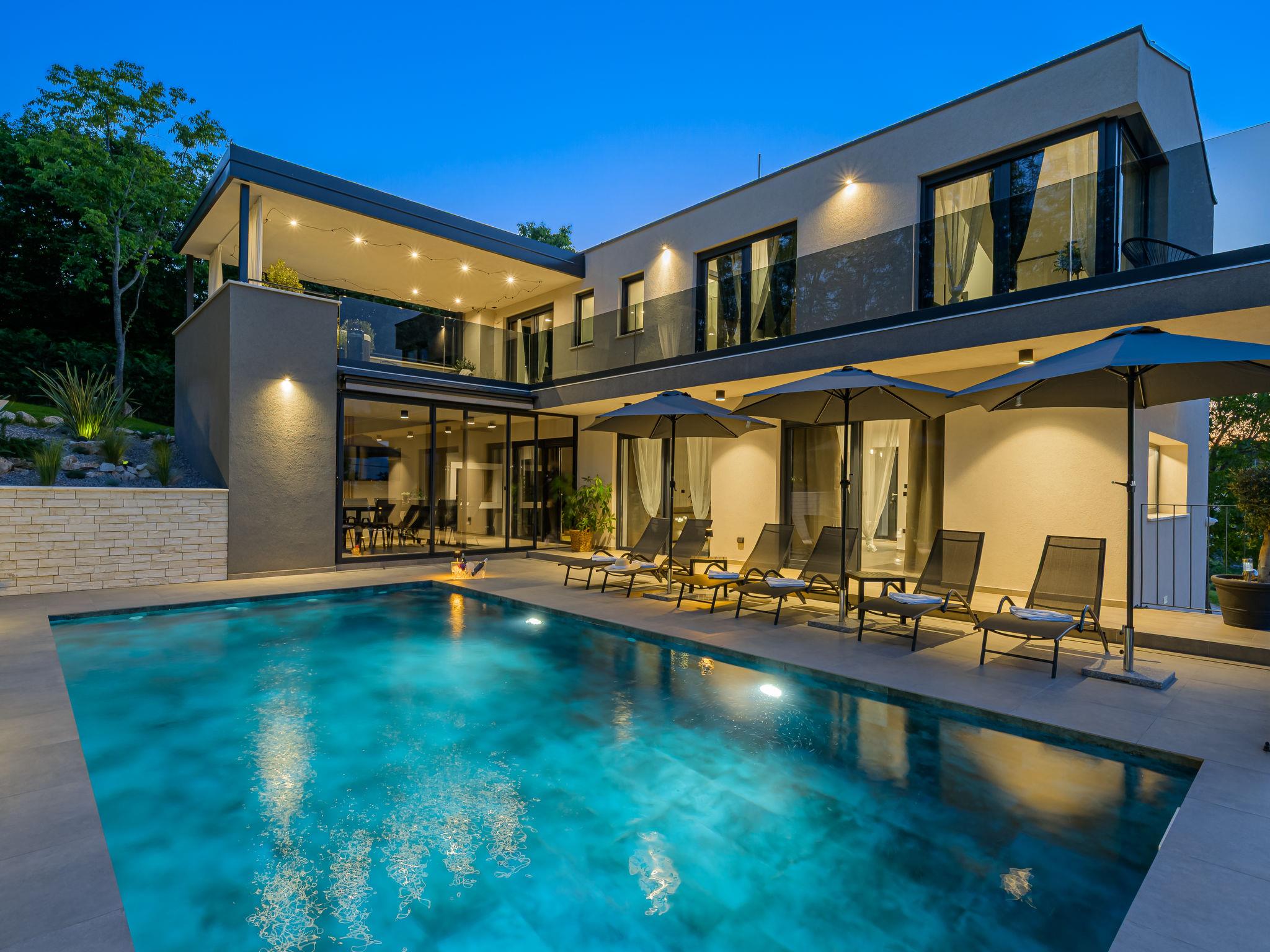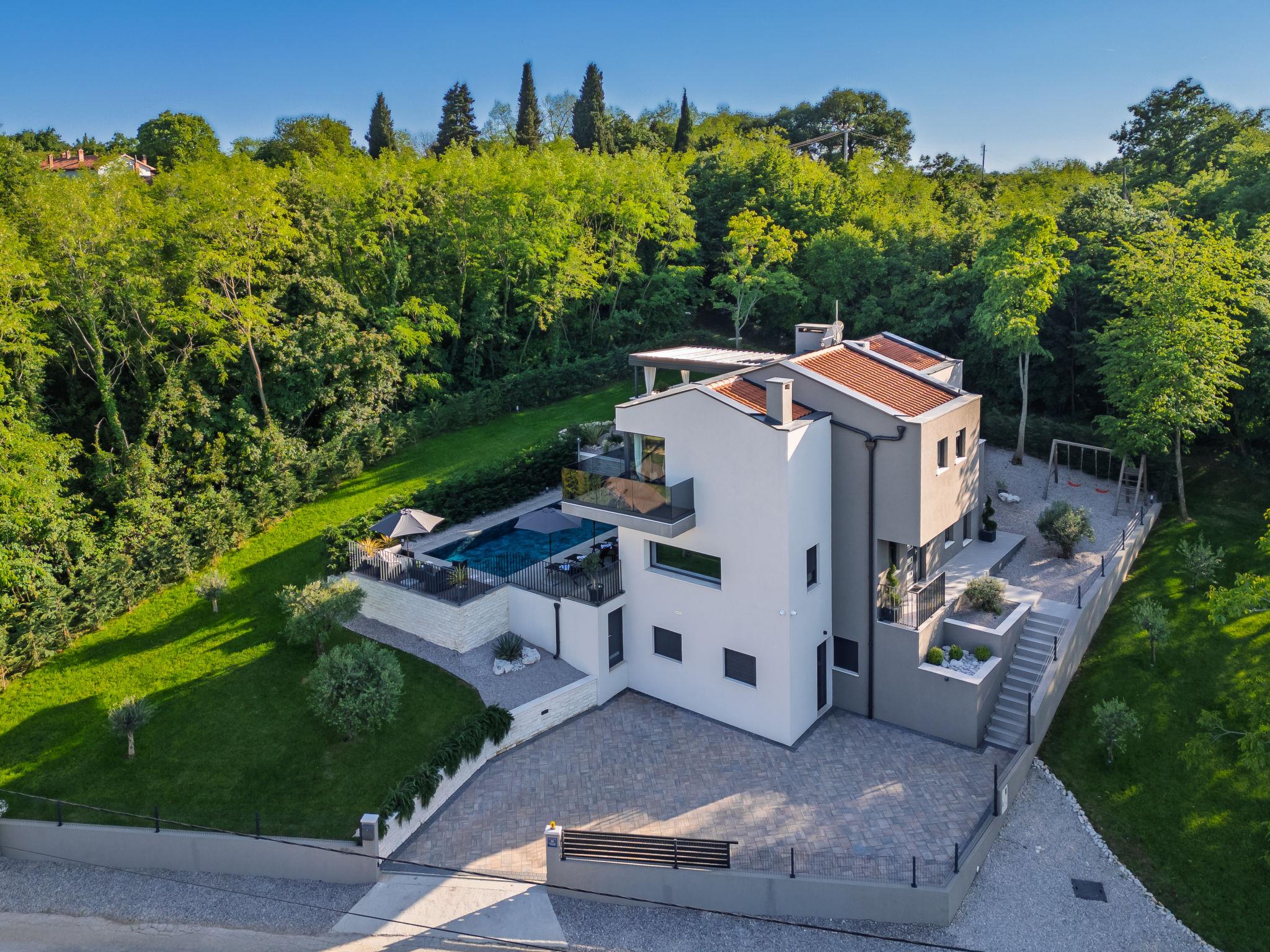 Very beautiful, luxurious villa "Ollea", 3 storeys. In the hamlet Radovici 10 km from the centre of Labin, 15 km from the centre of Rabac, 15 km from the sea. Private: property 900 m2 (fenced) with wildlife garden and trees, swimming pool angular (8 x 4 m, depth 150 cm, seasonal availability: 01.Apr. - 30.Oct.) with internal staircase. Outdoor shower, hot tub, table tennis, barbecue (slide, swing), pool maintenance by the owner/gardener. In the house: internet access, sauna, table football, washing machine, tumble dryer. Roofed, parking (for 4 cars) at the house on the premises. Shop 4 km, supermarket 10 km, restaurant 4 km, bus stop "Labin" 10 km, pebble beach 15 km. The owner does not accept any youth groups. Please note: airfield 53 km from the property. Video surveillance of the driveway and parking.