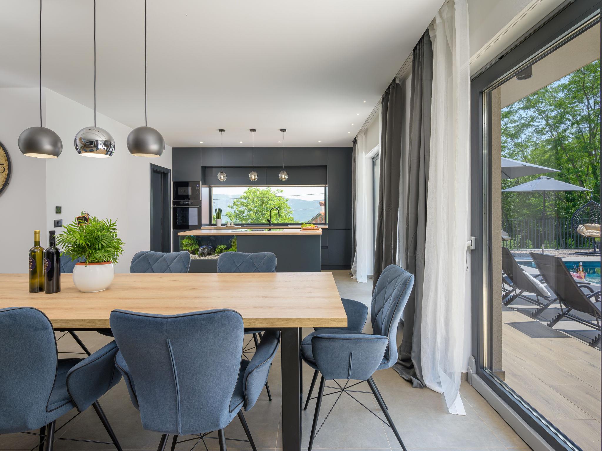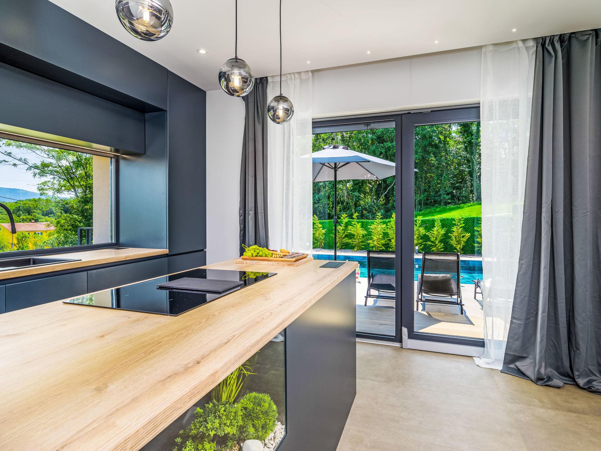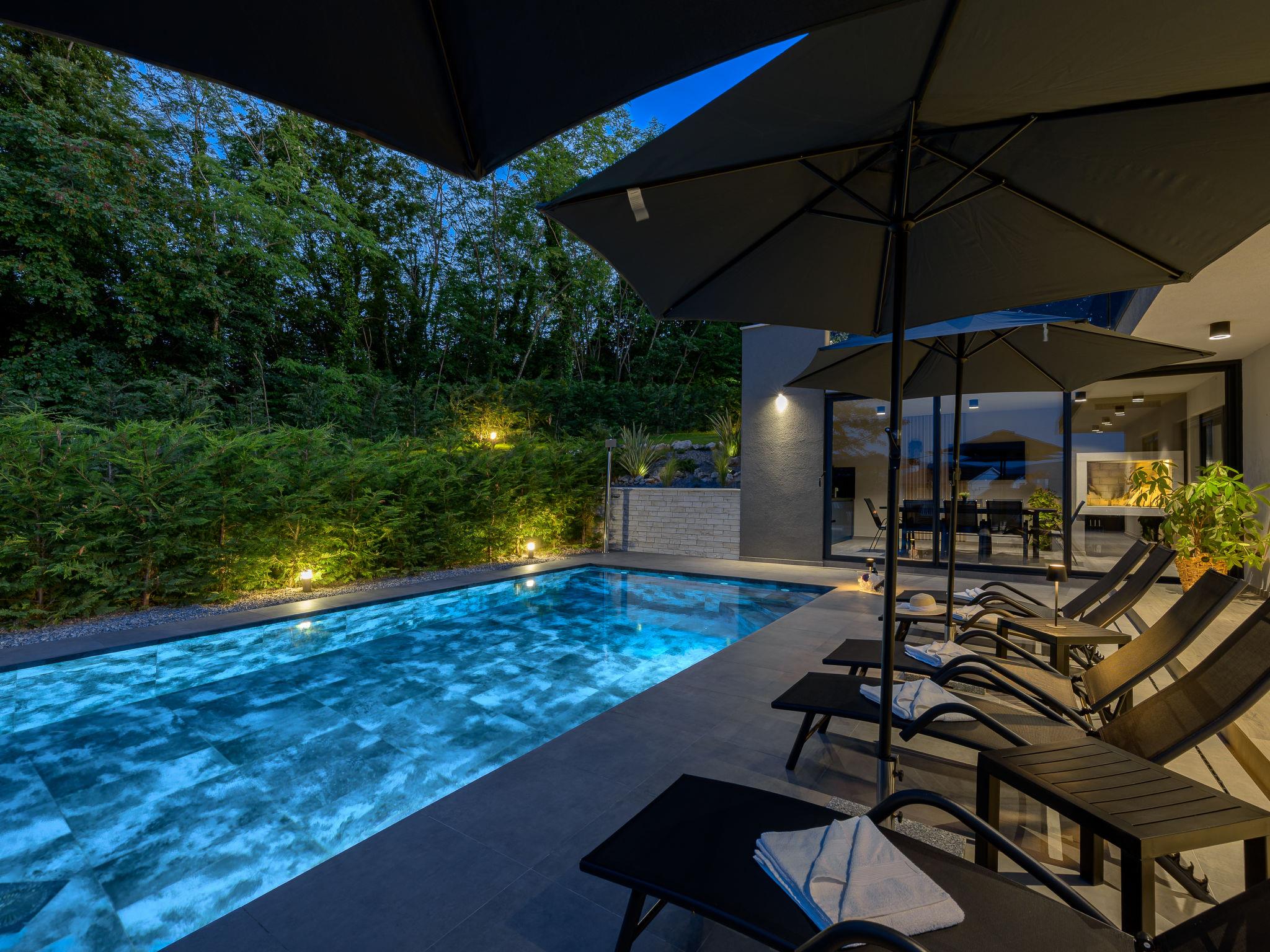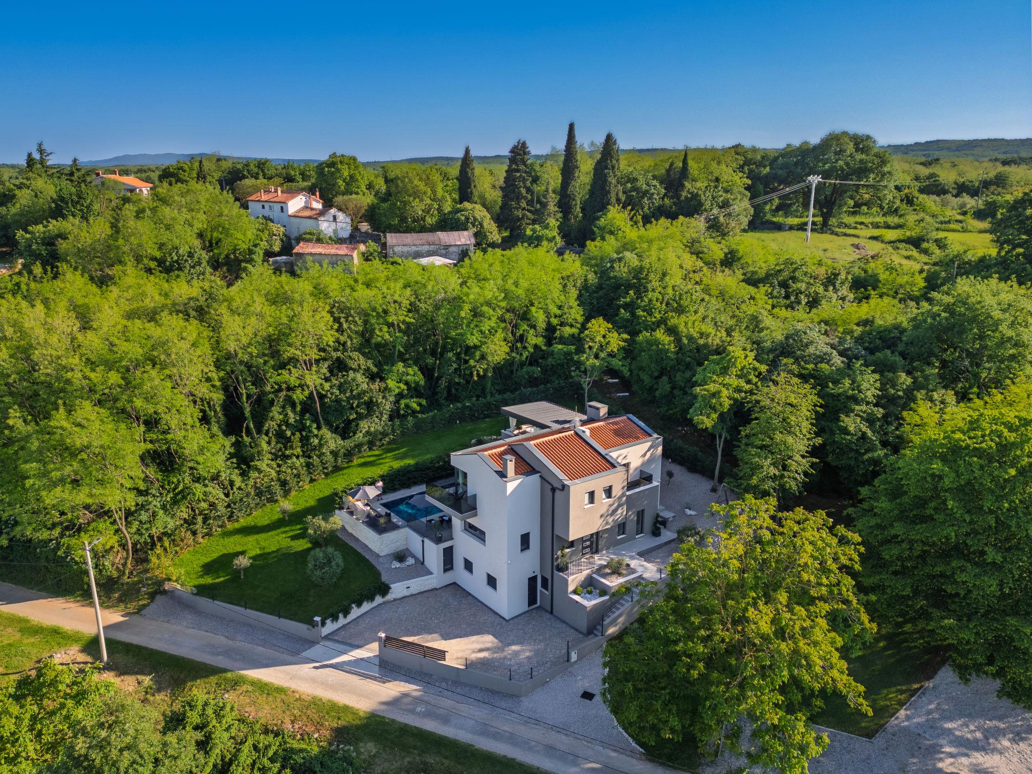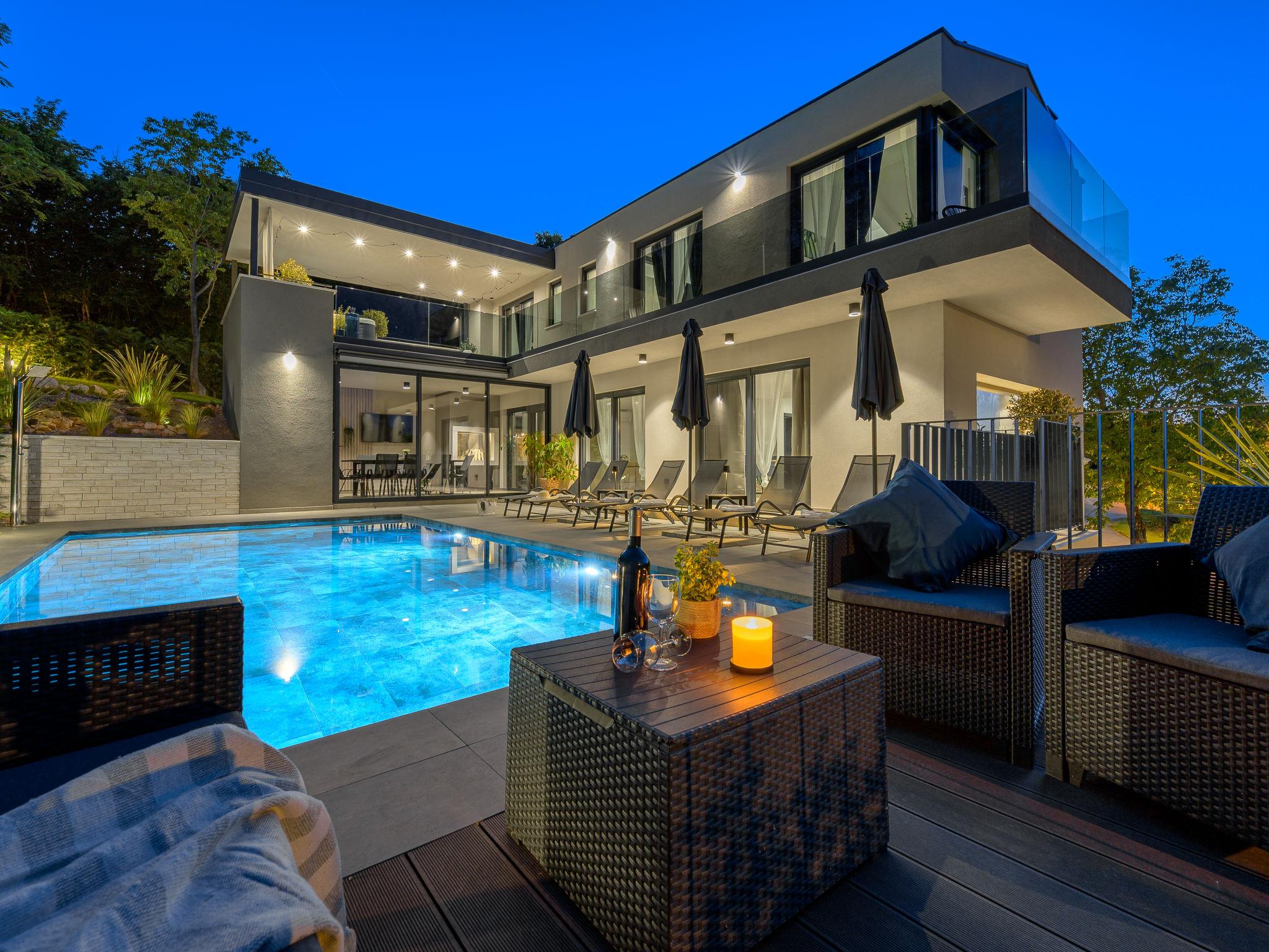 Very beautiful, luxurious villa "Ollea", 3 storeys. In the hamlet Radovici 10 km from the centre of Labin, 15 km from the centre of Rabac, 15 km from the sea. Private: property 900 m2 (fenced) with wildlife garden and trees, swimming pool angular (8 x 4 m, depth 150 cm, seasonal availability: 01.Apr. - 30.Oct.) with internal staircase. Outdoor shower, hot tub, table tennis, barbecue (slide, swing), pool maintenance by the owner/gardener. In the house: internet access, sauna, table football, washing machine, tumble dryer. Roofed, parking (for 4 cars) at the house on the premises. Shop 4 km, supermarket 10 km, restaurant 4 km, bus stop "Labin" 10 km, pebble beach 15 km. The owner does not accept any youth groups. Please note: airfield 53 km from the property. Video surveillance of the driveway and parking.
