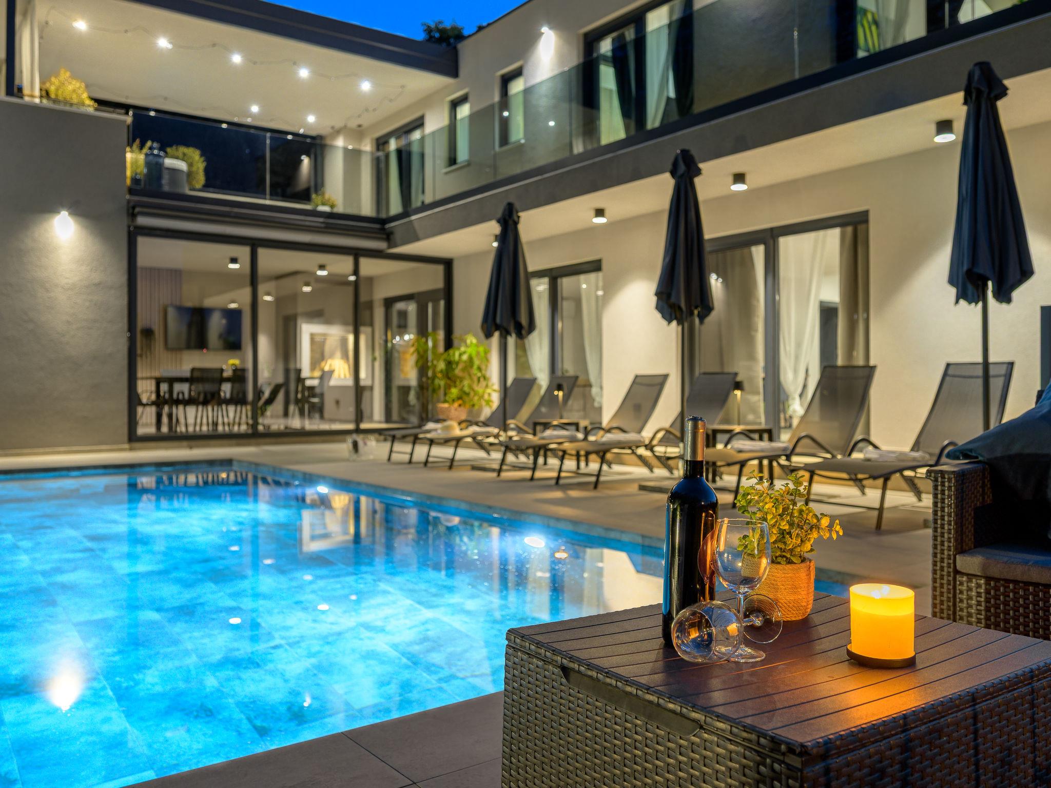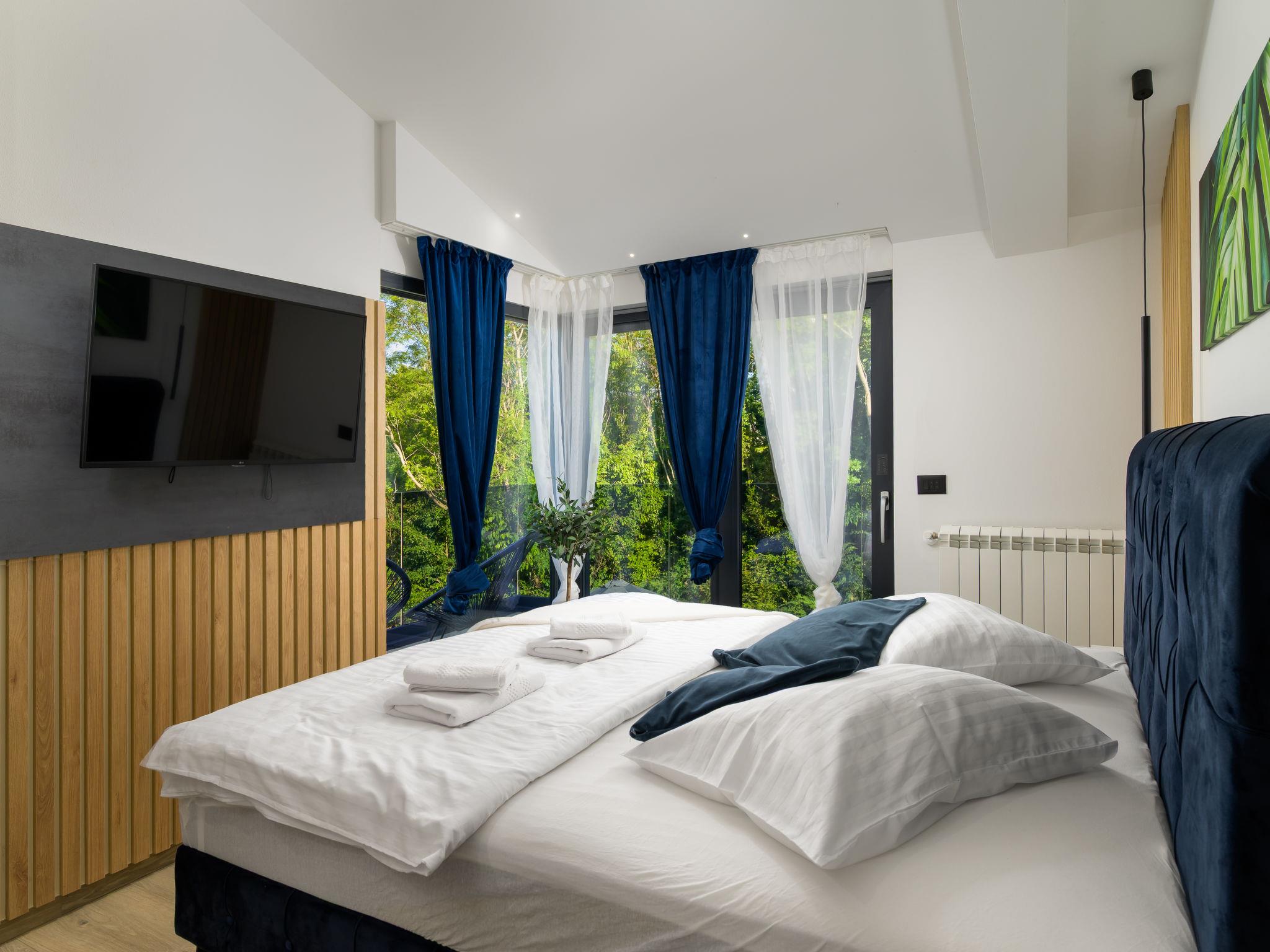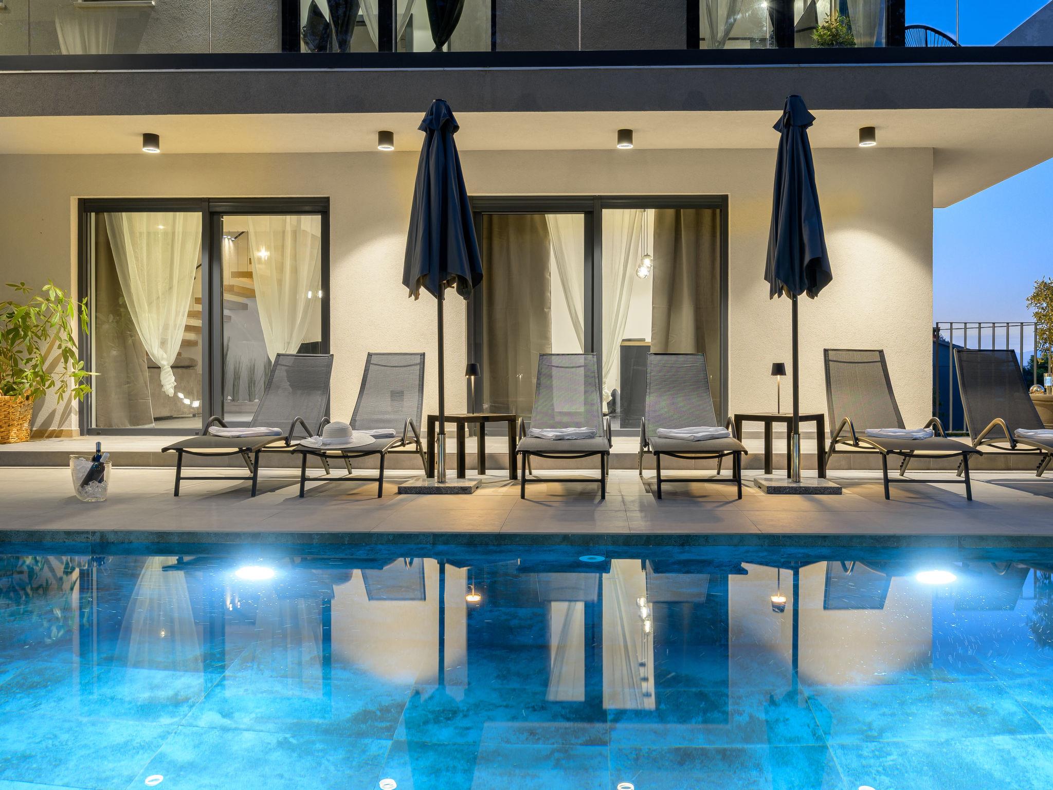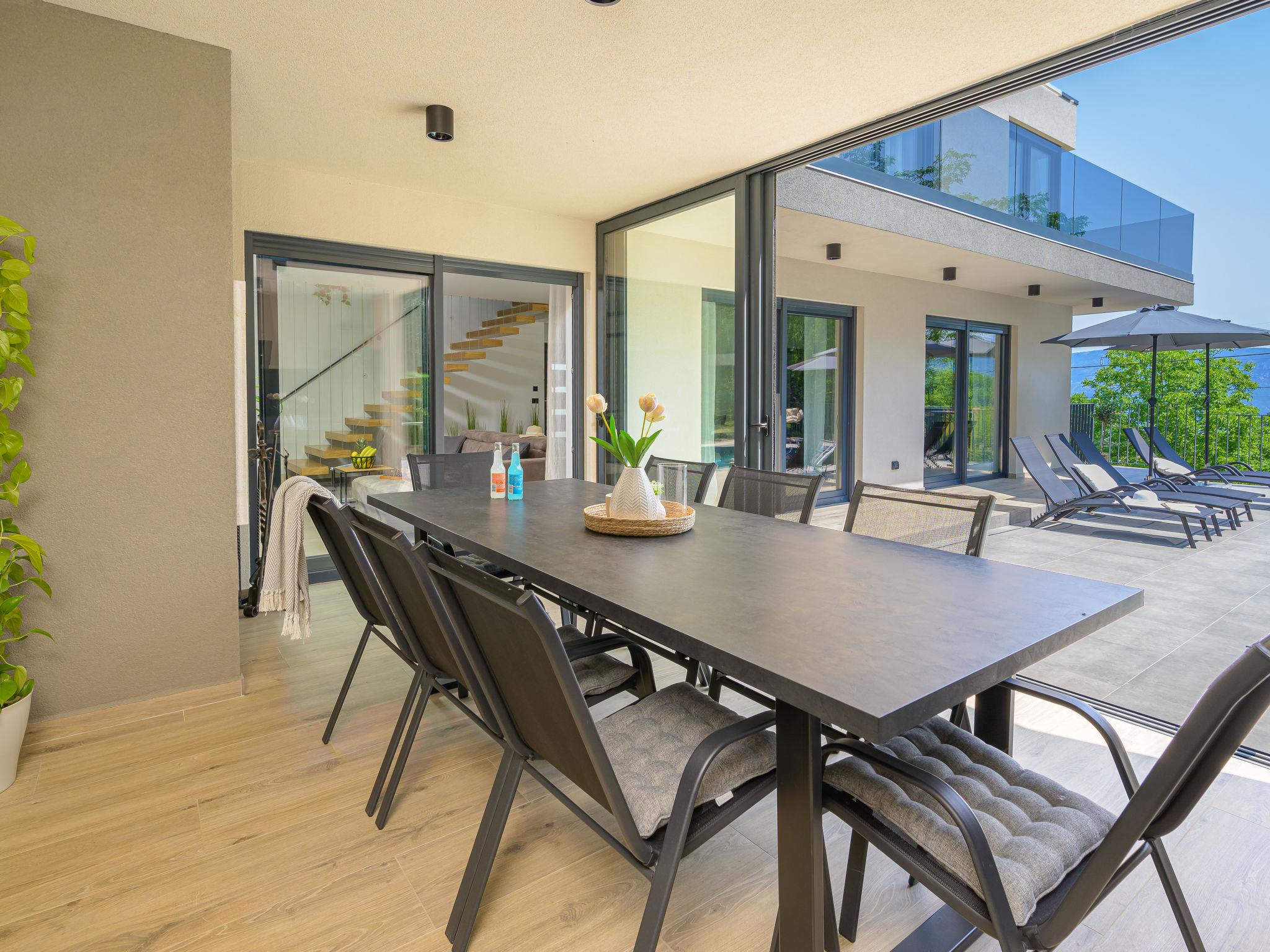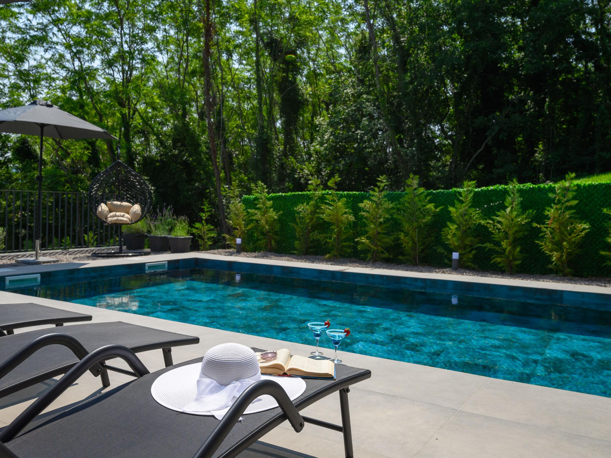 Very beautiful, luxurious villa "Ollea", 3 storeys. In the hamlet Radovici 10 km from the centre of Labin, 15 km from the centre of Rabac, 15 km from the sea. Private: property 900 m2 (fenced) with wildlife garden and trees, swimming pool angular (8 x 4 m, depth 150 cm, seasonal availability: 01.Apr. - 30.Oct.) with internal staircase. Outdoor shower, hot tub, table tennis, barbecue (slide, swing), pool maintenance by the owner/gardener. In the house: internet access, sauna, table football, washing machine, tumble dryer. Roofed, parking (for 4 cars) at the house on the premises. Shop 4 km, supermarket 10 km, restaurant 4 km, bus stop "Labin" 10 km, pebble beach 15 km. The owner does not accept any youth groups. Please note: airfield 53 km from the property. Video surveillance of the driveway and parking.