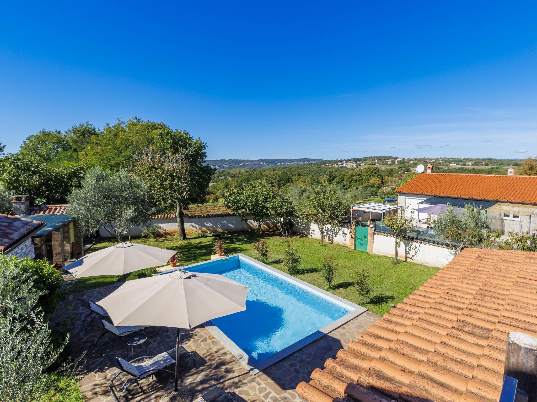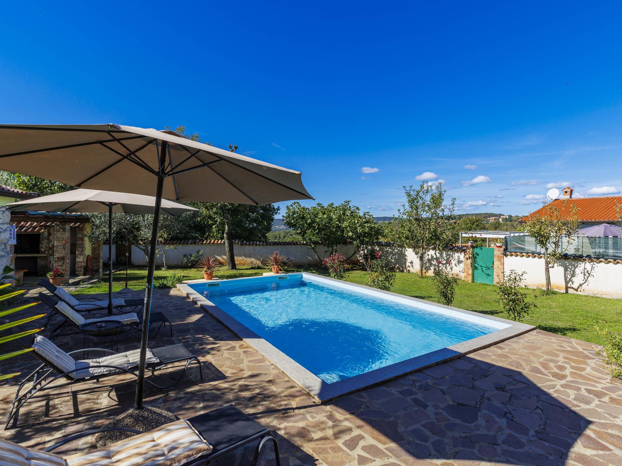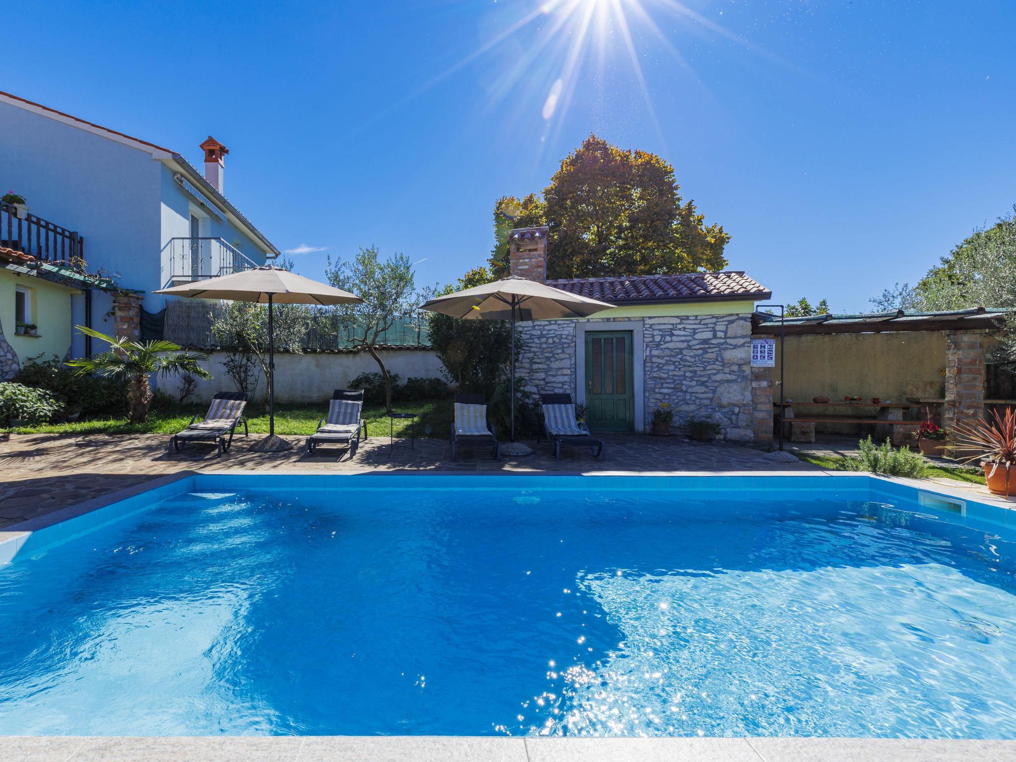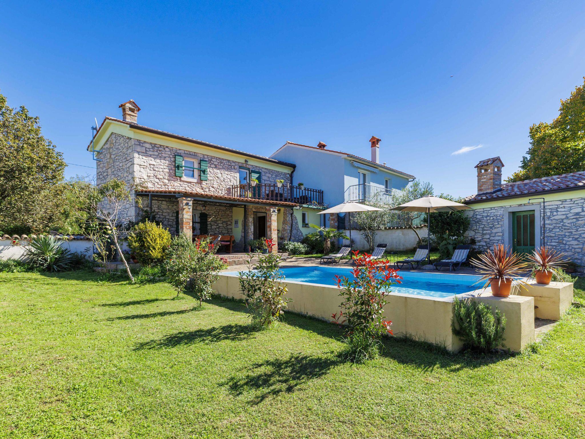 Rustic semi-detached house "Marija", 2 storeys. In the hamlet Markoci 7 km from the centre of Labin, 12 km from the centre of Rabac, 12 km from the sea, in the countryside. Private: property 500 m2 (fenced), lawn and wildlife garden, swimming pool angular (7 x 4 m, depth 140 cm, seasonal availability: 01.Apr. - 30.Oct.) with internal staircase. Outdoor shower, terrace (20 m2), garden furniture, barbecue, pool maintenance by the owner/gardener. In the house: internet access, washing machine. Parking (for 2 cars) at the house on the premises. Shop 2 km, supermarket 7 km, restaurant 2 km, bus stop "Labin" 7 km, pebble beach 12 km. Please note: airfield 50 km from the property.