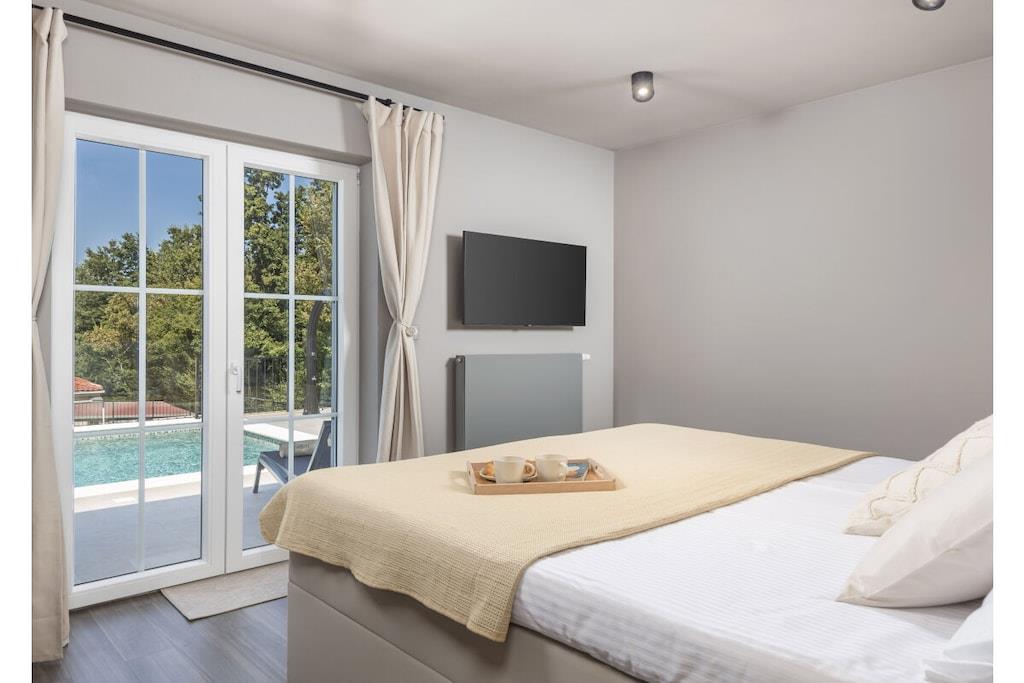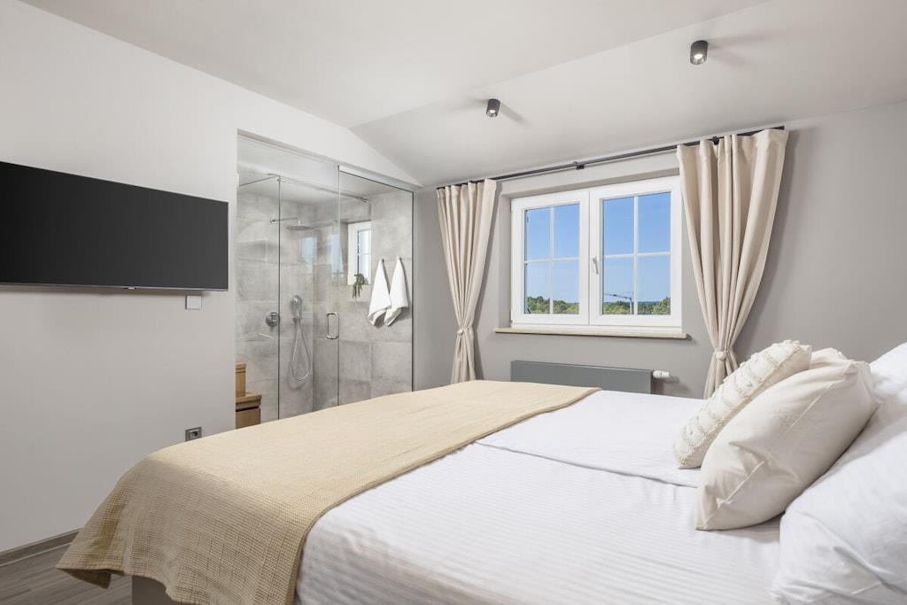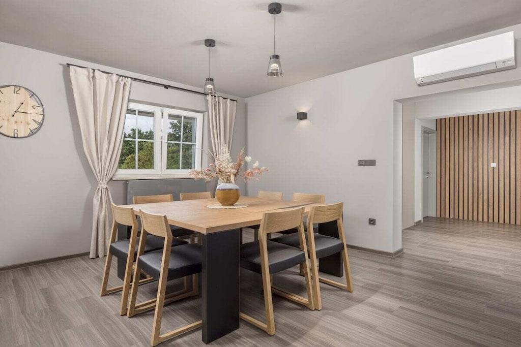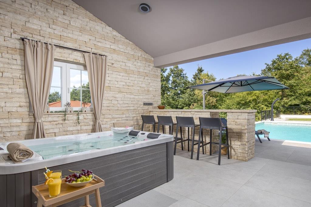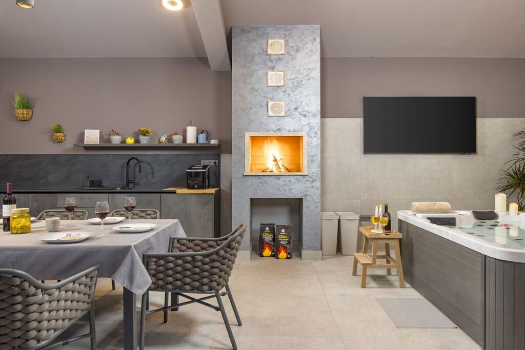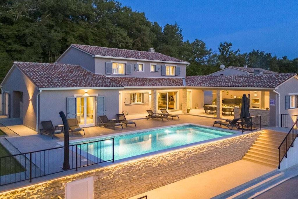 Vila Hygge ligger i den rolige landsby Pustic, i udkanten af skoven nær Labin. Denne elegant møblerede villa tilbyder alt, hvad du behøver for at slappe af og nyde dit ophold. Den har fire soveværelser, hver med eget badeværelse, en rummelig stue, et indendørs og udendørs køkken med spiseplads og en sauna. Udendørsområdet omfatter en pool, et spabad og en stor have, perfekt til forskellige aktiviteter såsom dart eller bordtennis. Poolen ligger i den solrige del af ejendommen, mens resten af huset er behageligt skygget af skoven hele dagen. Gæsterne kan slappe af på den udendørs terrasse eller nyde en grillfest på den veludstyrede terrasse. For de små er der udendørs legepladser og børneprogrammer på tv. Hvis du ønsker at udforske Istriens skønhed, tilbyder Villa Hygge den perfekte base for at opdage dens kulturarv, lokale gastronomi og naturlige vidundere. Efter din udforskning vil du altid være glad for at vende tilbage til dette fredelige tilflugtssted. Strandene i Rabac ligger kun 10 minutters kørsel væk.