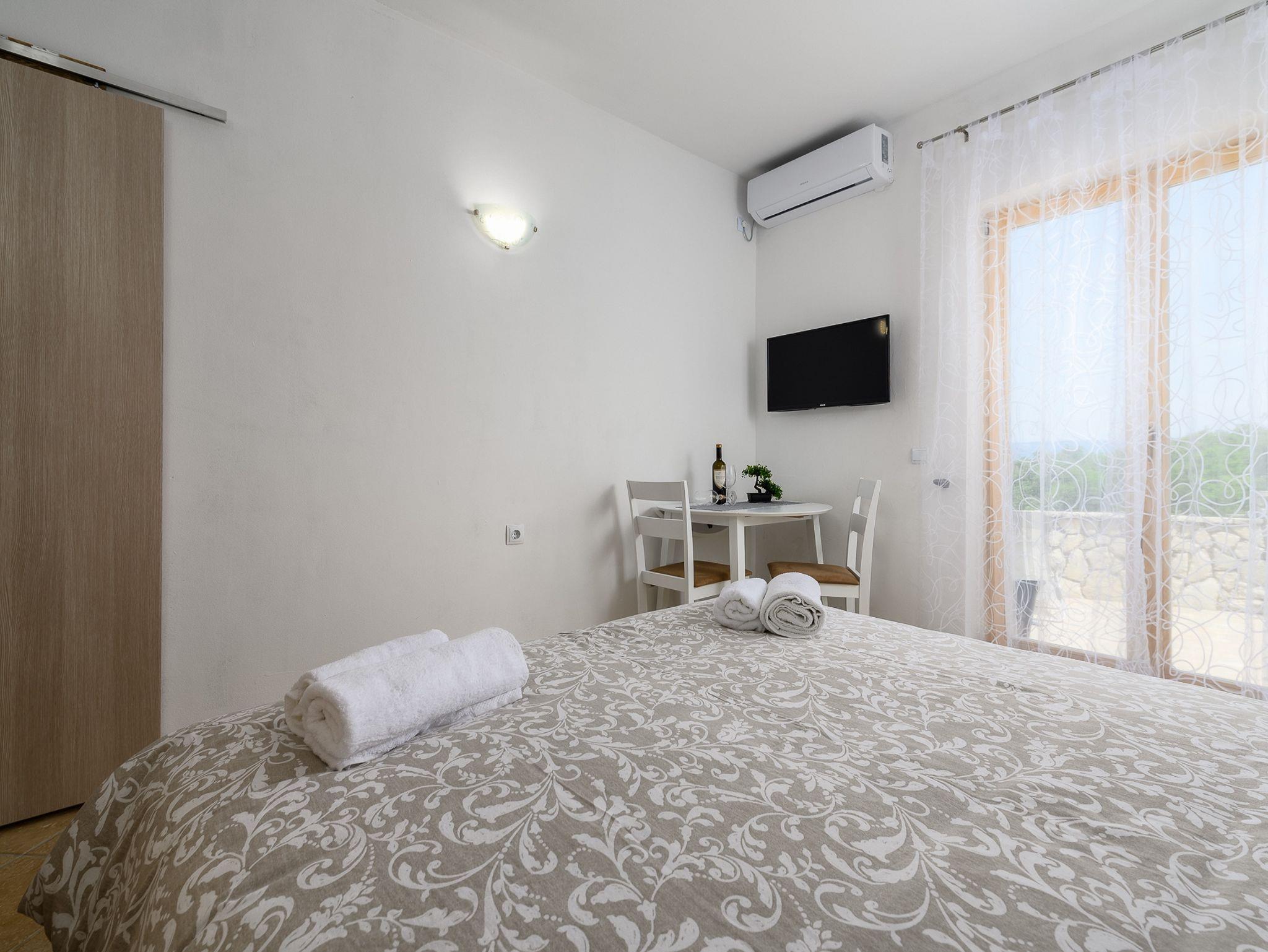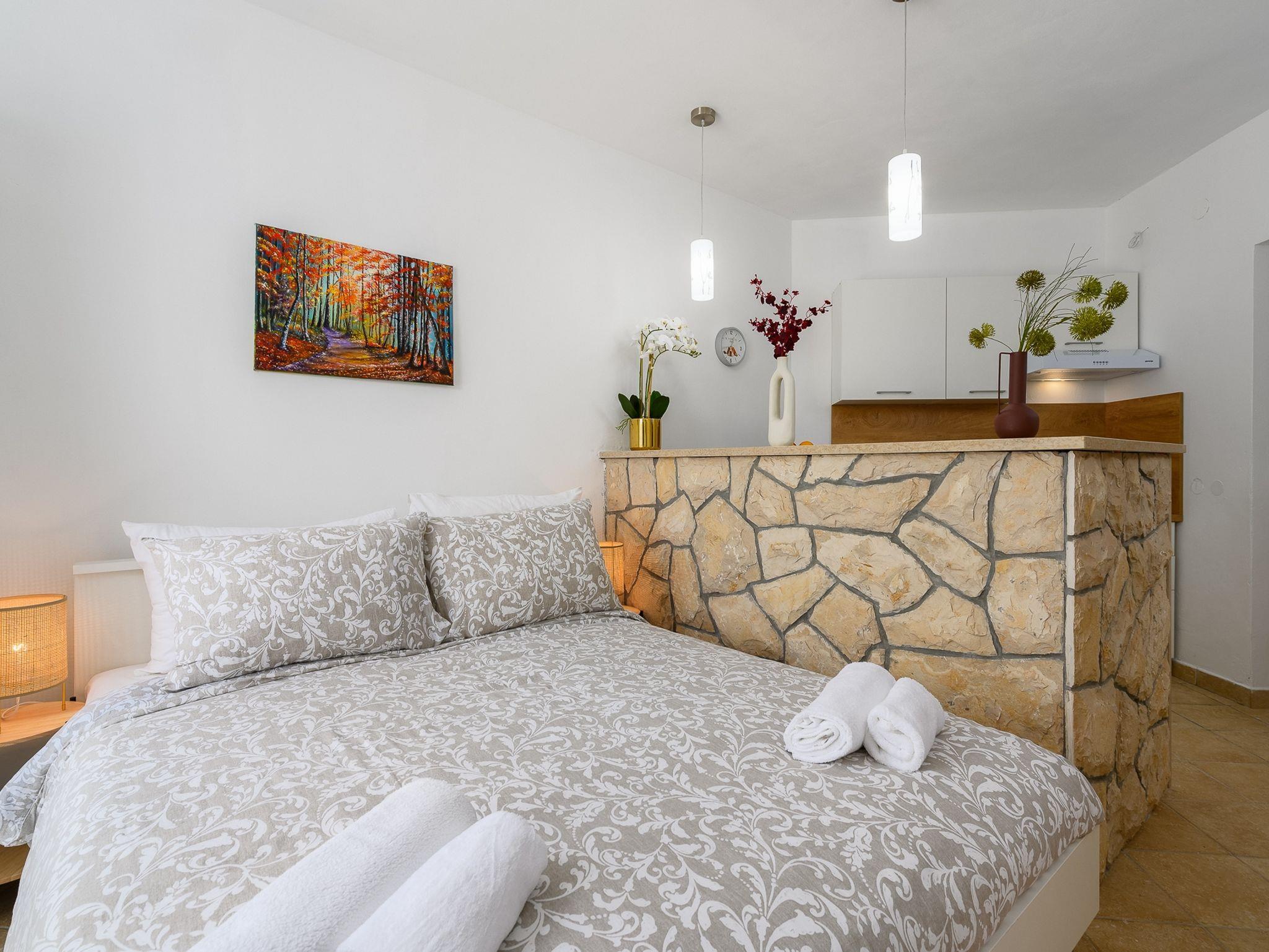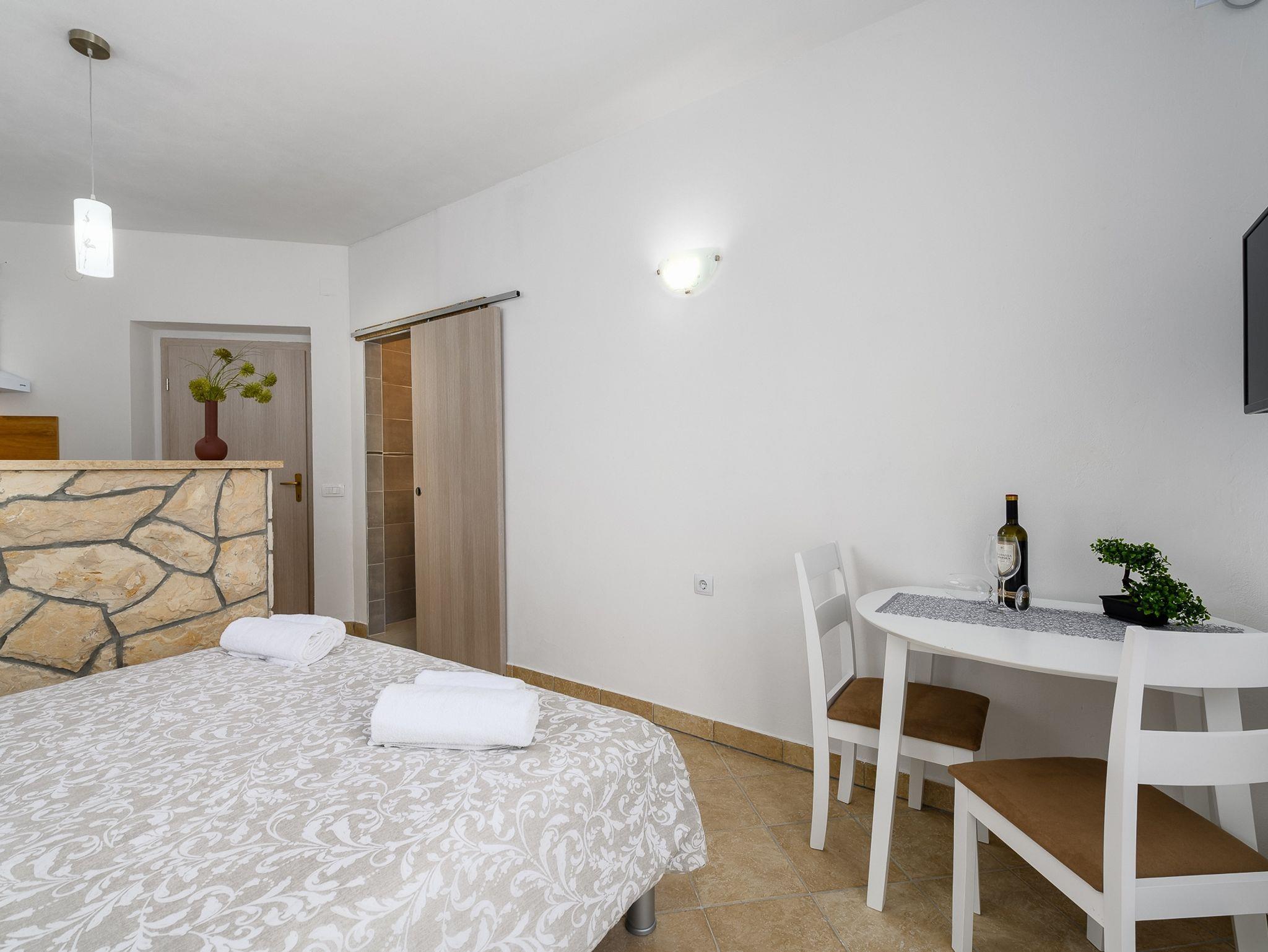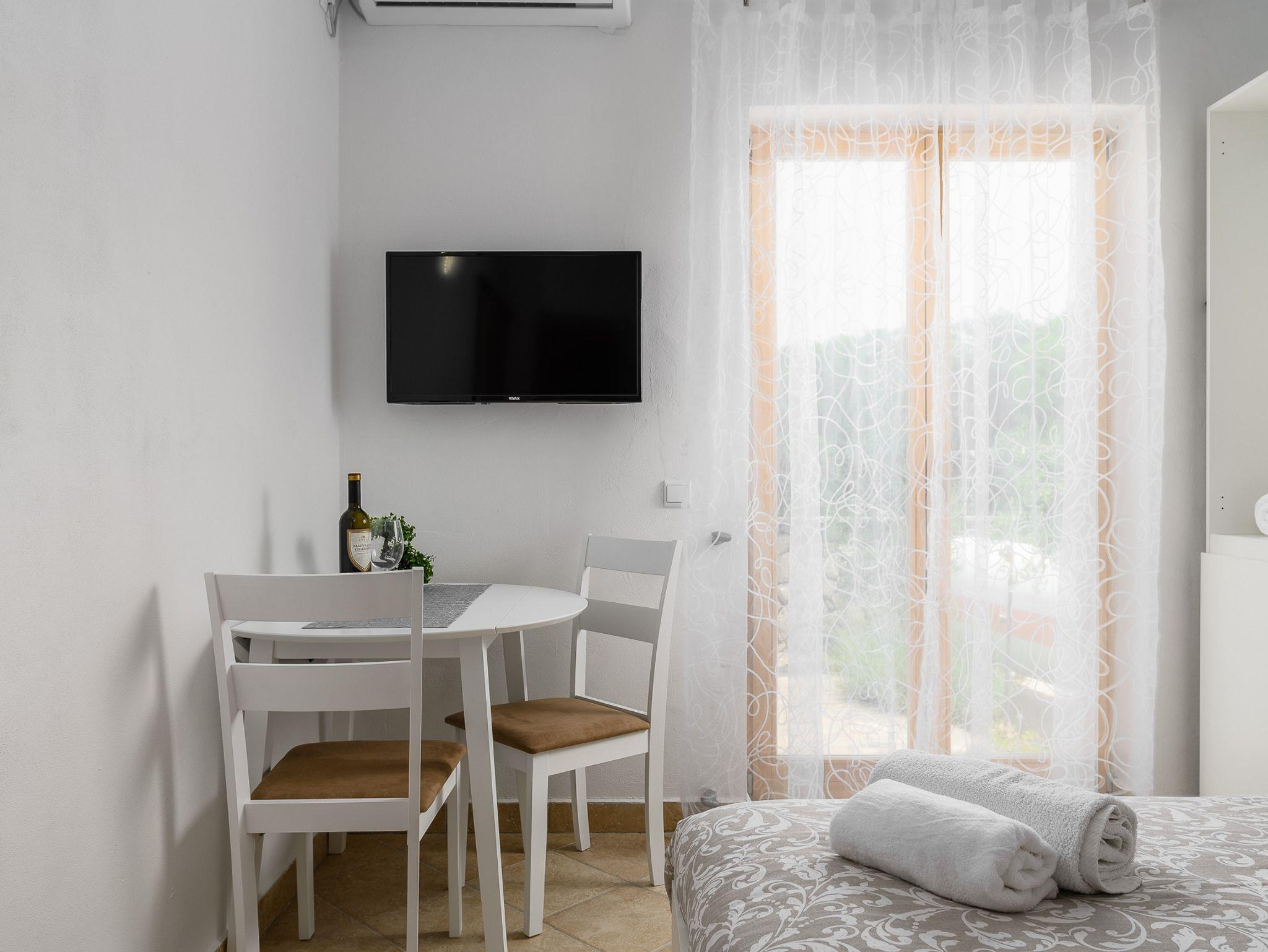 Studio bietet Platz für 2 Gäste. Die Betten sind in Schlafzimmern, die es 1 gibt, innerhalb einer Gesamtfläche von 25m2, angeordnet. Die Gäste haben eine eigene Terrasse zur Verfügung, auf der sie in warmen Sommernächten genießen können. Das Studio-Apartment bietet Meerblick. Es ist erlaubt, Speisen auf dem Gemeinschafts-Grill vorzubereiten. Während ihres Aufenthalts können Gäste das gemeinsam zur Nutzung stehende Schwimmbad benutzen. In der Unterkunftseinheit besteht die Möglichkeit des Mitbringens von Haustieren gegen Aufpreis. IM PREIS INBEGRIFFEN: Kurtaxe, Endreinigung, Klimatisierung, Pool, Parkplatz, Internet, Wäschewaschen, Kinderbett, Bügeleisen, Bügelbrett, Föhn. UNVERBINDLICHE ZUSÄTZLICHE KOSTEN: Haustiere (10,00 € pro Nacht), Fahrrad (20,00 € täglich (pro Stück)). Die Verfügbarkeit zusätzlicher Dienstleistungen in Ihrem reservierten Termin und die Preise derselben (falls nicht aufgeführt) müssen im Voraus überprüft werden. Zusätzliche Dienstleistungen die in der Zahlungsaufforderung nicht aufgeführt sind werden direkt beim Vermieter bezahlt, angenommen der Gast nutzt auch diese.