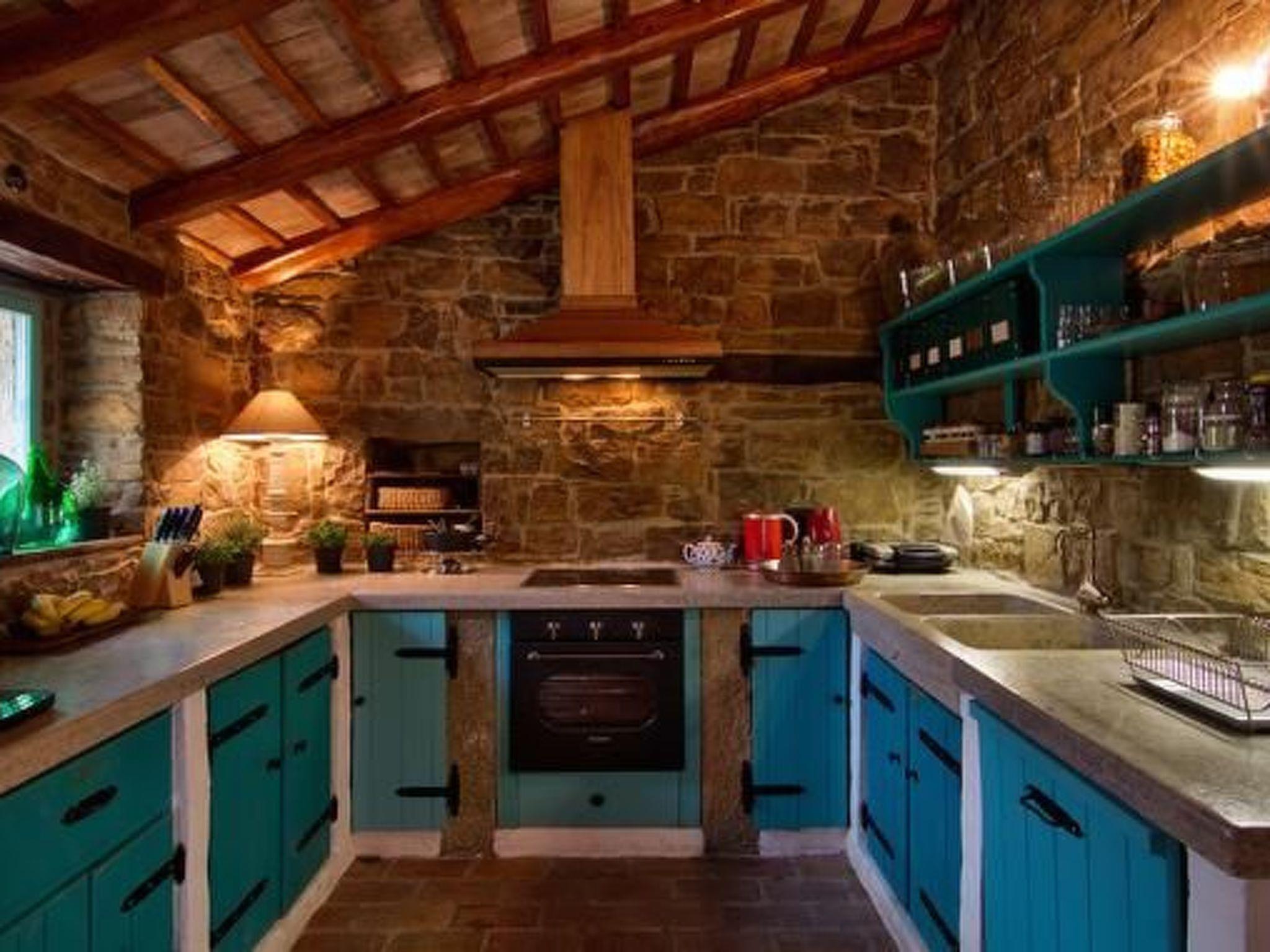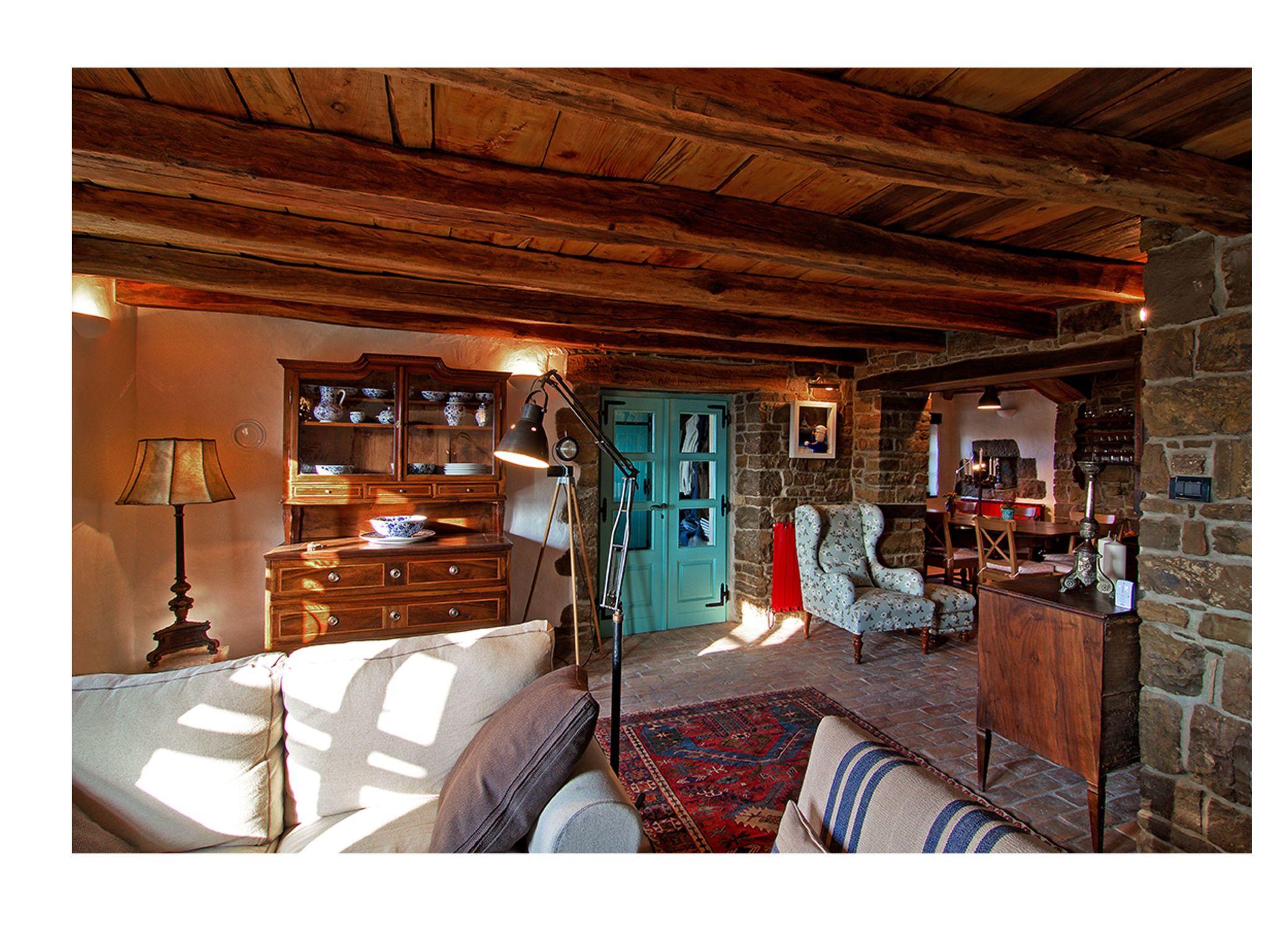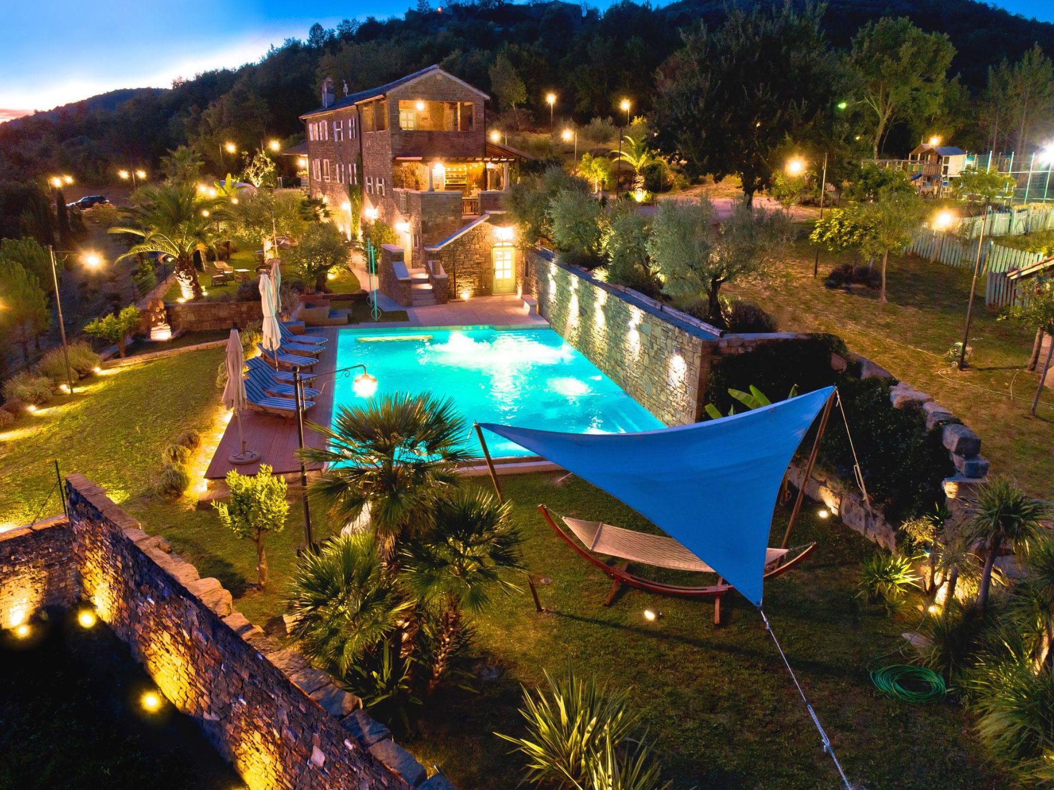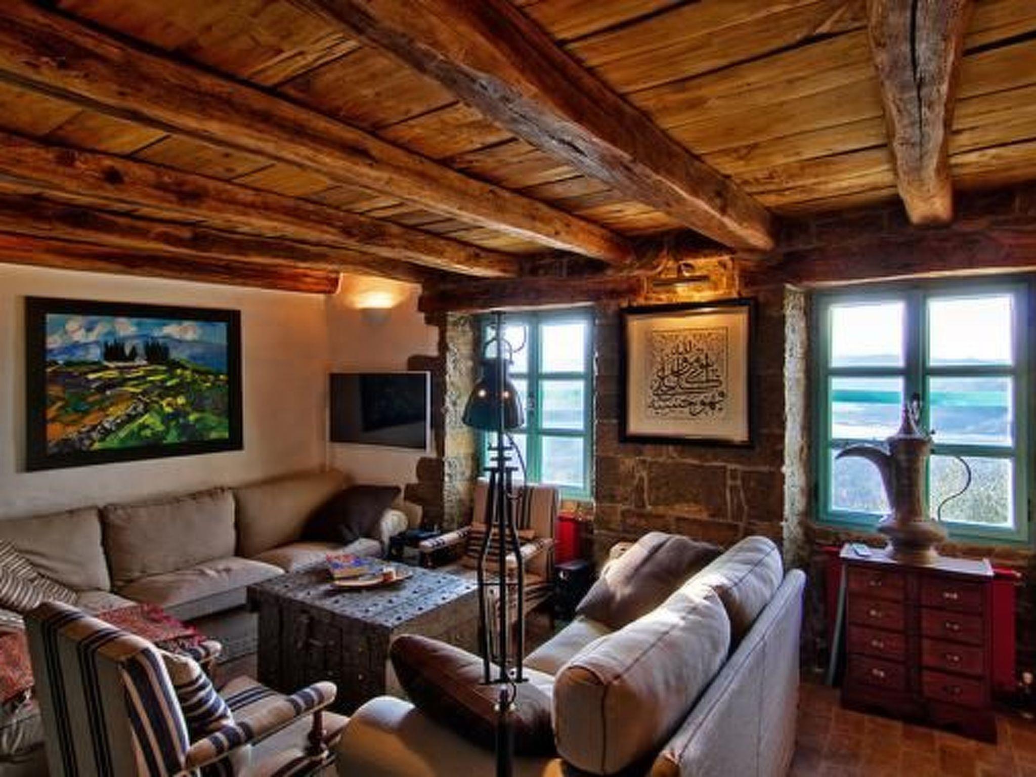 The authentic, traditional stone house from the year 1800 was completely and carefully renovated just recently in 2013 and equipped with modern amenities accordingly for a pleasant and unforgettable stay. The three floors of the air-conditioned (cool/warm) holiday villa provide a total of 350m² of living space, consisting of a spacious living and dining room with a highly modern, fully-equipped kitchen, six bedrooms, four light bathrooms and a separate guest toilet. All the rooms are highlighted by original wooden ceilings and authentic stone walls, exuding a rustic and cosy country house atmosphere, enhanced even further by the antique, solid wood furniture. The ground floor is the living area with a spacious corner and three-seater sofa, two matching armchairs, a wide flatscreen TV (cable TV, Smart TV and a USB port)) mounted to the wall, a DVD and CD player, and a stereo system. On cooler evenings you can gather around the large open fireplace set into the wall, while the dining table with eight chairs right next to it invites you to enjoy leisurely meals together. The open kitchen has a dishwasher, a ceramic hob with an elegant extractor fan, an oven, a fridge with a freezer compartment, toaster, kettle and coffee machine. The ground floor also has two of the spacious and thoughtfully decorated six bedrooms, which both have two single beds measuring 90 x 200cm that can also be joined together as a double bed, and a bathroom with a shower. The separate guest toilet provides additional convenience. Wide stairs lead to the first floor with two further bedrooms, each with a double bed measuring 180 x 200cm, which share a bathroom that has a bath with a shower attachment, a large washbasin and wall mirror, a bidet and a toilet. Other stairs lead to the second floor with a bedroom with a double bed (180 x 200cm) and the sixth bedroom with two single beds (90 x 200cm) that can also be joined together and with direct access to its own balcony with garden furniture, affording an extensive panoramic view over the hilly landscape. Both bathrooms have a spacious shower cubicle, a washbasin and a wall mirror, a hairdryer and a toilet. Two cots and a washing machine are available and there is free and reliable wireless Internet access in the villa.
