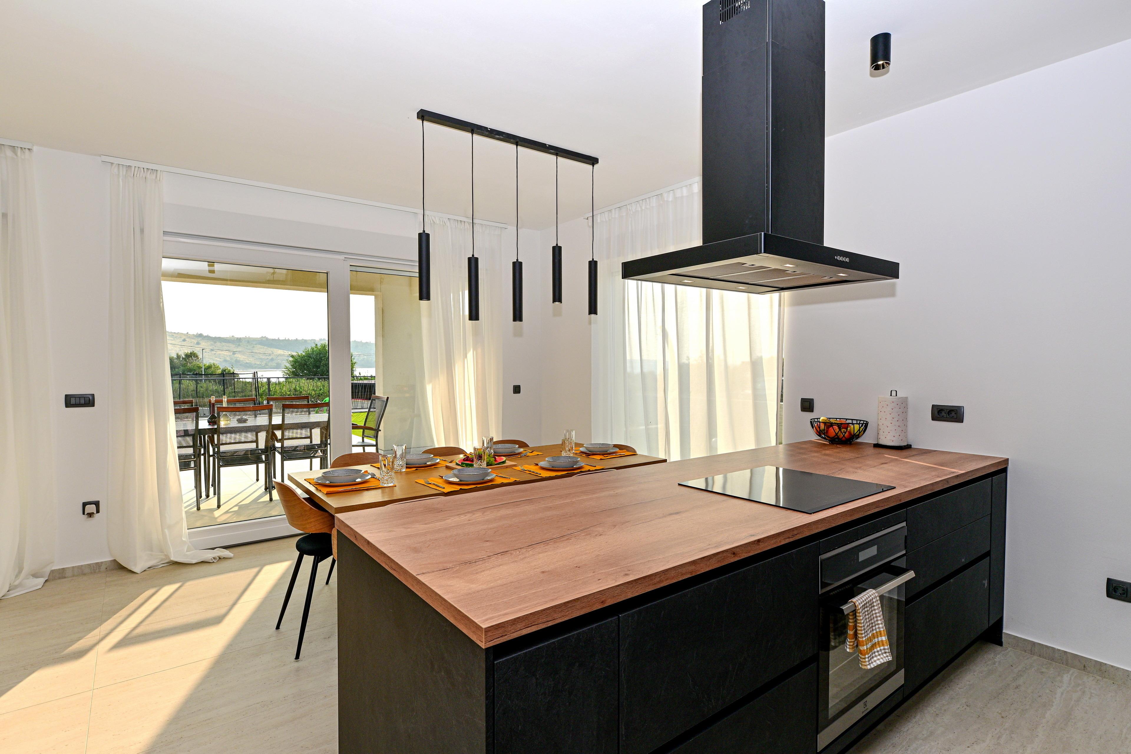 Entspannen Sie sich im Innenbereich mit einem 85-Zoll-4K-Smart-TV, einem Heimkino-Surround-System, einer PlayStation 5 und einer voll ausgestatteten Küche.