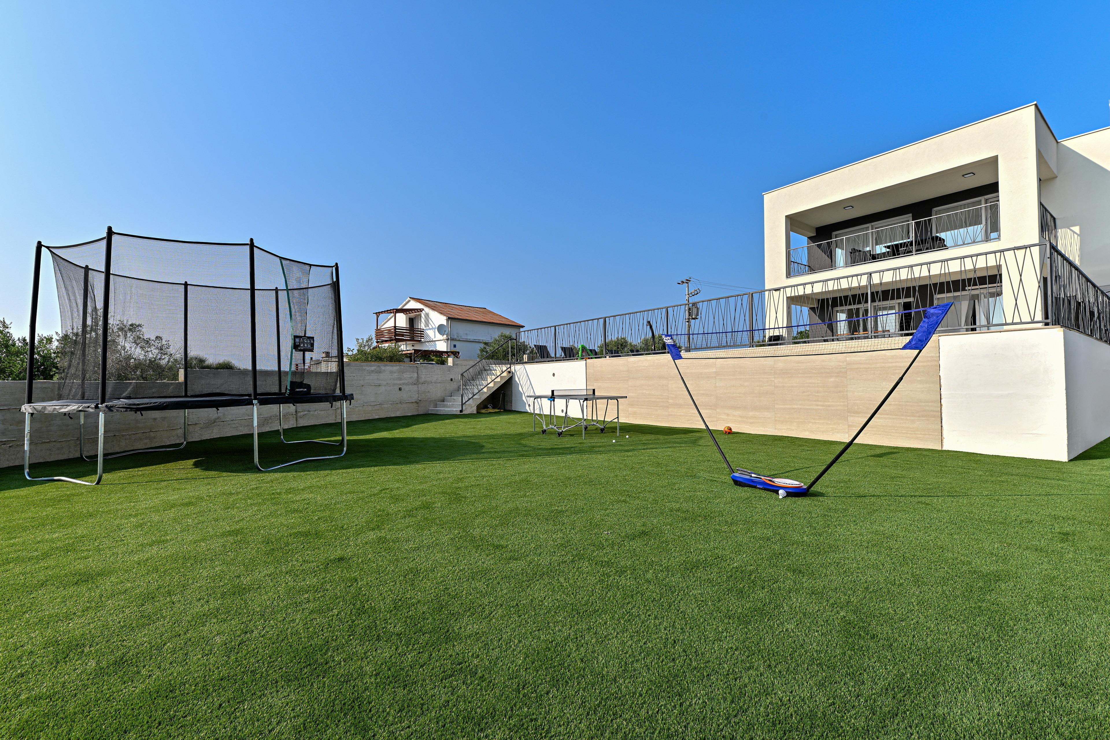 Genießen Sie einen privaten beheizten Pool, schnelles Starlink-Internet und einen 260 m² großen Spielplatz mit Trampolin, Tischtennis und Badminton.