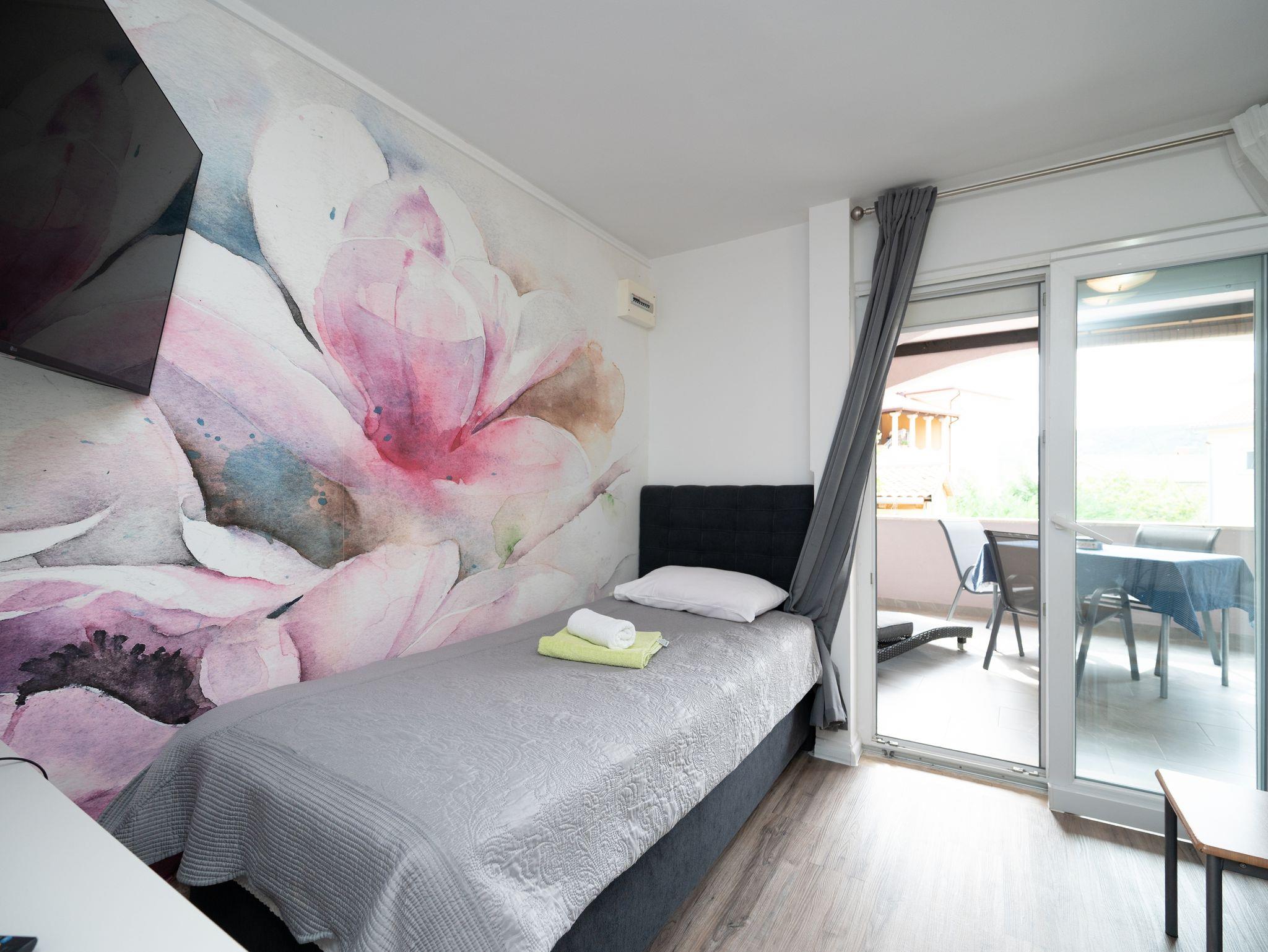 Ferienwohnung bietet Platz für 3 Gäste. Die Betten sind in Schlafzimmern, die es 1 gibt, innerhalb einer Gesamtfläche von 27m2, angeordnet. Die Gäste haben eine eigene Terrasse zur Verfügung, auf der sie in warmen Sommernächten genießen können. Es ist erlaubt, Speisen auf dem Gemeinschafts-Grill vorzubereiten. In der Unterkunftseinheit besteht die Möglichkeit des Mitbringens von Haustieren gegen Aufpreis. IM PREIS INBEGRIFFEN: Endreinigung, Klimatisierung, Parkplatz, Internet, Fahrrad, Kinderbett, Bügeleisen, Bügelbrett, Föhn. VERBINDLICHE ZUSÄTZLICHE KOSTEN: Kurtaxe (Erwachsene 0,93 € - 1,90 € Nacht/Person, Kinderermäßigung 12 - 17 Jahre), Aufzahlung für Kurzaufenthalte (prozentualer Zuschlag pro Nächtigungsanzahl: 30% - 1, 20% - 2, 10% - 3). UNVERBINDLICHE ZUSÄTZLICHE KOSTEN: Wäschewaschen (5,00 € Waschen), Haustiere (15,00 € pro Nacht). Die Verfügbarkeit zusätzlicher Dienstleistungen in Ihrem reservierten Termin und die Preise derselben (falls nicht aufgeführt) müssen im Voraus überprüft werden. Zusätzliche Dienstleistungen die in der Zahlungsaufforderung nicht aufgeführt sind werden direkt beim Vermieter bezahlt, angenommen der Gast nutzt auch diese. Ermäßigung auf den Grundpreis: Gratistag 28=25 (bei einem Aufenthalt von 28 oder mehr Tagen erhalten Sie 3 kostenlose Tage für den Aufenthalt bis 31.12.26).